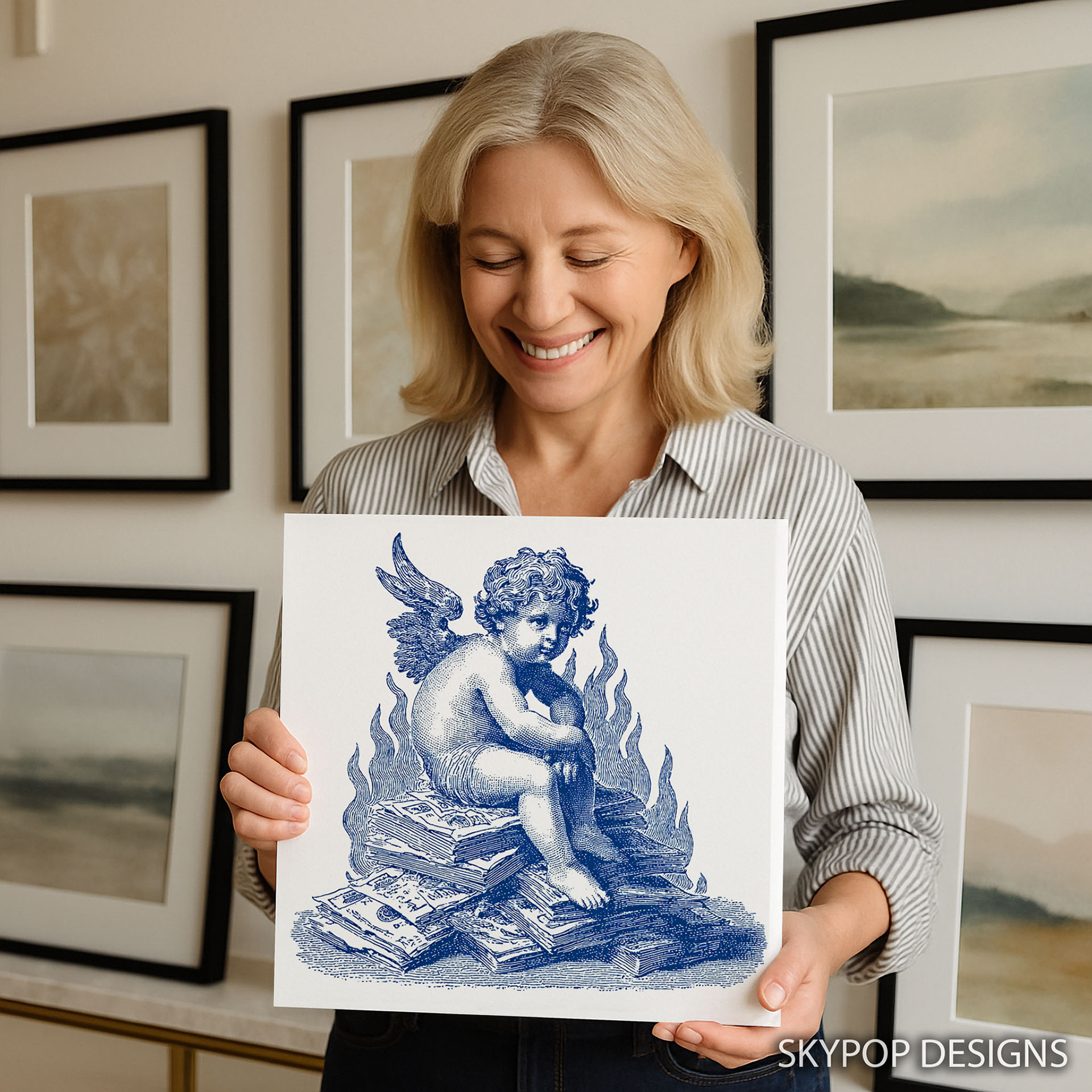 Transform your space with this striking cherub canvas wall art presenting a classical illustration of a winged child perched upon stacks of books, engulfed in stylized flames. This detailed poster or canvas wall art is perfect for adding a touch of historical intrigue to your living room or creating a contemplative atmosphere in your personal library. The classic blue and white color palette offers a sophisticated and timeless appeal, ideal for traditional decor styles. This piece also complements gothic interiors seeking dramatic flair or victorian homes desiring vintage accents. The intricate linework and the evocative imagery of knowledge and passion make this artwork a captivating focal point. This canvas wall art is ideal for anyone who appreciates classic art and symbolic representation, offering a unique statement piece for any room. High-quality printing ensures the fine details of the cherub’s wings, the texture of the books, and the dynamic flames are brilliantly captured. Whether you’re looking for a sophisticated addition to your office wall decor or a conversation starter for your dining room, this artwork delivers. It’s a perfect, thoughtful gift for book lovers, history buffs, or anyone celebrating a birthday or housewarming. Elevate your home with this classic art canvas that blends artistic mastery with profound symbolism, inspiring thought and conversation. Make this unique cherub artwork the highlight of your collection today.
