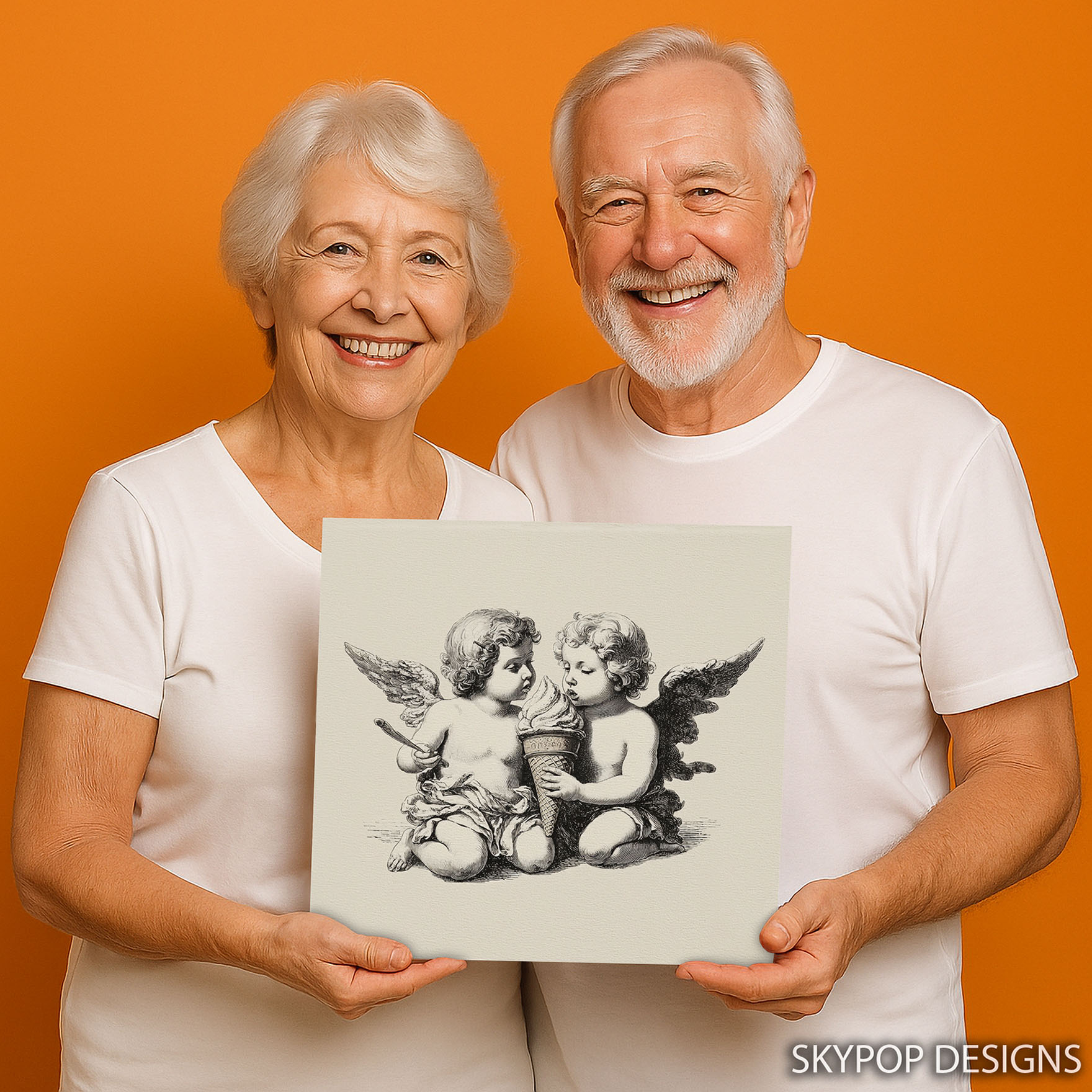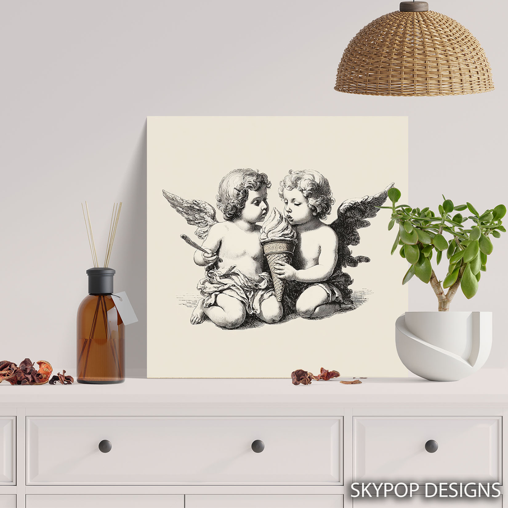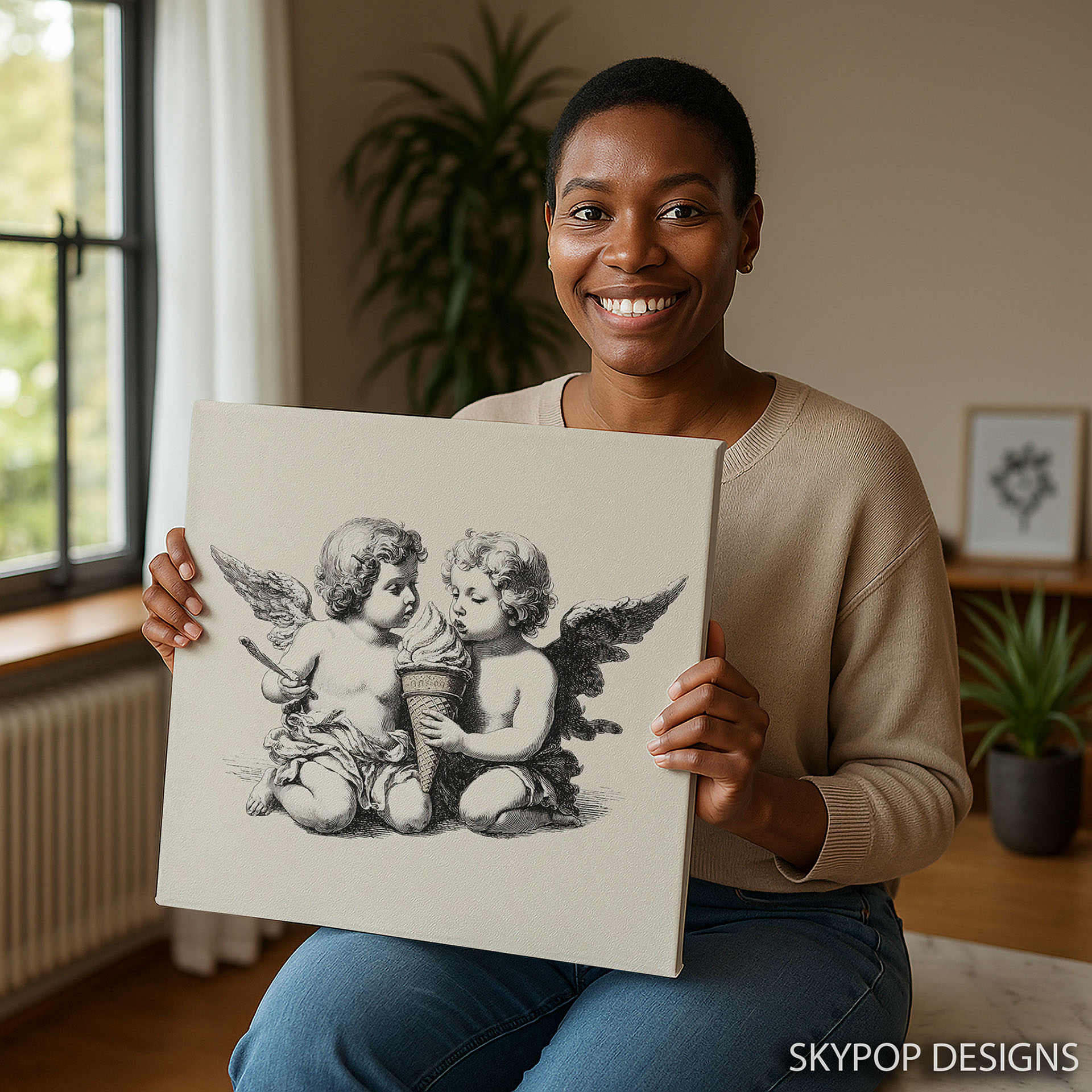 Bring a touch of playful elegance to your home with this exquisite cherub canvas wall art, showcasing two sweet figures enjoying a delightful ice cream cone. This poster or canvas wall art adds a whimsical and charming focal point, perfect for creating a sophisticated yet fun atmosphere in your living room or bedroom. The classic black and white rendering with hints of beige and grey evokes a timeless feel, ideal for traditional or Victorian decor styles. This figurative art piece makes a charming addition to children’s rooms or entryways, capturing a moment of pure, innocent joy. The detailed linework and delicate shading on this canvas wall art celebrate classic artistic techniques, offering a striking visual appeal. Whether you love bohemian decor or seek unique statement pieces, this artwork brings warmth and personality to any setting. Its versatility makes it an ideal art choice for various rooms, from a cozy nursery to an elegant dining room. Perfect for gifting on birthdays, holidays, or housewarmings, this cherub poster is sure to be cherished. The simple yet captivating subject matter and classic style ensure it complements a wide range of interior designs, adding a touch of artistic flair. Elevate your home’s aesthetic with this beautiful cherub artwork that celebrates simple pleasures and timeless beauty. This high-quality print as canvas wall art or poster will transform your space and bring a smile to your face every day. Experience the artistry and charm of Cherubs Sweet Treat Delights Art today.