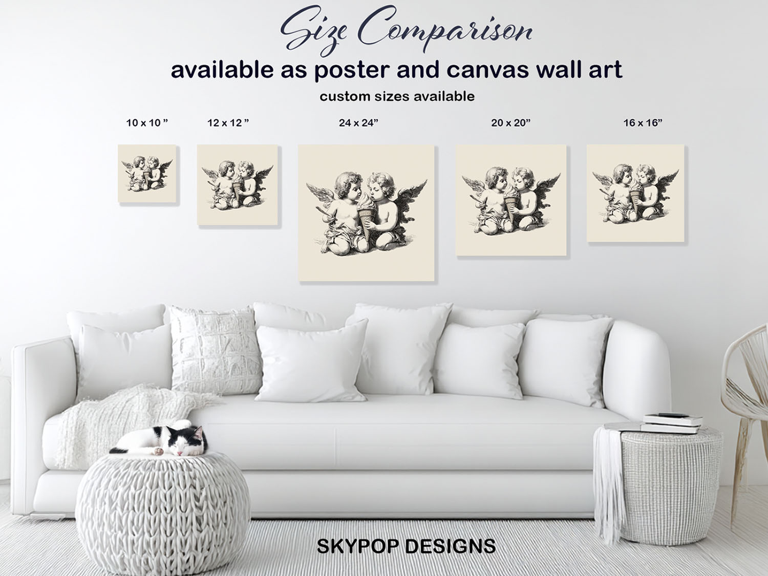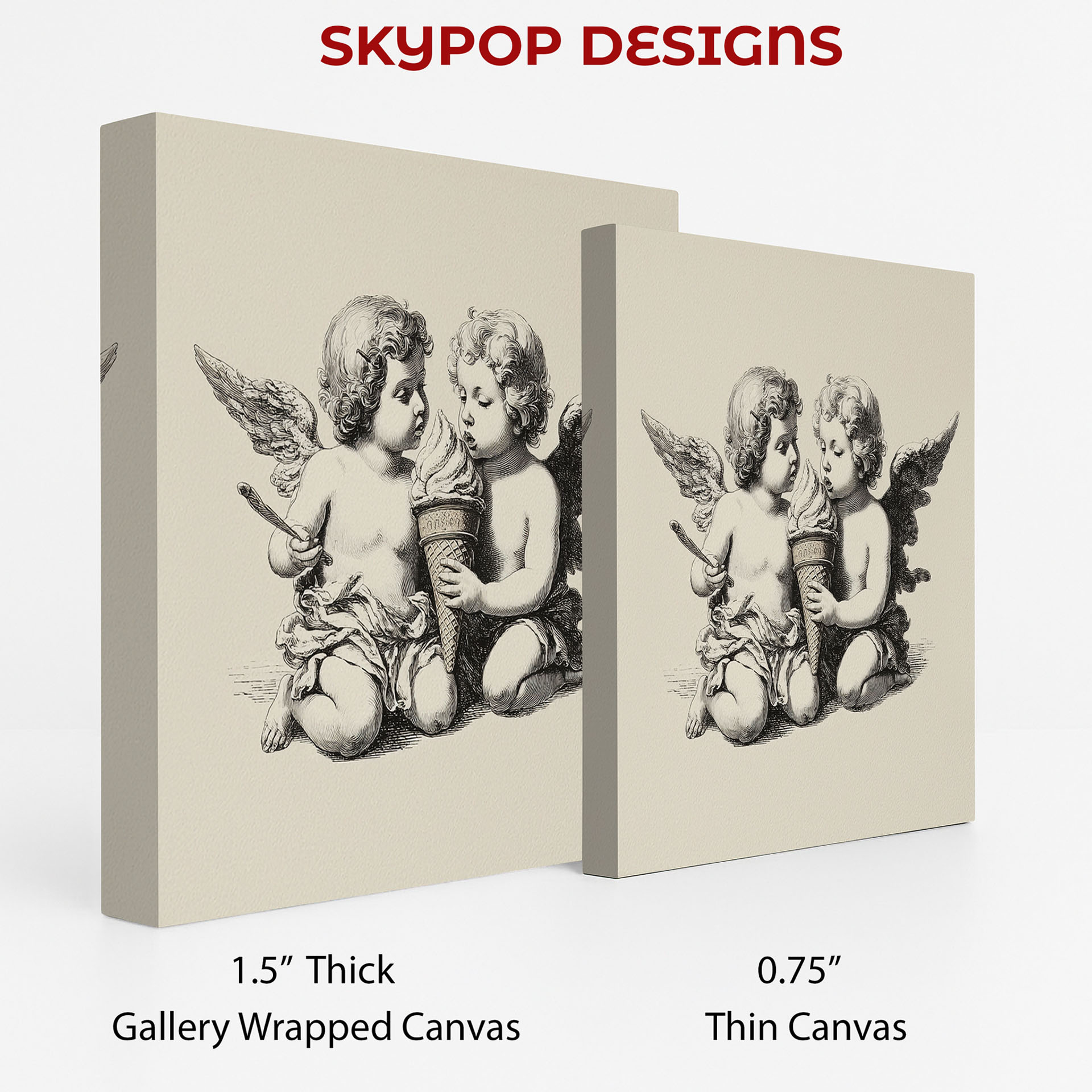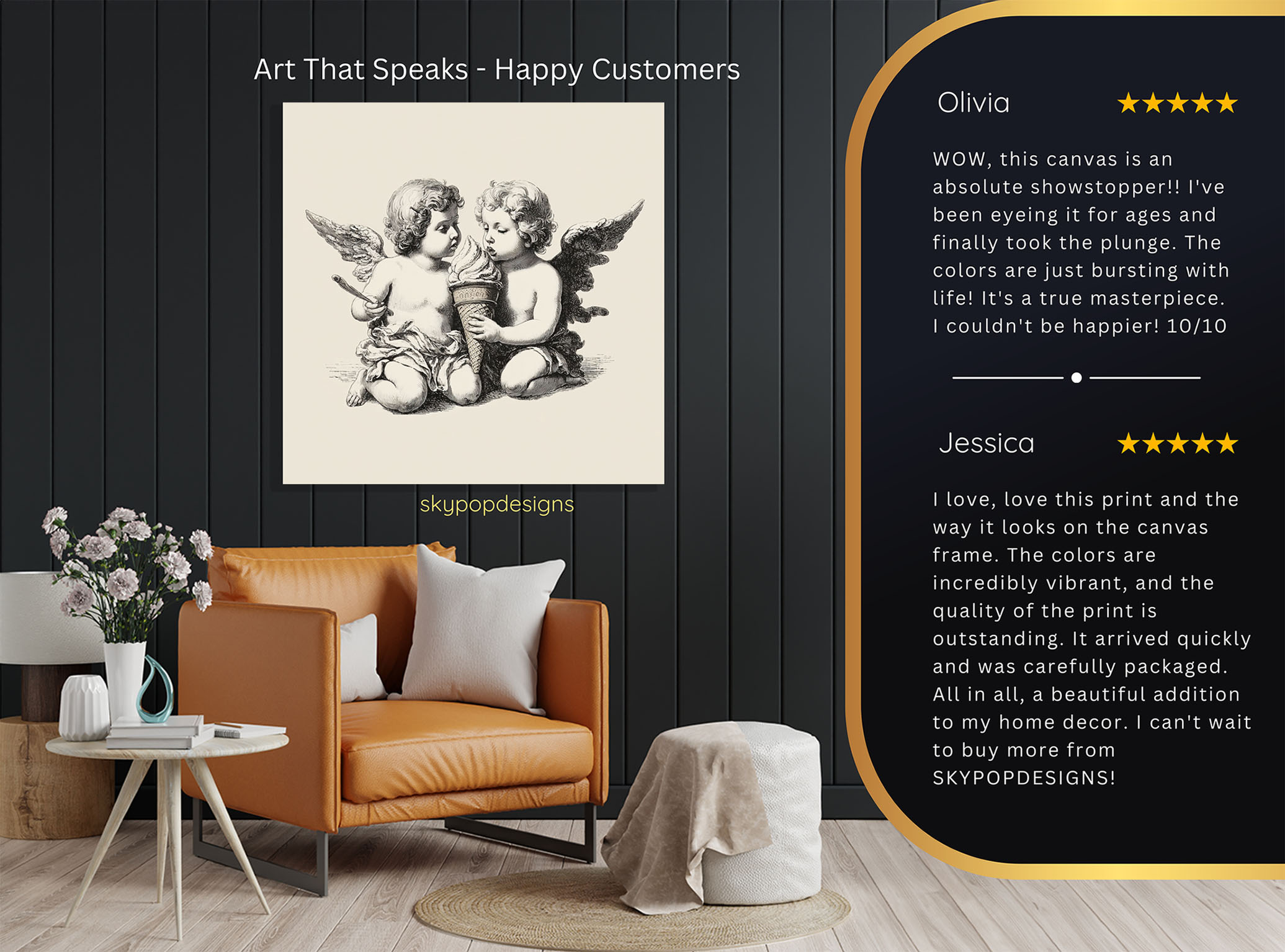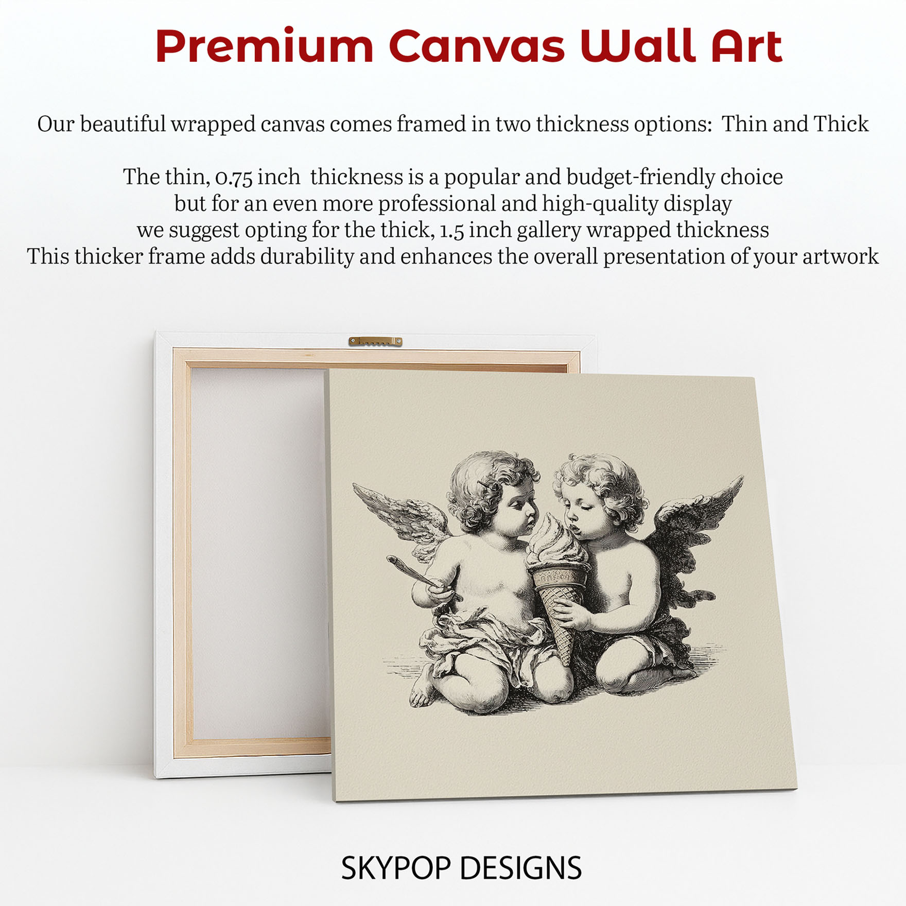 Bring a touch of playful elegance to your home with this exquisite cherub canvas wall art, showcasing two sweet figures enjoying a delightful ice cream cone. This poster or canvas wall art adds a whimsical and charming focal point, perfect for creating a sophisticated yet fun atmosphere in your living room or bedroom. The classic black and white rendering with hints of beige and grey evokes a timeless feel, ideal for traditional or Victorian decor styles. This figurative art piece makes a charming addition to children’s rooms or entryways, capturing a moment of pure, innocent joy. The detailed linework and delicate shading on this canvas wall art celebrate classic artistic techniques, offering a striking visual appeal. Whether you love bohemian decor or seek unique statement pieces, this artwork brings warmth and personality to any setting. Its versatility makes it an ideal art choice for various rooms, from a cozy nursery to an elegant dining room. Perfect for gifting on birthdays, holidays, or housewarmings, this cherub poster is sure to be cherished. The simple yet captivating subject matter and classic style ensure it complements a wide range of interior designs, adding a touch of artistic flair. Elevate your home’s aesthetic with this beautiful cherub artwork that celebrates simple pleasures and timeless beauty. This high-quality print as canvas wall art or poster will transform your space and bring a smile to your face every day. Experience the artistry and charm of Cherubs Sweet Treat Delights Art today.