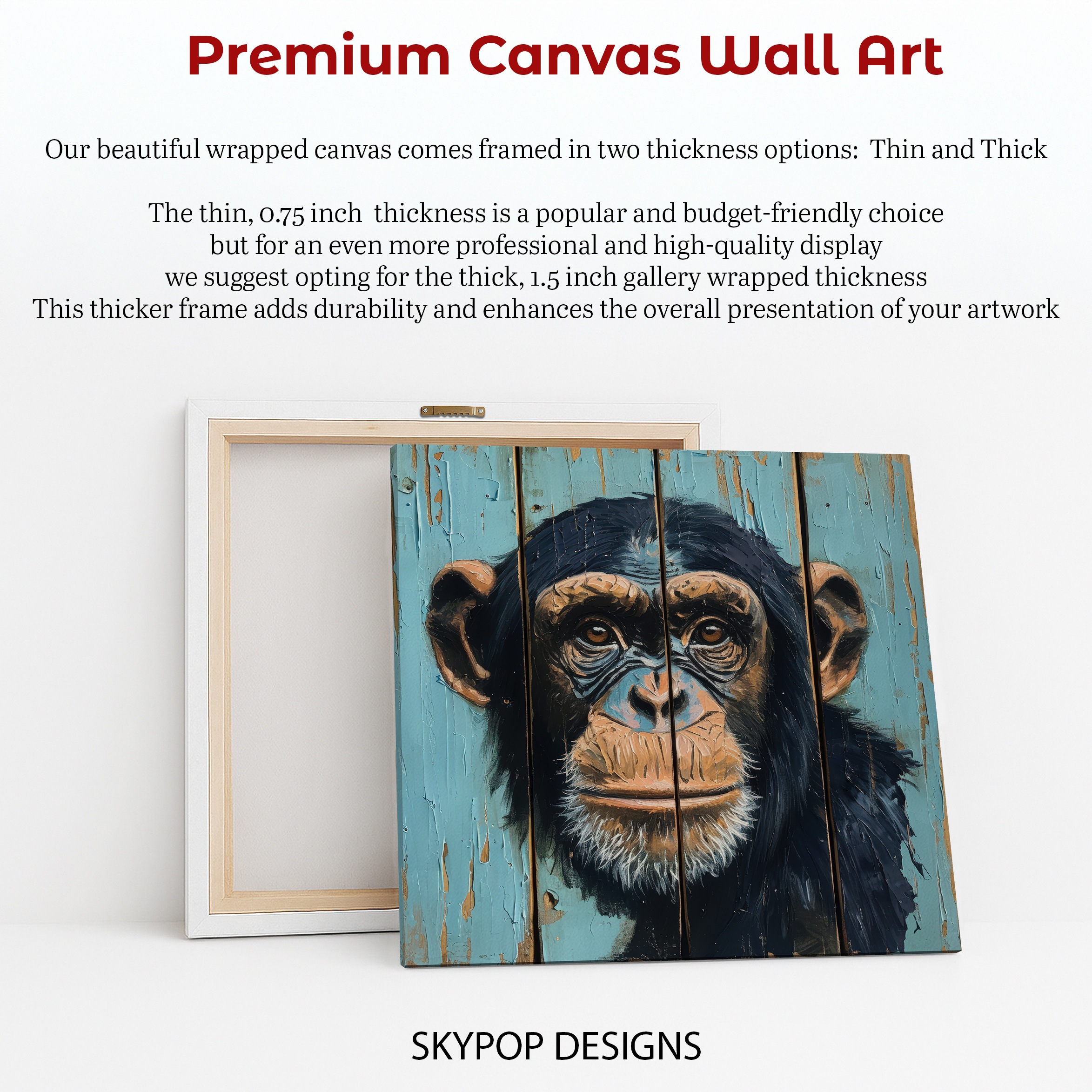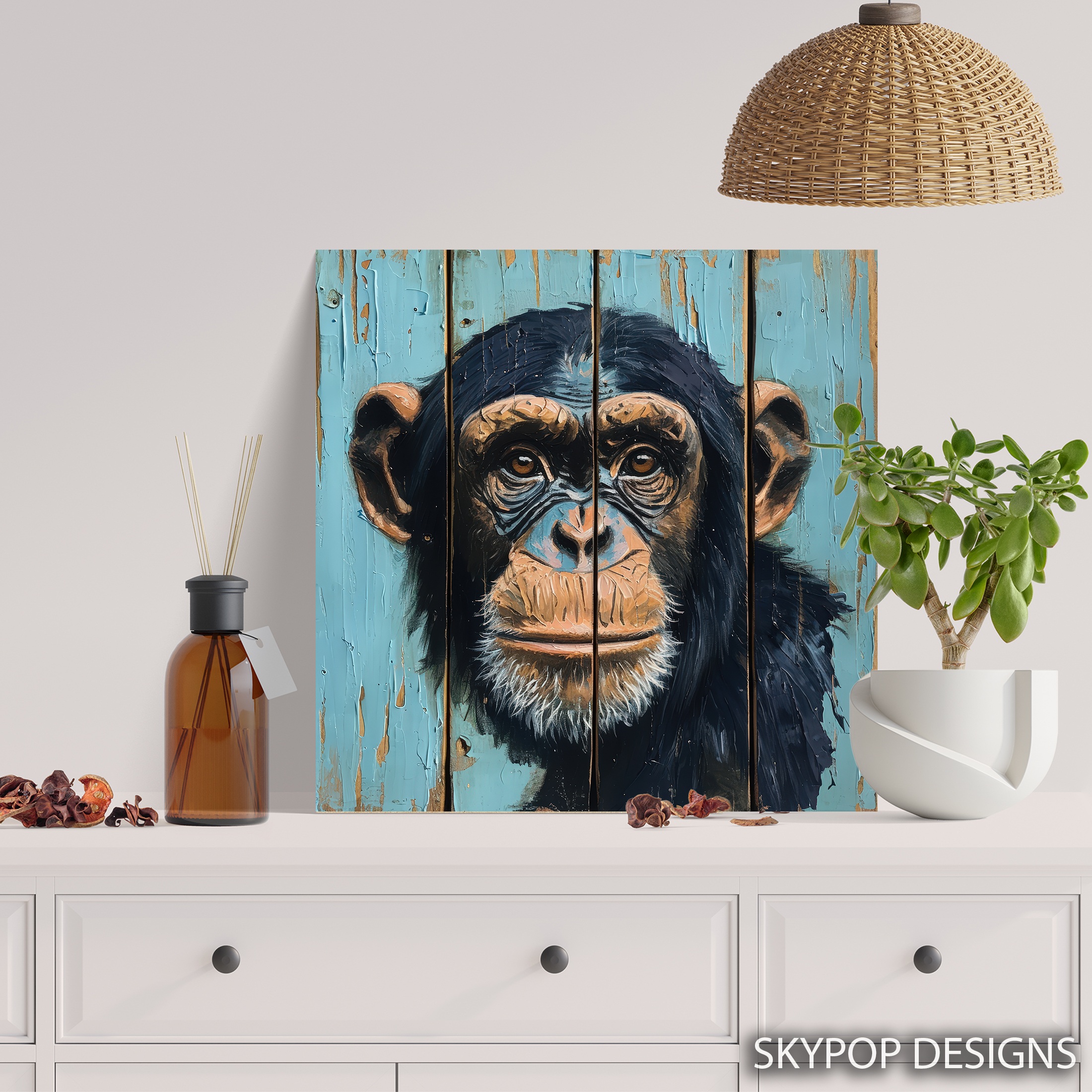 Keywords: Chimpanzee Art, Canvas Wall Art, Animal Print, Graffiti Art, Street Art, Modern Decor, Rustic Decor, Contemporary Art, Living Room Art, Office Decor, Bedroom Art, Entryway Decor, Multicolor Art, Brown Art, Blue Art, Black Art, Chimpanzee Portrait, Urban Aesthetic, Expressive Eyes Art, Textured Wall Art, Captivating Wall Art, Interior Design Art, Moody Ambiance Art, Thought-Provoking Art, Animal Lovers Gift, Art Enthusiast Gift, Housewarming Gift, Birthday Gift, Wild Spirit Art, Bold Imagery Art