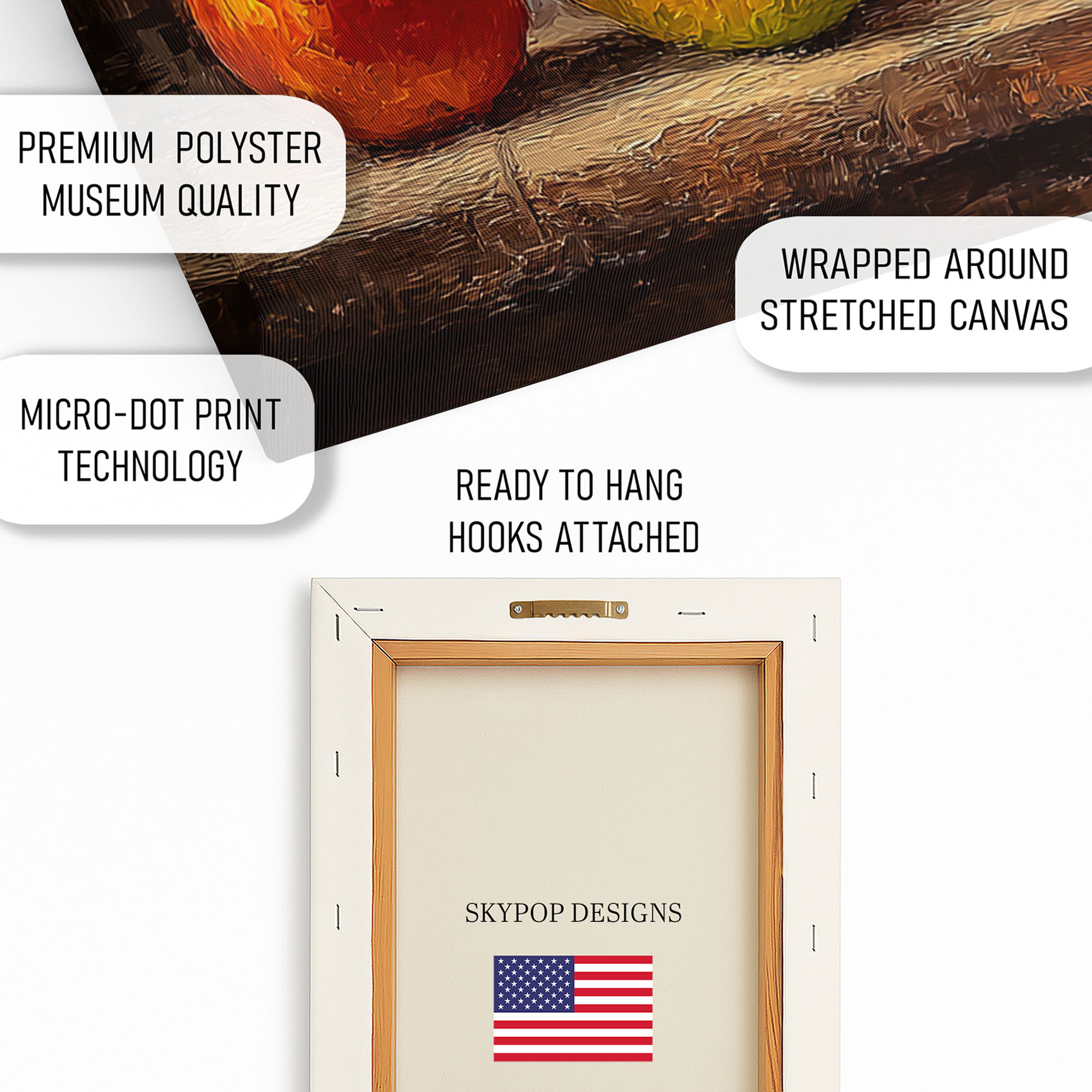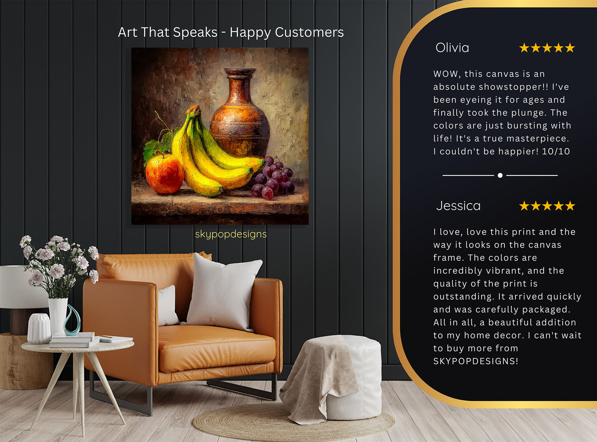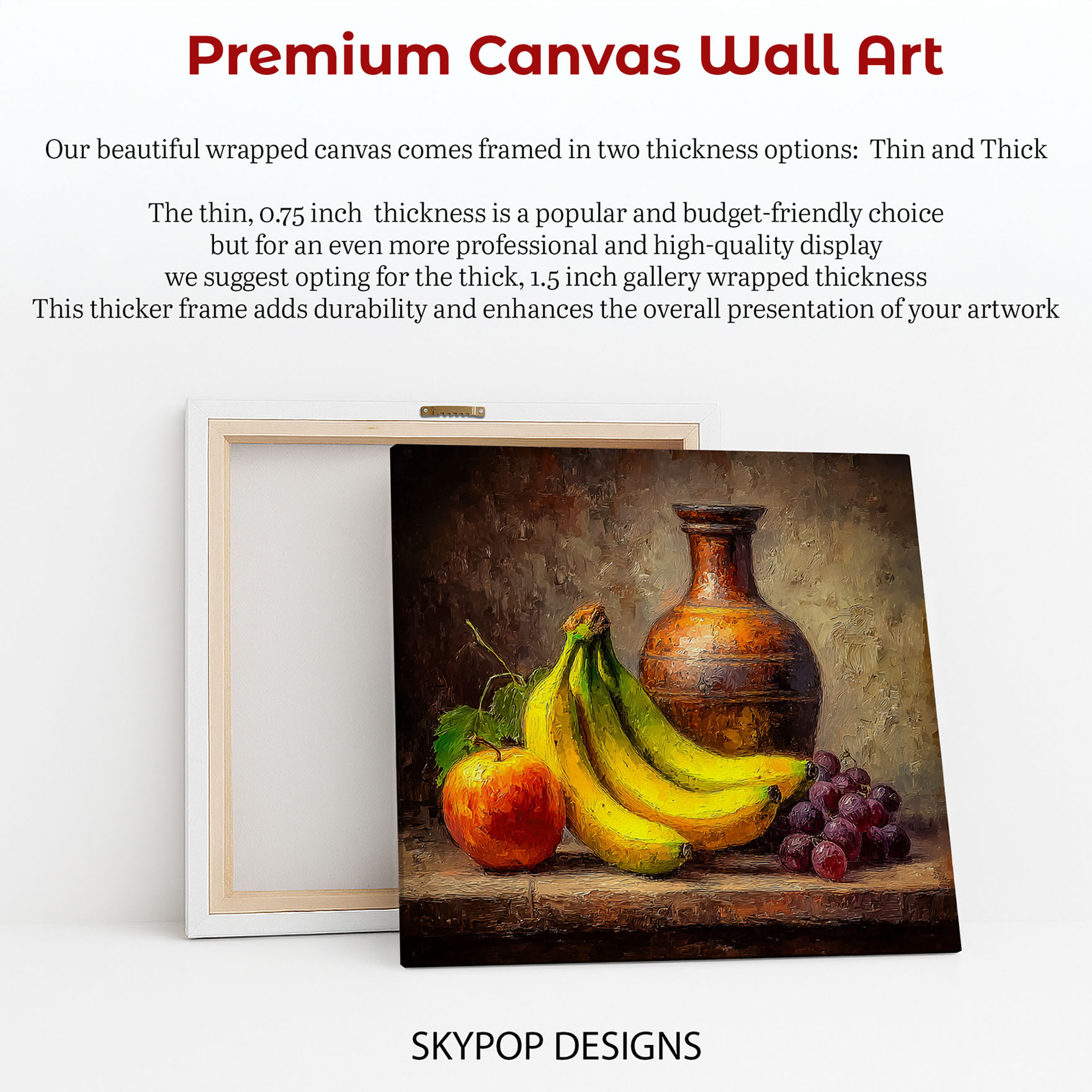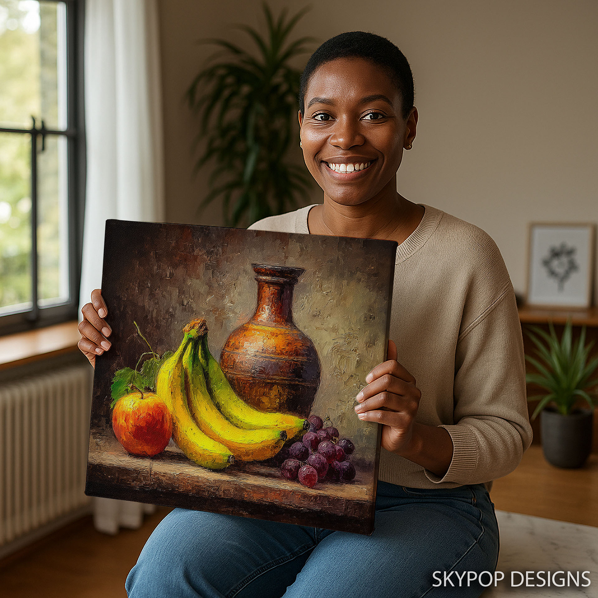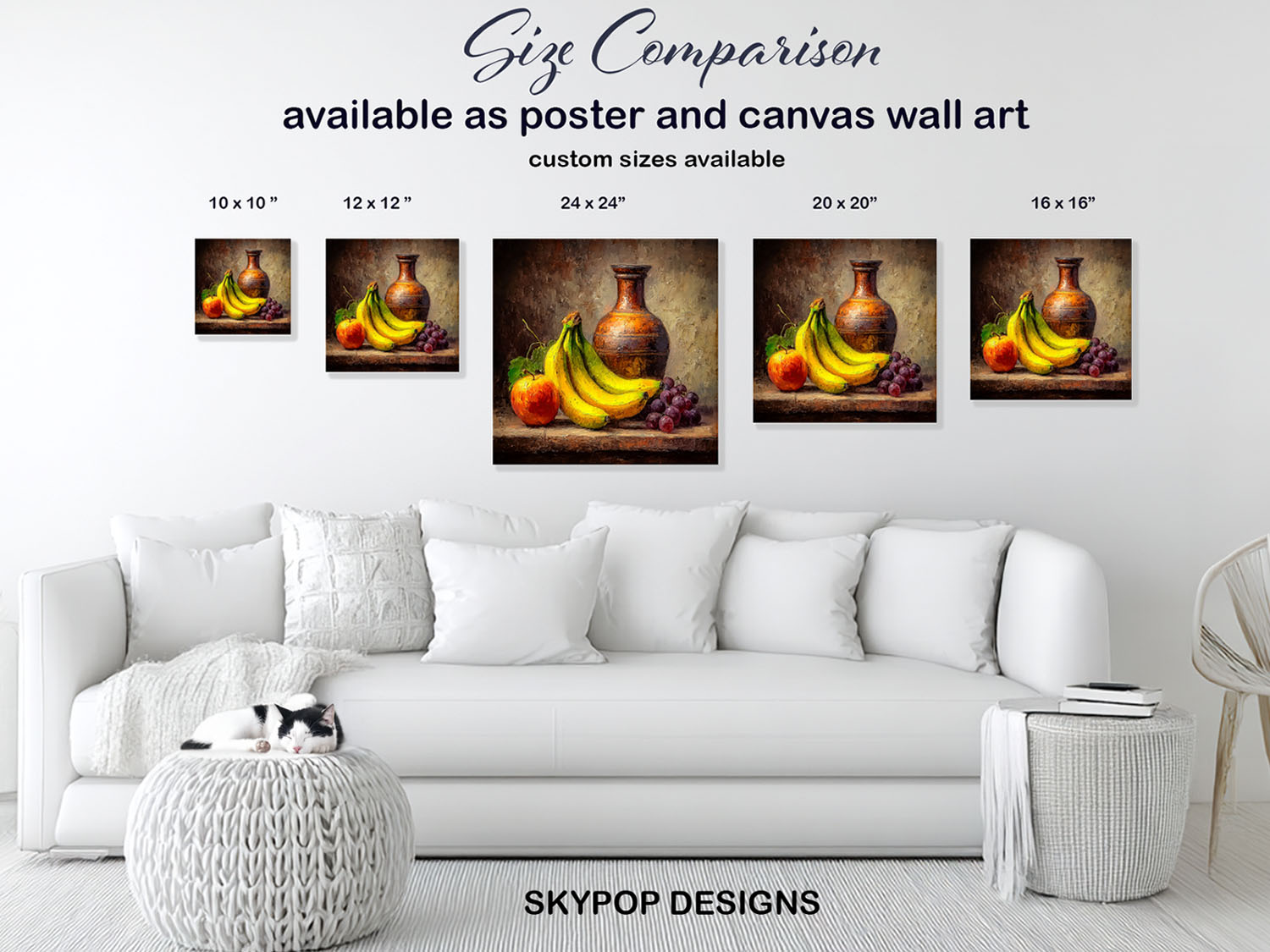 Transform your home with this exquisite still life canvas wall art featuring a classic arrangement of fresh fruit. This poster or canvas wall art beautifully captures the rich textures and vibrant colors of an apple, bananas, and grapes, complemented by an antique vase. The warm, earthy tones make this piece perfect for traditional and rustic decor styles, instantly elevating kitchen or dining room wall decor. The interplay of light and shadow on the fruit and vase adds a timeless depth to the composition, making it a captivating focal point for your entryway or living room. This still life artwork embodies the elegance of classic art, bringing a sense of abundance and natural beauty into your space. The painting style, with its visible brushstrokes, adds a tactile quality that enhances the overall visual appeal of this canvas art. It’s an ideal addition for those who appreciate Tuscan-inspired interiors or farmhouse aesthetics, creating a warm and inviting atmosphere. High-quality printing ensures the rich yellows of the bananas, the deep reds of the apple, and the purples of the grapes are rendered with striking clarity. This fruit wall art is not just decor; it’s a celebration of nature’s bounty and artistic tradition. Makes a thoughtful housewarming, holiday, or birthday gift for anyone who loves classic art and charming home accents. Elevate your home’s aesthetic with this stunning still life canvas art that combines traditional charm with contemporary appeal. Bring the beauty of nature indoors with this captivating fruit poster that promises to be a cherished piece of wall art for years to come.