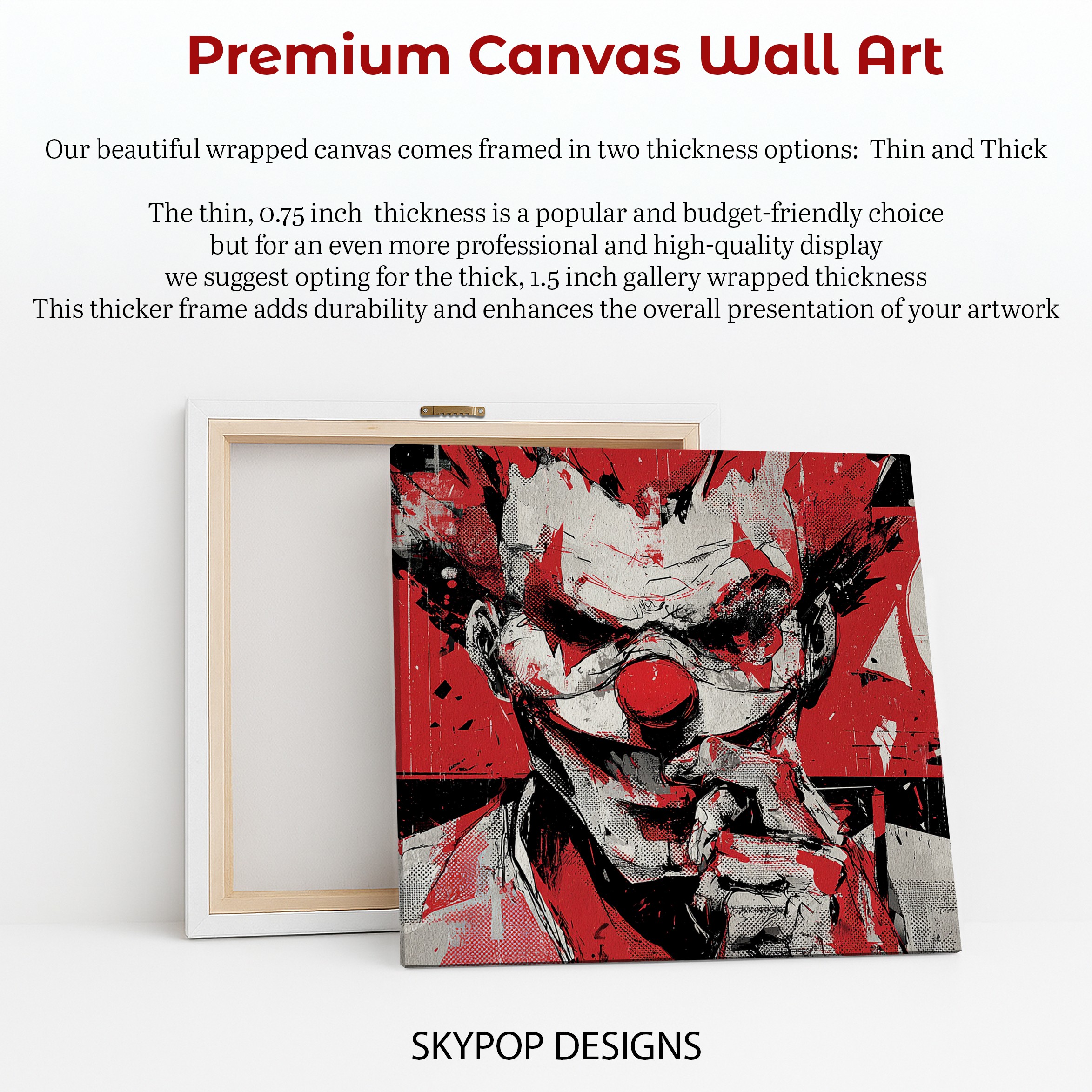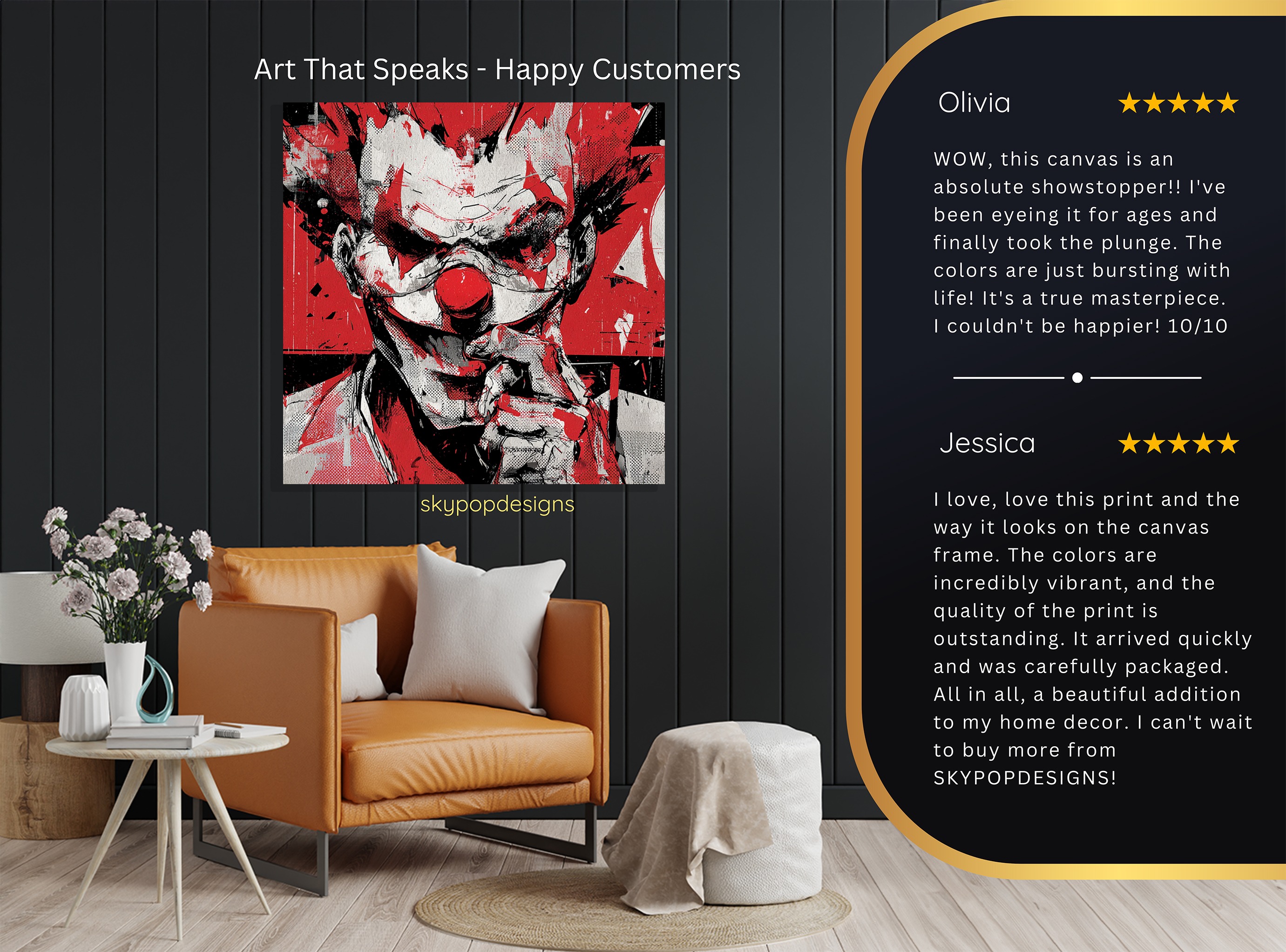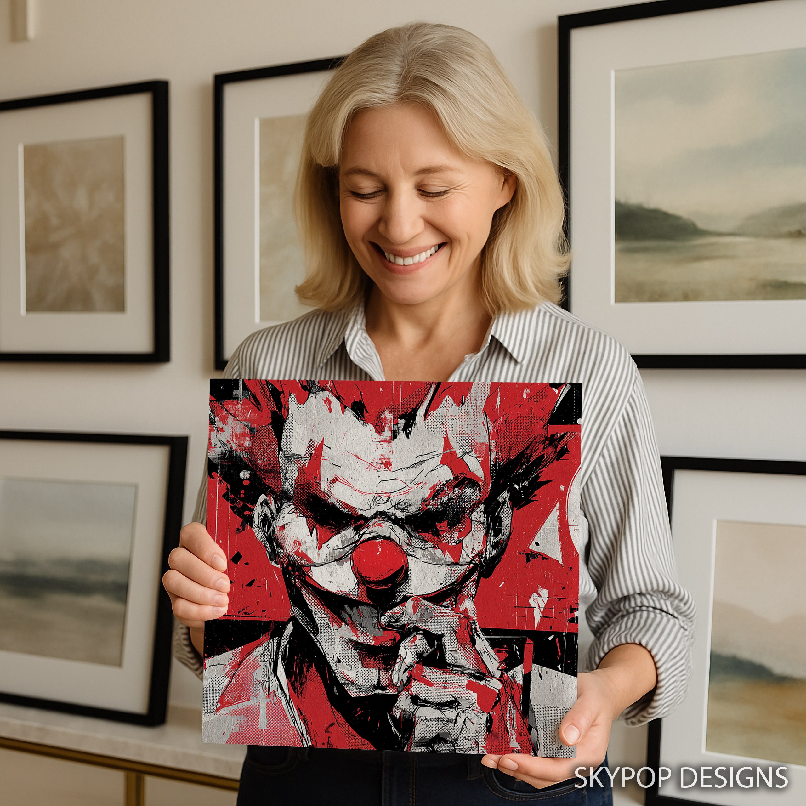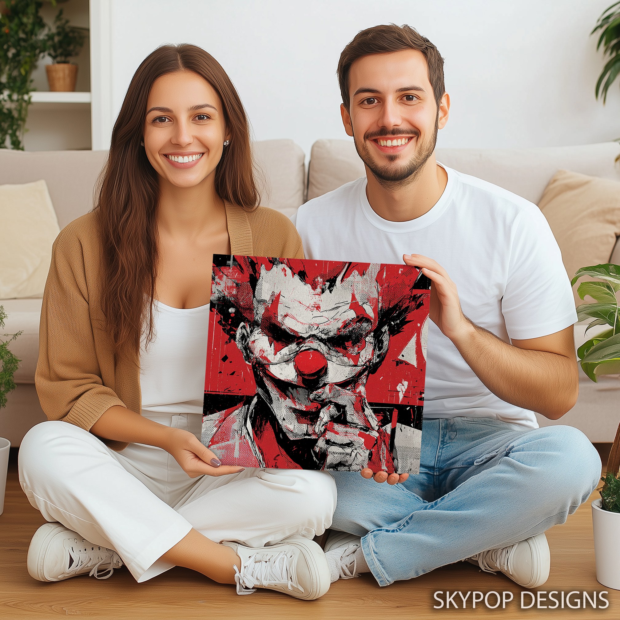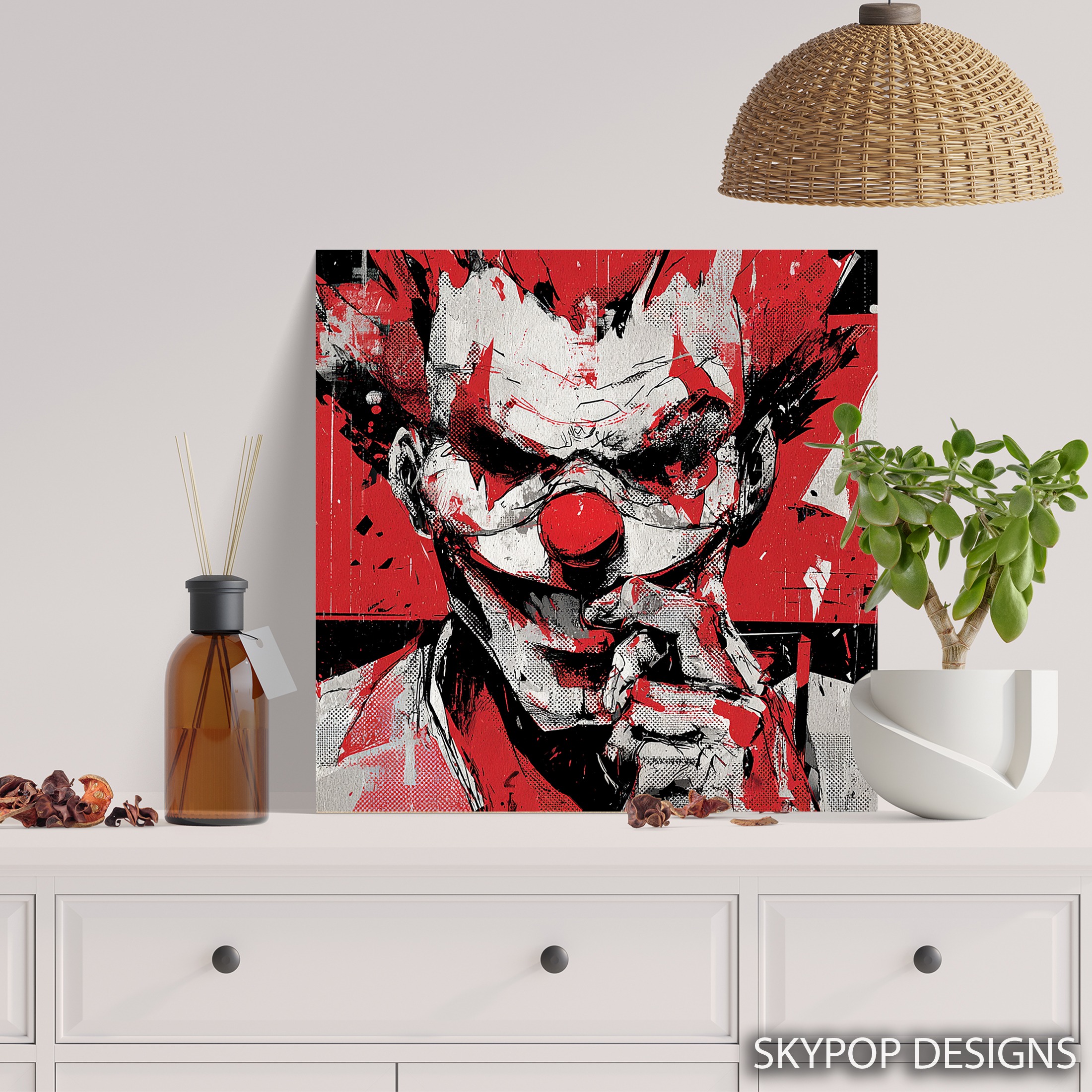 Transform your space with this striking clown face canvas wall art that embodies the raw energy of street art. This bold poster captures the essence of urban culture with its dramatic red and black color scheme, perfect for adding a modern edge to any room. The abstract interpretation of a clown’s face, with its intense gaze and exaggerated features, creates an immediate focal point that demands attention. Ideal for contemporary living rooms or edgy office spaces, this canvas art piece brings a touch of underground cool to your decor. The dynamic brushstrokes and splatter effects give the artwork a sense of movement and urgency, making it a conversation starter for art enthusiasts. The stark contrast between the vibrant red background and the black and white facial features adds depth and intensity to the composition. This versatile wall art works well in minimalist settings, providing a pop of color and personality without overwhelming the space. Whether you’re looking to create a statement wall in your home theater or add some artistic flair to a game room, this clown face artwork delivers maximum impact. The high-quality printing ensures every detail of the gritty texture and expressive lines is captured, allowing you to appreciate the artistry up close. Elevate your interior design with this powerful piece that blends pop art sensibilities with street art attitude. Make a bold statement and transform your walls today with this captivating clown face canvas art.