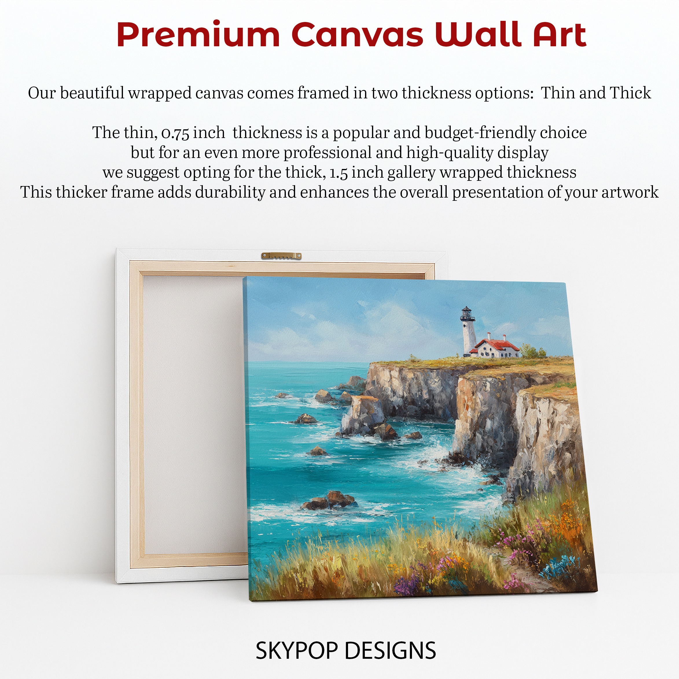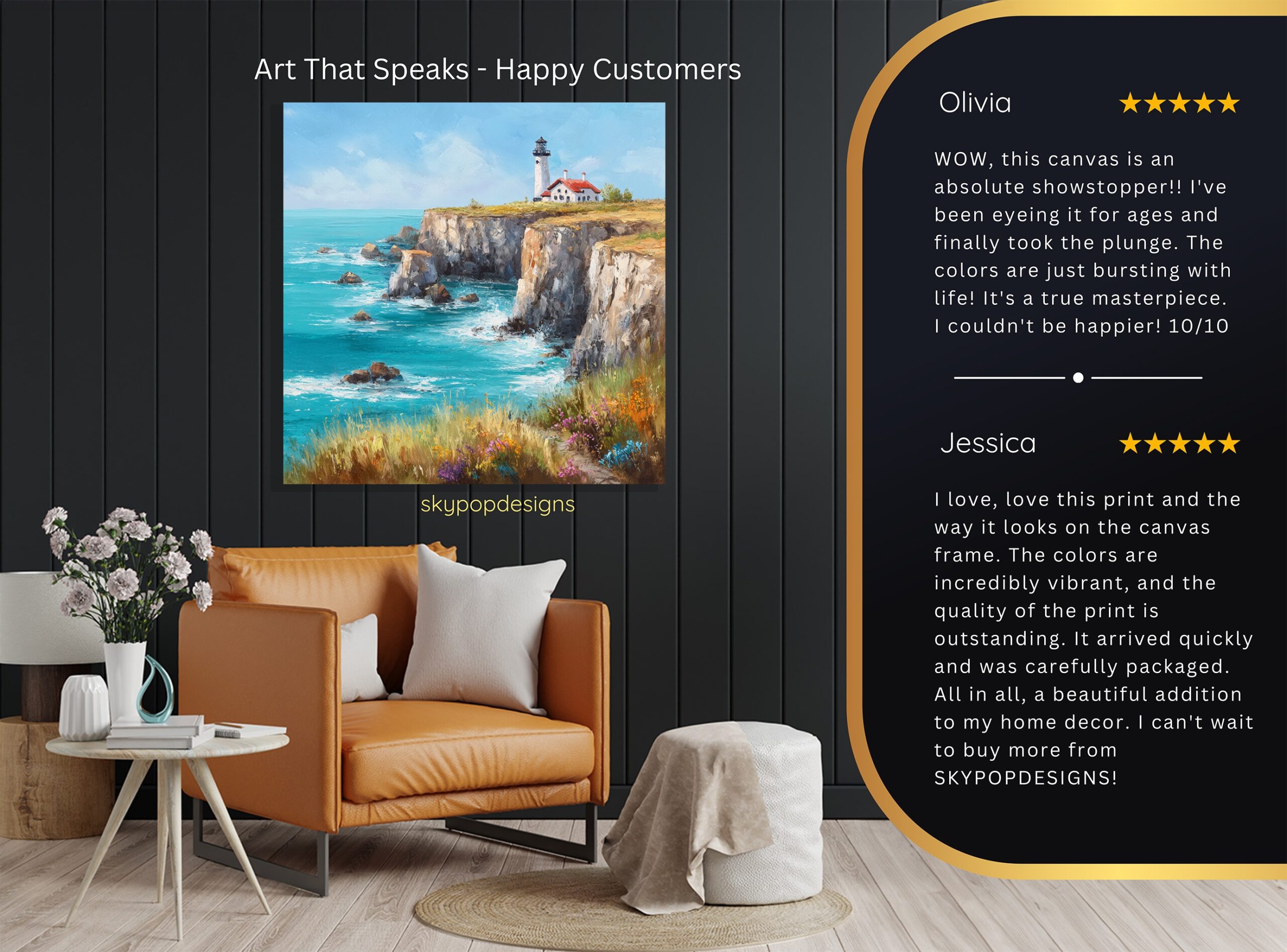 Bring the serene beauty of the coast into your home with this stunning lighthouse canvas wall art. This captivating piece showcases a majestic white lighthouse perched atop rugged cliffs, overlooking a vibrant turquoise sea. Perfect for coastal-inspired living rooms or beach-themed bedrooms, this poster or canvas print instantly transports you to a peaceful seaside retreat. The impressionistic brushstrokes create a dreamy, textured effect that adds depth and character to any space. Ideal for rustic or traditional decor styles, this artwork celebrates the timeless allure of maritime landscapes. The vivid blue ocean contrasts beautifully with the earthy tones of the cliffs, creating a balanced and harmonious composition. Whether you’re a lighthouse enthusiast or simply love coastal scenery, this versatile piece complements various interior designs. The high-quality printing captures every detail, from the lighthouse’s intricate architecture to the wildflowers dotting the cliff’s edge. Transform your office into a calming workspace or add a touch of nautical charm to your dining room. This canvas wall art makes an excellent housewarming or holiday gift for anyone who cherishes coastal living. Available in multiple sizes, it’s easy to find the perfect fit for your wall. Elevate your home decor with this breathtaking lighthouse scene that brings the serenity of the coast indoors. Make a statement in your space with this timeless coastal artwork today.