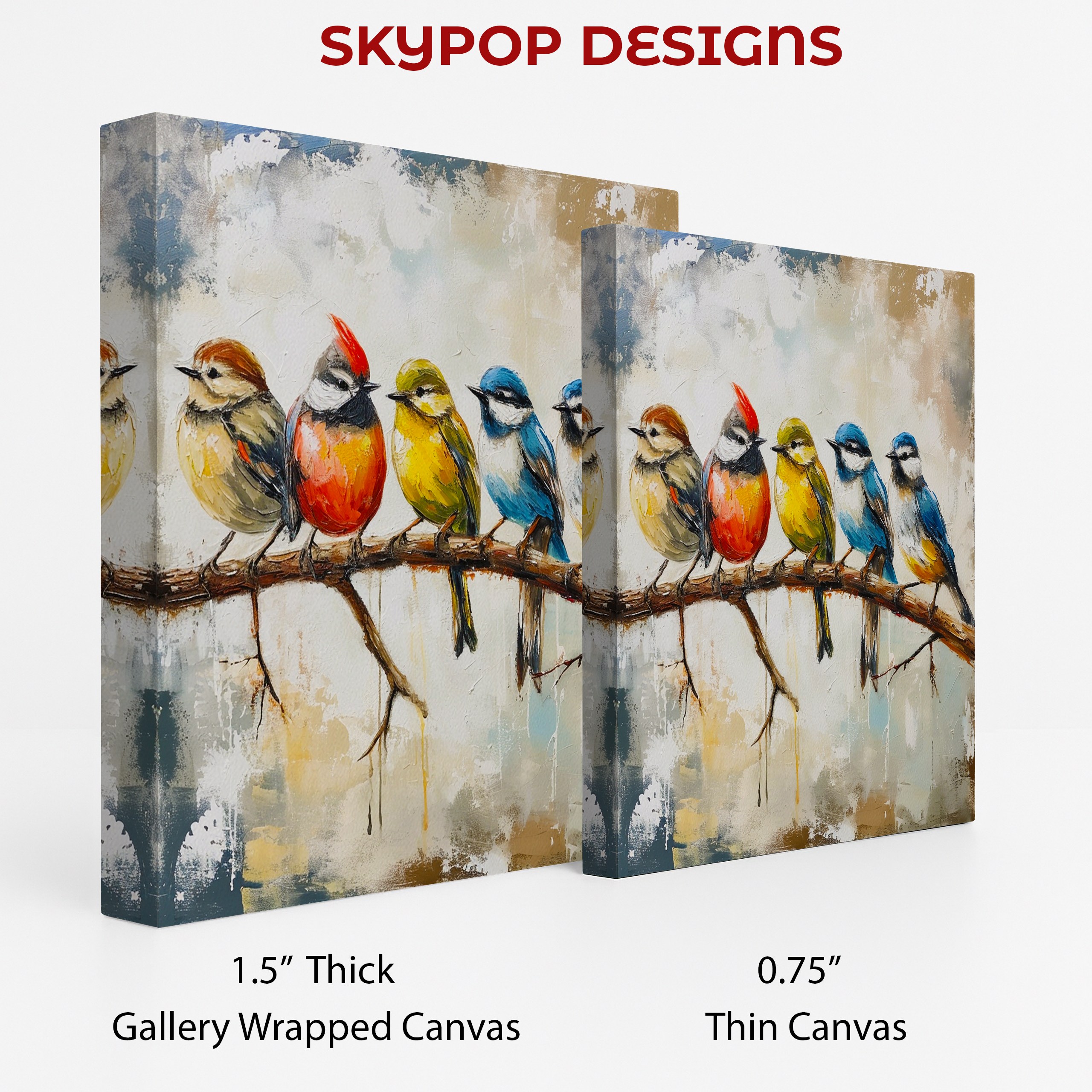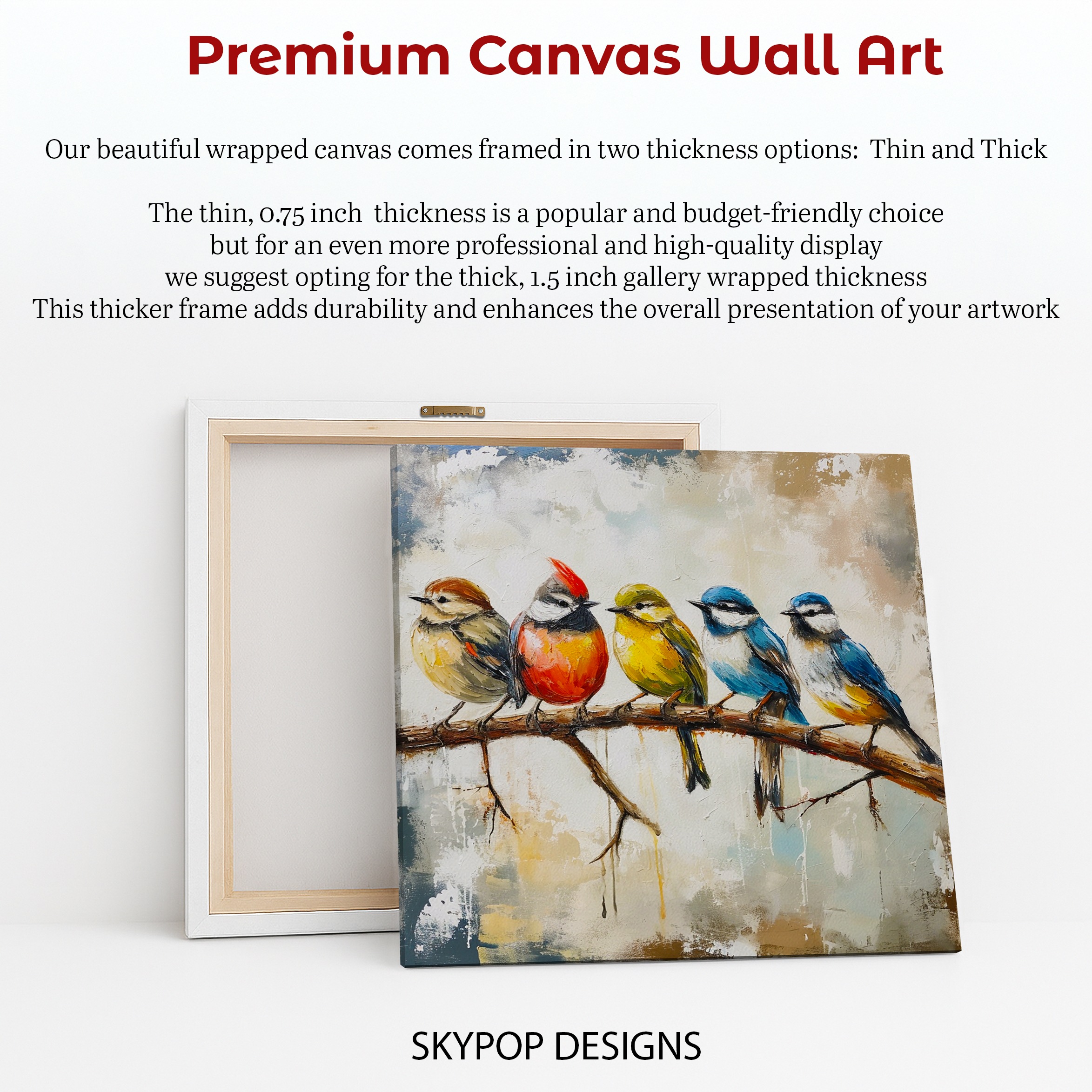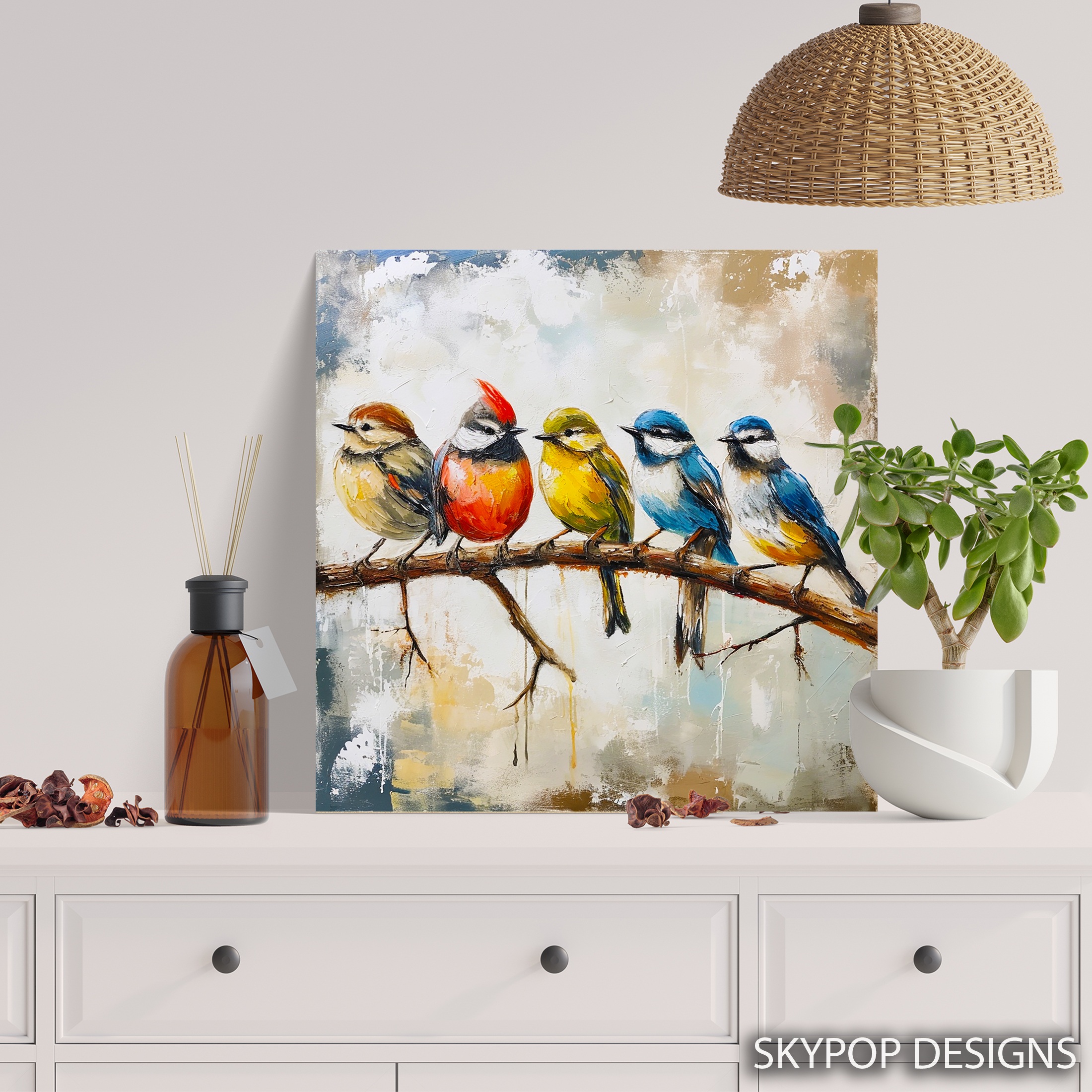 Bring a burst of color and nature into your home with this vibrant canvas wall art featuring five charming birds perched on a branch. This eye-catching poster showcases a delightful array of songbirds, each with its own unique personality and vivid plumage. Perfect for nature lovers and bird enthusiasts, this contemporary artwork adds a touch of whimsy to any room. The striking colors – bold reds, sunny yellows, and serene blues – create an instant focal point that brightens up neutral spaces. Ideal for rustic farmhouse decor or modern interiors alike, this versatile piece works wonderfully in living rooms, bedrooms, or children’s spaces. The textured brushstrokes give depth and movement to the composition, making it feel alive and dynamic. This canvas art is a great conversation starter and can help create a calm, nature-inspired atmosphere in your home office. The high-quality printing ensures every detail of the birds’ feathers and expressions is captured beautifully. Whether you’re looking to refresh your seasonal decor or searching for the perfect housewarming gift, this colorful bird artwork fits the bill. Available in various sizes, it’s easy to find the right fit for your wall. Transform your space today with this cheerful and uplifting bird-themed wall art that celebrates the beauty of nature and brings the outdoors inside.