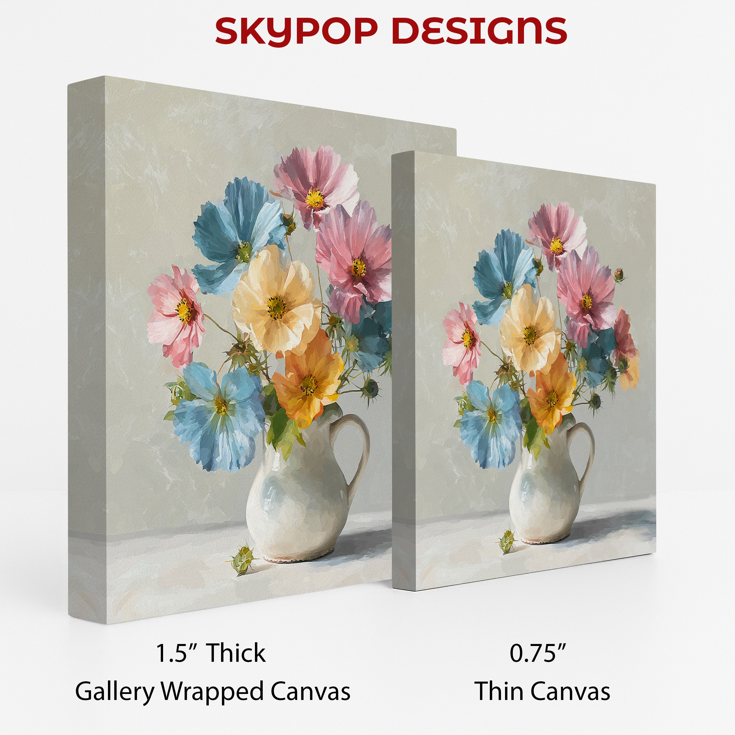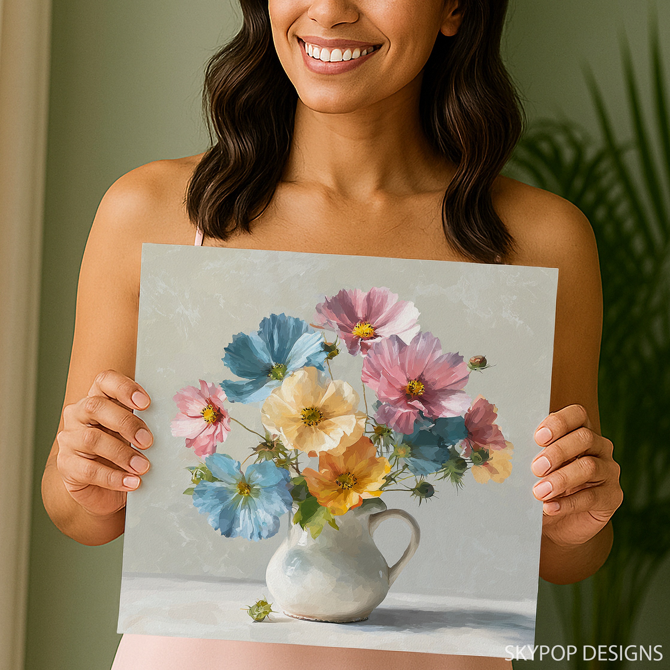 Brighten your space with this stunning floral canvas wall art featuring a vibrant bouquet of cosmos flowers. This eye-catching poster transforms any room with its cheerful mix of pink, blue, and yellow blooms artfully arranged in a classic white pitcher. Perfect for farmhouse or shabby chic interiors, this contemporary still life brings a touch of nature’s beauty indoors. The delicate petals and soft color palette create a soothing atmosphere, ideal for bedrooms or living rooms seeking a calm yet uplifting focal point. This versatile canvas art seamlessly blends with modern decor styles, adding a pop of color to neutral spaces. The textured brushstrokes lend depth and character, making the flowers appear to come alive on your wall. Whether displayed in a cozy breakfast nook or as statement art in your home office, this piece evokes the joy of a fresh-picked garden bouquet. The high-quality printing captures every nuance, from the sunny yellow centers to the soft blue petals. Gift this timeless floral artwork to celebrate a housewarming or to refresh your own seasonal decor. Available in various sizes, this canvas wall art adapts beautifully to any room, instantly elevating your space with its charming blend of classic and contemporary appeal. Bring the beauty of a summer garden into your home with this captivating cosmos bouquet art today.