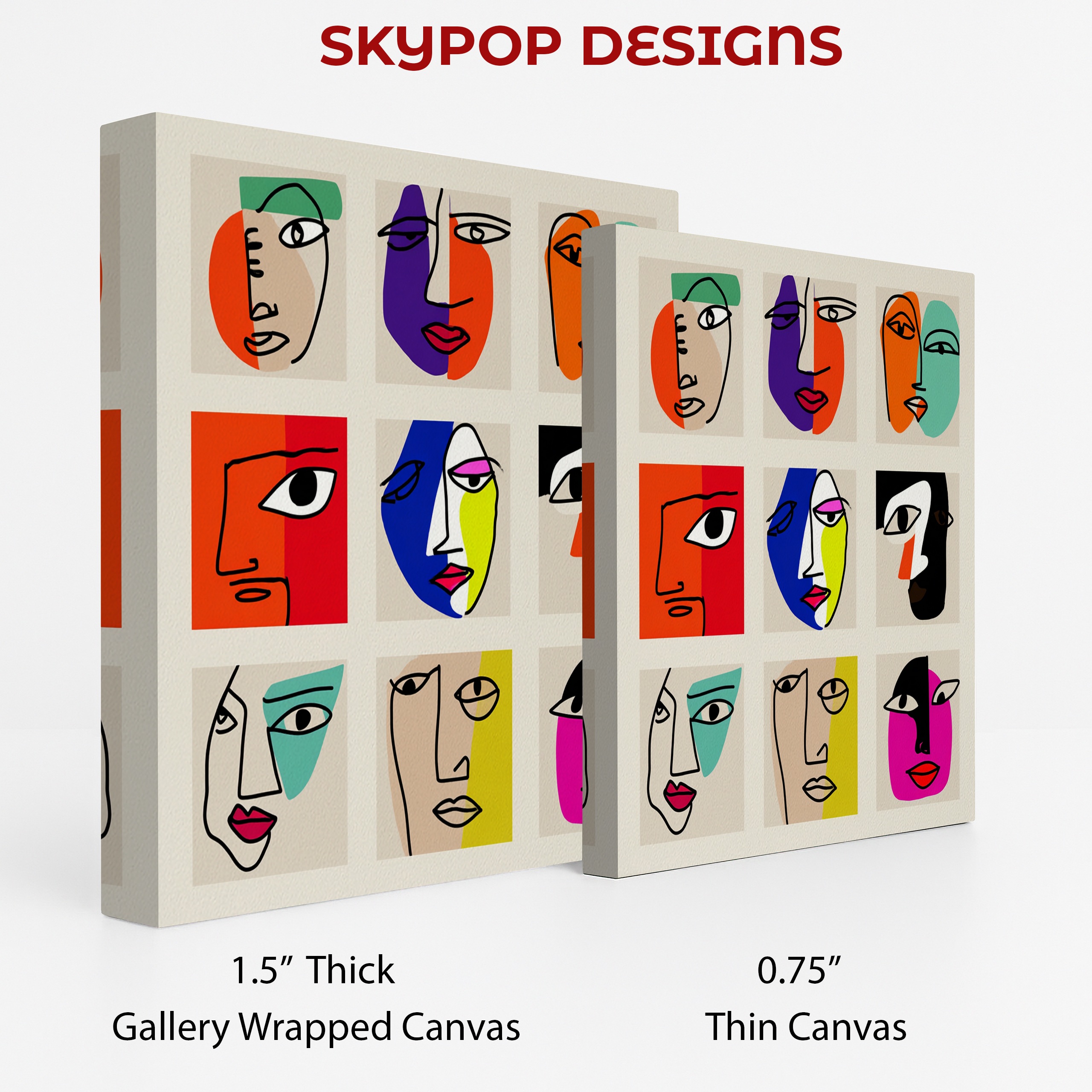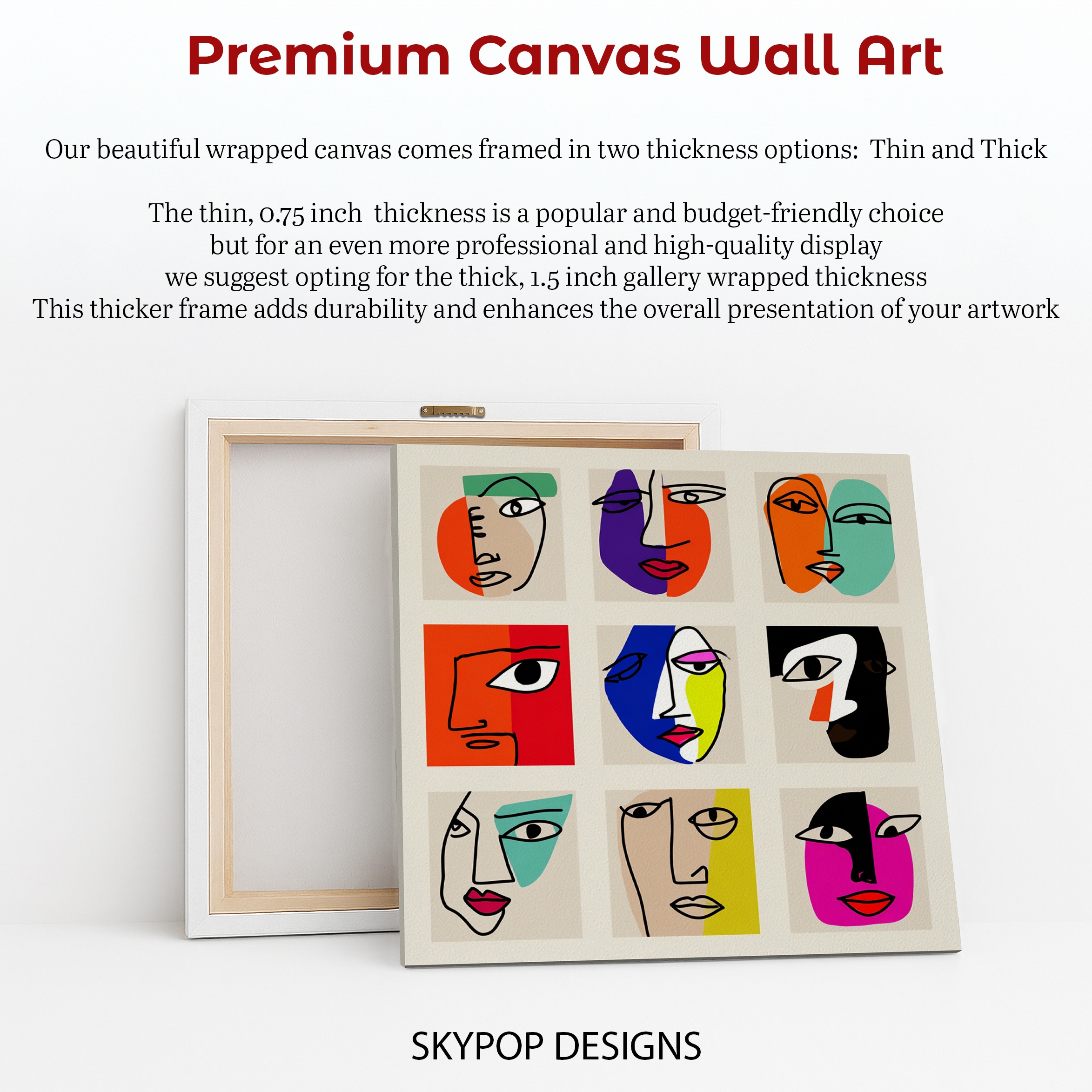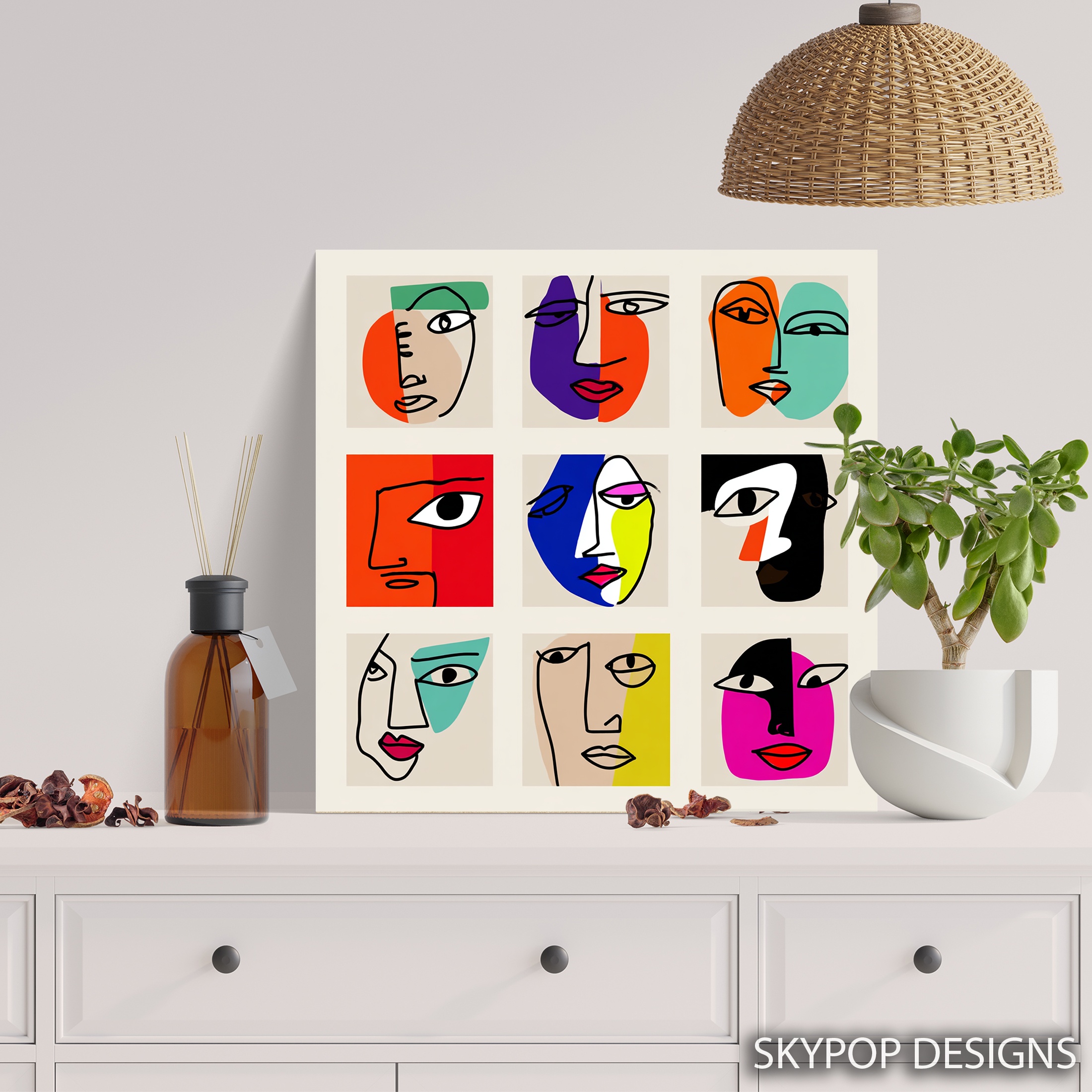 Transform your space with this vibrant and eye-catching canvas wall art featuring a collection of abstract faces. This striking poster set showcases nine unique portraits, each bursting with bold colors and minimalist lines that create a captivating visual impact. Perfect for modern living room wall decor or as a statement piece in a contemporary bedroom, this artwork effortlessly combines pop art sensibilities with abstract expression. The diverse color palette, including vivid oranges, deep purples, and cool blues, adds energy and personality to any room. Ideal for those seeking bohemian bedroom art or a touch of artistic flair in their home office, these faces inspire creativity and conversation. The minimalist style allows for versatile placement, complementing various decor themes from eclectic to sleek modern. Each face tells its own story, making this canvas art set a thought-provoking addition to your wall decor collection. The high-quality printing ensures every bold line and color pop stands out, creating a lasting impression. Whether displayed as a complete set or individually, these abstract portraits add depth and character to your space. Elevate your interior design with this unique blend of contemporary art and pop culture influence. Transform your walls today with this bold and expressive canvas wall art that celebrates individuality and artistic vision.