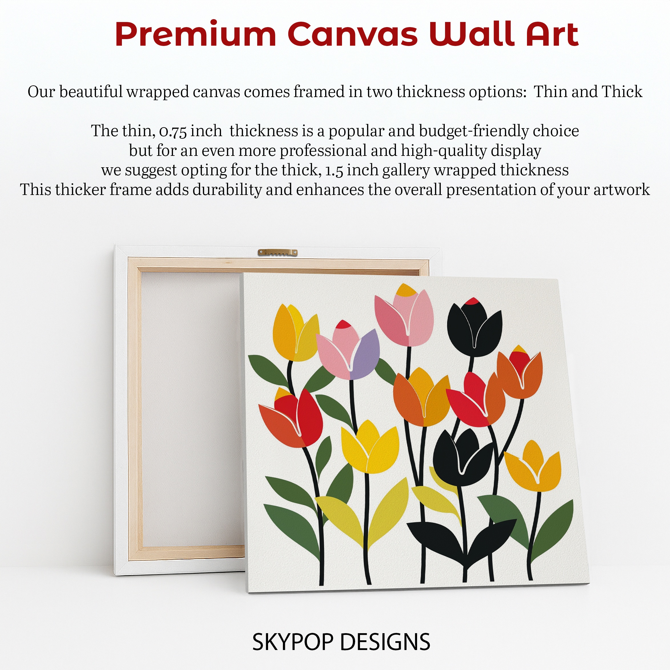 Brighten your space with this vibrant tulip canvas wall art, featuring a stunning array of colorful blooms that instantly elevate any room. This contemporary floral poster captures the essence of spring, bringing a fresh and lively atmosphere to your home or office. The minimalist design showcases stylized tulips in a rainbow of hues, including cheerful yellows, passionate reds, soft pinks, and bold blacks, creating a striking contrast that draws the eye. Perfect for modern living room wall decor or as a statement piece in a Scandinavian-inspired bedroom, this canvas art adds a pop of color and energy to neutral spaces. The simple yet impactful composition makes it an ideal choice for those who love clean lines with a touch of bohemian flair. This versatile wall art works beautifully in dining rooms, home offices, or as part of a gallery wall, effortlessly complementing various decor styles. The high-quality printing ensures that every petal and stem is crisp and vivid, making this piece a long-lasting addition to your art collection. Whether you’re looking to refresh your space for spring or searching for the perfect housewarming gift, this tulip artwork offers a timeless appeal that brightens any interior. Transform your room with this eye-catching floral canvas that celebrates the beauty of nature in a modern, artistic way. Bring the joy of a colorful garden indoors and enjoy the uplifting energy of these stylized tulips every day.