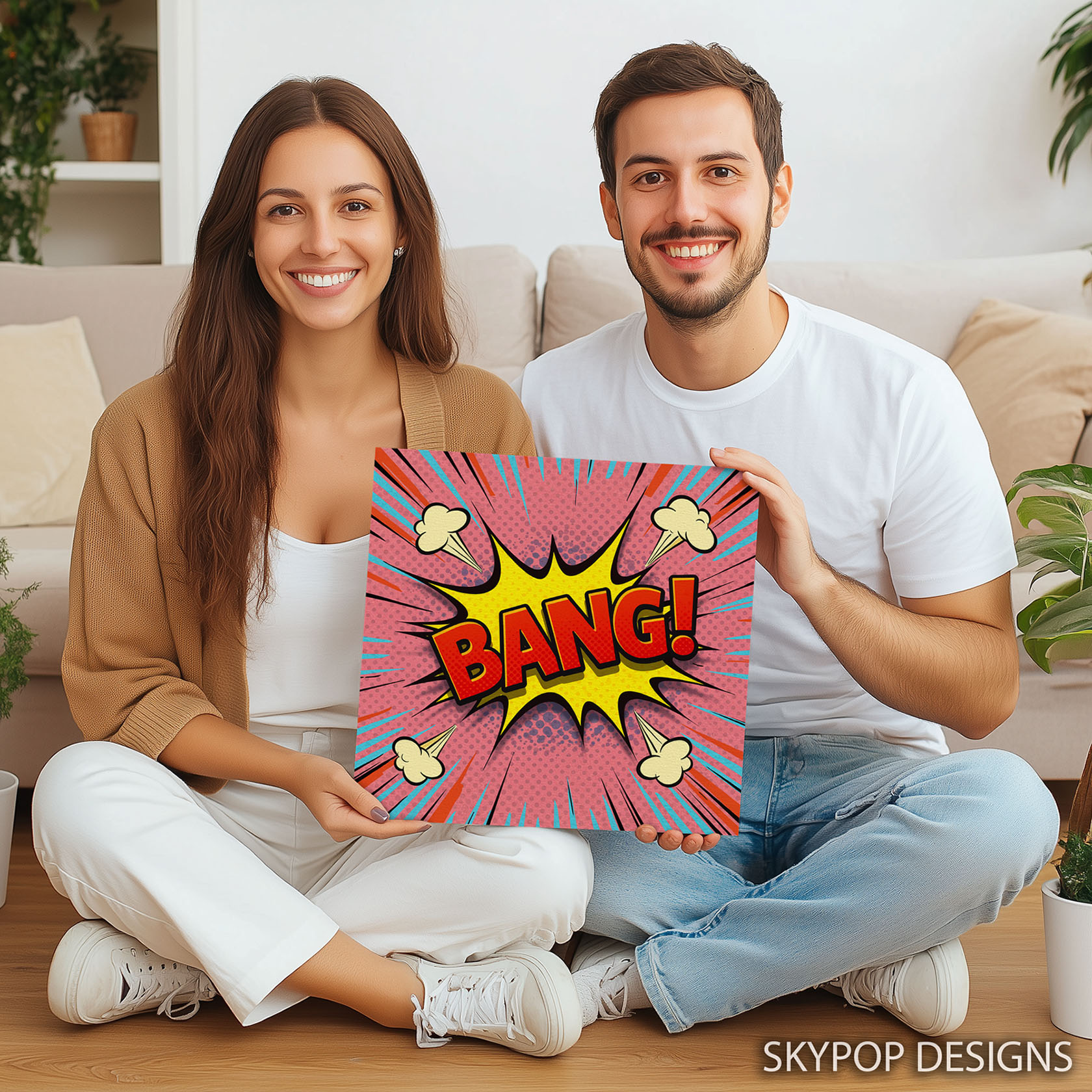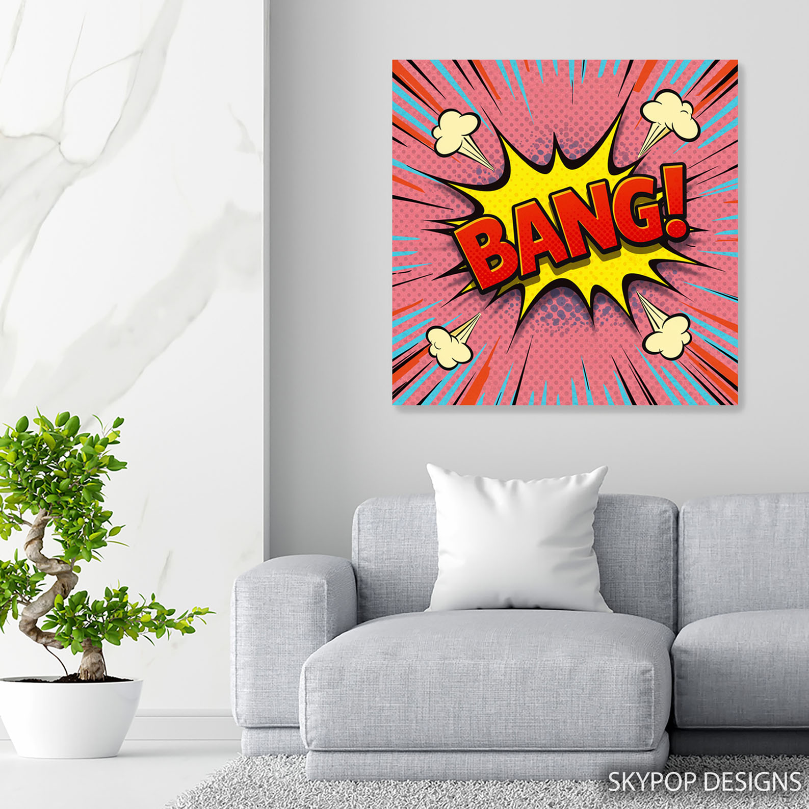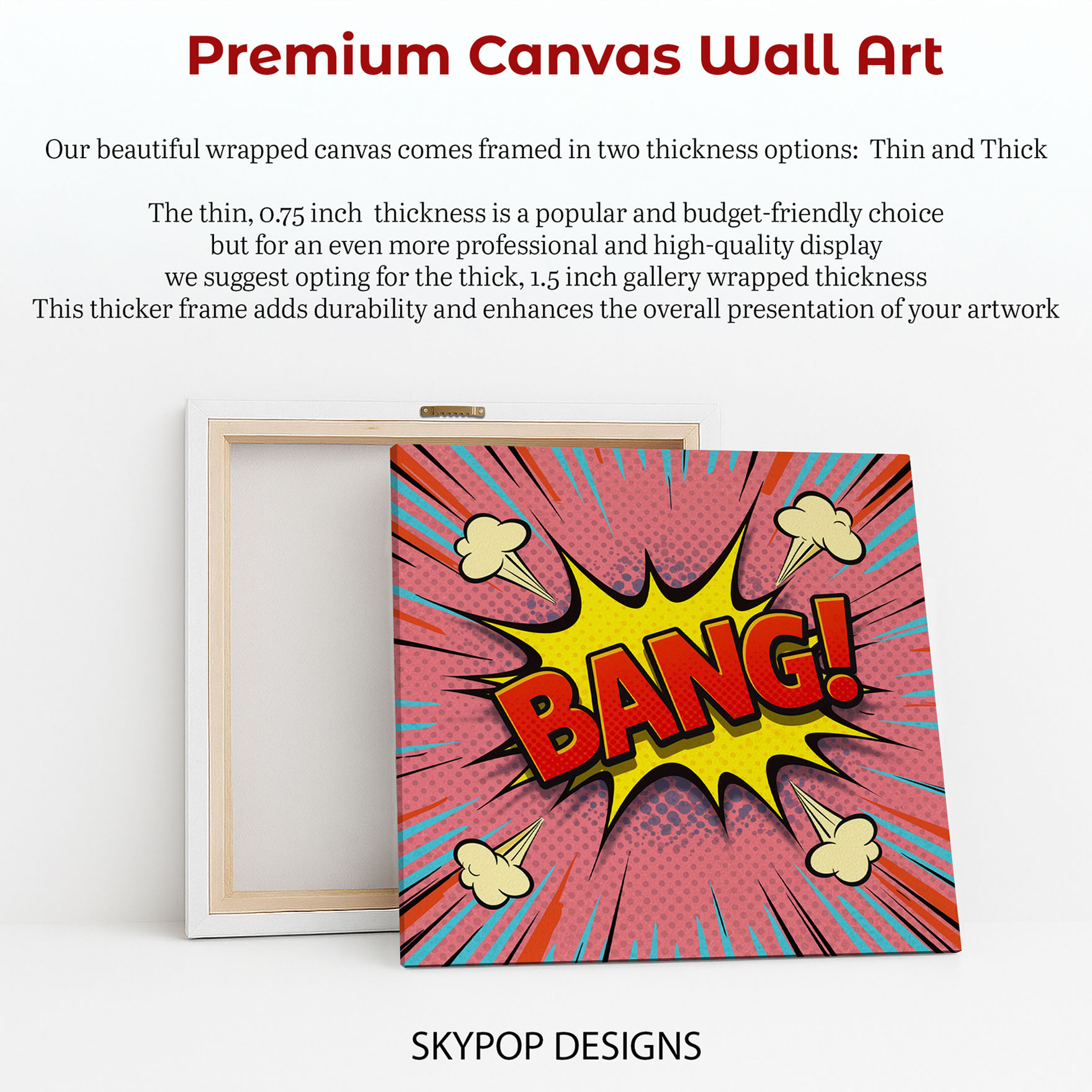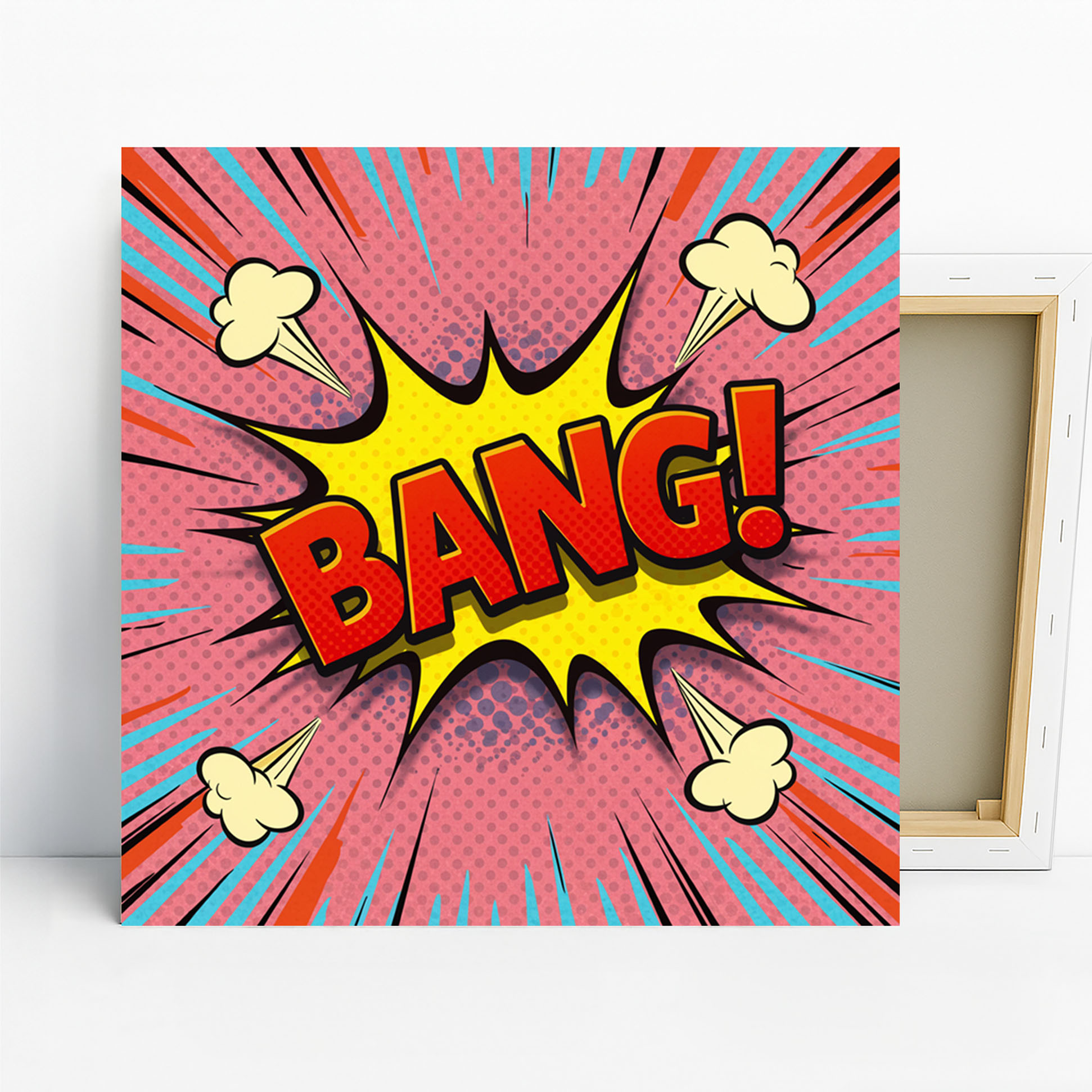 Unleash the energy with this dynamic BANG! comic canvas wall art, a perfect pop art statement piece for any space. This vibrant poster or canvas wall art is ideal for transforming your living room, game room, or even a home office into an exciting hub. The bold red “BANG!” against a striking yellow explosion is a captivating visual that exudes energy and fun. This graphic art design brings a modern, contemporary edge, while its comic book style adds a playful, bohemian touch. The multicolor palette, featuring vibrant reds, yellows, and pinks, creates a visually stimulating effect that is sure to grab attention. High-quality printing ensures the bold lines and halftone dots of this comic art poster are rendered with stunning clarity. It’s a fantastic way to add personality and a splash of excitement to neutral decor or to complement existing colorful schemes. This ‘BANG!’ canvas art is perfect for gifting on birthdays, holidays, or housewarmings to anyone who loves pop culture and bold graphic design. Elevate your wall decor with this energetic piece that celebrates the iconic style of comic books and street art. This striking canvas wall art is a conversation starter, bringing a sense of action and excitement into your home. Brighten your interiors and celebrate your love for graphic design with this unique poster today.