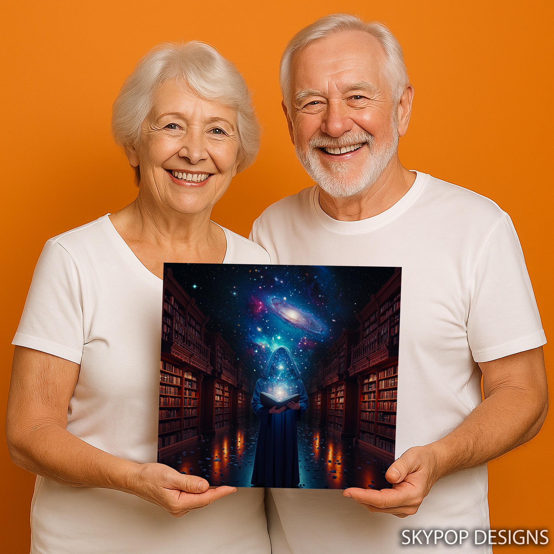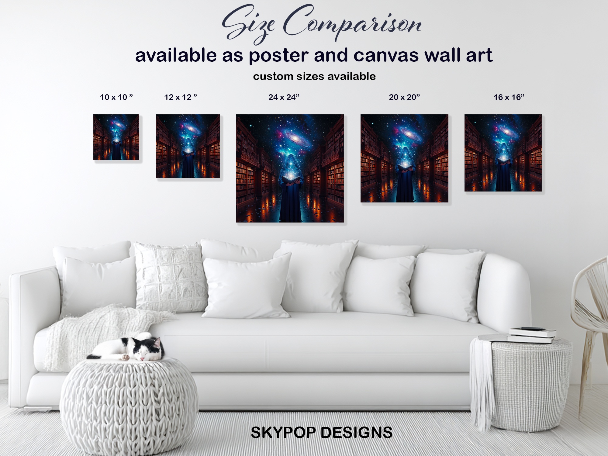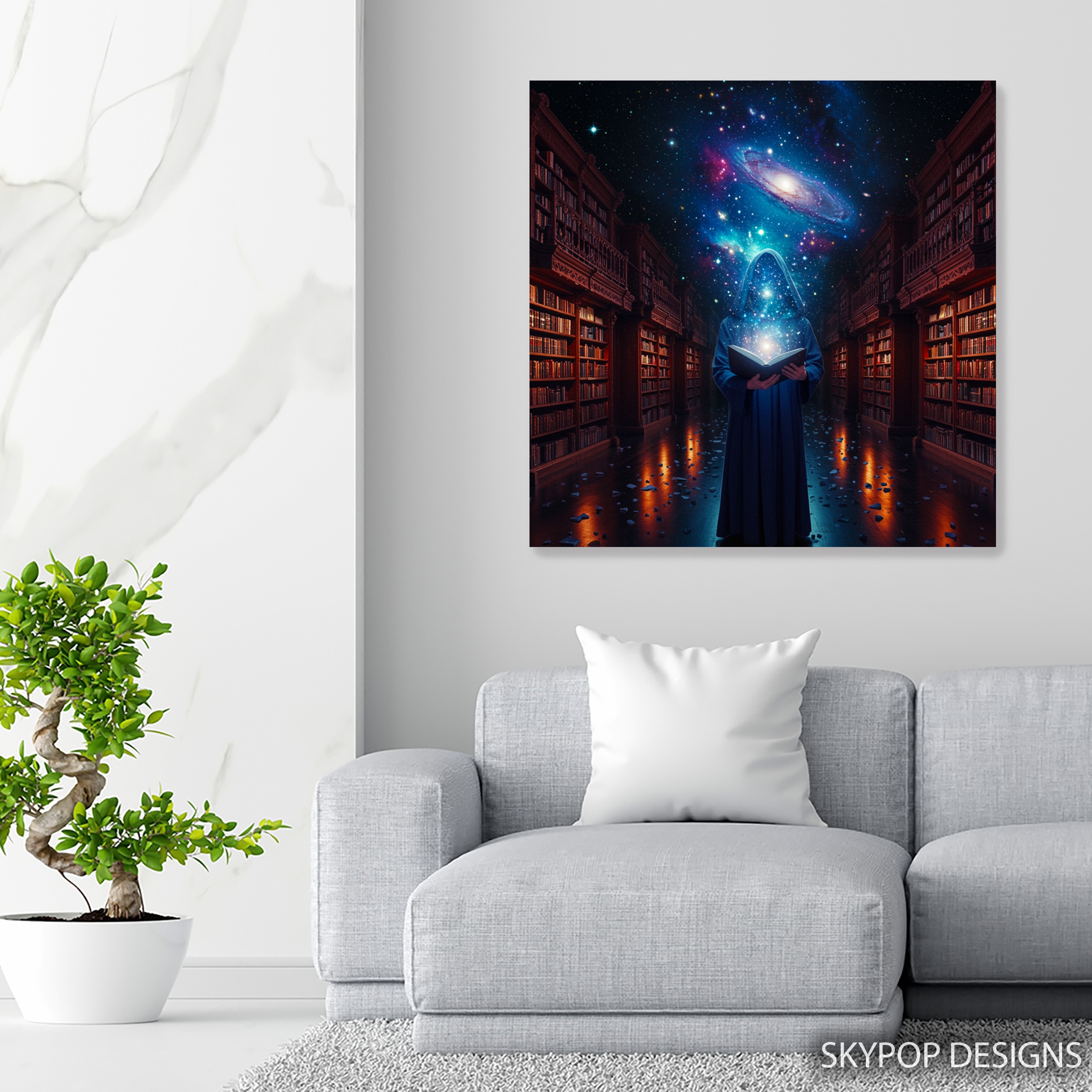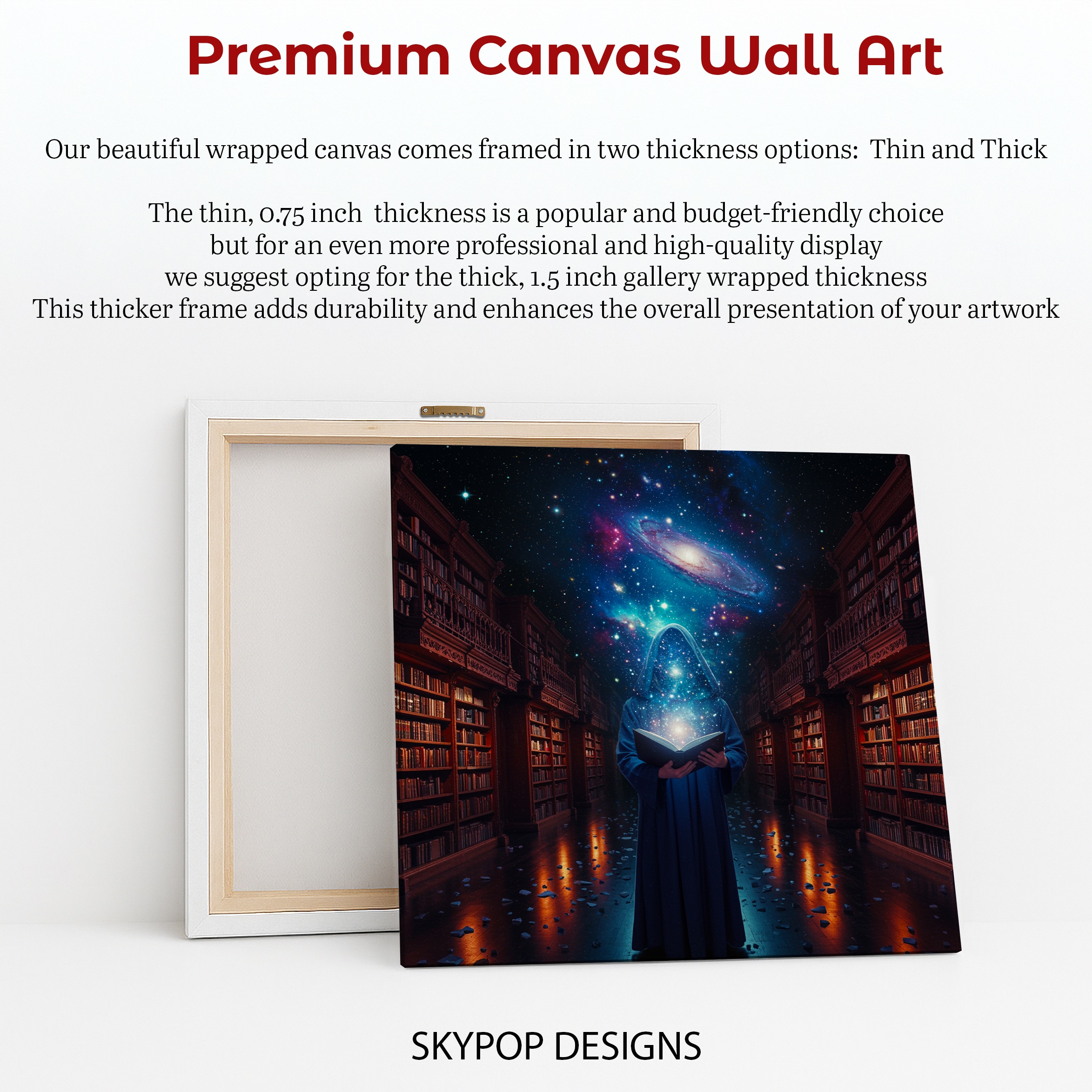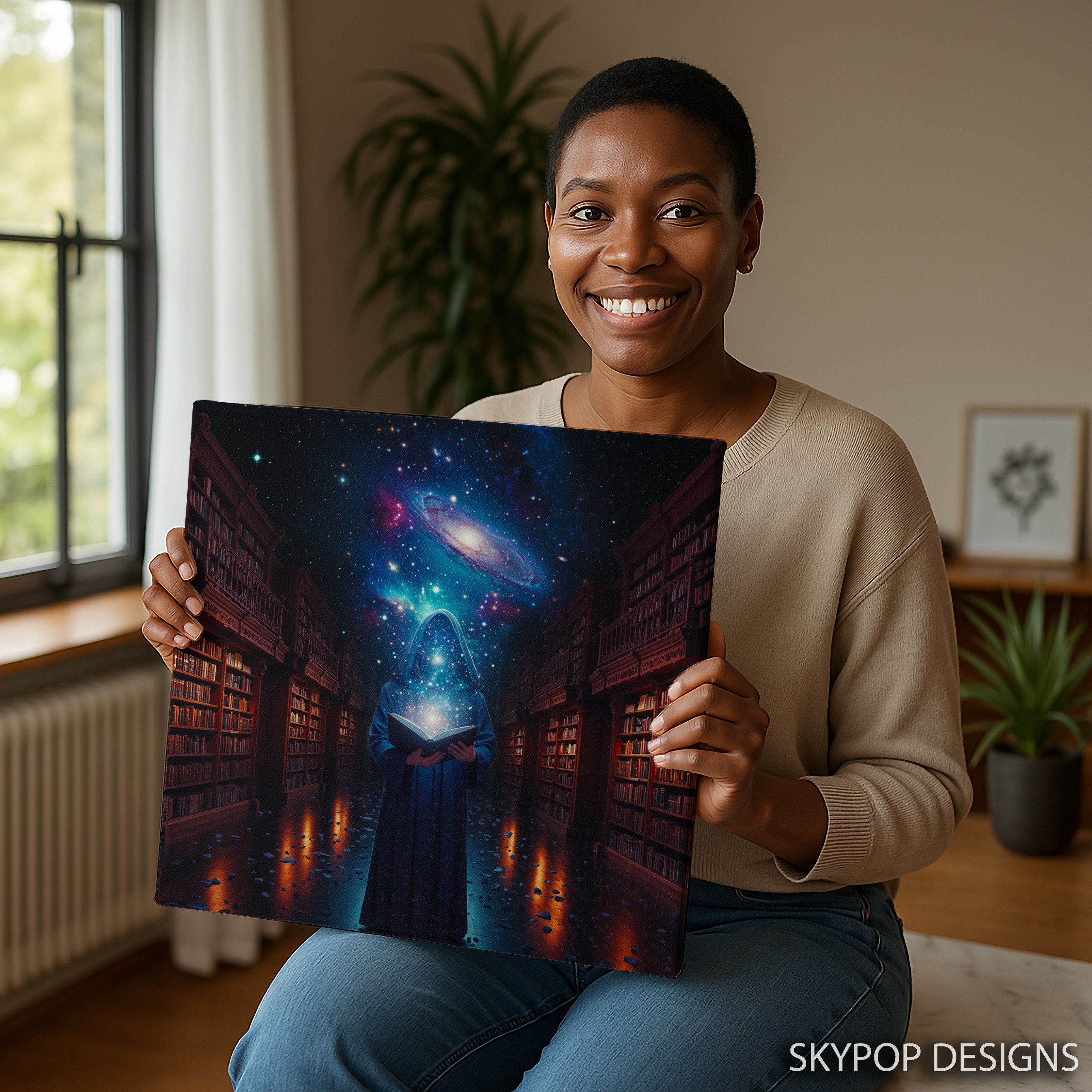 Elevate your space with this mesmerizing canvas wall art that blends the mystique of a library with the vastness of the cosmos. This striking poster captures a hooded figure holding an illuminated book, standing in a grand library while the universe unfolds above. Perfect for modern home offices or bohemian living rooms, this piece brings a touch of wonder and intellectual curiosity to any space. The rich brown tones of the bookshelves contrast beautifully with the deep blues and purples of the galaxy, creating a visually stunning composition. Ideal for book lovers, astronomers, or anyone seeking inspiration, this canvas art symbolizes the power of knowledge and the infinite possibilities of the human mind. The glowing book represents enlightenment, while the cosmic backdrop reminds us of our place in the vast universe. Transform your room into a sanctuary of learning and imagination with this thought-provoking wall decor. Whether displayed in a cozy reading nook or as a focal point in a minimalist bedroom, this artwork sparks conversation and contemplation. The high-quality printing ensures every star and galaxy is captured in vivid detail, making this piece a captivating addition to your art collection. Embrace the magic of literature and the mysteries of space with this unique blend of library aesthetics and cosmic wonder. Add a touch of intellectual charm to your walls today and let your imagination soar among the stars.
