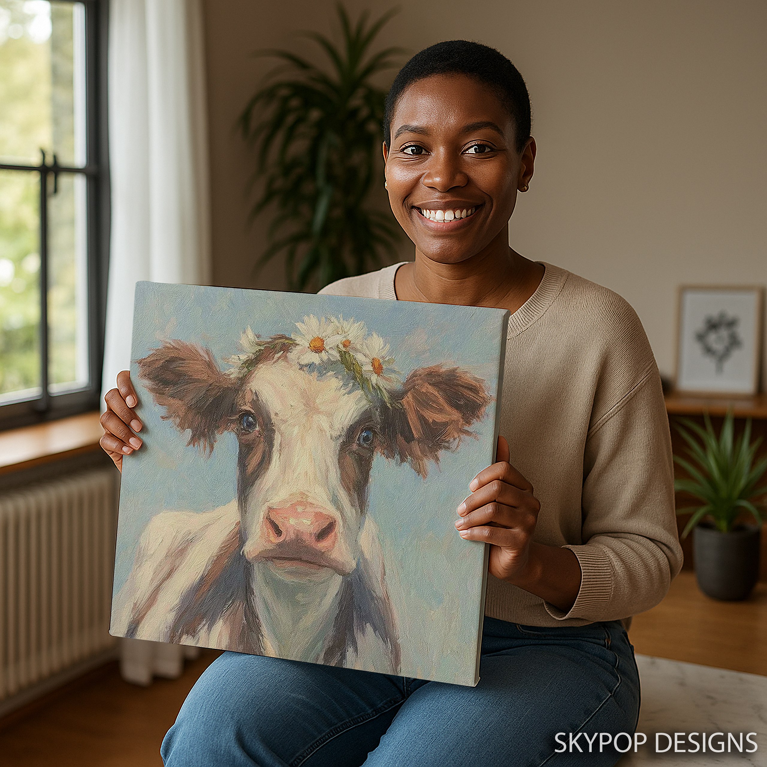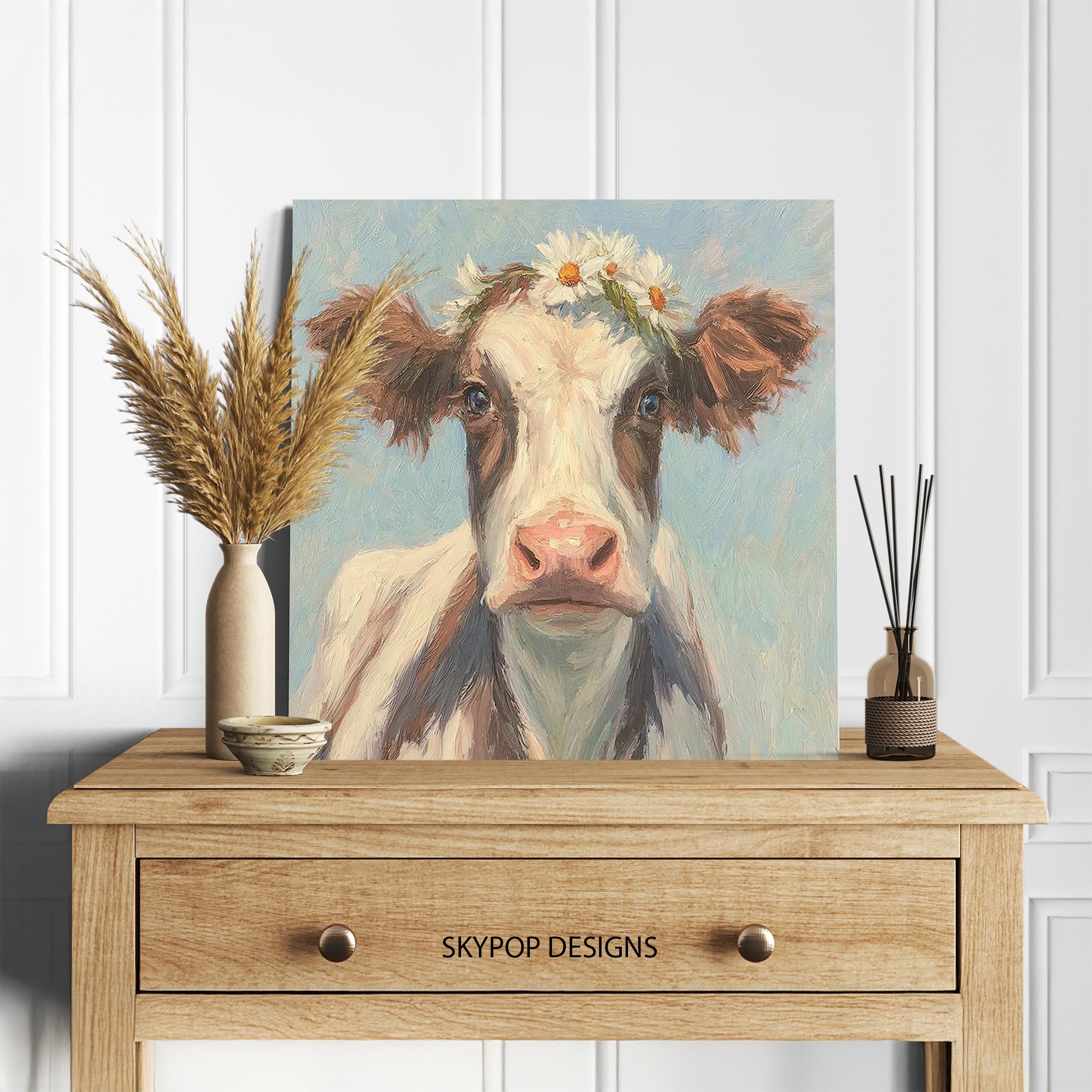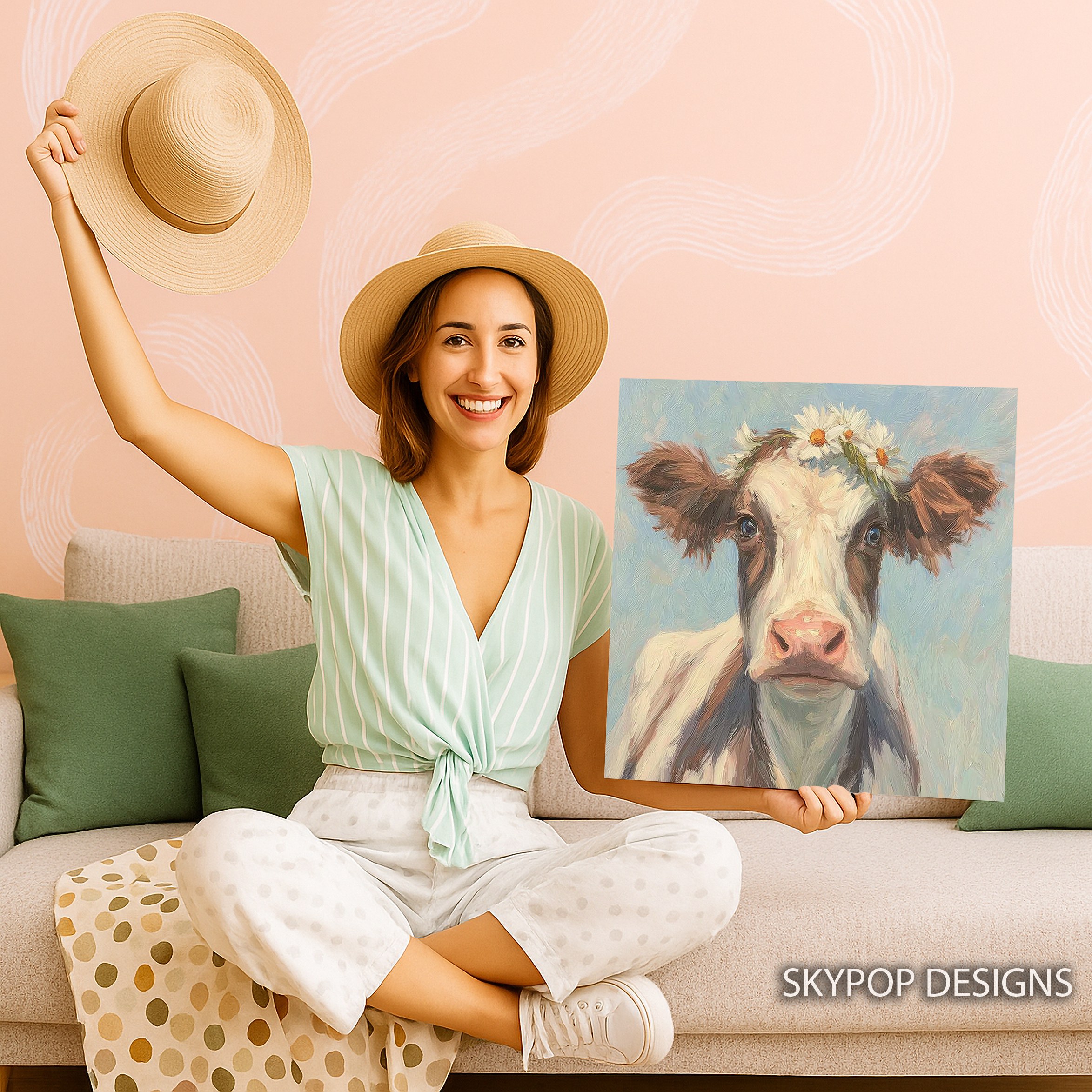 Add a touch of whimsy to your home with this charming cow canvas wall art. This delightful piece features a close-up of a friendly cow wearing a crown of daisies, perfect for bringing a bit of the countryside into your space. The soft blue background and the cow’s expressive eyes create a captivating focal point that’s sure to spark conversation. Ideal for farmhouse or rustic decor, this poster or canvas print adds character to any room, from a cozy kitchen to a welcoming living room. The textured brushstrokes give depth and personality to the artwork, making it feel like a unique, handcrafted piece. The gentle color palette of whites, browns, and touches of green from the daisies complements a wide range of interior styles. This versatile wall art works beautifully as a standalone piece or as part of a gallery wall celebrating nature and animal themes. It’s a perfect gift for cow lovers or anyone looking to add a touch of pastoral charm to their home. The high-quality printing ensures every detail is captured, from the cow’s fuzzy ears to the delicate petals of the daisies. Whether you’re decorating a country-style dining room or adding a playful element to a modern bedroom, this cow art brings warmth and character to any space. Transform your walls with this endearing cow canvas art that combines rustic charm with contemporary flair.