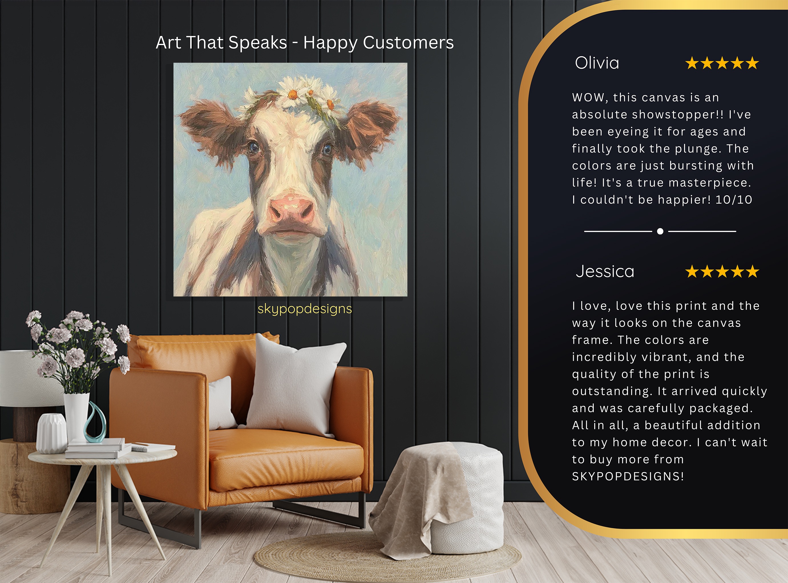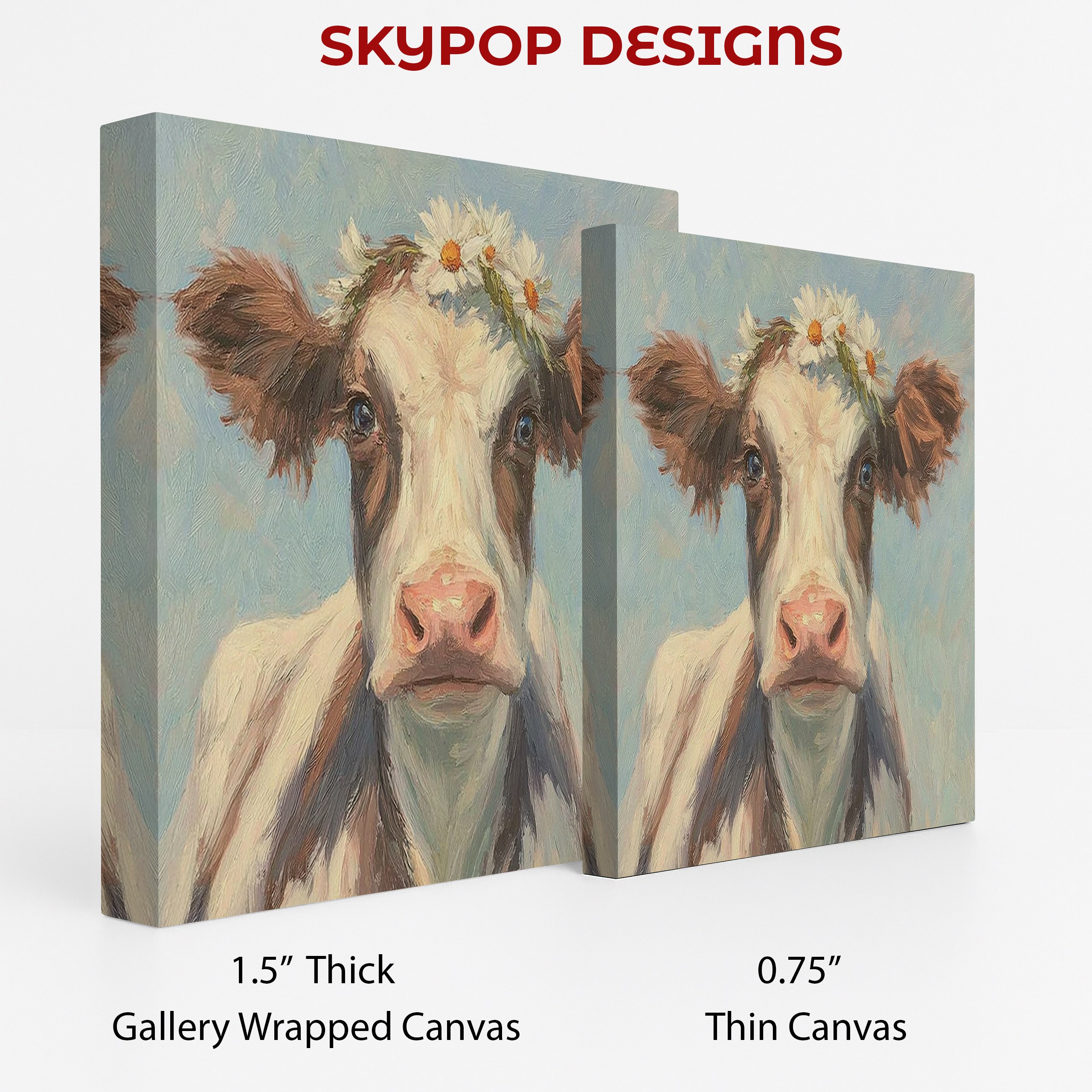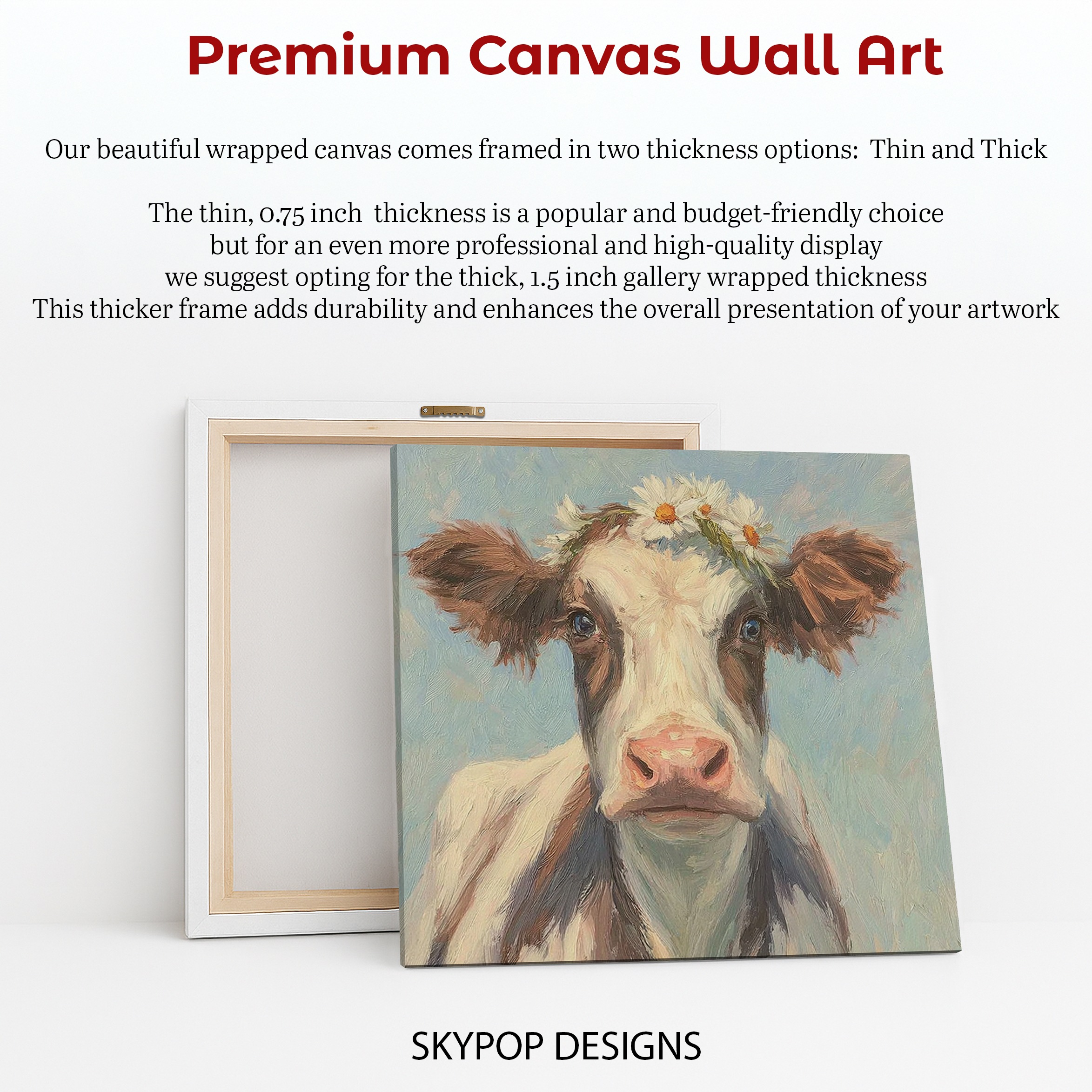 Add a touch of whimsy to your home with this charming cow canvas wall art. This delightful piece features a close-up of a friendly cow wearing a crown of daisies, perfect for bringing a bit of the countryside into your space. The soft blue background and the cow’s expressive eyes create a captivating focal point that’s sure to spark conversation. Ideal for farmhouse or rustic decor, this poster or canvas print adds character to any room, from a cozy kitchen to a welcoming living room. The textured brushstrokes give depth and personality to the artwork, making it feel like a unique, handcrafted piece. The gentle color palette of whites, browns, and touches of green from the daisies complements a wide range of interior styles. This versatile wall art works beautifully as a standalone piece or as part of a gallery wall celebrating nature and animal themes. It’s a perfect gift for cow lovers or anyone looking to add a touch of pastoral charm to their home. The high-quality printing ensures every detail is captured, from the cow’s fuzzy ears to the delicate petals of the daisies. Whether you’re decorating a country-style dining room or adding a playful element to a modern bedroom, this cow art brings warmth and character to any space. Transform your walls with this endearing cow canvas art that combines rustic charm with contemporary flair.