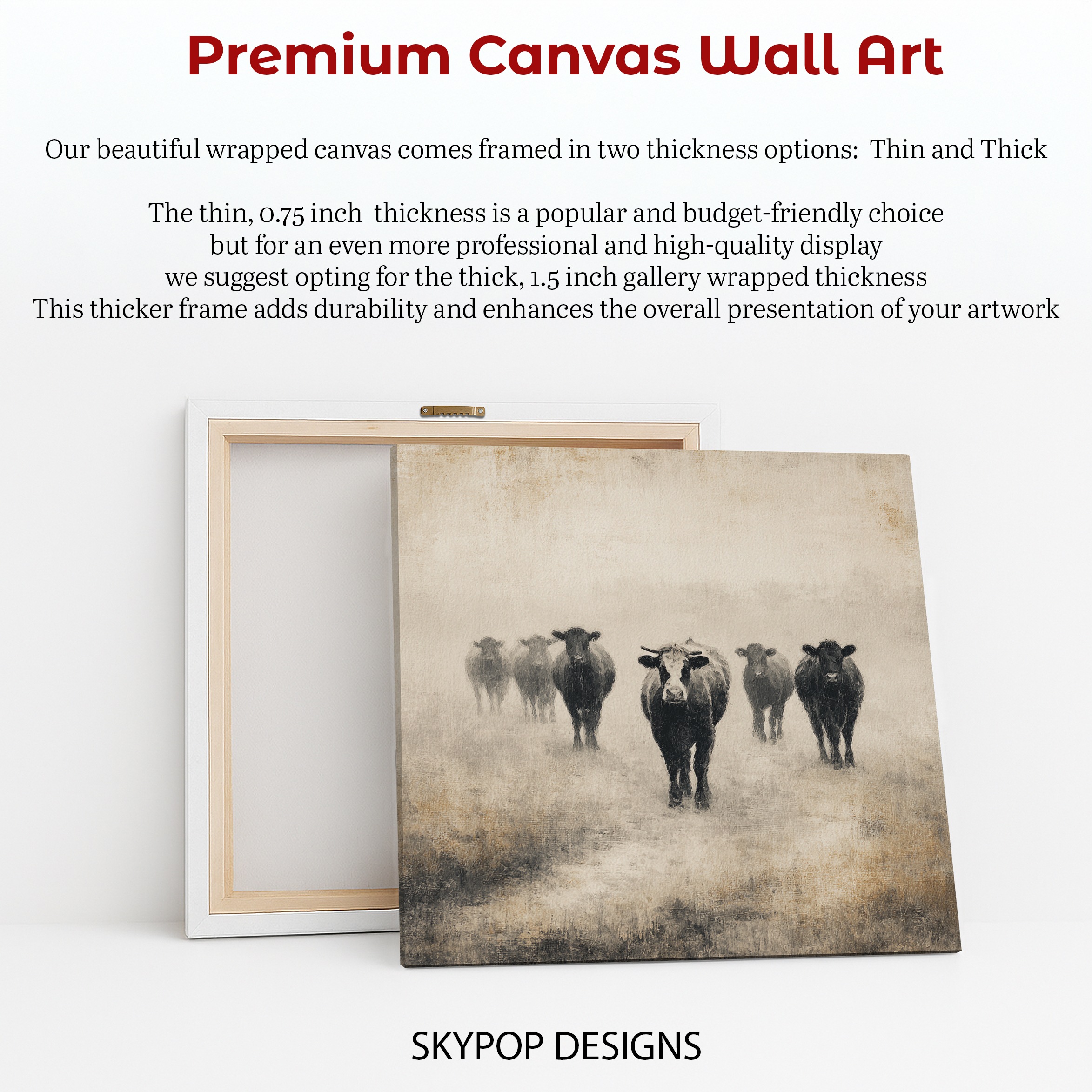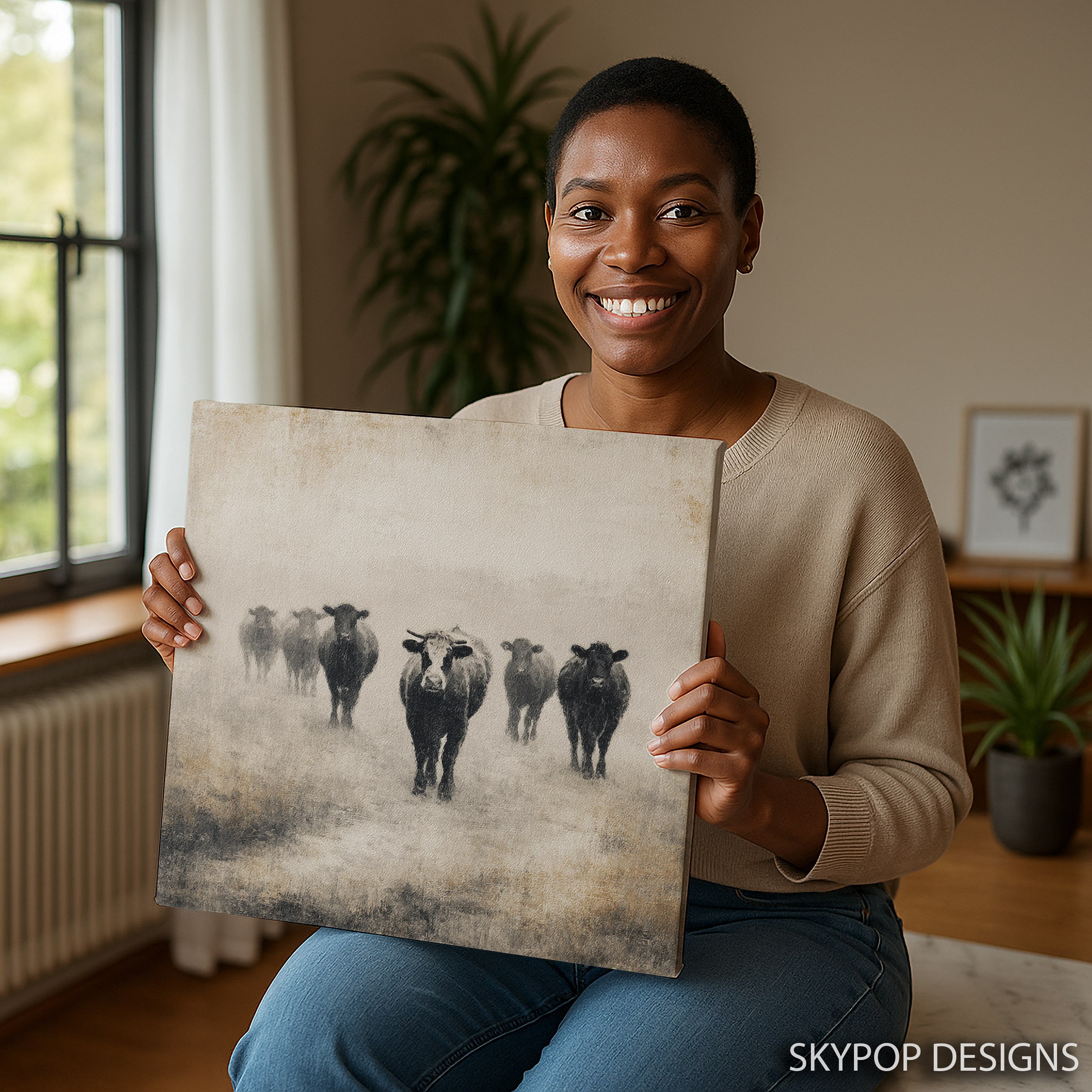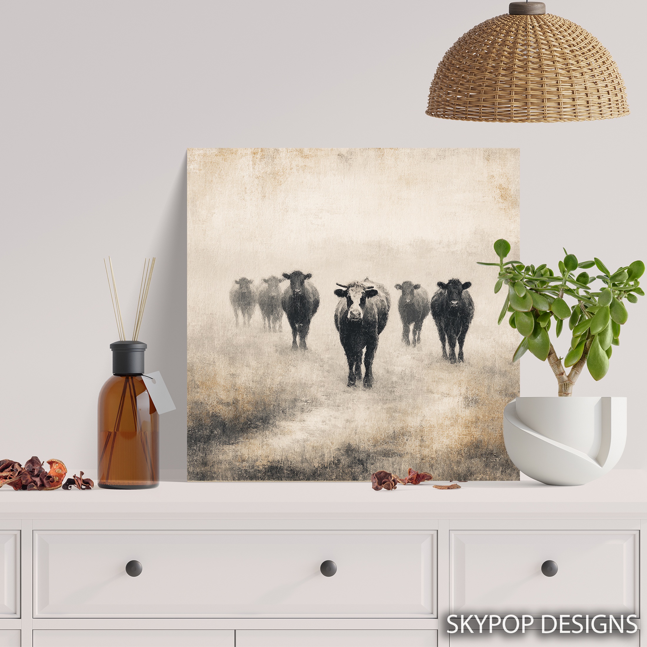 Bring the serene beauty of the countryside into your home with this striking cow herd canvas wall art. This captivating piece showcases a group of cows emerging from a misty field, perfectly capturing the essence of rural life. The monochromatic palette and soft focus technique create a dreamy, nostalgic atmosphere that instantly transforms any space. Ideal for farmhouse-style decor, this poster or canvas print adds a touch of rustic charm to living rooms, dining areas, or home offices. The textured background and subtle shading give depth to the image, making it a focal point that draws the eye and sparks conversation. Perfect for animal lovers and country decor enthusiasts alike, this versatile artwork complements both modern and traditional interiors. The large central cow gazes directly at the viewer, creating an engaging connection that brings warmth to any room. Whether you’re looking to enhance a country kitchen, add character to a bedroom, or create a calming atmosphere in your office, this cow wall art delivers timeless appeal. The high-quality printing ensures every detail is captured, from the cows’ expressive faces to the misty landscape. Gift this piece to a friend who loves farm animals or use it to elevate your own space with a touch of pastoral elegance. Transform your home decor today with this enchanting cow herd wall art that celebrates the beauty of rural life.