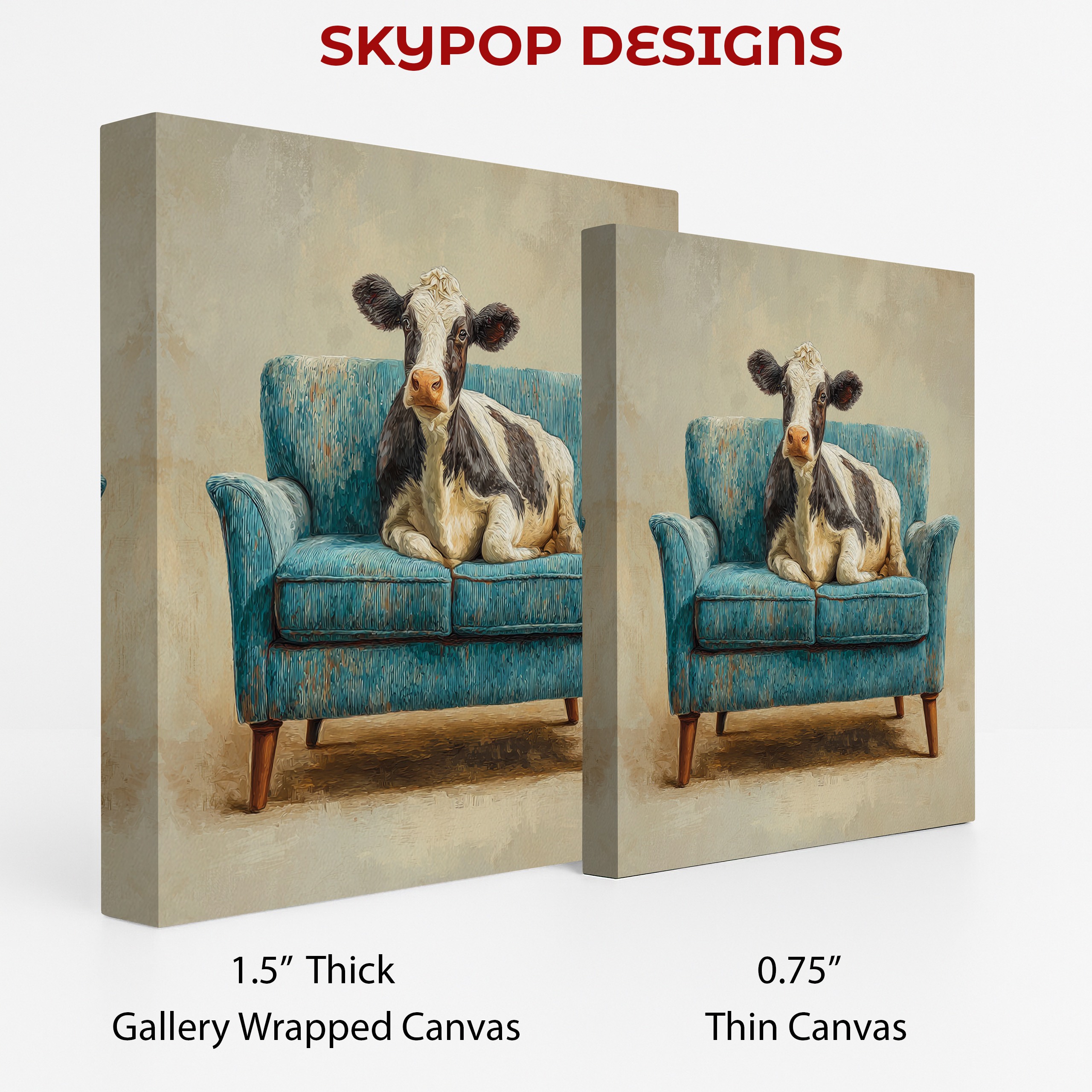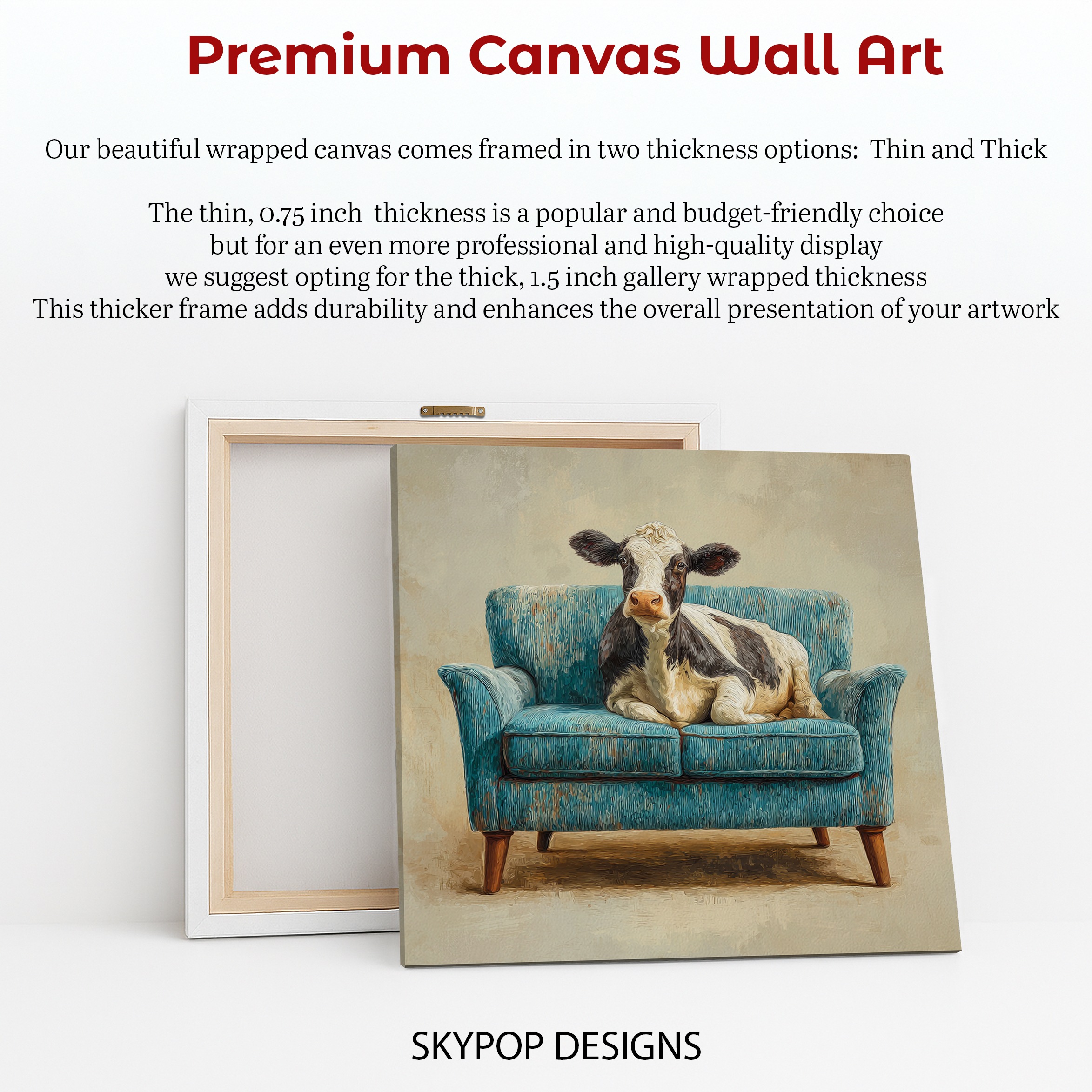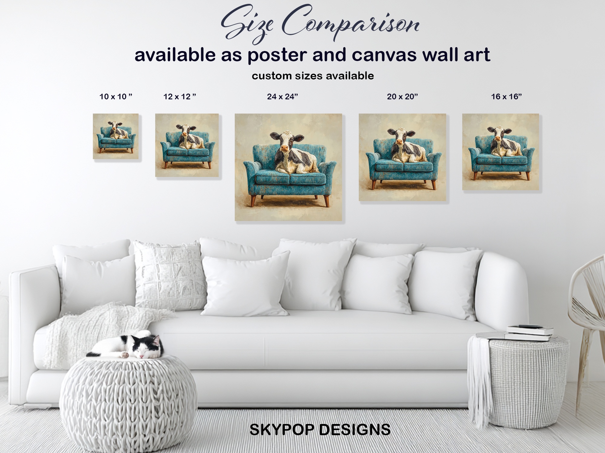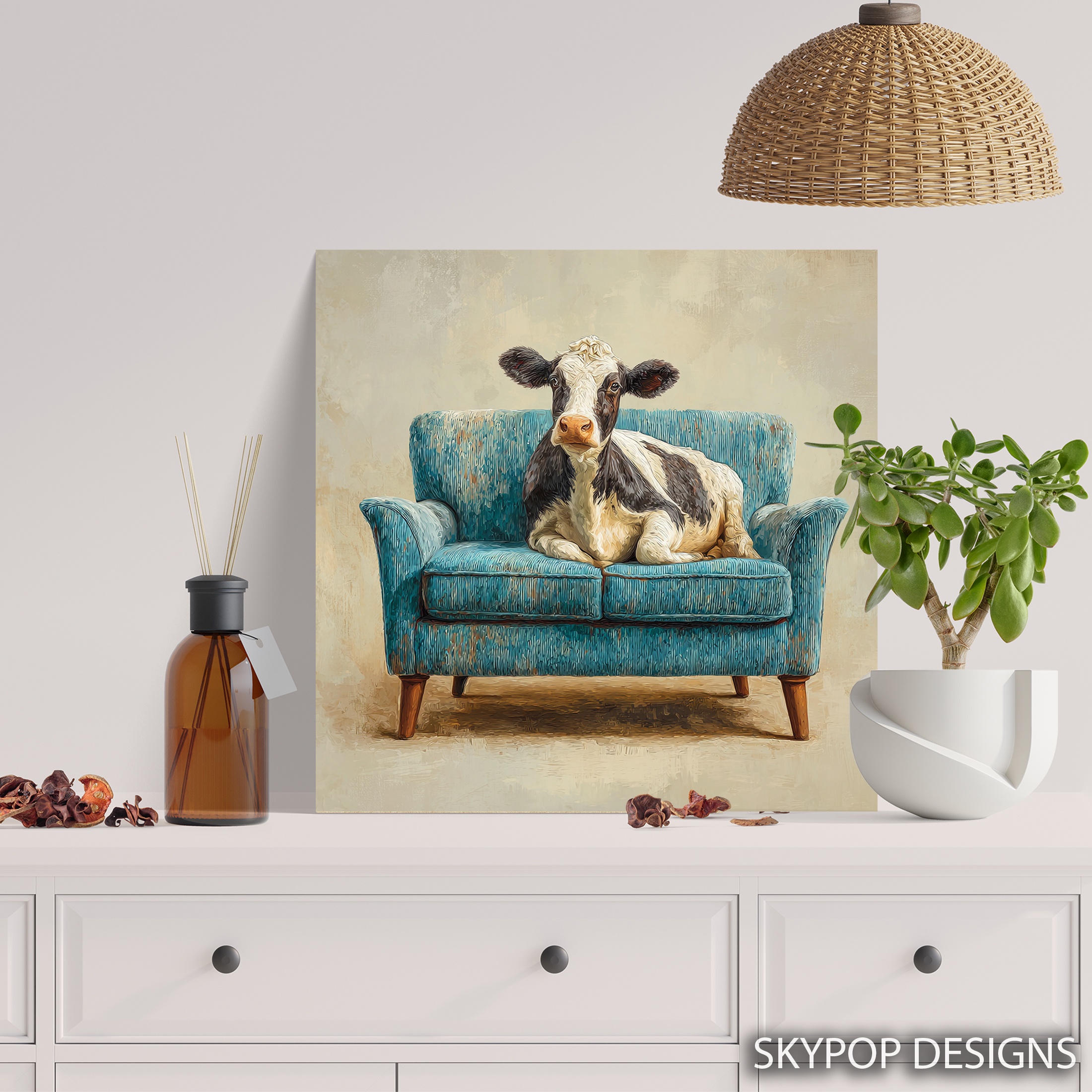 Bring a touch of whimsy to your home with this unique cow canvas wall art. This striking piece features a charming Holstein cow comfortably lounging on a plush teal couch, creating an unexpected and delightful scene. Perfect for adding a fun, contemporary twist to farmhouse decor or injecting personality into modern spaces. The vivid blue of the sofa contrasts beautifully with the cow’s classic black and white coloring, making this poster a true conversation starter. Ideal for animal lovers, this canvas wall art works wonderfully in living rooms, bedrooms, or even quirky office spaces. The detailed brushstrokes give the piece a painted quality, adding depth and texture to your walls. This versatile artwork seamlessly blends rustic charm with contemporary style, making it a great addition to various interior designs. Whether you’re looking to add a pop of color or a touch of humor to your space, this cow art delivers. The high-quality printing ensures every detail is captured, from the cow’s expressive eyes to the textured fabric of the couch. A perfect gift for housewarming parties or anyone who appreciates unconventional animal art. Transform your room with this eye-catching piece that celebrates the unexpected and brings a smile to your face every day.