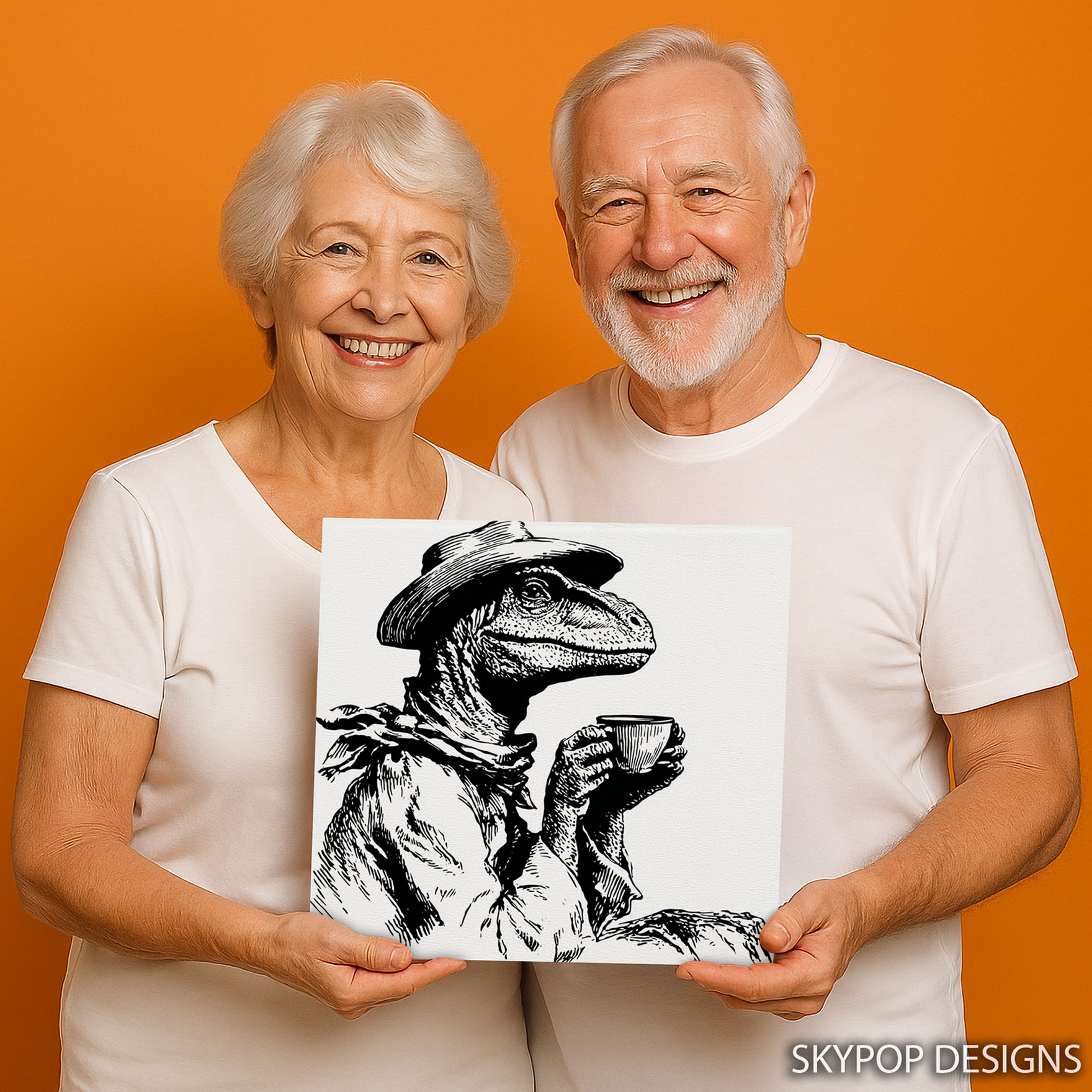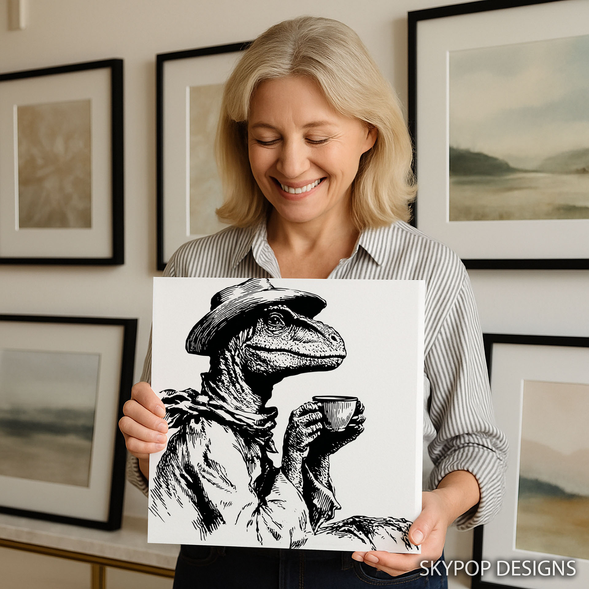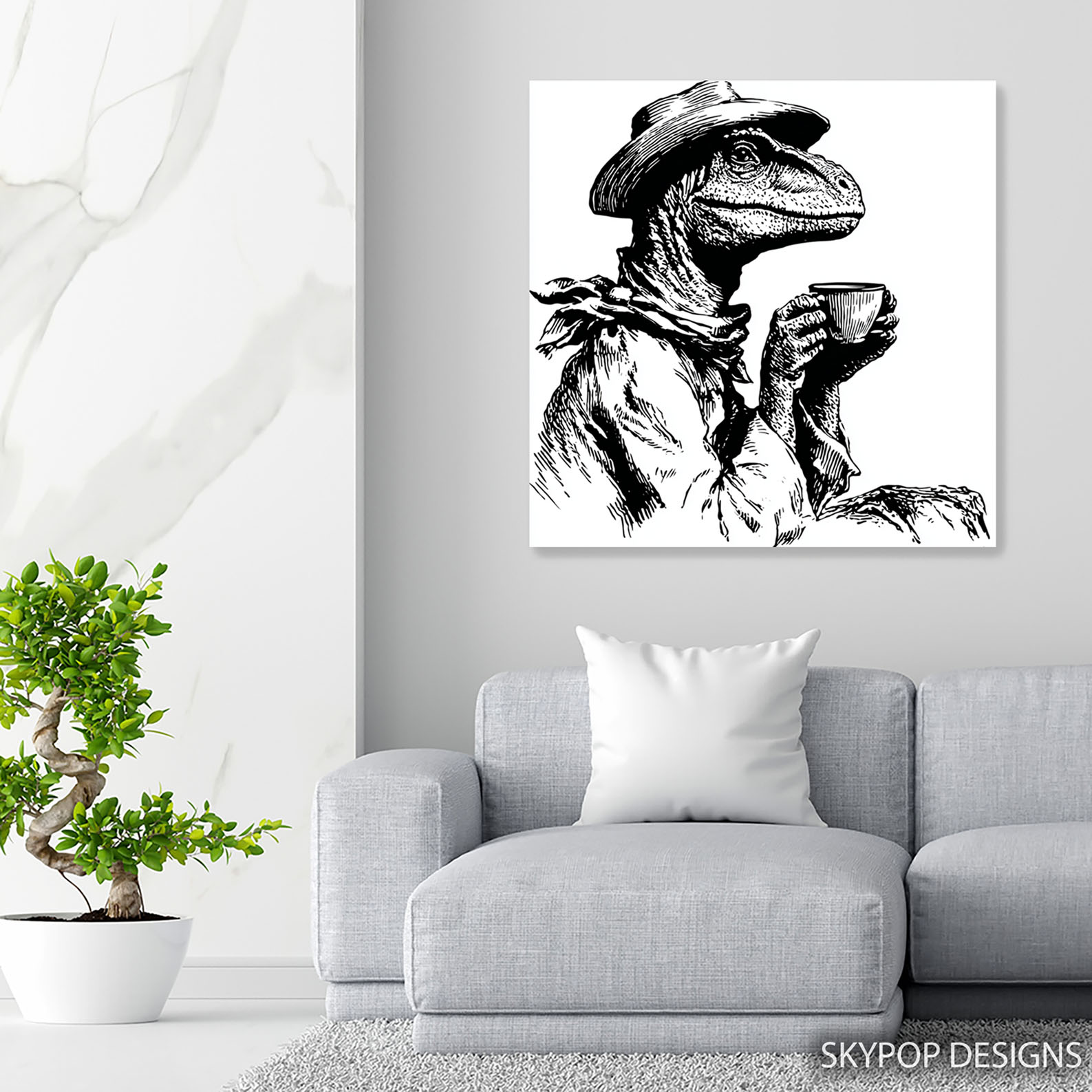 Transform your space with this striking Cowboy Dinosaur canvas wall art, featuring a unique and humorous take on prehistoric life enjoying a morning coffee.