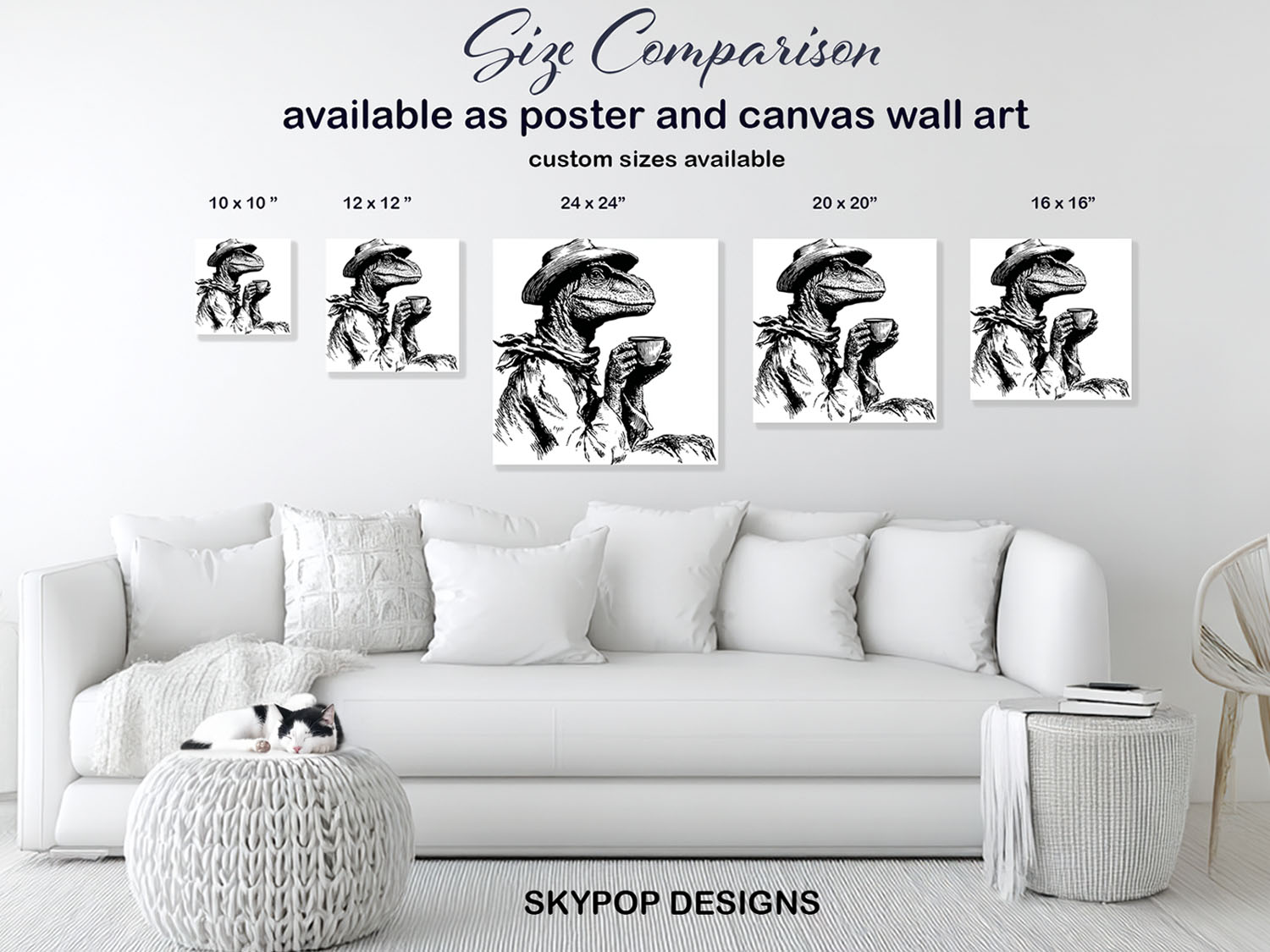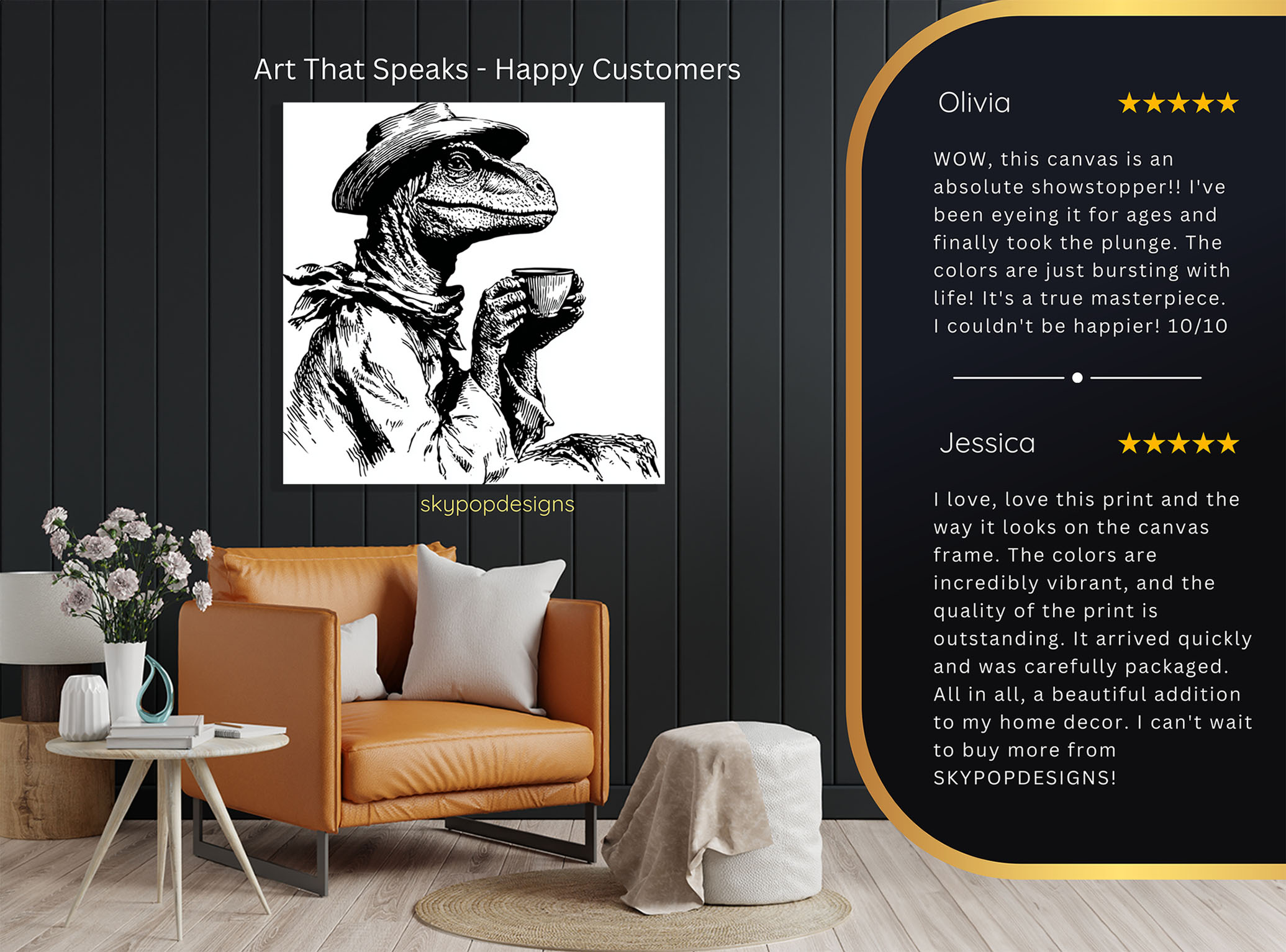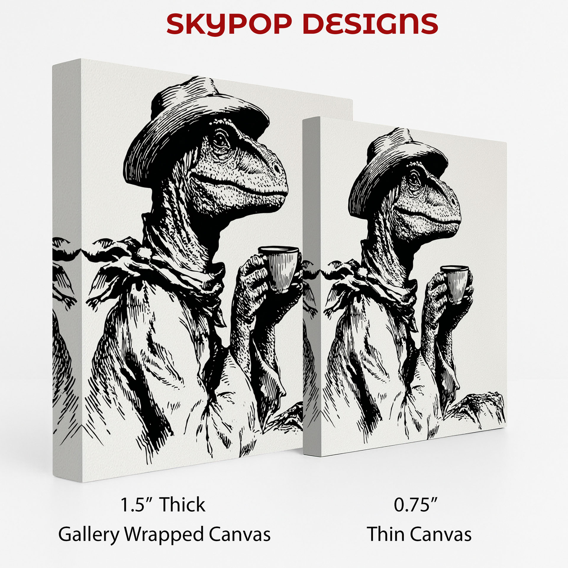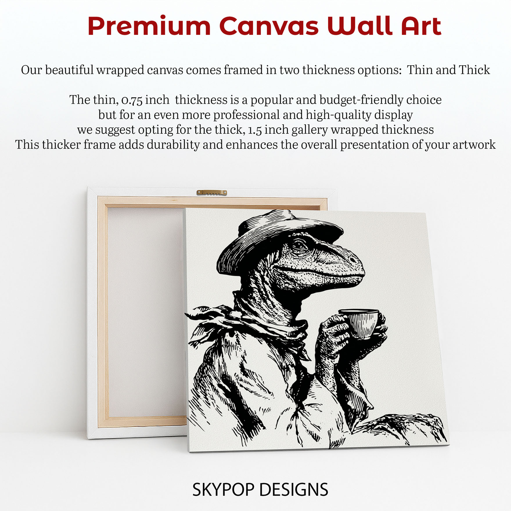 Transform your space with this striking Cowboy Dinosaur canvas wall art, featuring a unique and humorous take on prehistoric life enjoying a morning coffee.