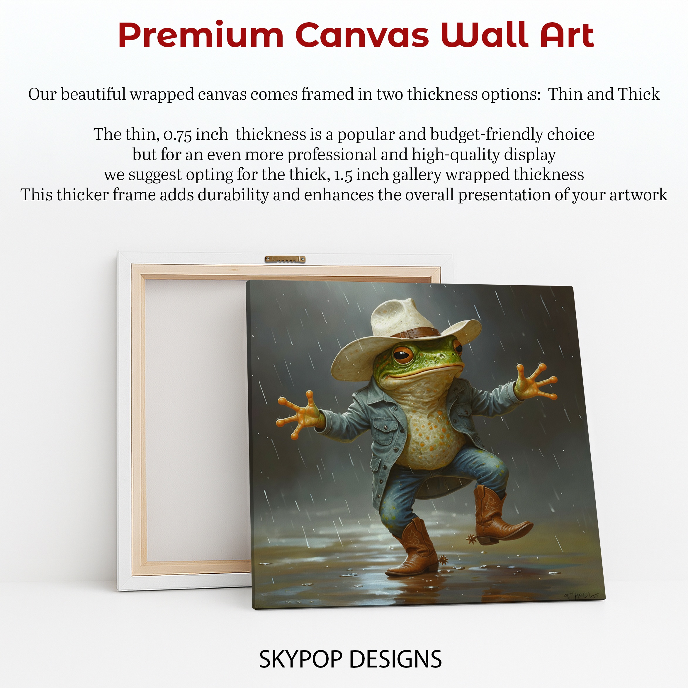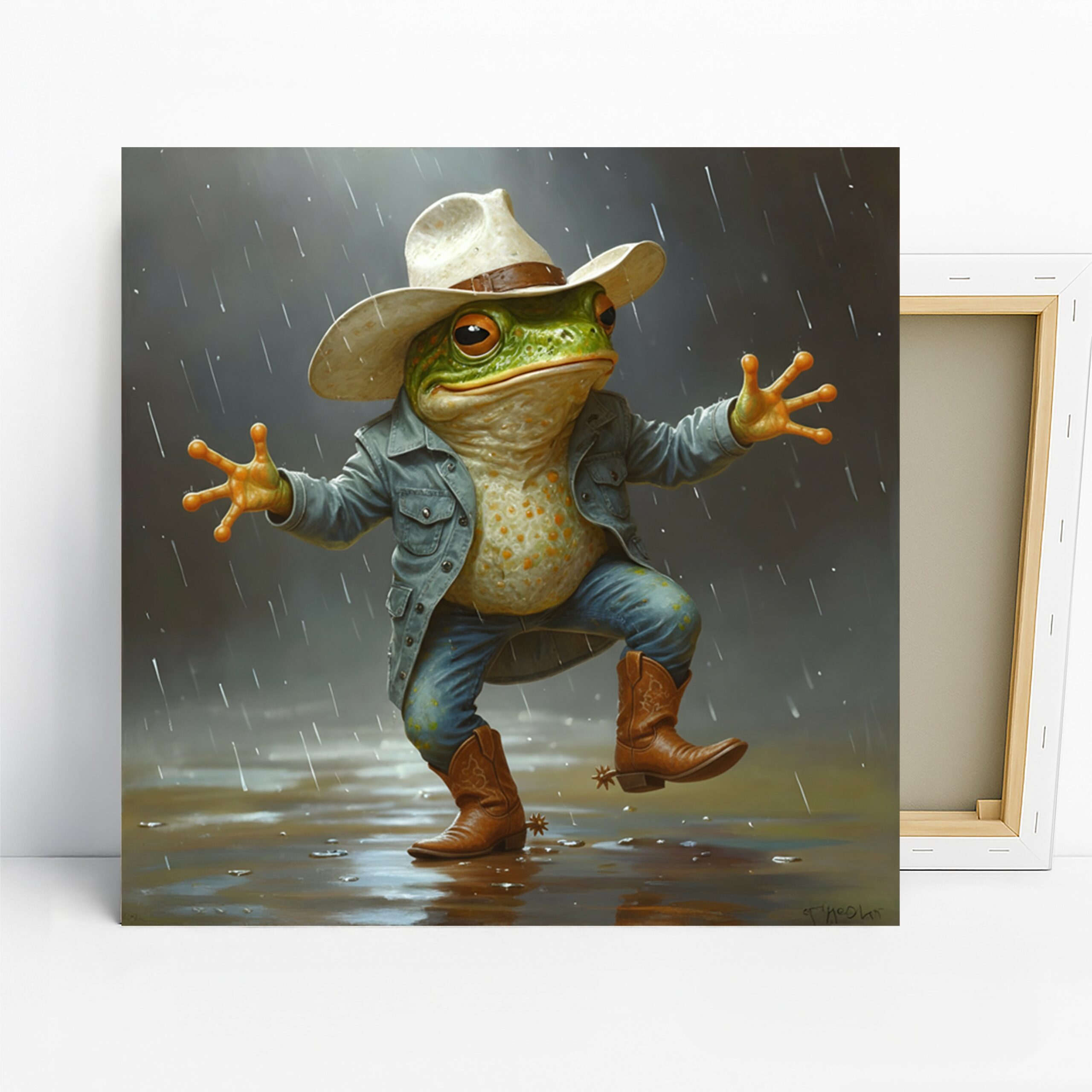 Embrace the fun with this unique cowboy frog canvas wall art. This captivating poster features a charming frog dressed as a cowboy, complete with a hat, denim jacket, and boots, dancing in the rain. The vibrant colors and whimsical style add a playful touch to any space, making it perfect for your living room, game room, or entryway. This animal art is ideal for those who love a touch of country or rustic decor, bringing a smile to your face every day. The striking image of the frog evokes a sense of joy and freedom, transforming your walls into a delightful focal point. This canvas wall art is perfect for a children’s room, adding a splash of fun and imagination. Showcase your personality with this eye-catching poster that’s sure to be a conversation starter. Its detailed design and high-quality printing ensure this artwork will be a cherished addition to your home decor. This frog wall art is a fantastic gift for birthdays, housewarmings, or any occasion. Elevate your home decor with this unique blend of retro charm and whimsical animal art. Transform your space and celebrate the joy of simple pleasures with this delightful frog canvas print. Add this fun and quirky artwork to your collection and bring a little whimsy into your life.