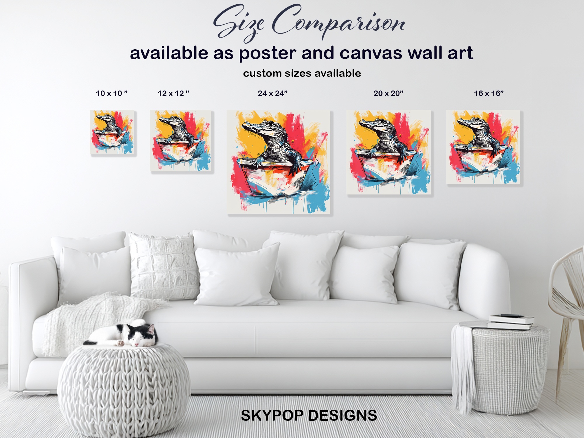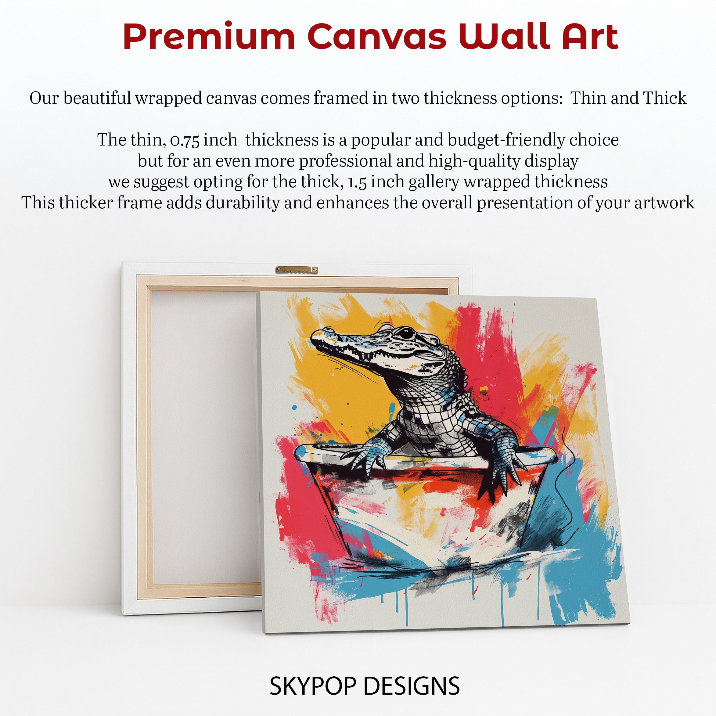 Keywords: Pop Art wall art, Graffiti art print, Contemporary art canvas, Modern decor, Bohemian style, Eclectic living room, Bedroom wall art, Office artwork, Hallway art, Multicolor art, Yellow and red art, Blue and yellow print, Crocodile art, Animal wall decor, Dapper Gator art, Bathtime art, Whimsical art, Abstract art, Vibrant canvas, Bold statement piece, Colorful home decor, Unique wall art, Quirky art, Animal lover gift, Housewarming gift, Statement artwork, Street art inspired, Playful wall decor, Graphic art print, Modern Bohemian art