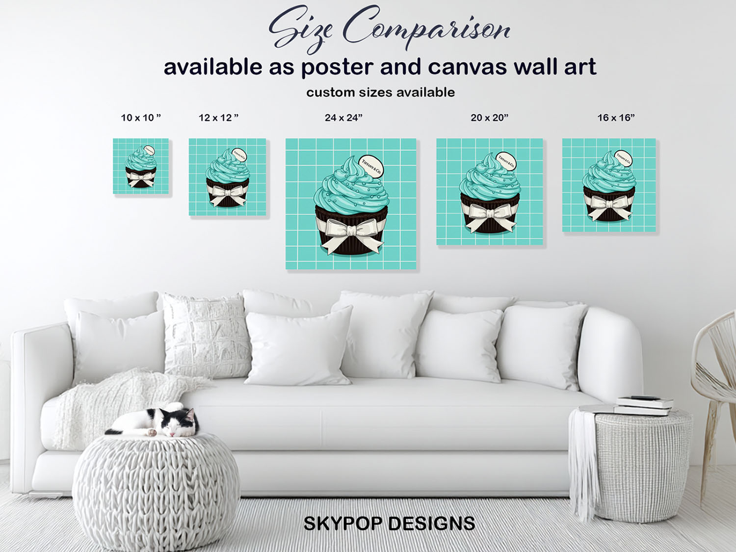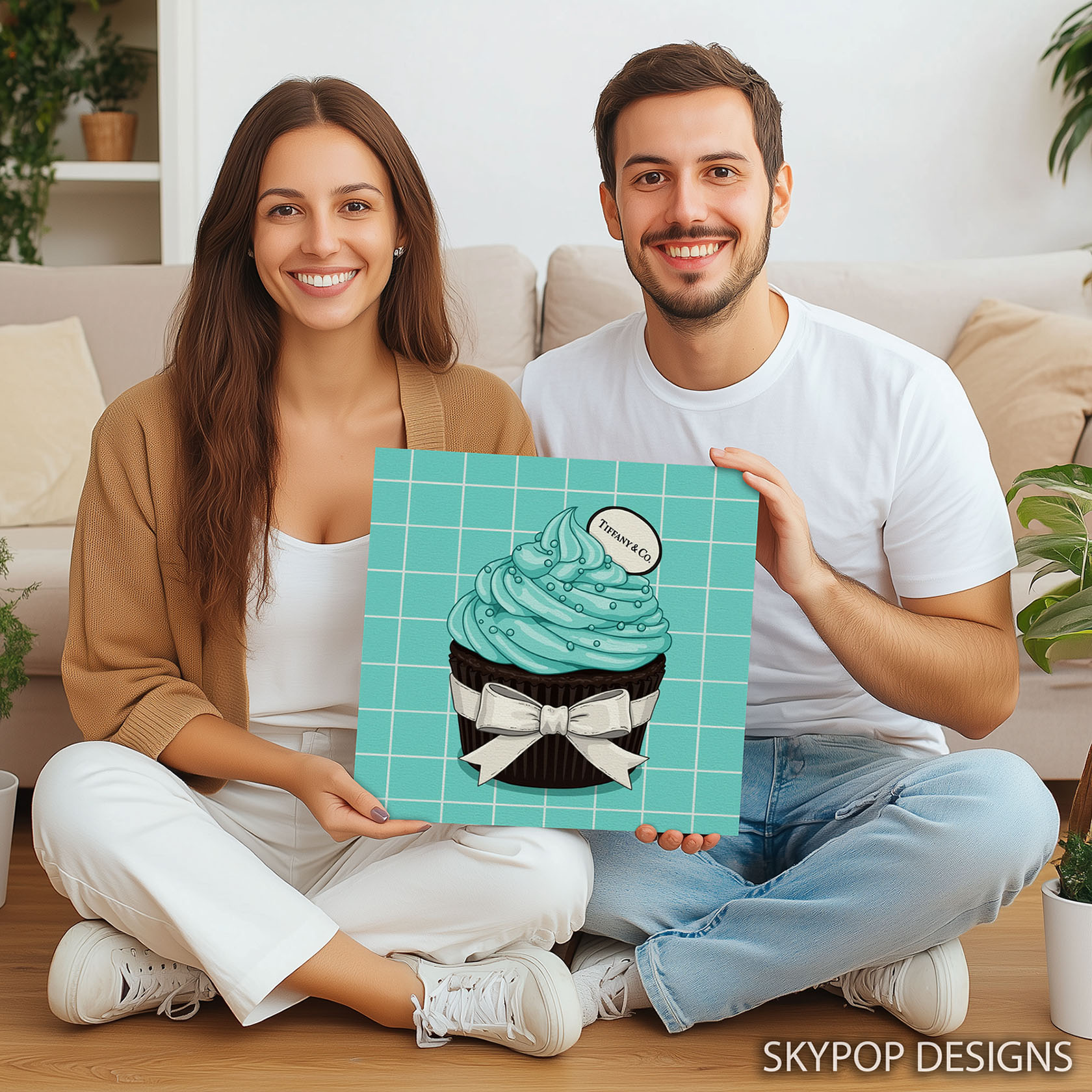 Elevate your space with this delightful Tiffany Cupcake canvas wall art, a perfect pop art representation of luxury and indulgence. This captivating poster or canvas wall art showcases a beautifully decorated cupcake with iconic Tiffany blue frosting and a classic white bow, bringing a touch of glam and whimsy to any room. The vibrant teal and crisp white hues create a striking visual contrast, ideal for modern living room wall decor or adding a playful accent to a contemporary kitchen. This piece is perfect for adding a sweet and sophisticated touch to bedroom walls or serving as cheerful art for a children’s room. The artwork’s clean lines and bold colors make it a fantastic statement piece that celebrates the joy of simple pleasures. High-quality printing ensures the vibrant teal and detailed texture of the frosting and bow pop off the canvas. This versatile wall art is also an ideal gift for those who appreciate luxury, fashion, and sweet treats, perfect for housewarmings, birthdays, or holidays. Whether you’re aiming for modern decor, a touch of glam, or cheerful accents, this canvas wall art offers size versatility to fit your needs. Transform your home into a stylish haven with this unique and desirable Tiffany Cupcake wall art today. Add a touch of elevated sweetness to your collection of canvas art.