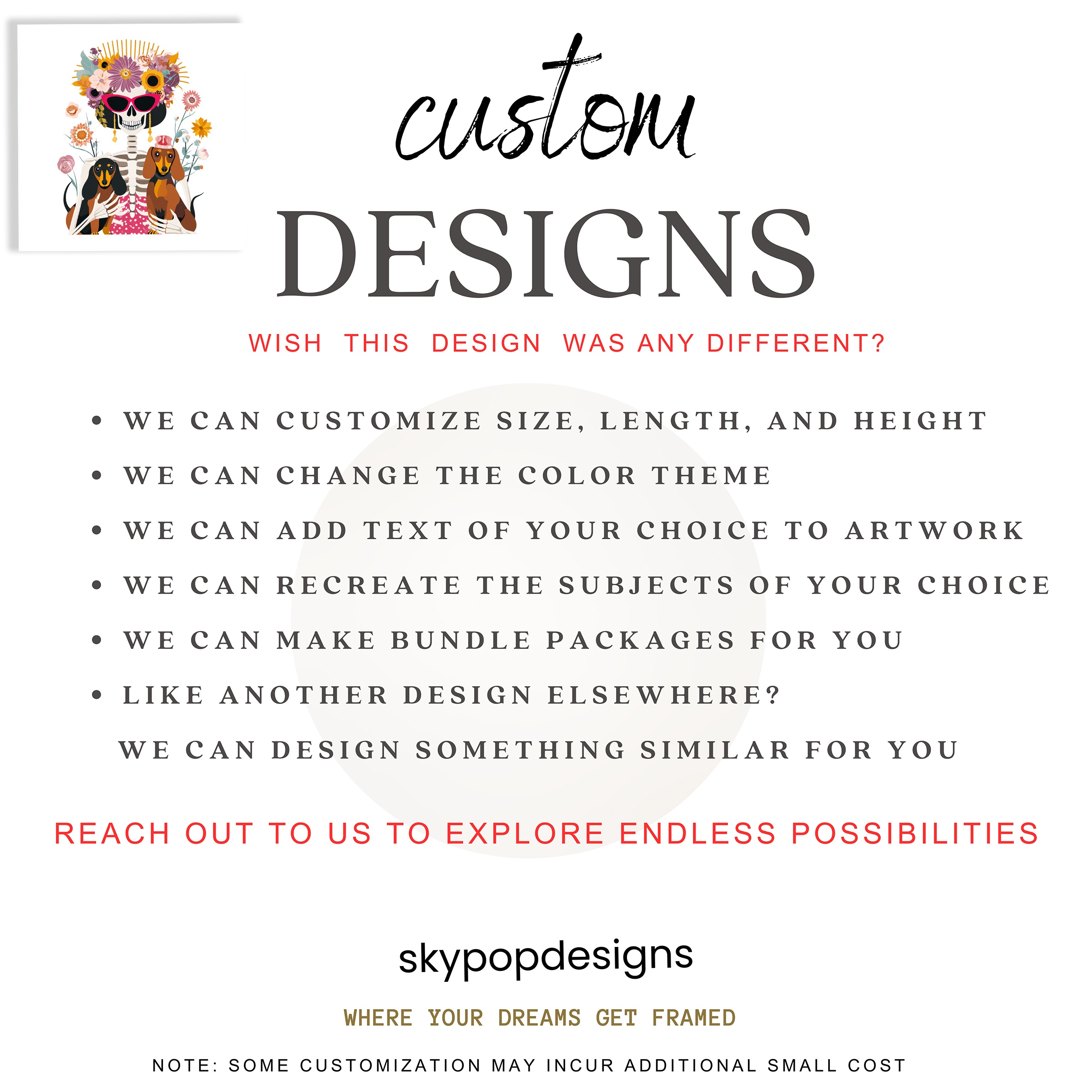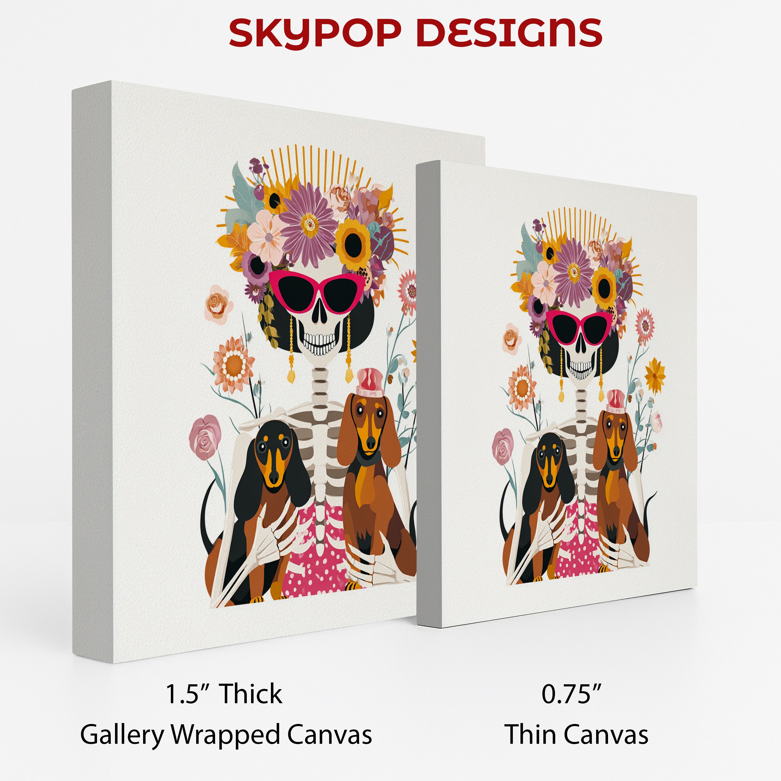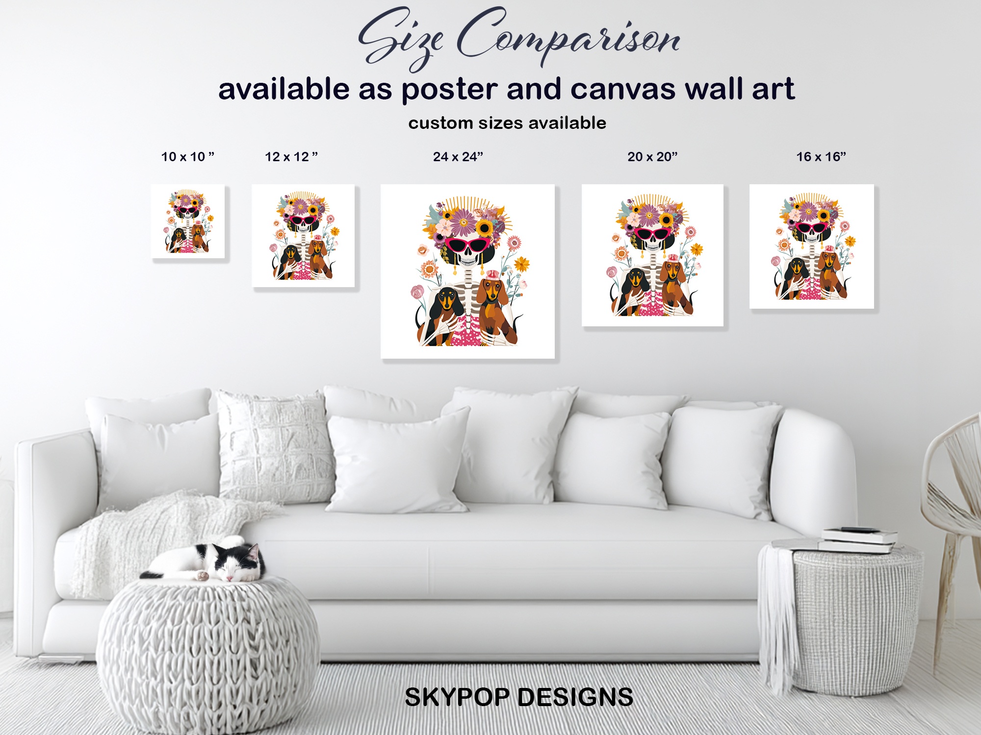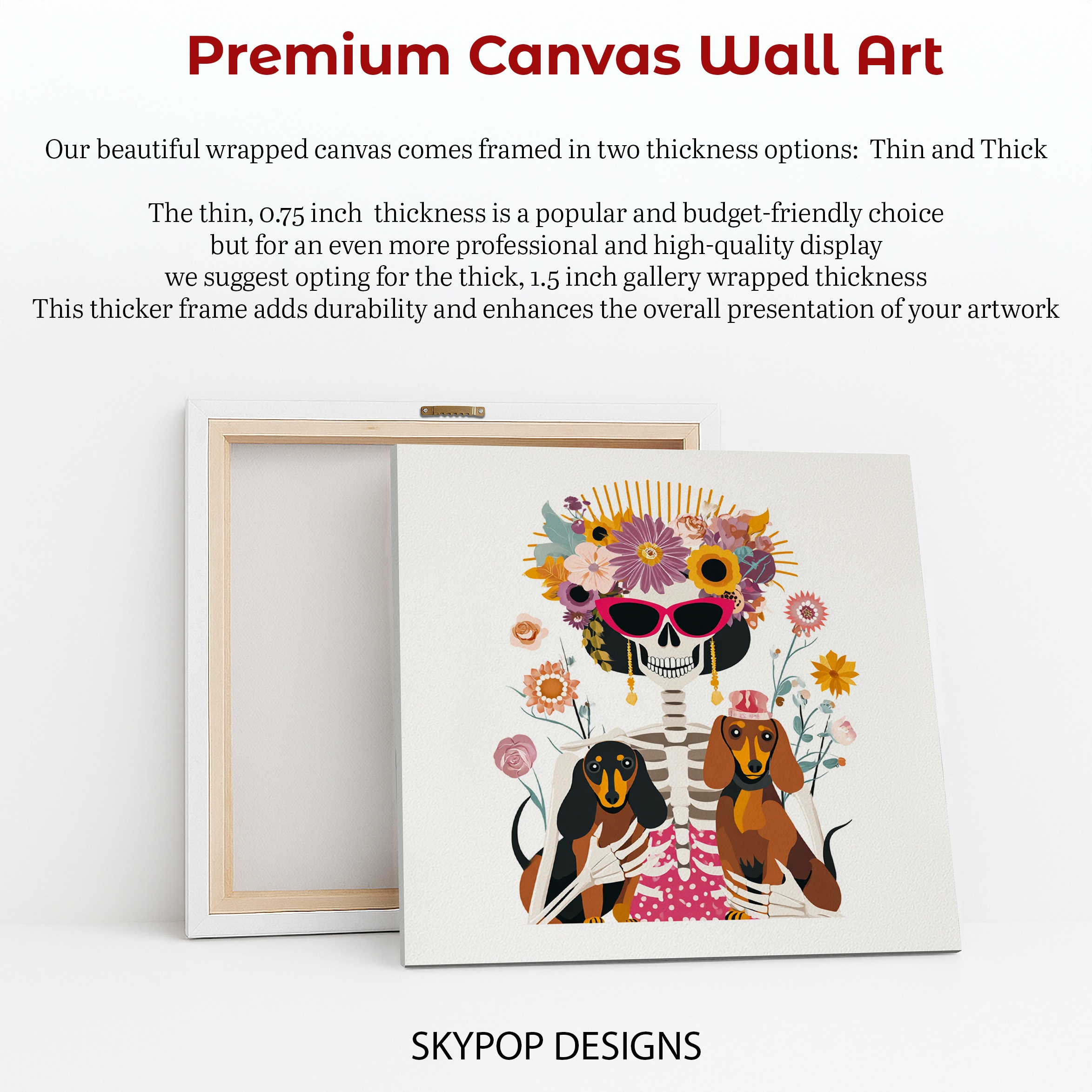 Breathe new life into your space with this vibrant and quirky canvas wall art featuring a playful skeleton adorned with a floral crown and pink sunglasses, accompanied by two adorable dachshunds. This eye-catching poster combines whimsical elements with bold colors, perfect for adding a pop of personality to any room. The striking contrast between the skeletal figure and the lively floral arrangement creates a unique focal point that’s sure to spark conversation. Ideal for contemporary living rooms, eclectic bedrooms, or modern home offices, this canvas art effortlessly blends dark humor with cheerful imagery. The pink sunglasses and polka-dot skirt add a touch of retro flair, making it a standout piece for those who love to mix vintage and modern styles. The dachshunds bring warmth and charm to the composition, appealing to dog lovers and art enthusiasts alike. This versatile artwork adapts beautifully to various decor styles, from bohemian to minimalist, and makes a great gift for Halloween enthusiasts or those who appreciate unconventional wall decor. The high-quality printing captures every intricate detail, from the delicate flower petals to the skeleton’s toothy grin. Whether displayed in a dining room, bedroom, or as a statement piece in your living area, this canvas wall art is sure to elevate your space with its bold colors and playful design. Transform your home today with this unique blend of floral beauty and quirky charm that celebrates life, death, and everything in between.