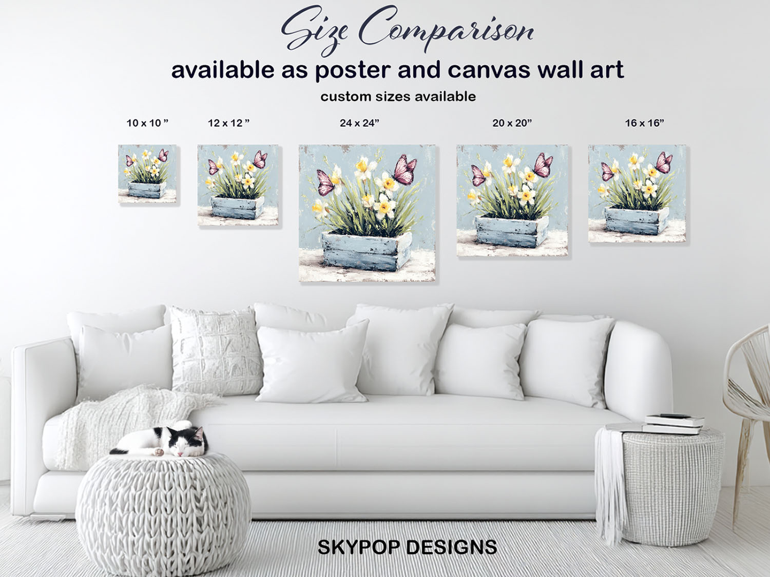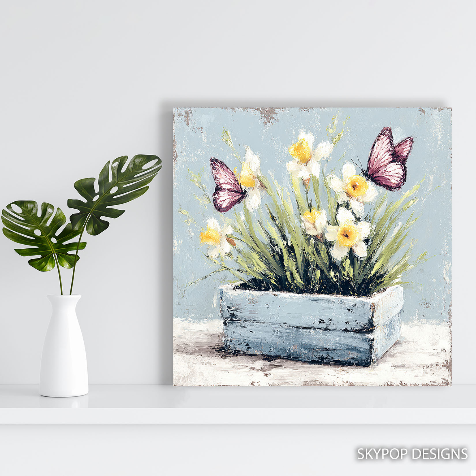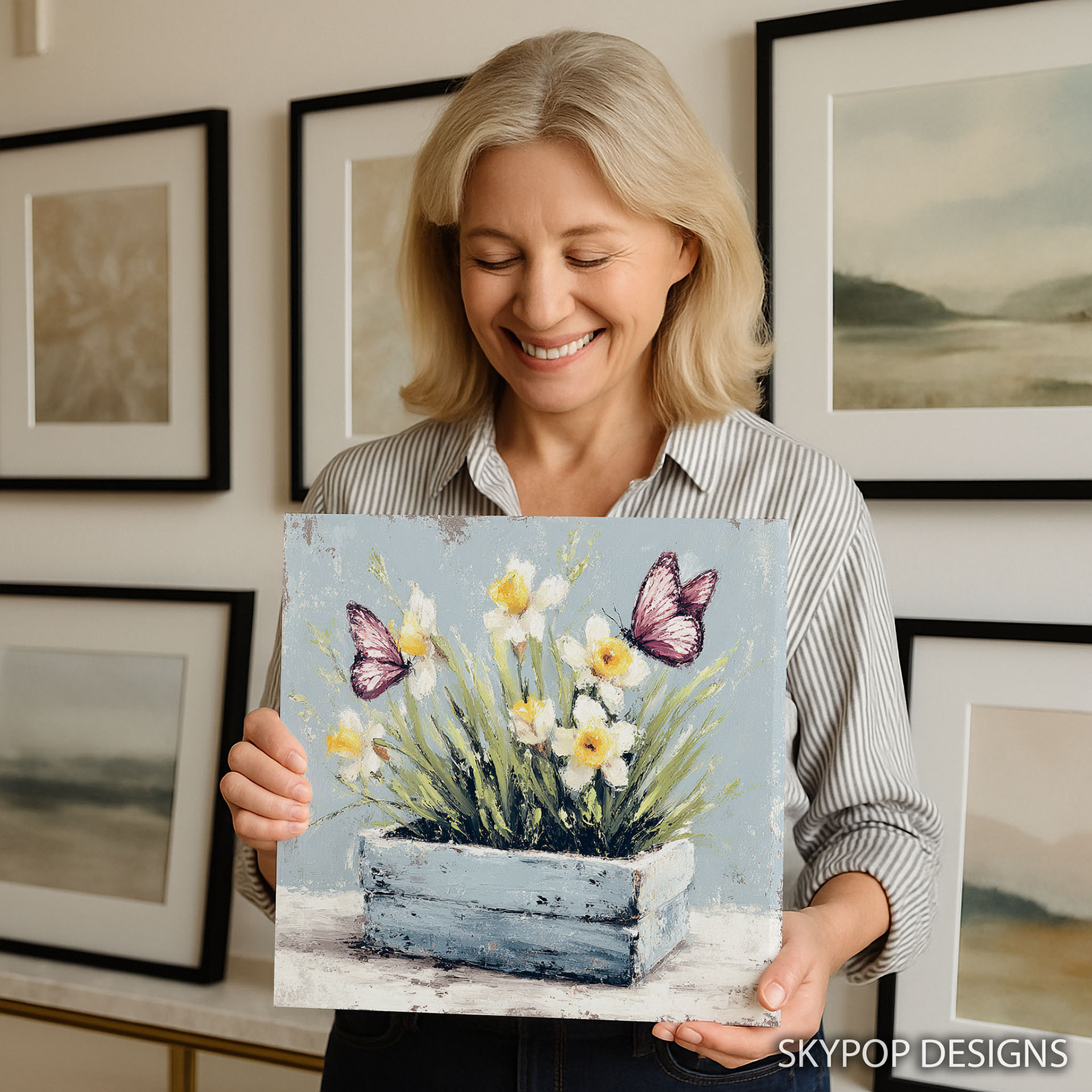 Transform your home with this beautiful daffodil and butterfly canvas wall art that brings the charm of a spring garden indoors. This captivating poster or canvas wall art features vibrant daffodils and delicate butterflies in a painterly style, perfect for adding a touch of nature to your living room wall decor. The soft blue background and rustic wooden planter evoke a farmhouse or coastal feel, creating a serene atmosphere in any space. Ideal for shabby chic interiors, this floral artwork enhances bedrooms or dining rooms with its cheerful presence. The striking combination of yellow daffodils and pink butterflies symbolizes new beginnings and joyful moments, uplifting your mood. High-quality printing captures the textured brushstrokes and intricate details of the flowers and insects, making this canvas wall art a stunning focal point. This versatile butterfly and flower art piece is also a perfect gift for housewarmings, birthdays, or Mother’s Day, bringing natural beauty into any home. Elevate your sunroom or entryway with this delightful nature art that celebrates the simple pleasures of the outdoors. Whether you’re looking for charming wall decor or a thoughtful present, this daffodil canvas wall art offers enduring beauty and artistic appeal. Make your space bloom with this exquisite garden-inspired artwork today.