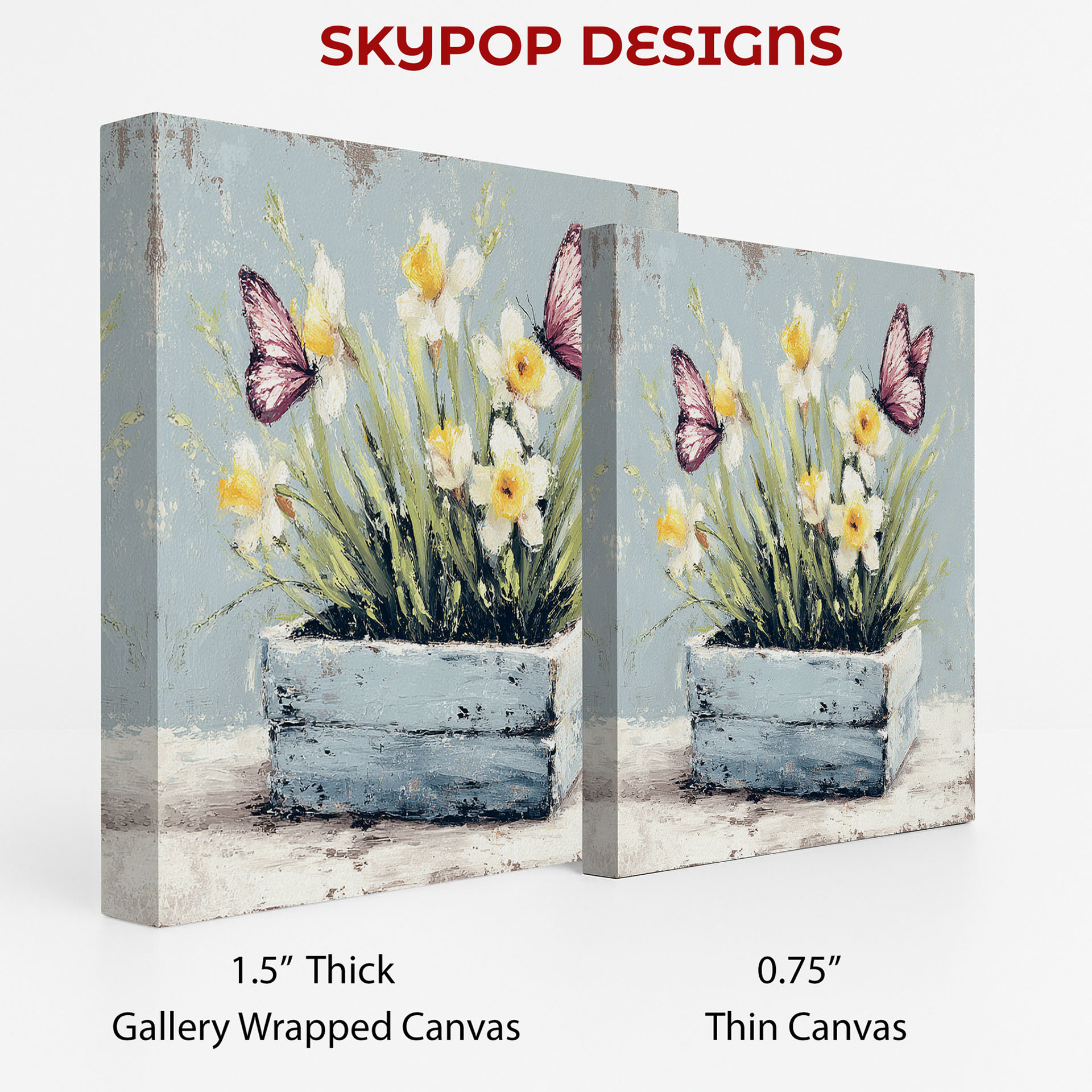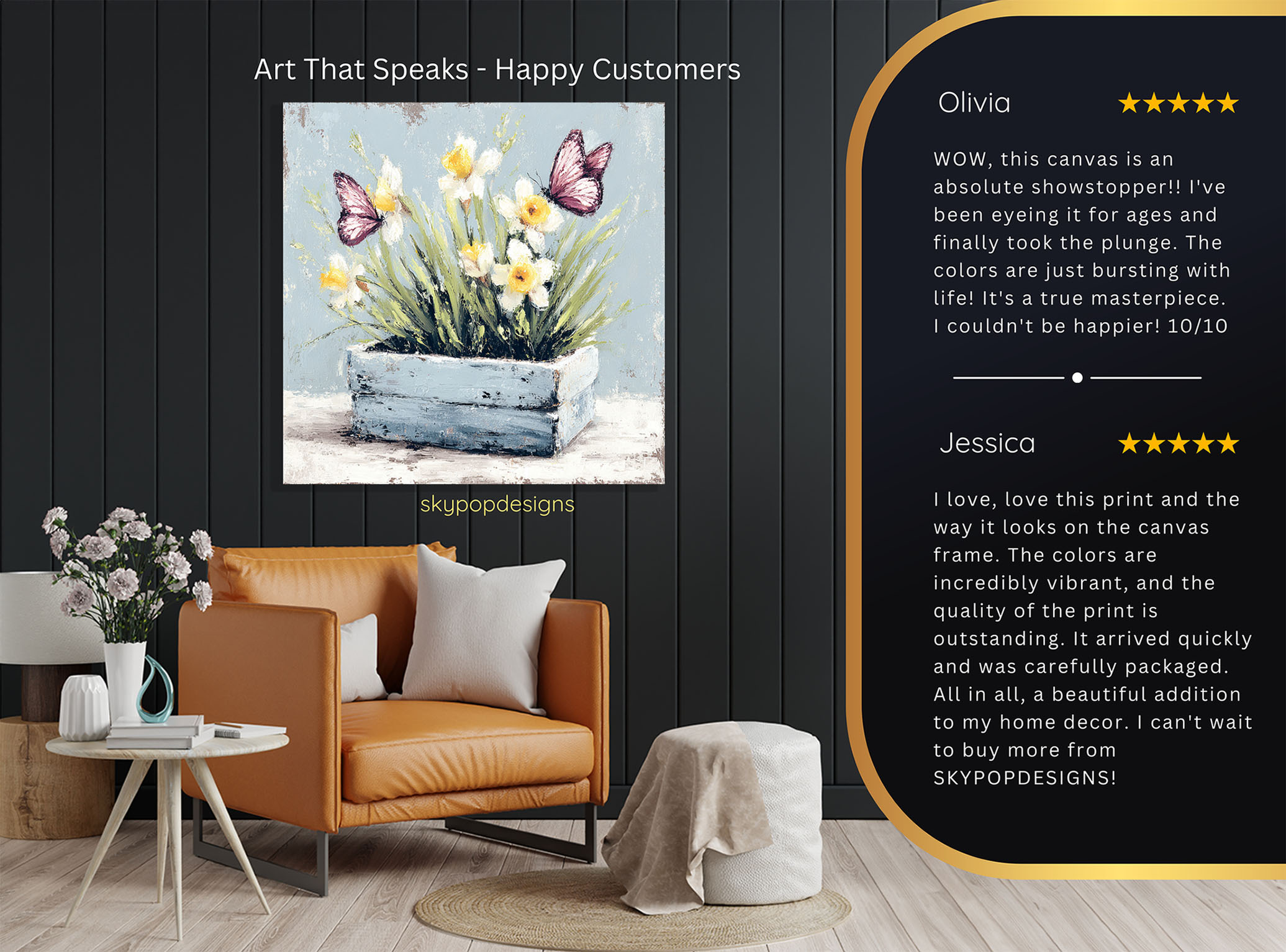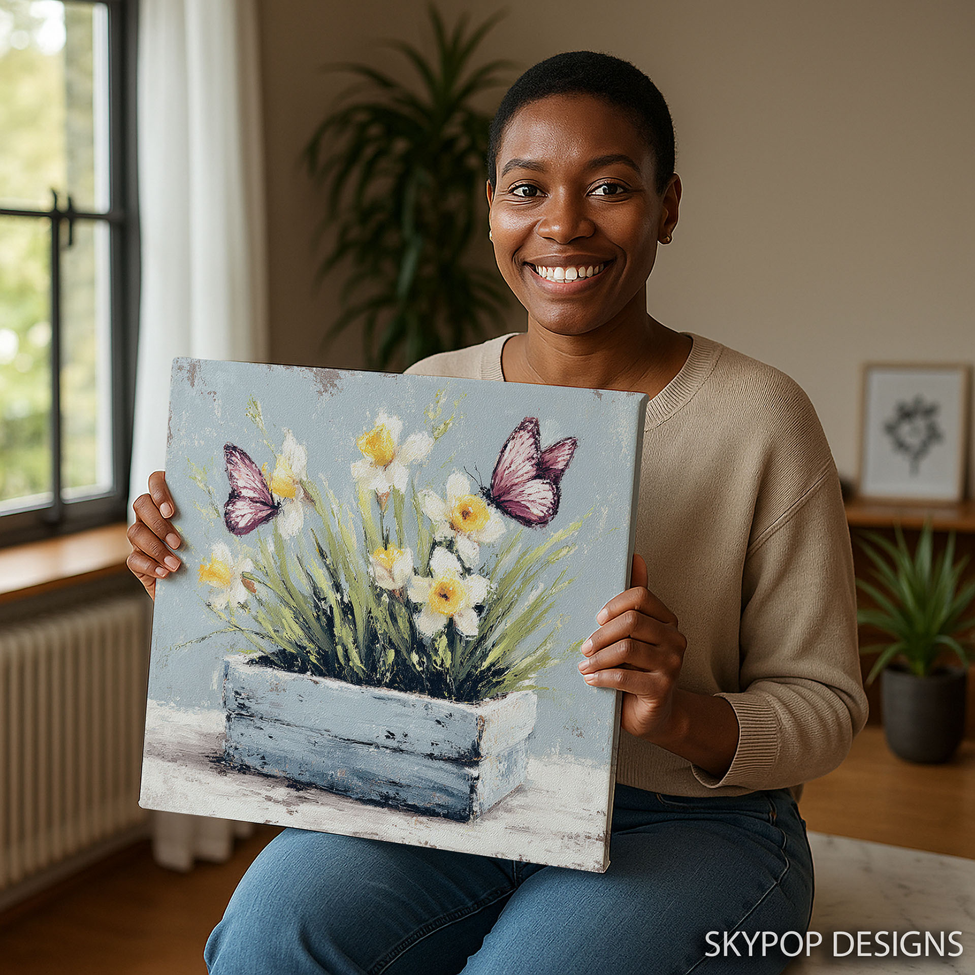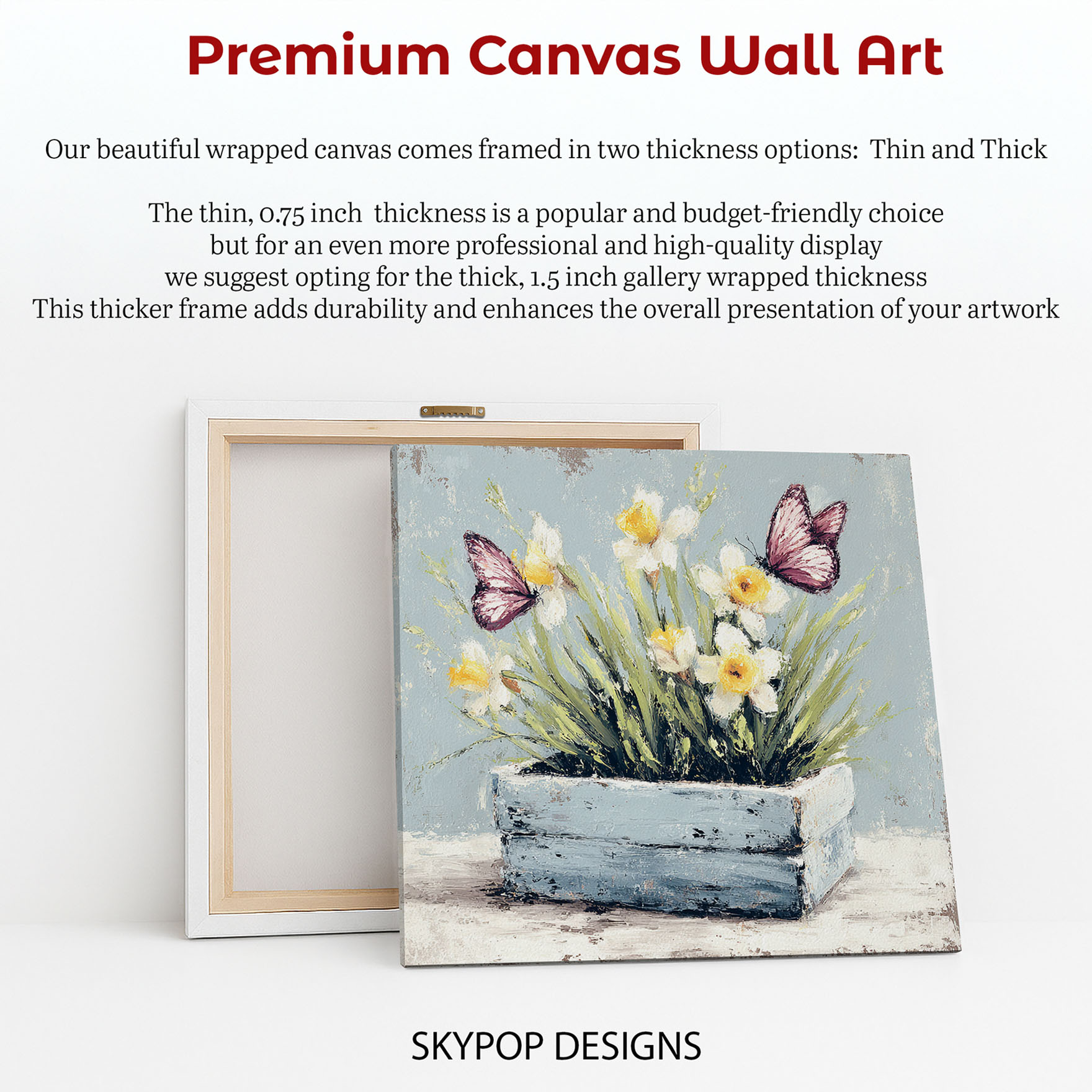 Transform your home with this beautiful daffodil and butterfly canvas wall art that brings the charm of a spring garden indoors. This captivating poster or canvas wall art features vibrant daffodils and delicate butterflies in a painterly style, perfect for adding a touch of nature to your living room wall decor. The soft blue background and rustic wooden planter evoke a farmhouse or coastal feel, creating a serene atmosphere in any space. Ideal for shabby chic interiors, this floral artwork enhances bedrooms or dining rooms with its cheerful presence. The striking combination of yellow daffodils and pink butterflies symbolizes new beginnings and joyful moments, uplifting your mood. High-quality printing captures the textured brushstrokes and intricate details of the flowers and insects, making this canvas wall art a stunning focal point. This versatile butterfly and flower art piece is also a perfect gift for housewarmings, birthdays, or Mother’s Day, bringing natural beauty into any home. Elevate your sunroom or entryway with this delightful nature art that celebrates the simple pleasures of the outdoors. Whether you’re looking for charming wall decor or a thoughtful present, this daffodil canvas wall art offers enduring beauty and artistic appeal. Make your space bloom with this exquisite garden-inspired artwork today.