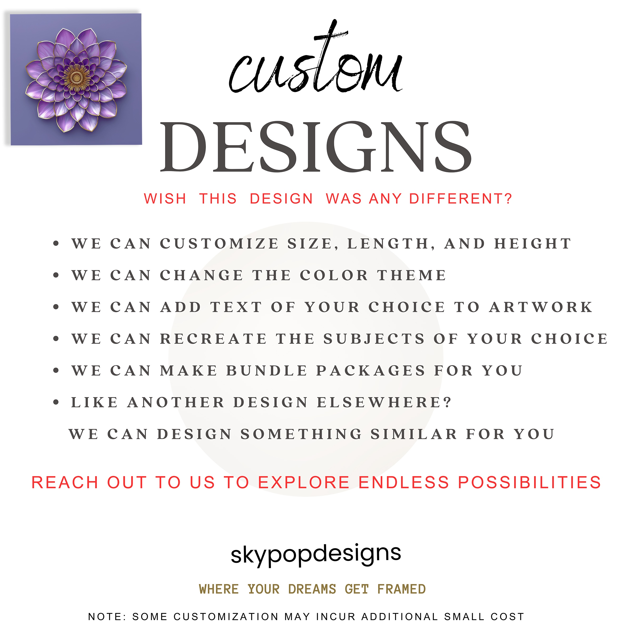 Looking for a custom design, or do you love a particular design but need it in a different size or orientation? Perhaps you’ve found a design elsewhere and wish for us to create something similar for you? Drop us a message! We’re dedicated to meeting your needs and will work closely with you to ensure your vision comes to life.
