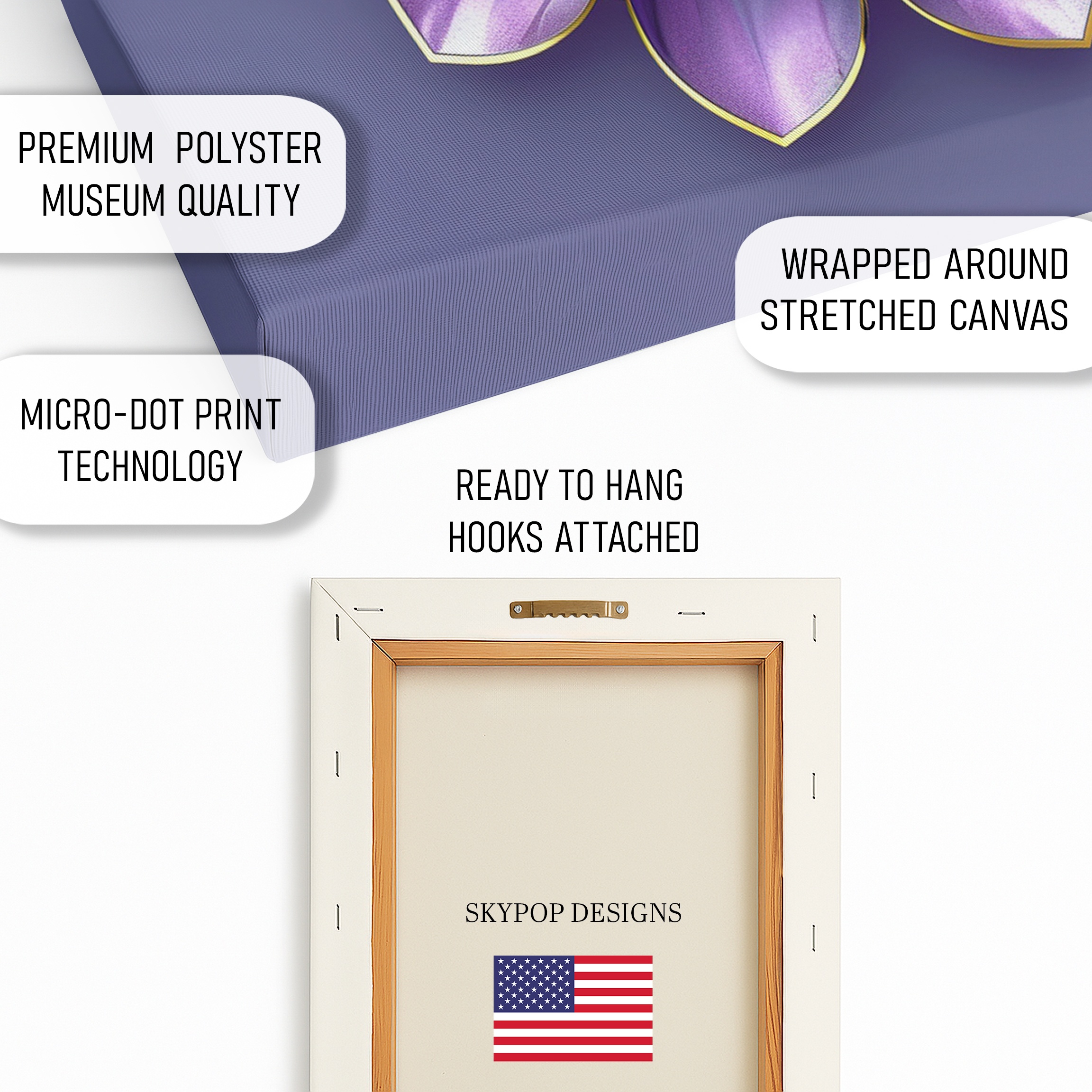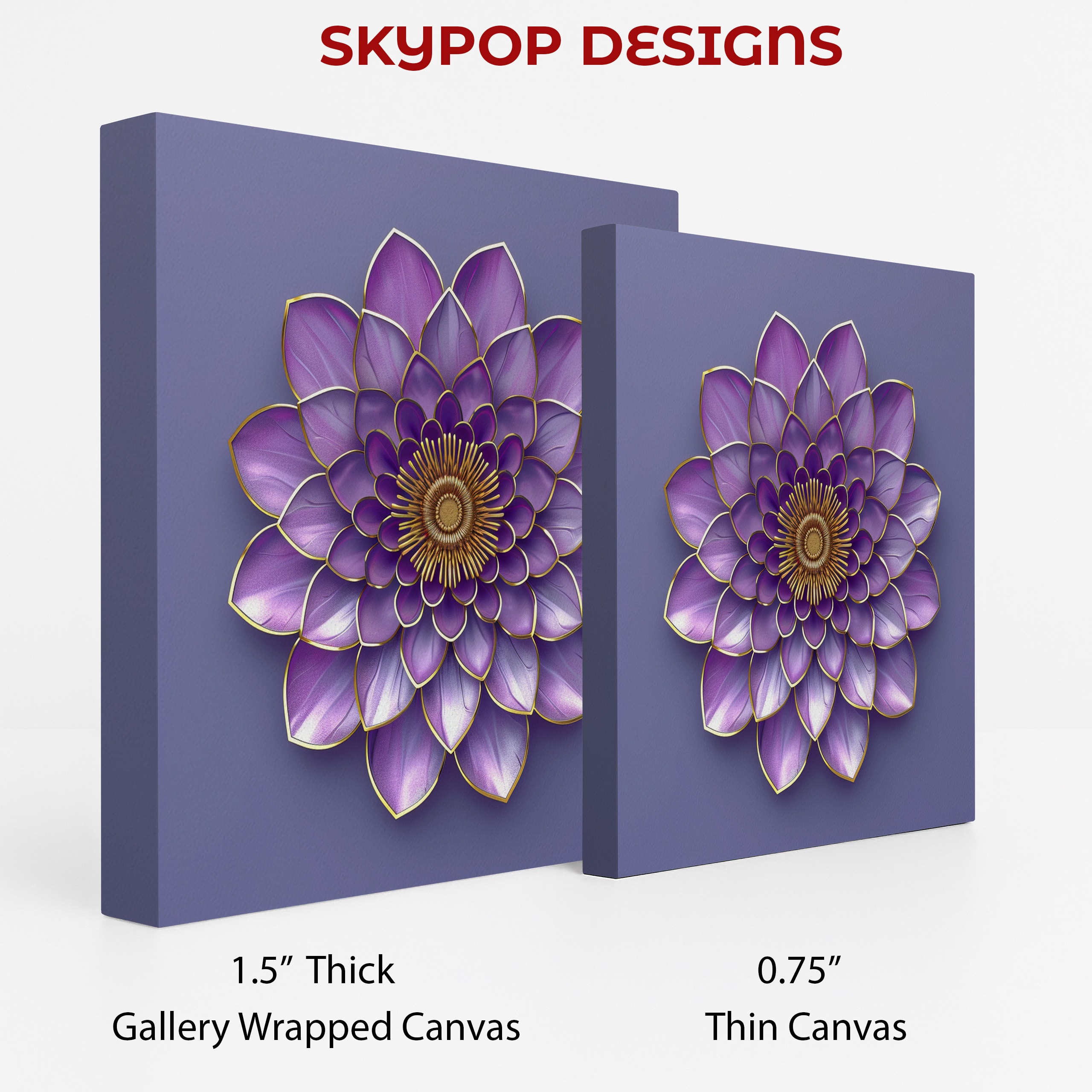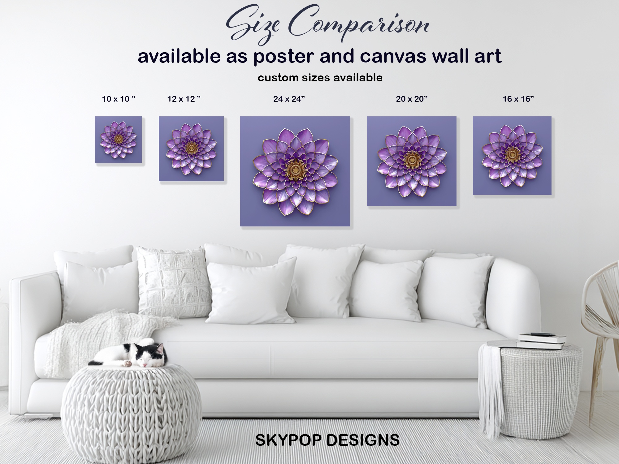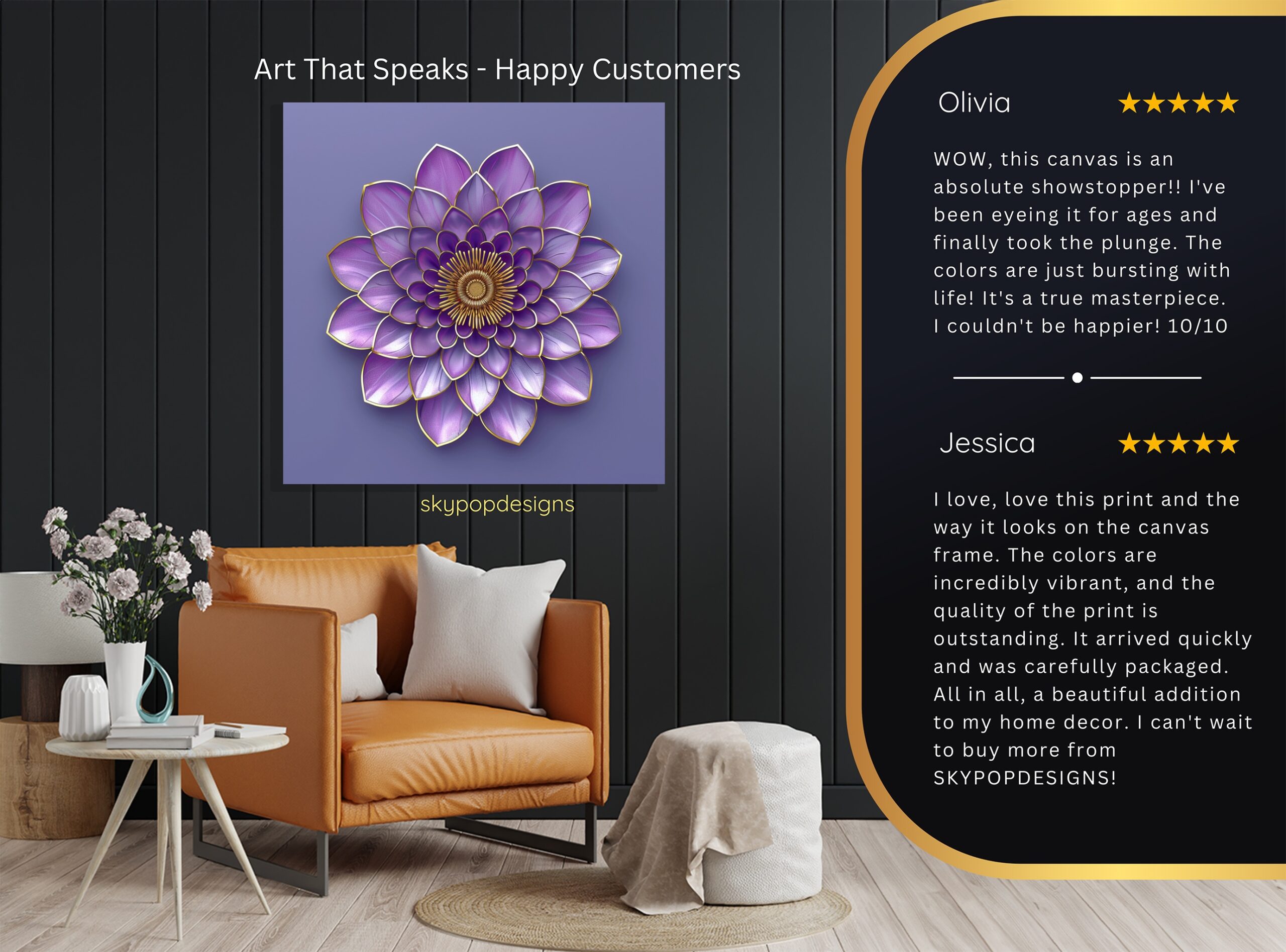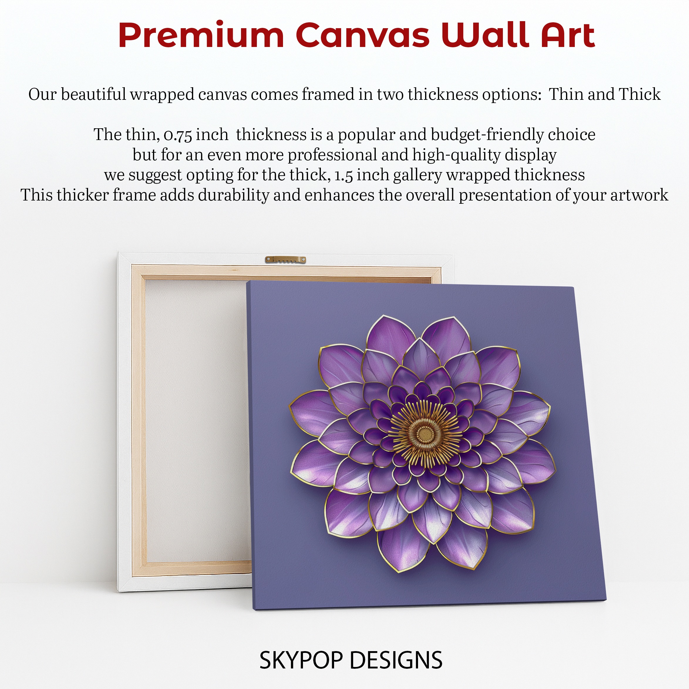 Transform your home with this exquisite Dahlia canvas wall art, featuring a stunning golden dahlia bloom that exudes elegance and sophistication. This captivating poster or canvas wall art is perfect for elevating modern living room wall decor or adding a touch of glamour to your bedroom. The rich purple hues blend beautifully with the striking gold accents, creating a luxurious and inviting atmosphere. Ideal for minimalist and glam decor styles, this floral artwork enhances entryways and offices with its striking presence. The intricate details of the dahlia petals, highlighted by the metallic gold trim, make this piece a true statement of artistic design. High-quality printing ensures every nuance of depth and texture is captured, from the shimmering petals to the intricate golden center. This versatile floral wall art works wonders in any space, creating a focal point that inspires tranquility and beauty. It’s a perfect gift for housewarmings, birthdays, or any occasion where you want to give a lasting impression of refined taste. The combination of purple and gold is known to evoke feelings of creativity and luxury, making this canvas art a source of daily inspiration. Elevate your interior design with this breathtaking floral canvas art. Make this radiant Dahlia Bloom Wall Art the centerpiece of your collection today and experience its transformative power.