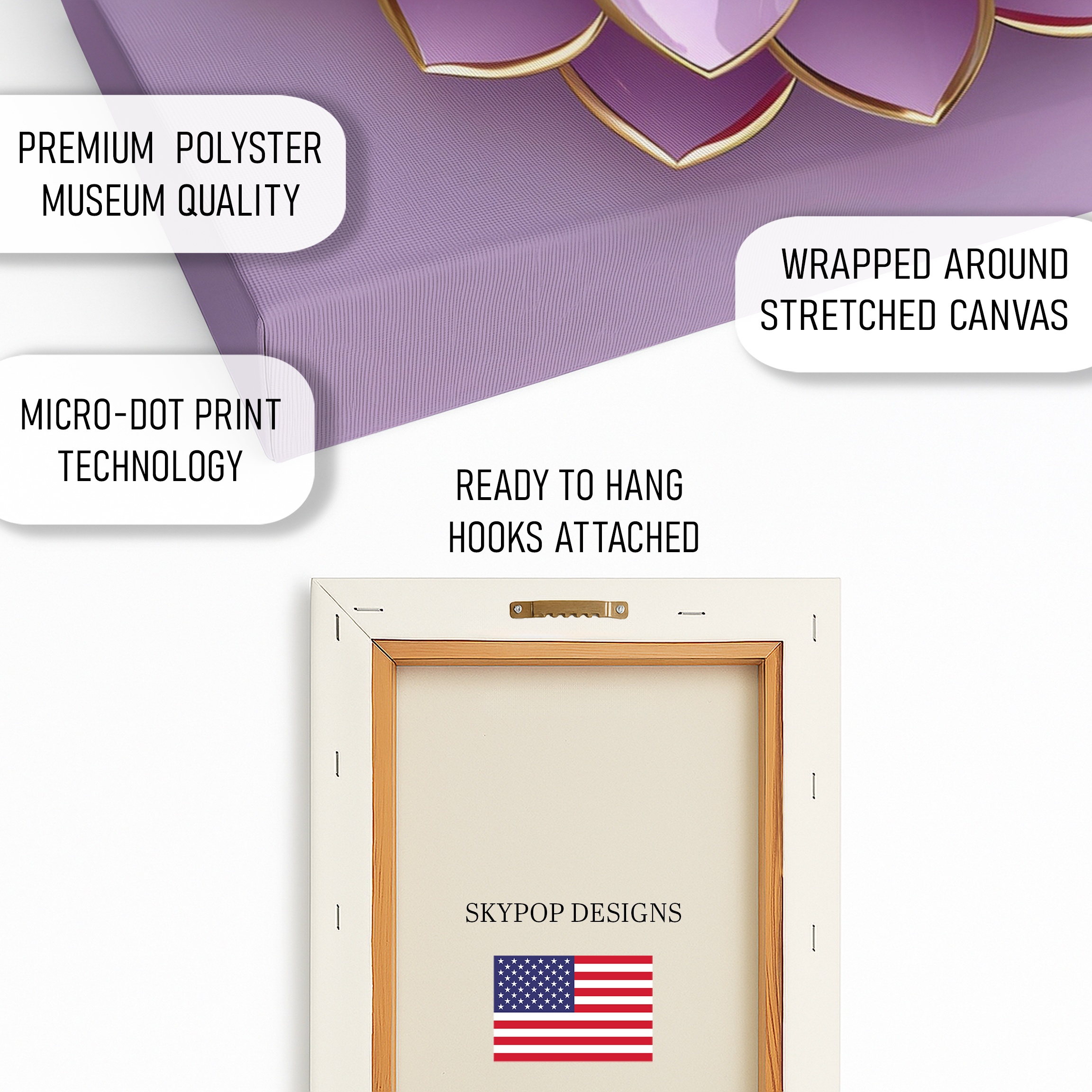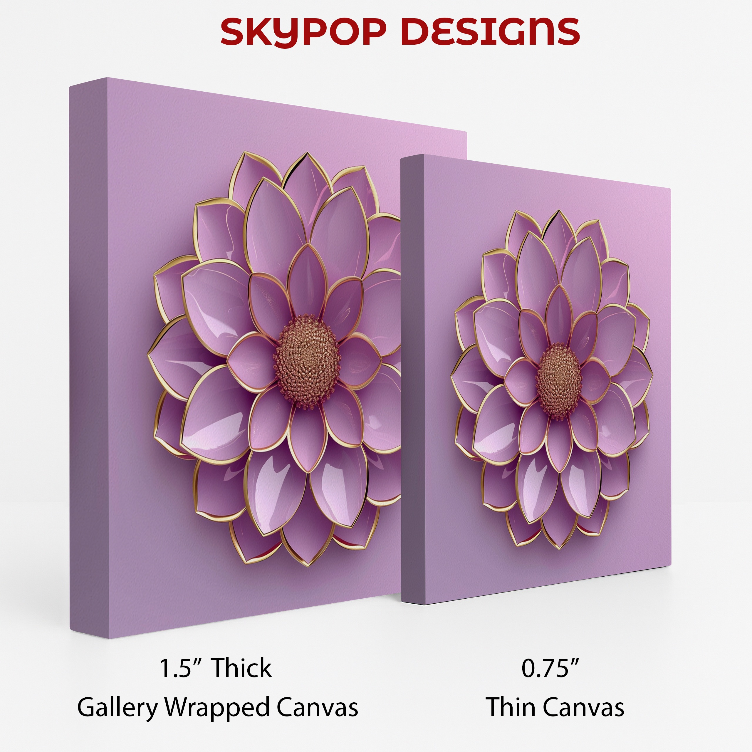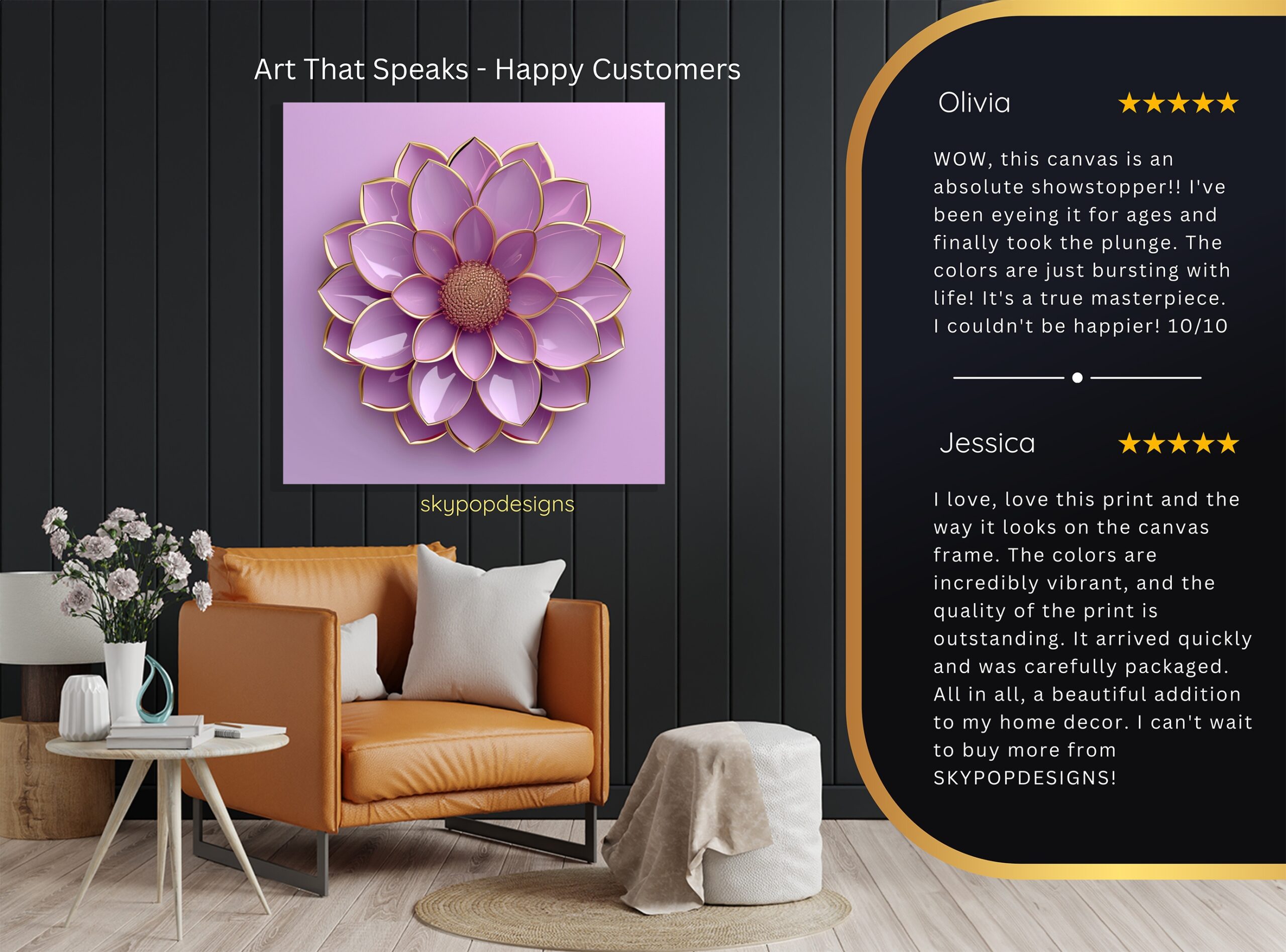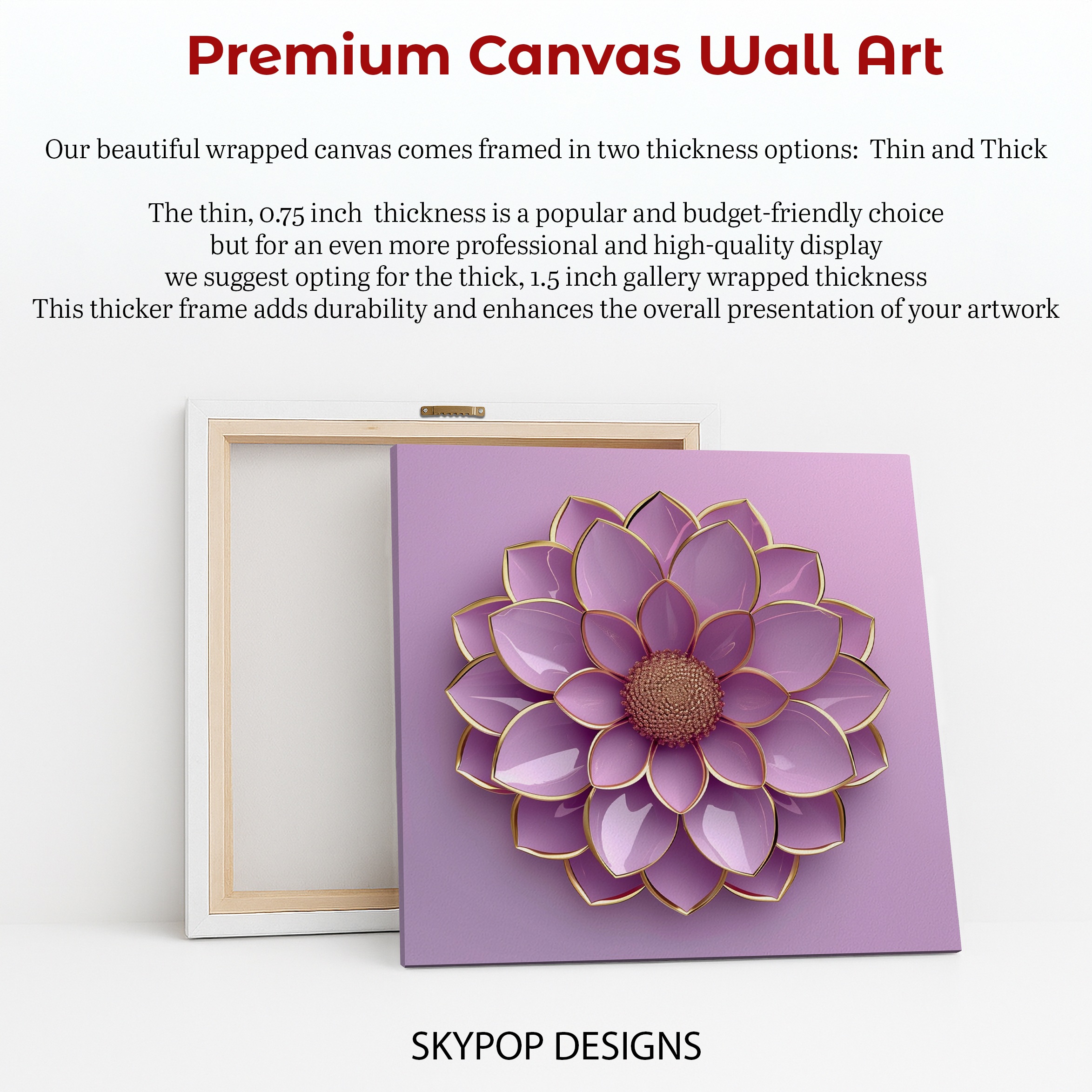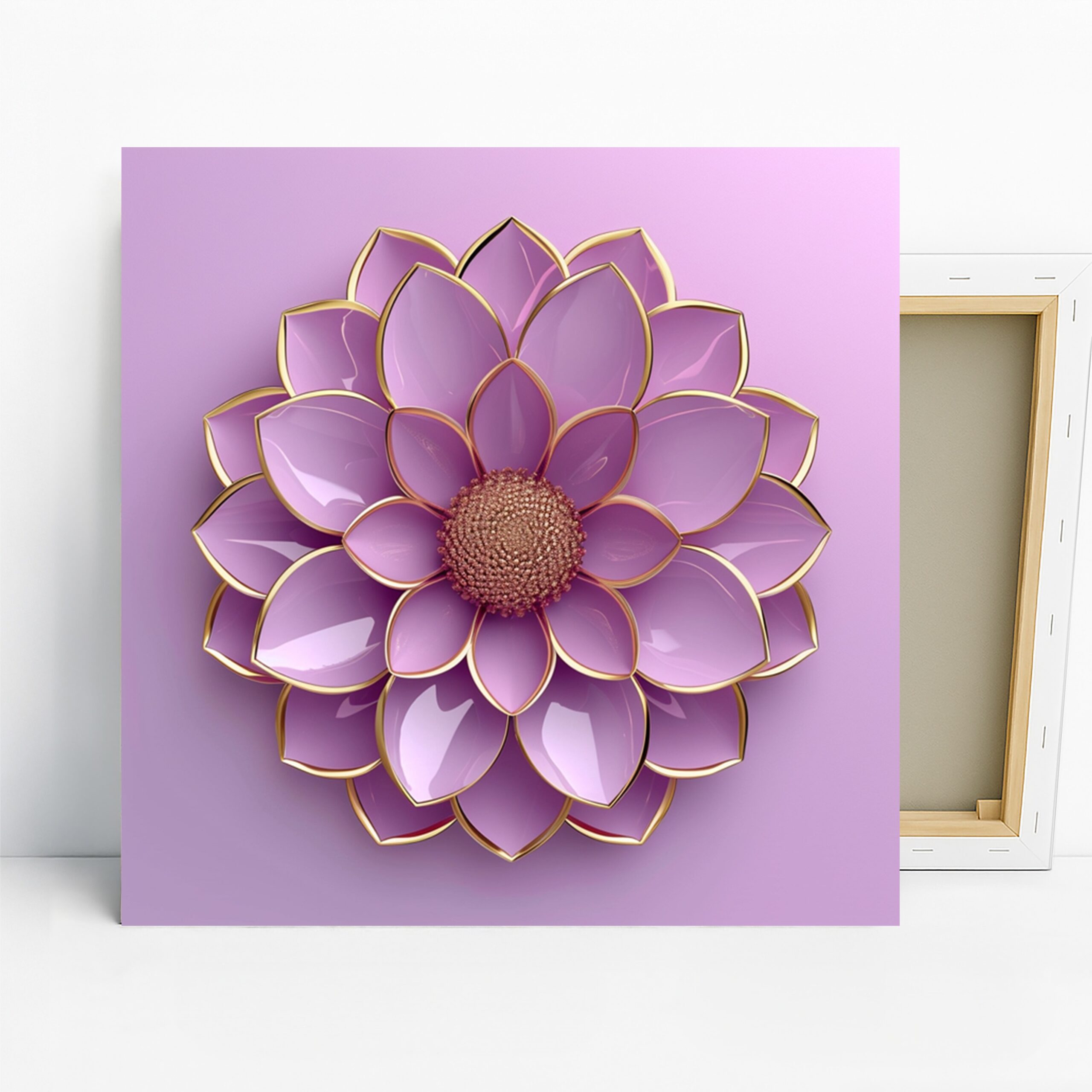 Elevate your home with this stunning Dahlia canvas wall art, a captivating abstract floral piece with a touch of glam. This poster or canvas wall art is perfect for transforming modern living room walls or adding a sophisticated touch to bedroom decor. The soft pink and purple hues, accented by luxurious gold detailing, create a striking visual that inspires serenity and style. Ideal for glam and minimalist decor enthusiasts, this artwork enhances any space with its chic and elegant design. The dahlia’s intricate petal structure, rendered in high-gloss finish, catches the light beautifully, adding depth and dimension to your interior. This versatile floral art piece is also perfect for dining rooms or entryways, creating a welcoming and luxurious atmosphere. High-quality printing ensures every detail of the intricate gold trim and smooth petal finish is vividly captured, making this canvas wall art a true statement piece. Looking for a thoughtful gift? This beautiful floral wall art is an ideal choice for housewarmings, birthdays, or holidays, bringing lasting beauty and joy. The sophisticated color palette complements a wide range of interior schemes, from soft neutrals to bold accents. Embrace current design trends with this chic and contemporary floral canvas art, a beautiful addition to any art collection. Make this elegant Dahlia artwork the focal point of your wall decor today for an instant upgrade in style and ambiance.