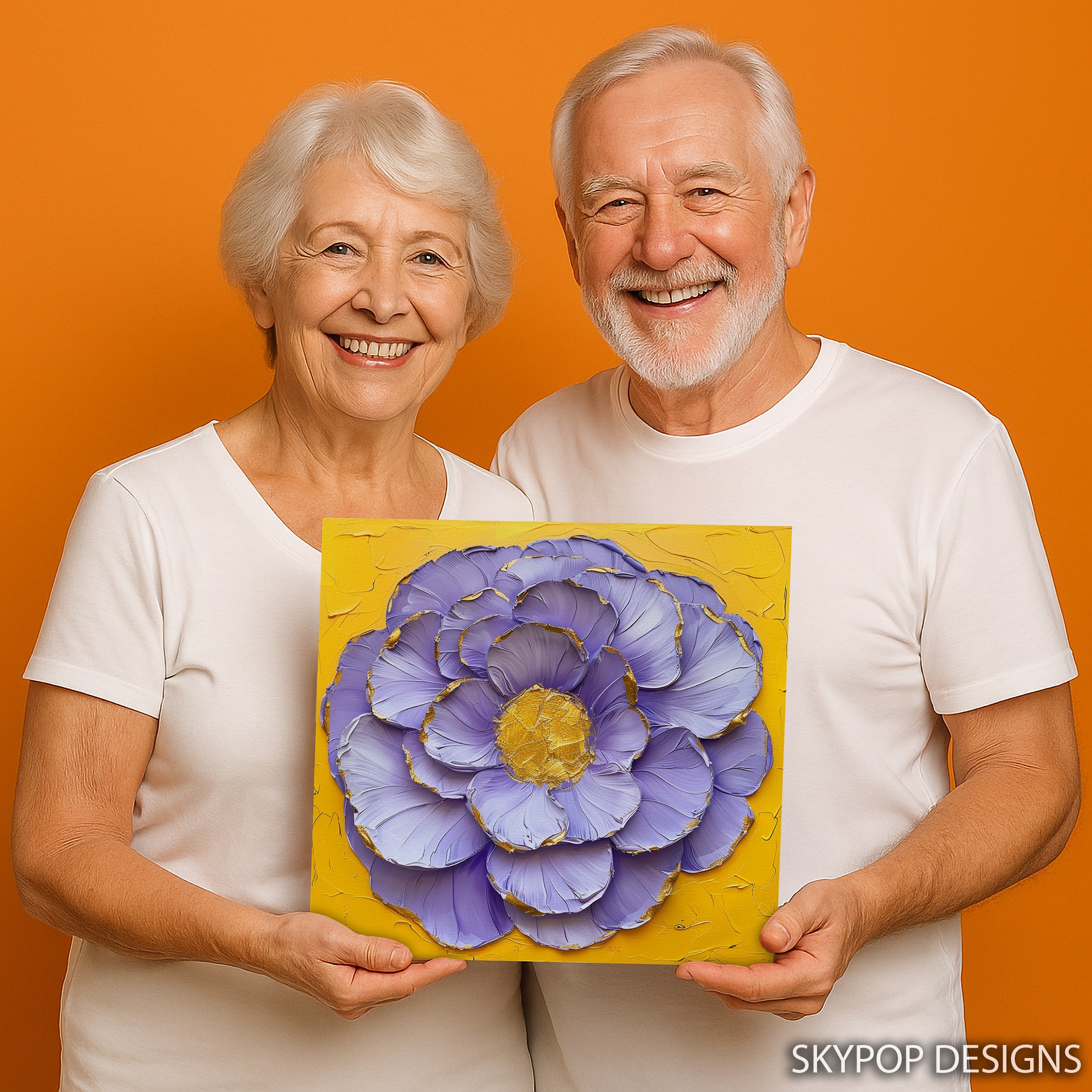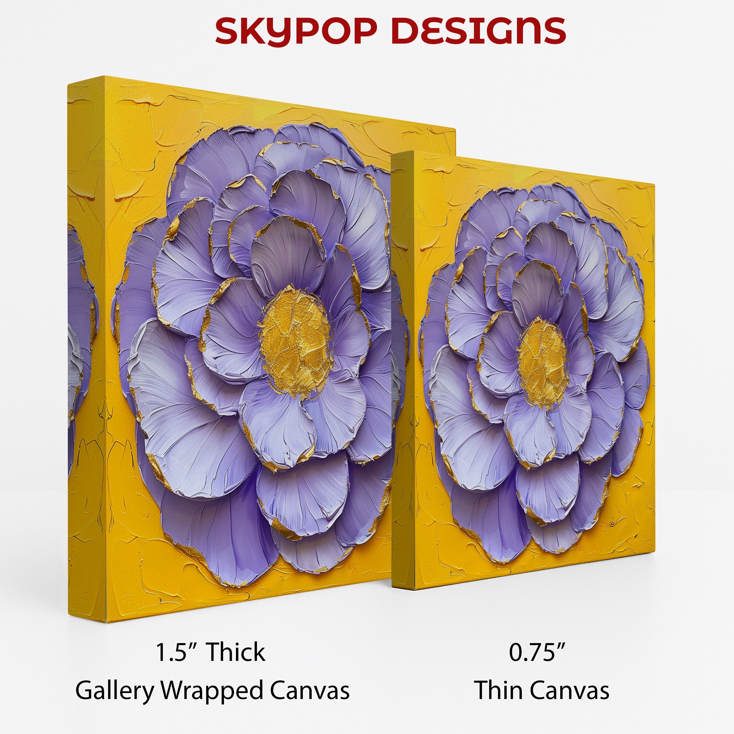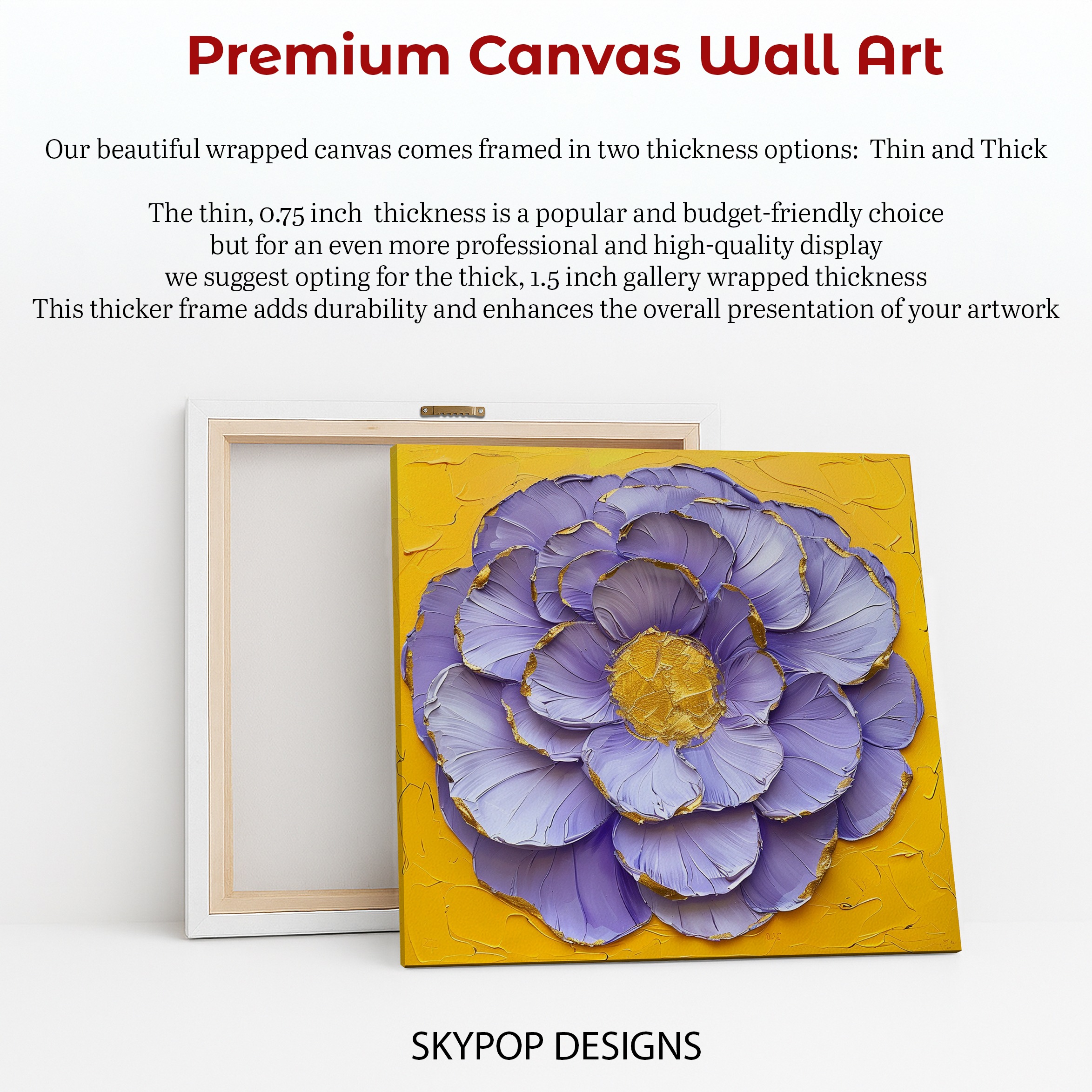 Transform your home with this stunning Dahlia canvas wall art, a striking piece that brings vibrant color and texture to any space. This poster or canvas wall art features a bold purple dahlia with elegant gold accents, set against a bright yellow textured background. The deep purple hues and shimmering gold details create a luxurious feel, perfect for elevating your modern living room wall decor or adding a touch of glamour to your bedroom. Ideal for traditional or contemporary homes, this floral artwork enhances entryway spaces with its captivating presence. The 3D textured effect of the petals adds depth and dimension, making this Dahlia canvas wall art a true statement piece. It’s a perfect choice for those who appreciate nature-inspired art with a sophisticated edge. This vibrant poster or canvas wall art also makes a wonderful gift for housewarmings, birthdays, or holidays, offering lasting beauty and style. The combination of purple and yellow evokes feelings of joy and royalty, bringing a positive and uplifting mood to your home. High-quality printing ensures the rich colors and intricate textures are beautifully preserved, making this floral art a timeless addition to your collection. Showcase your style with this elegant Dahlia artwork, a must-have for dynamic and eye-catching wall decor. Elevate your interior design and create a focal point that sparks conversation and admiration. Add a touch of opulence and natural beauty to your surroundings today with this exquisite Golden Dahlia Bloom Art.