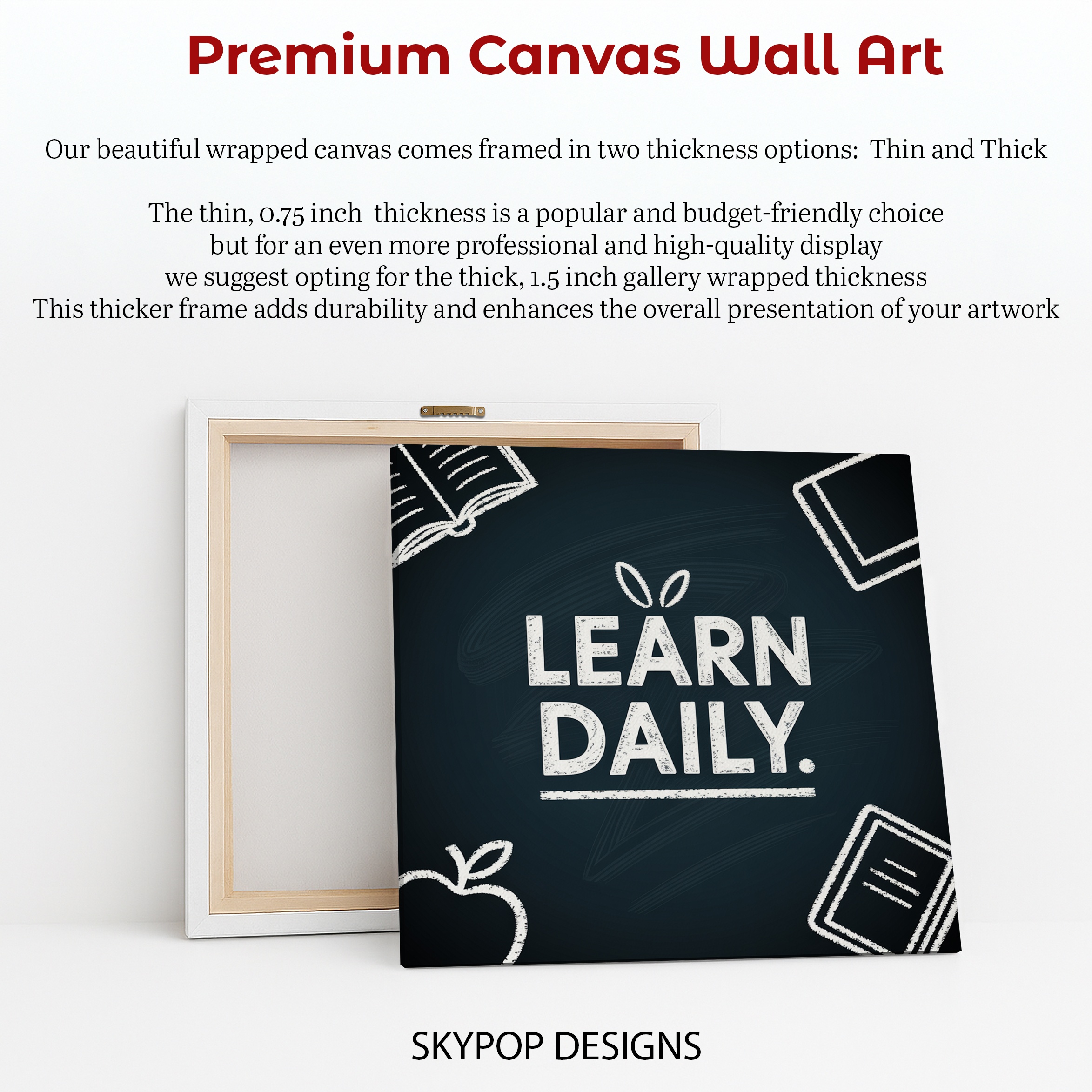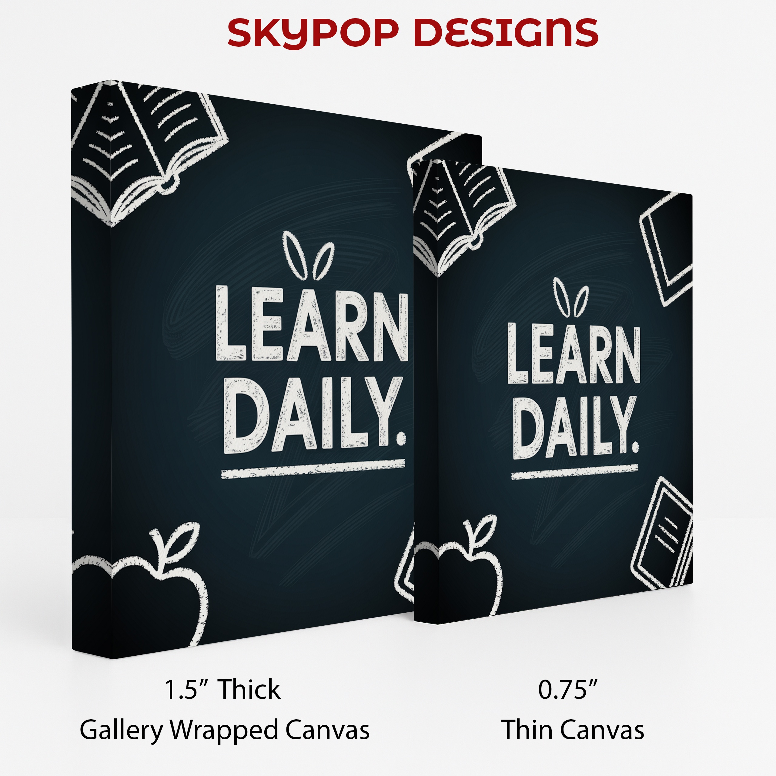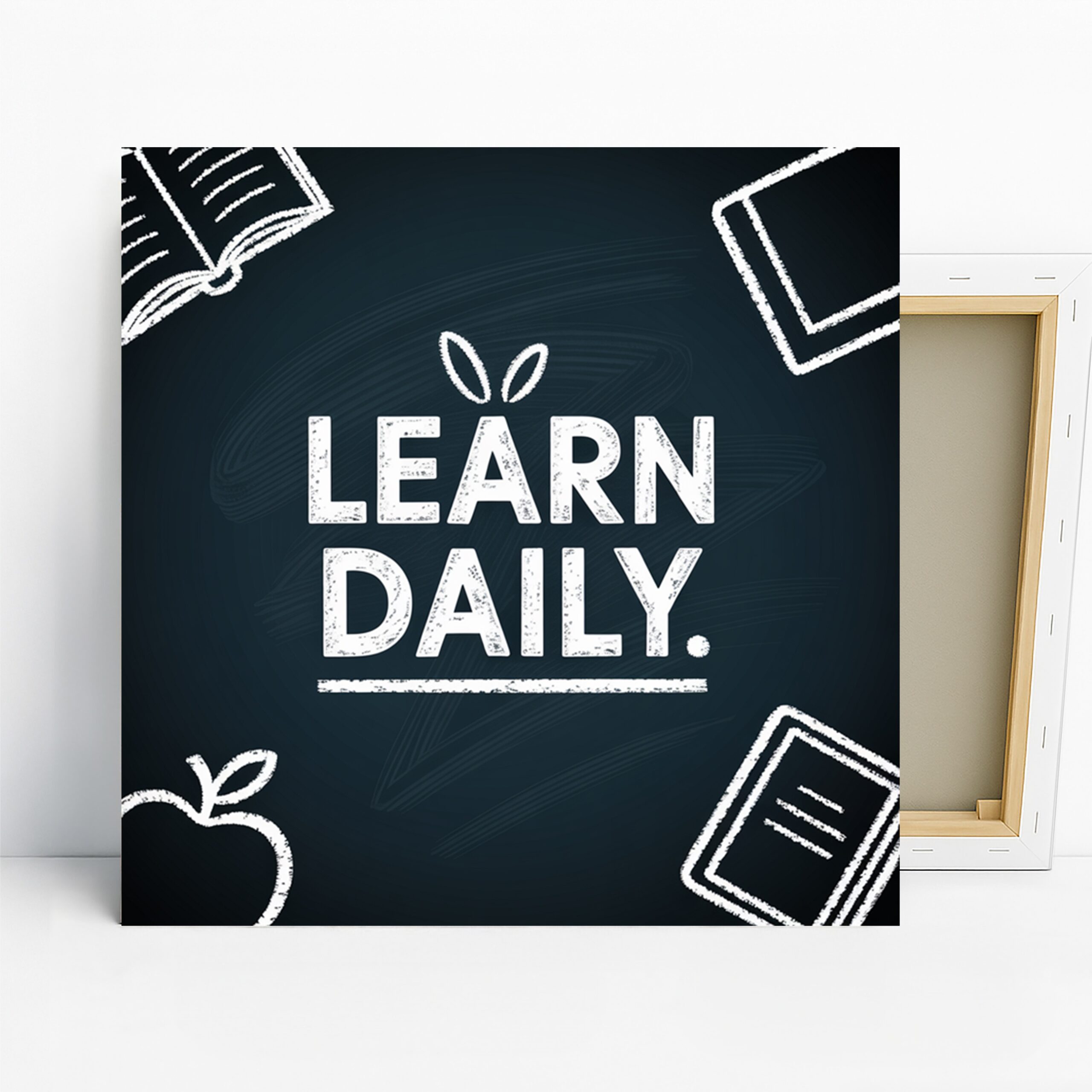Transform your space with this motivational canvas wall art featuring the powerful message “LEARN DAILY.” This striking poster design combines clean typography with subtle educational icons, creating an inspiring focal point for any room dedicated to growth and knowledge. Perfect for modern offices, minimalist study spaces, or contemporary classrooms, this canvas art piece serves as a daily reminder to embrace lifelong learning. The bold white text against a deep blue background creates a visually impactful contrast, drawing the eye and reinforcing the importance of continuous education. Ideal for Scandinavian-inspired interiors, this minimalist wall art adds a touch of motivation without overwhelming your decor. The simple line drawings of books and an apple in the corners add a whimsical touch, making this piece both sophisticated and approachable. Whether you’re setting up a home office, decorating a library, or creating an inspiring classroom environment, this versatile artwork adapts beautifully to various settings. The high-quality printing ensures crisp text and clean lines, making it a standout piece in any room. Gift this inspirational canvas to a teacher, student, or anyone committed to personal growth – it’s sure to be appreciated and cherished. Elevate your space and mindset with this contemporary learning-themed wall art that serves as a daily nudge towards knowledge and self-improvement. Add this motivational piece to your decor today and create an atmosphere that encourages curiosity and continuous learning.