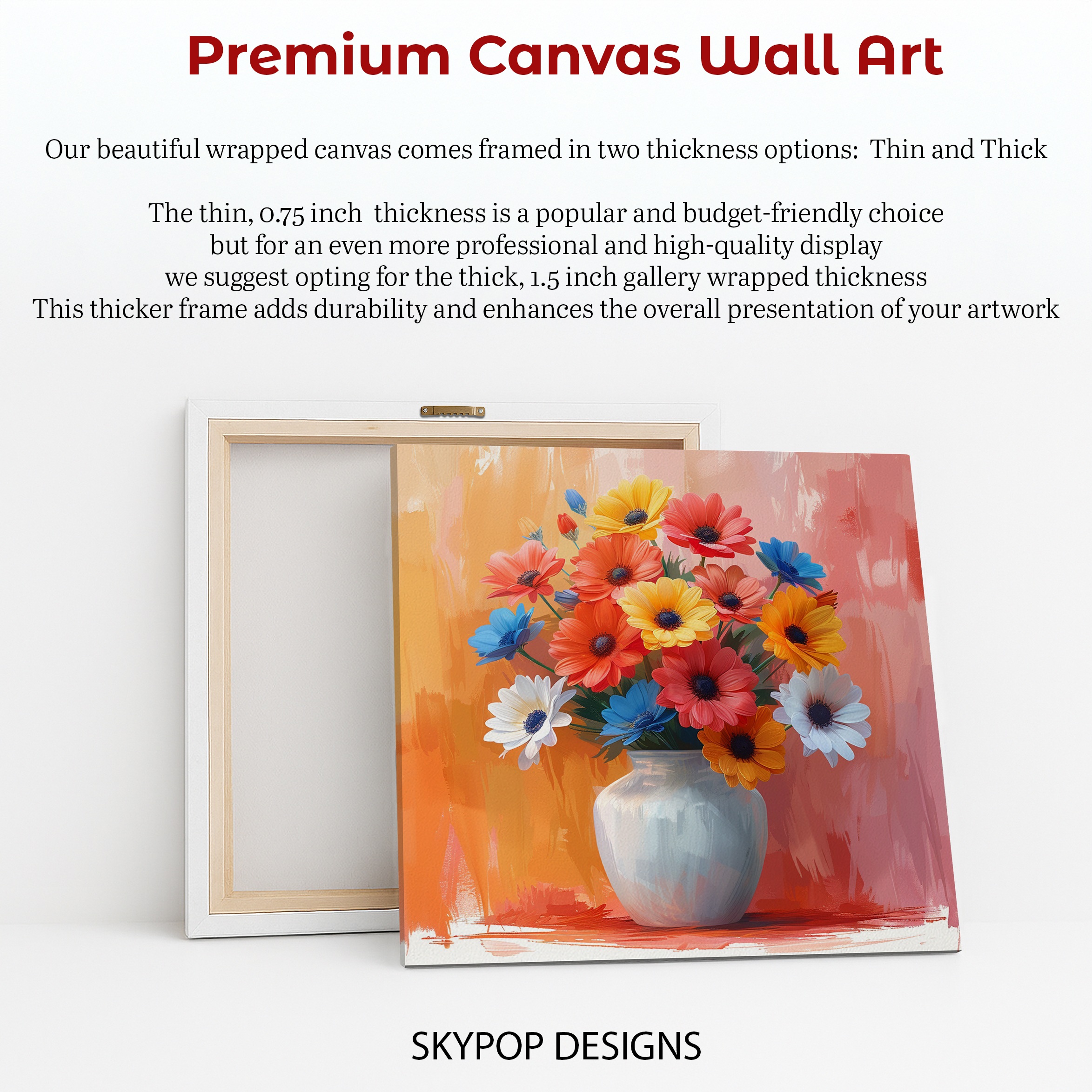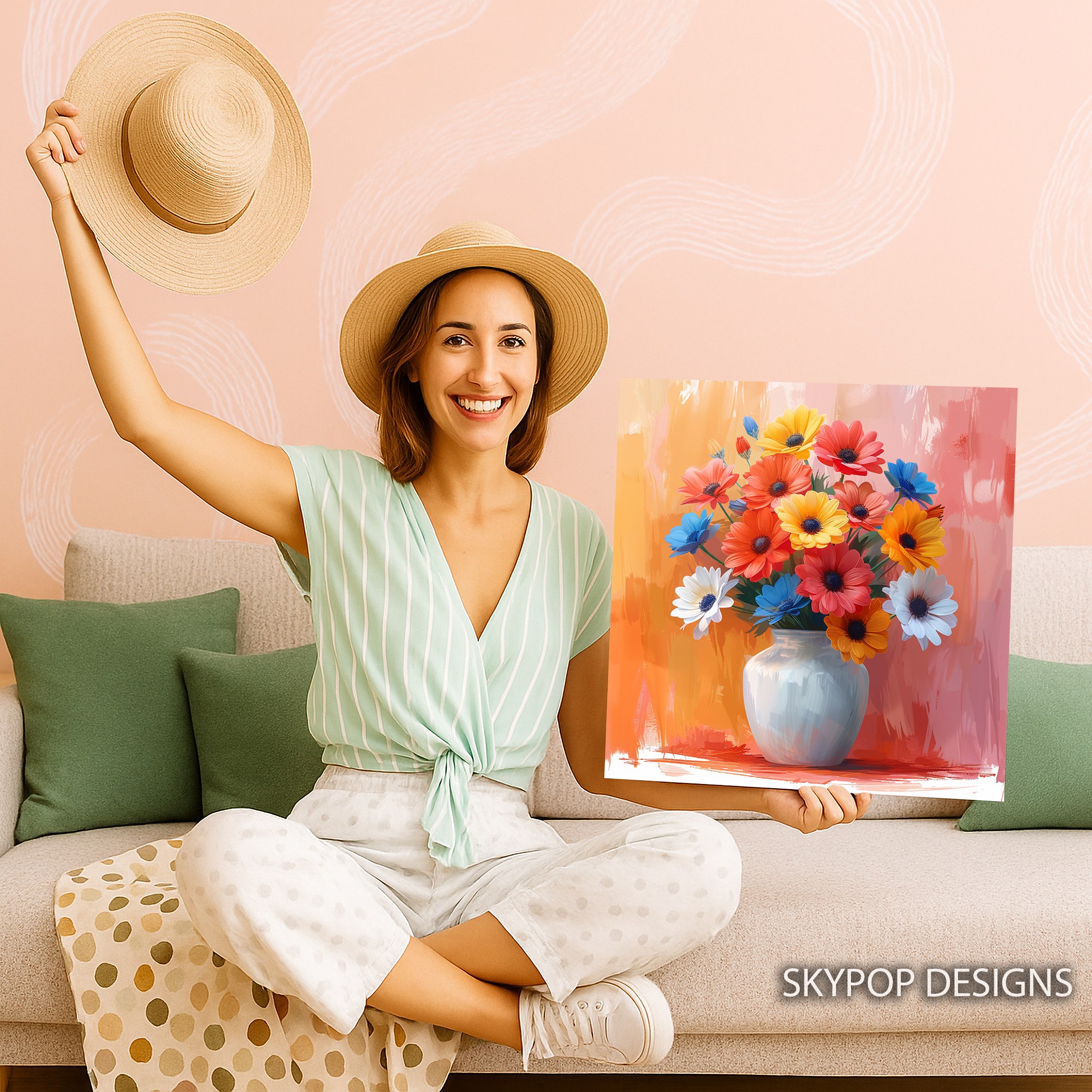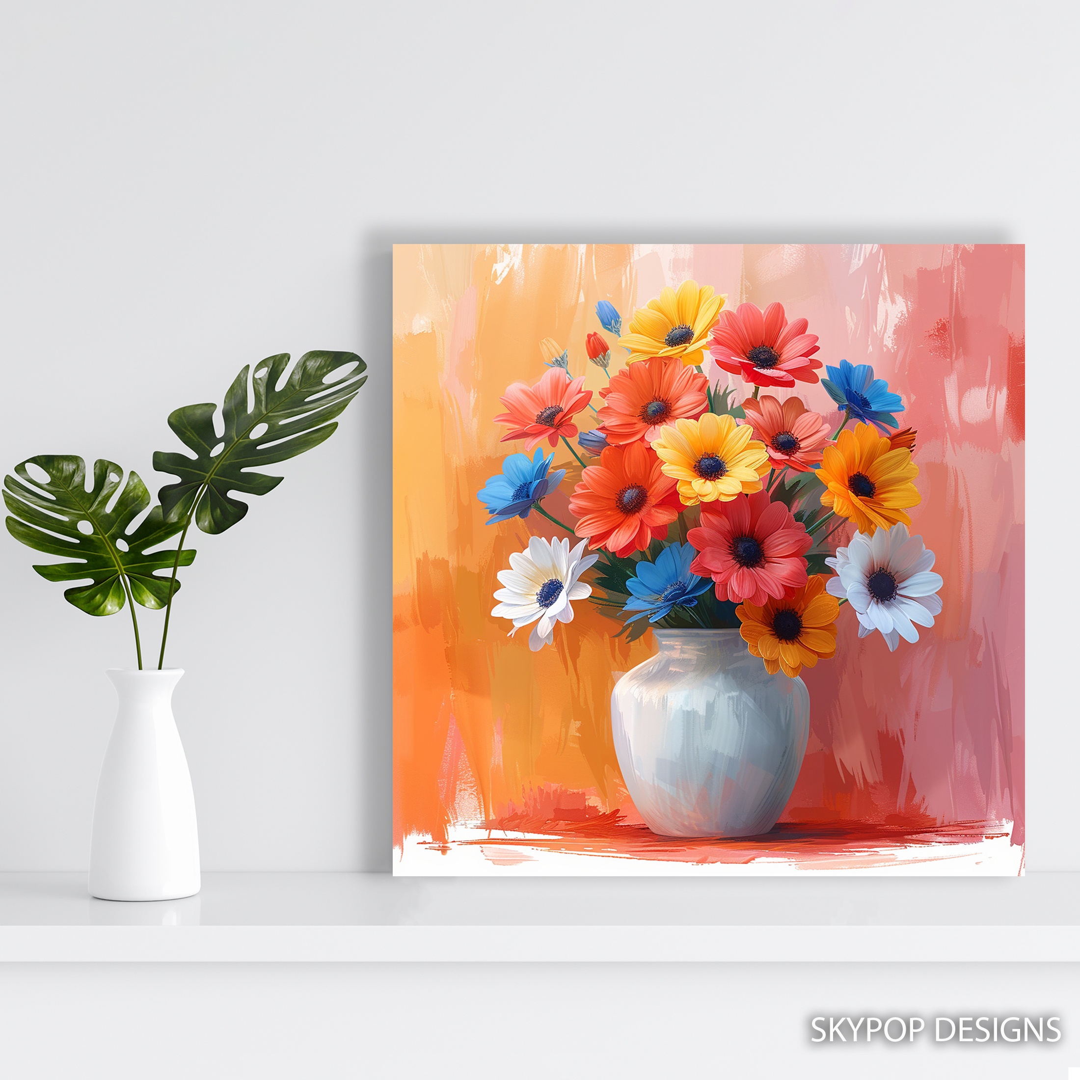 Brighten your home with this vibrant Daisy Burst canvas wall art, perfect for adding a pop of color and artistic flair to any space. This stunning poster or canvas wall art showcases a joyful arrangement of daisies in a modern, expressive style, creating a captivating focal point. The multicolor palette, with its dominant oranges, yellows, blues, and whites, evokes feelings of happiness and warmth, making it ideal for contemporary living room wall decor or a lively addition to a bohemian bedroom. This floral artwork transforms any room, from a cozy dining area to a welcoming entryway, with its striking visual appeal. The daisy flowers, known for their cheerful simplicity, are rendered with dynamic brushstrokes that add texture and depth to this beautiful poster. High-quality printing ensures the vibrant colors and fine details of this canvas wall art are beautifully preserved, offering a lasting impression. Whether you’re looking to update your home decor or searching for a thoughtful gift for housewarmings, birthdays, or holidays, this versatile daisy art is an excellent choice. It’s perfect for those seeking modern wall art that brings the beauty of nature indoors. Elevate your space with this stunning floral canvas wall art, designed to inspire joy and add a touch of contemporary elegance to your everyday life. Add this eye-catching piece to your collection and enjoy its cheerful energy today.