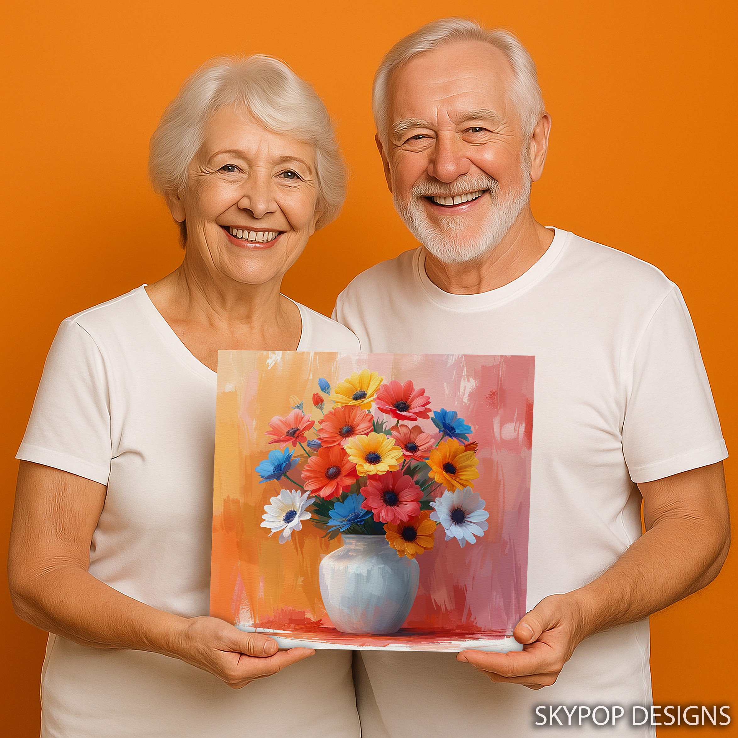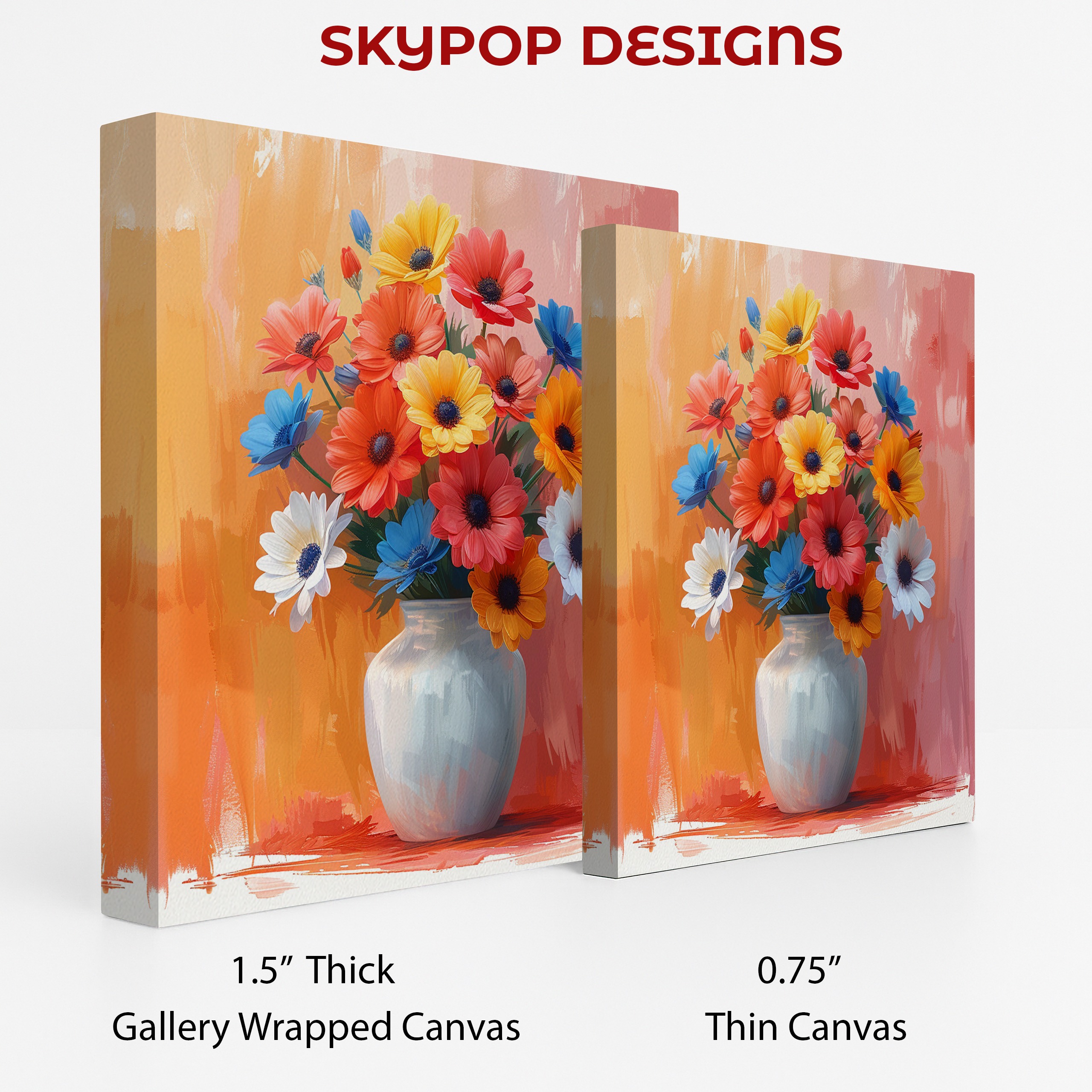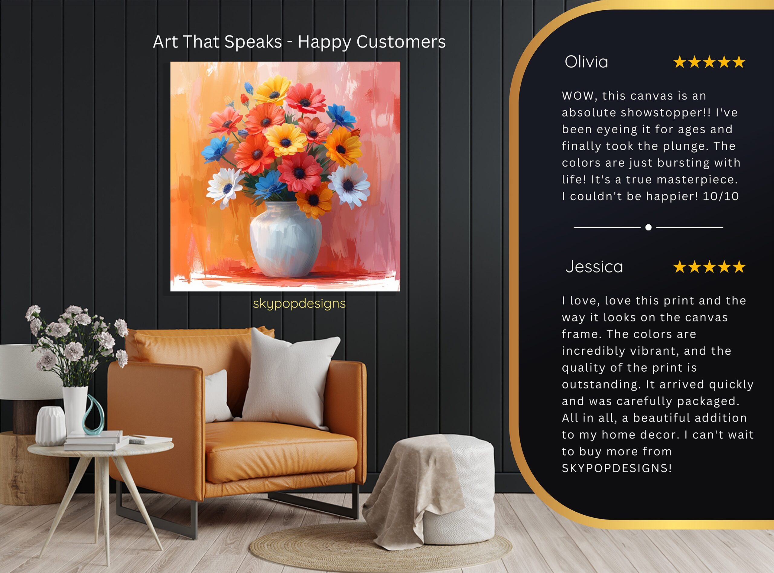 Brighten your home with this vibrant Daisy Burst canvas wall art, perfect for adding a pop of color and artistic flair to any space. This stunning poster or canvas wall art showcases a joyful arrangement of daisies in a modern, expressive style, creating a captivating focal point. The multicolor palette, with its dominant oranges, yellows, blues, and whites, evokes feelings of happiness and warmth, making it ideal for contemporary living room wall decor or a lively addition to a bohemian bedroom. This floral artwork transforms any room, from a cozy dining area to a welcoming entryway, with its striking visual appeal. The daisy flowers, known for their cheerful simplicity, are rendered with dynamic brushstrokes that add texture and depth to this beautiful poster. High-quality printing ensures the vibrant colors and fine details of this canvas wall art are beautifully preserved, offering a lasting impression. Whether you’re looking to update your home decor or searching for a thoughtful gift for housewarmings, birthdays, or holidays, this versatile daisy art is an excellent choice. It’s perfect for those seeking modern wall art that brings the beauty of nature indoors. Elevate your space with this stunning floral canvas wall art, designed to inspire joy and add a touch of contemporary elegance to your everyday life. Add this eye-catching piece to your collection and enjoy its cheerful energy today.