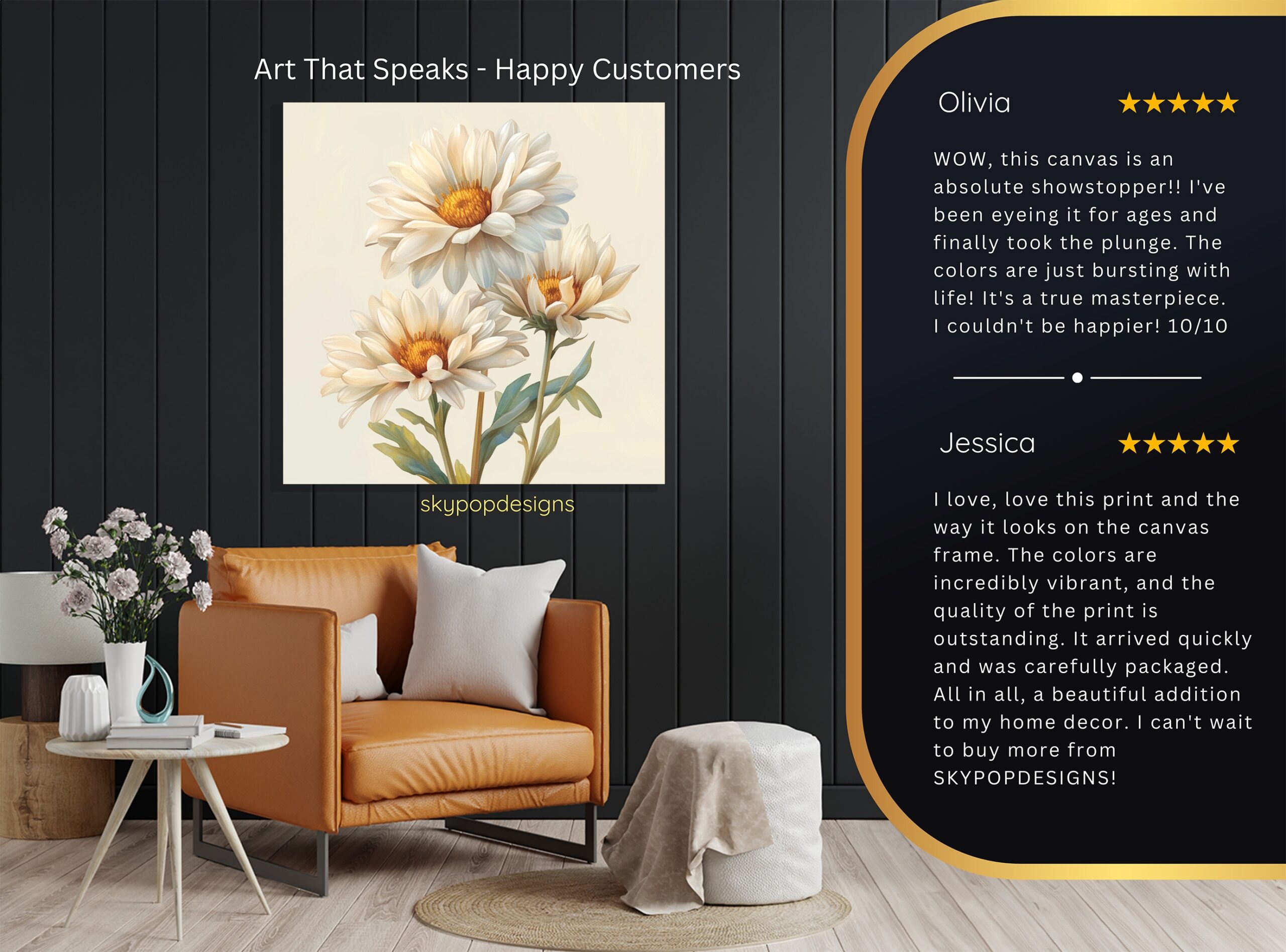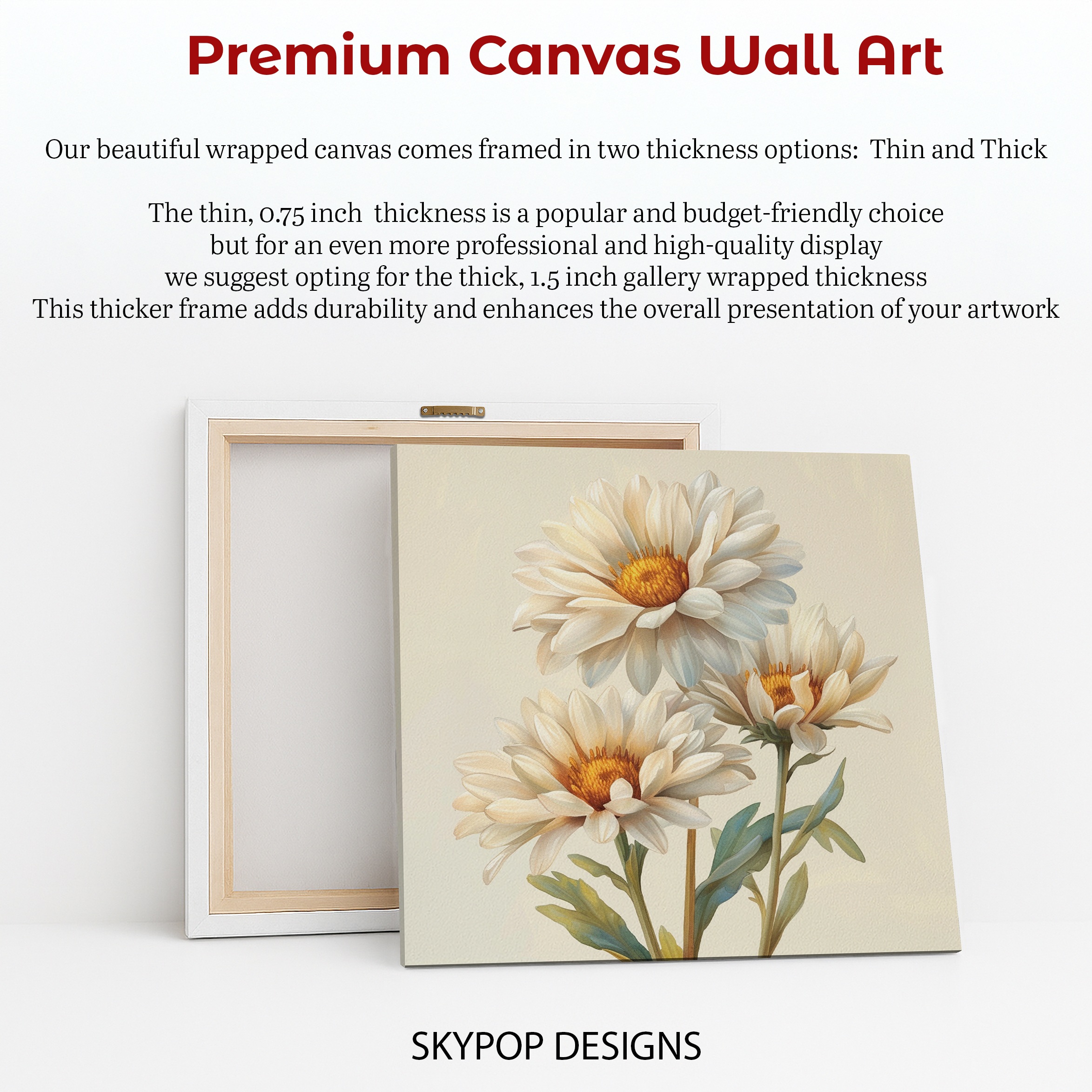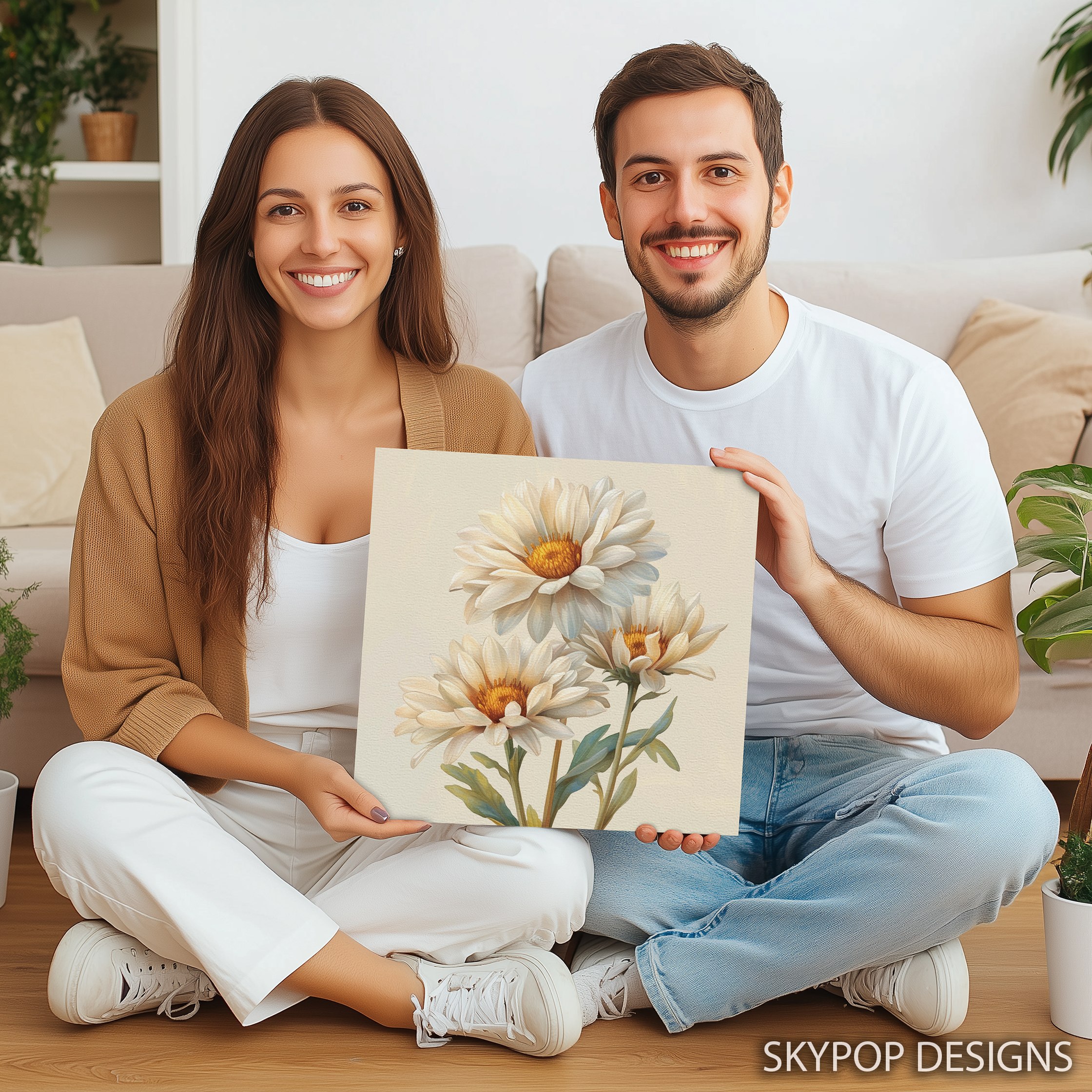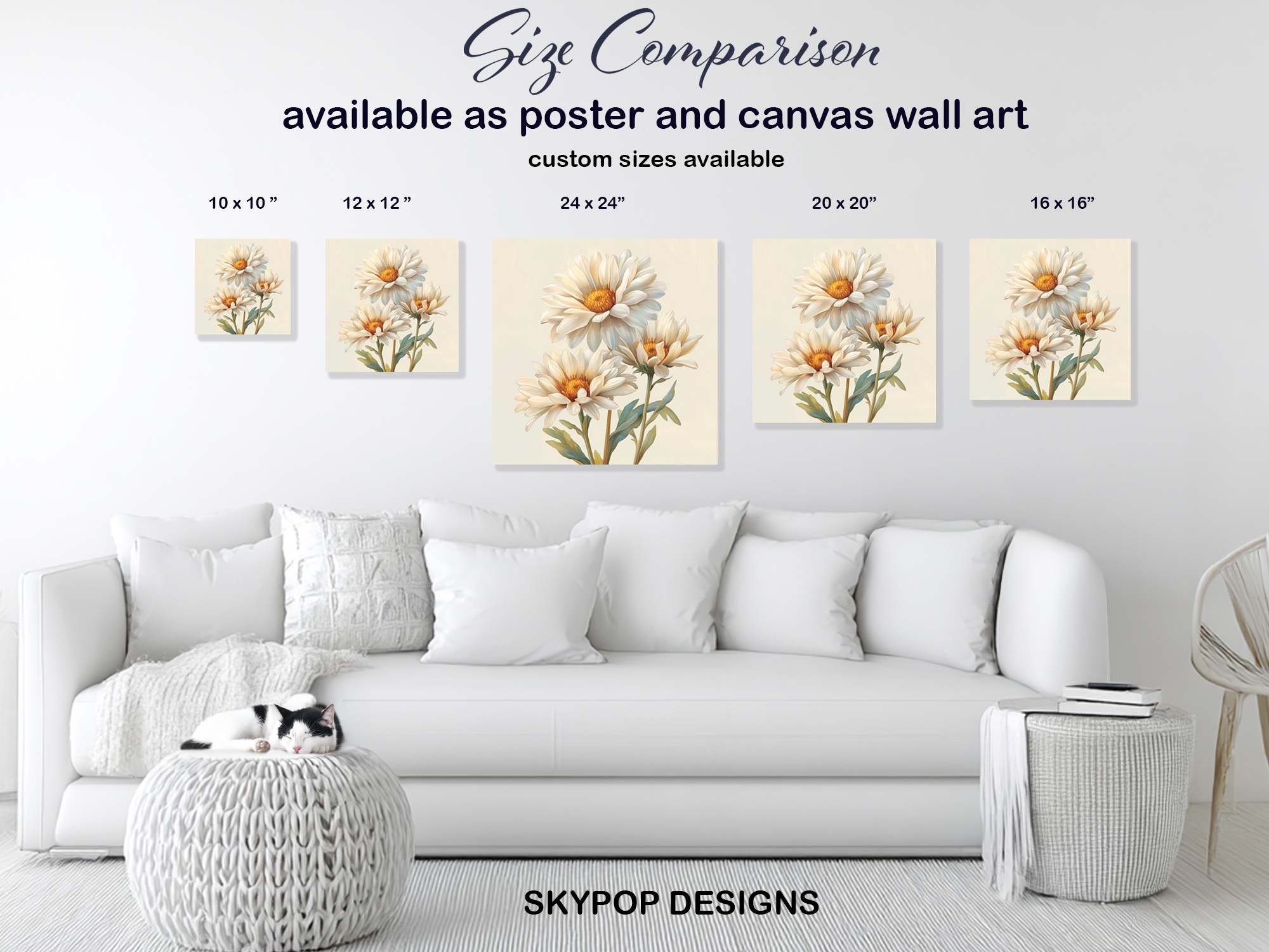 Transform your living space with this captivating Daisy canvas wall art, showcasing the delicate beauty of spring blooms. This poster or canvas wall art is perfect for adding a touch of natural elegance to modern living room wall decor or creating a serene bedroom oasis. The soft white petals and warm yellow centers evoke feelings of joy and optimism, while the subtle green leaves add a refreshing natural element. Ideal for Scandinavian and bohemian decor enthusiasts, this floral artwork enhances minimalist and eclectic spaces with effortless charm. The daisy flower, symbolizing purity and new beginnings, makes a stunning focal point that brightens any room. High-quality printing ensures every detail, from the soft brushstrokes to the subtle color gradients, is beautifully rendered on this canvas wall art. This versatile nature art piece works wonderfully in dining rooms or hallways, setting a welcoming and uplifting mood for everyone. It’s also a perfect housewarming gift, birthday present, or holiday surprise for flower lovers. The calming color palette blends seamlessly with a variety of interior designs, making it easy to integrate into your existing home decor. Elevate your home with this exquisite Daisy canvas wall art that combines classic floral art with contemporary design. A must-have for those seeking simple yet striking floral wall art, this piece will inspire tranquility and bring the outdoors in every day. Add a touch of natural beauty and a serene atmosphere to your home today with Daisy Field Dream Art.