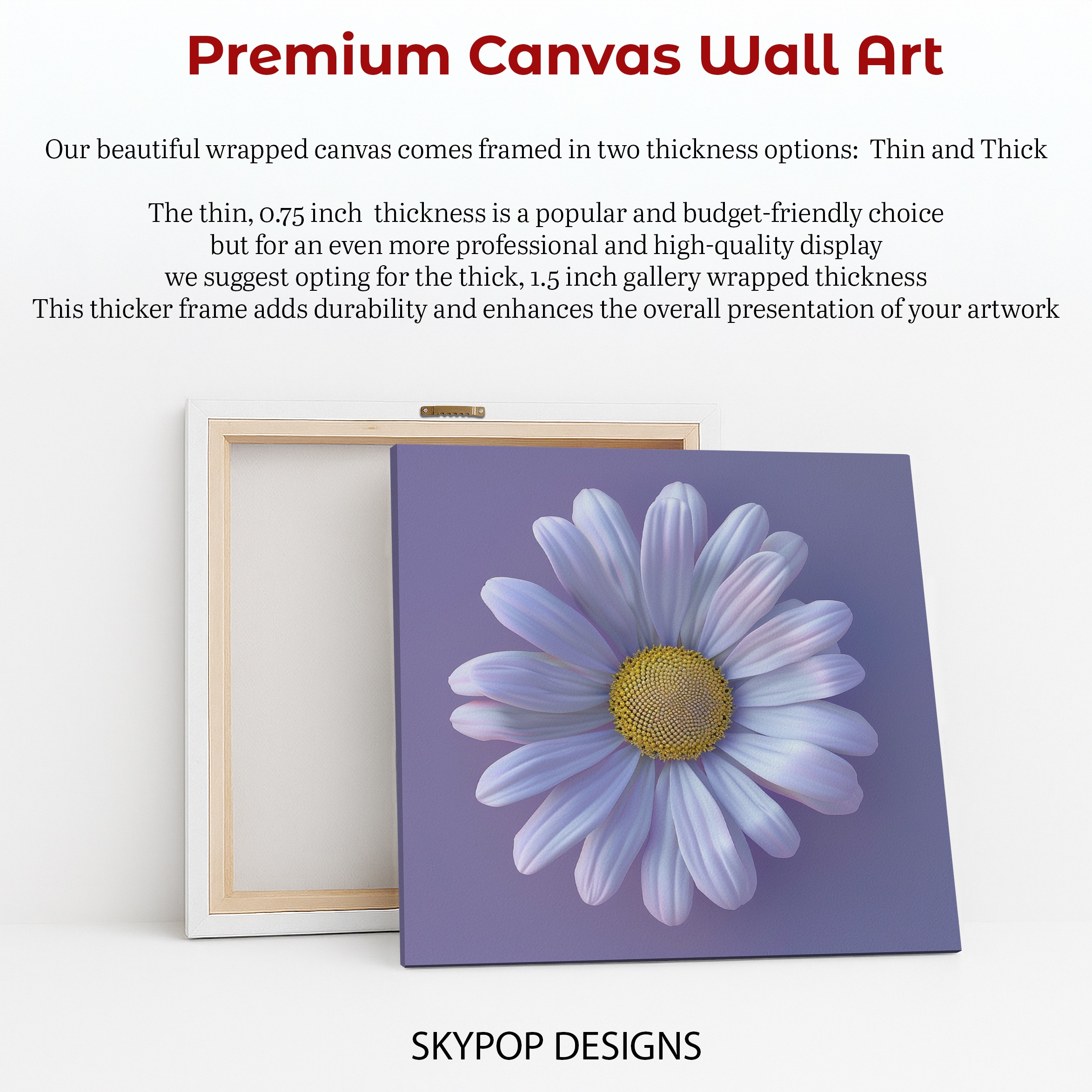 Transform your home with this stunning Daisy canvas wall art that brings the delicate beauty of nature indoors. This poster or canvas wall art showcases a captivating daisy with its vibrant yellow center and soft, multicolored petals against a serene purple background. Perfect for modern living room wall decor, this piece adds a pop of color and natural elegance. The minimalist design of this floral art makes it ideal for bohemian bedroom decor or creating a calming atmosphere in your entryway or bathroom. The striking contrast between the yellow and purple tones evokes feelings of joy and tranquility, enhancing your living space. Crafted with high-quality printing, this canvas wall art ensures every detail of the daisy’s texture and delicate shading is vividly captured. This versatile floral artwork is a wonderful addition to any room, bringing a fresh and uplifting vibe. It serves as a beautiful housewarming gift, birthday present, or holiday surprise for anyone who appreciates nature-inspired decor. The color palette complements various interior styles, from contemporary to minimalist. Elevate your home’s aesthetic with this eye-catching daisy canvas art that celebrates the simple beauty of a daisy. Discover the art of nature with Daisy Dream Canvas Art – a piece that inspires and delights. Enhance your wall decor collection today with this beautiful floral poster.