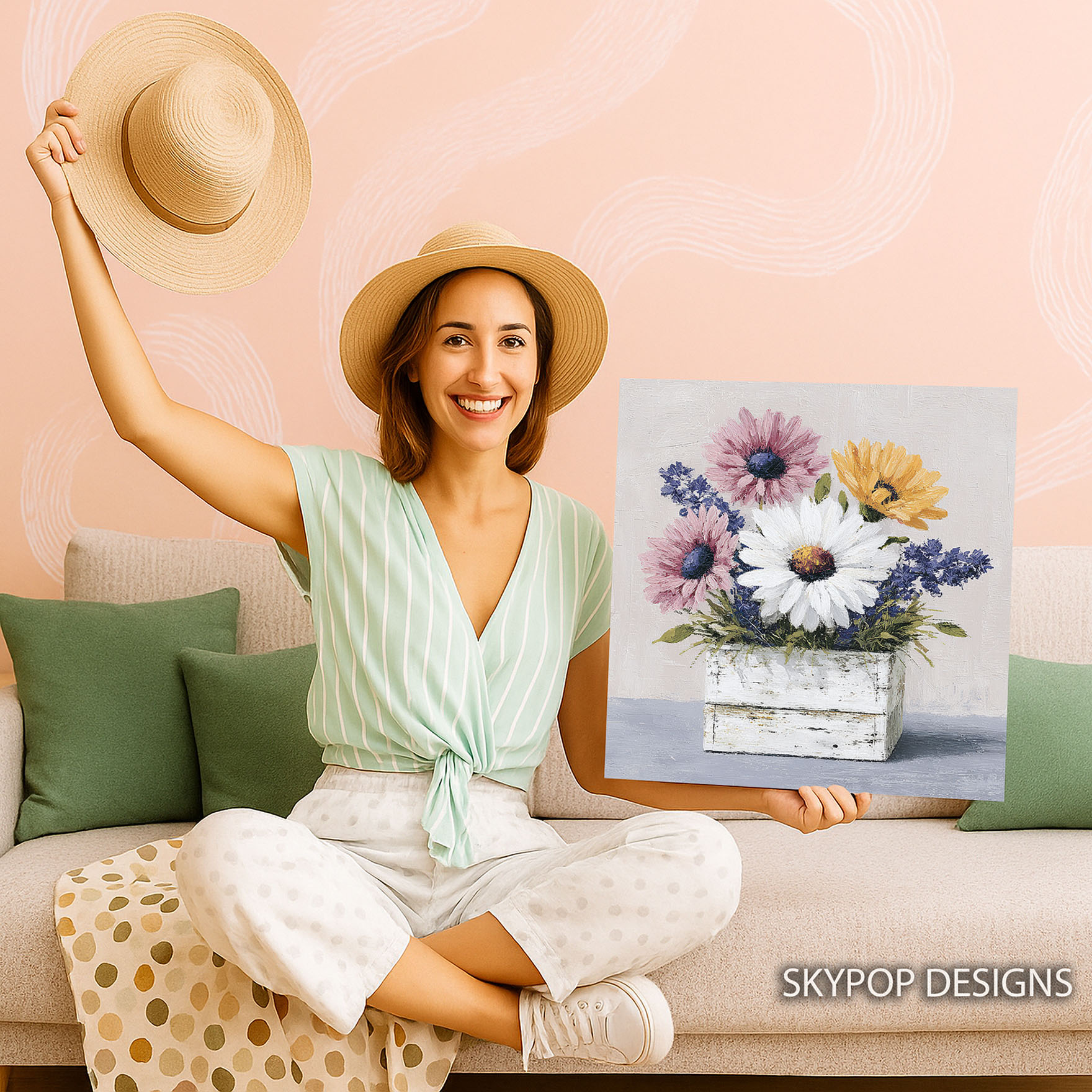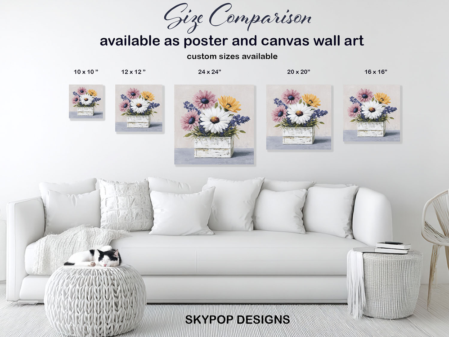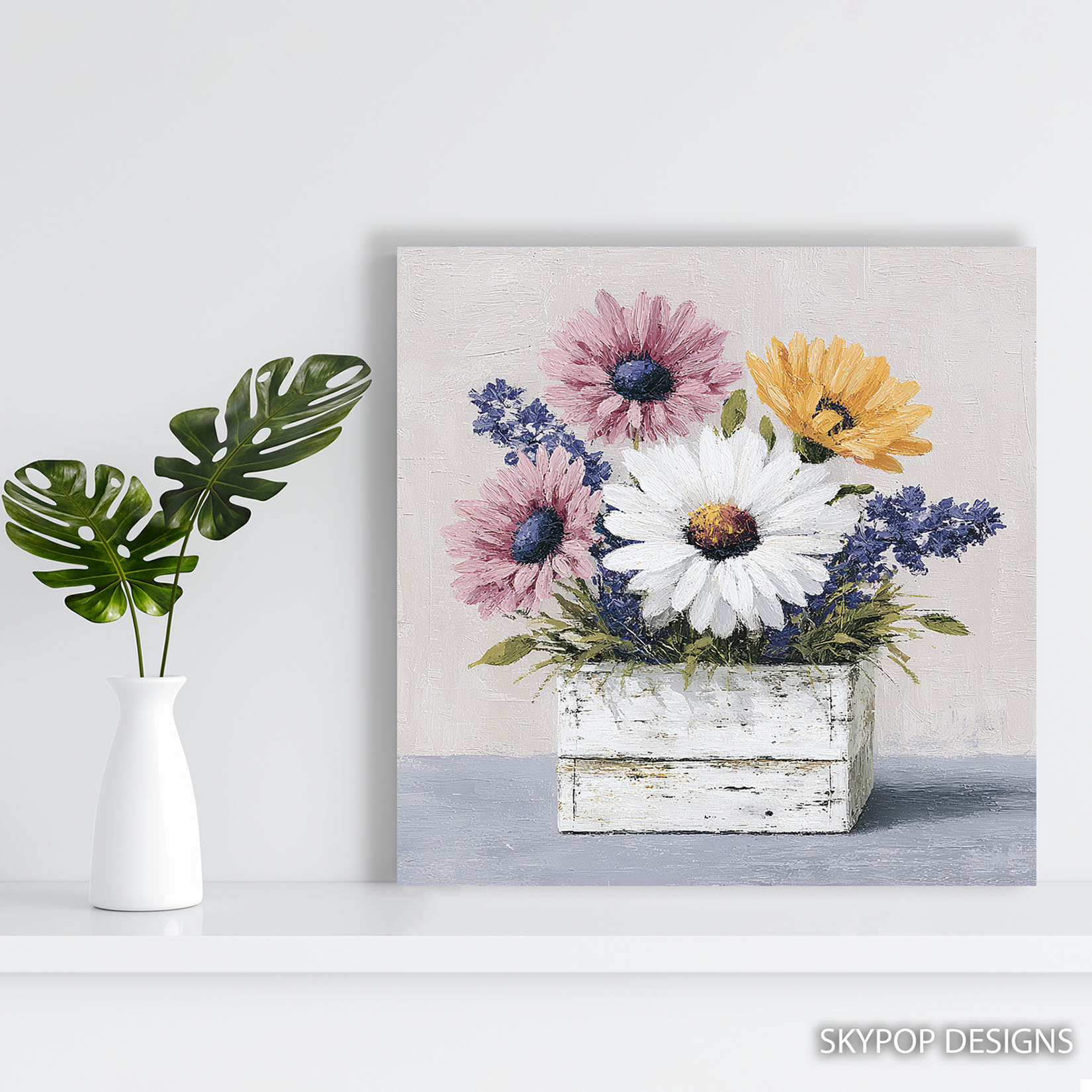 Brighten your home with this charming daisy canvas wall art, showcasing a vibrant bouquet of flowers in a rustic wooden crate. This stunning poster or canvas wall art is perfect for enhancing farmhouse decor or adding a touch of shabby chic charm to your living room walls. The multicolor palette, featuring soft pinks, sunny yellows, and crisp whites, creates a joyful and inviting atmosphere, while the purple lavender accents add depth and contrast. Ideal for creating a serene bedroom sanctuary or a welcoming entryway, this floral artwork brings the beauty of nature indoors. The impressionistic style captures the texture and movement of the petals, making each bloom feel alive, a perfect piece for adding natural beauty to your wall decor. This versatile canvas wall art is excellent for adding a fresh, organic feel to any space, transforming it into a cozy haven. High-quality printing ensures the rich textures and vivid colors of this floral poster are beautifully preserved for lasting enjoyment. It makes a thoughtful housewarming gift or a lovely addition to any home decor collection, celebrating the simple elegance of a countryside garden. Elevate your home’s aesthetic with this captivating daisy canvas art that inspires serenity and brings a touch of timeless beauty. Add this unique floral wall art to your collection today and experience the uplifting power of nature’s artistry. This impressive canvas print is designed to capture the heart and soul of farmhouse living.