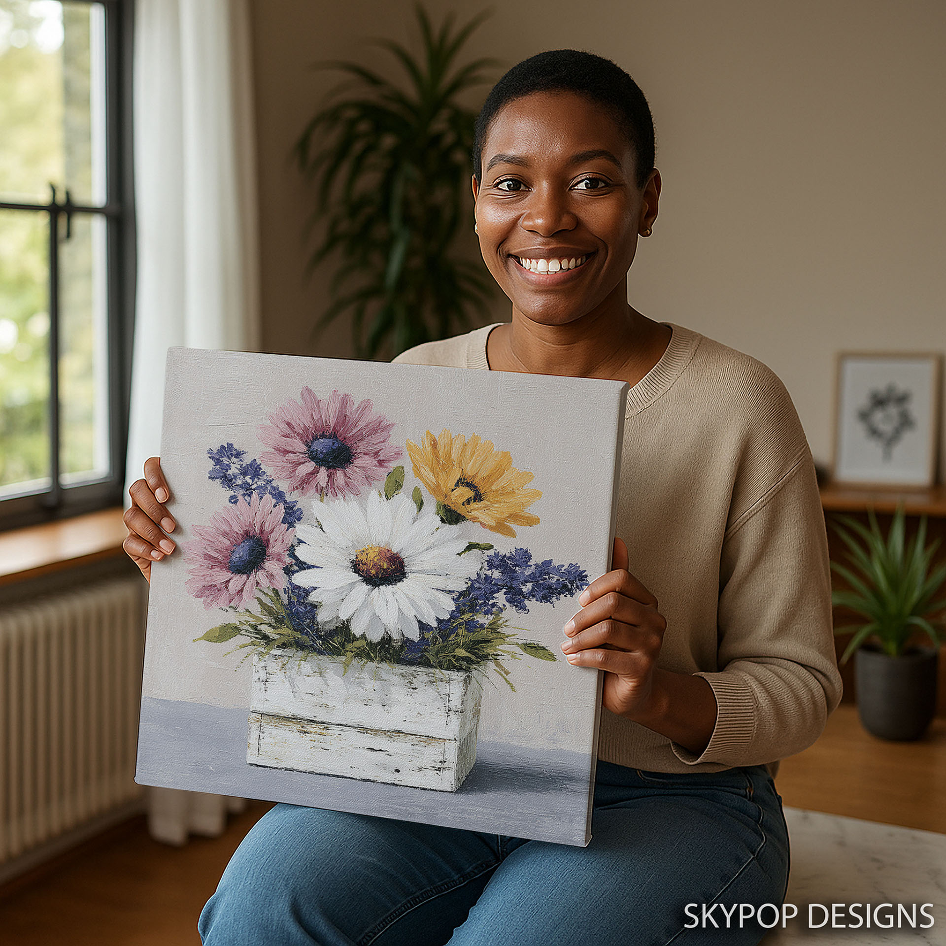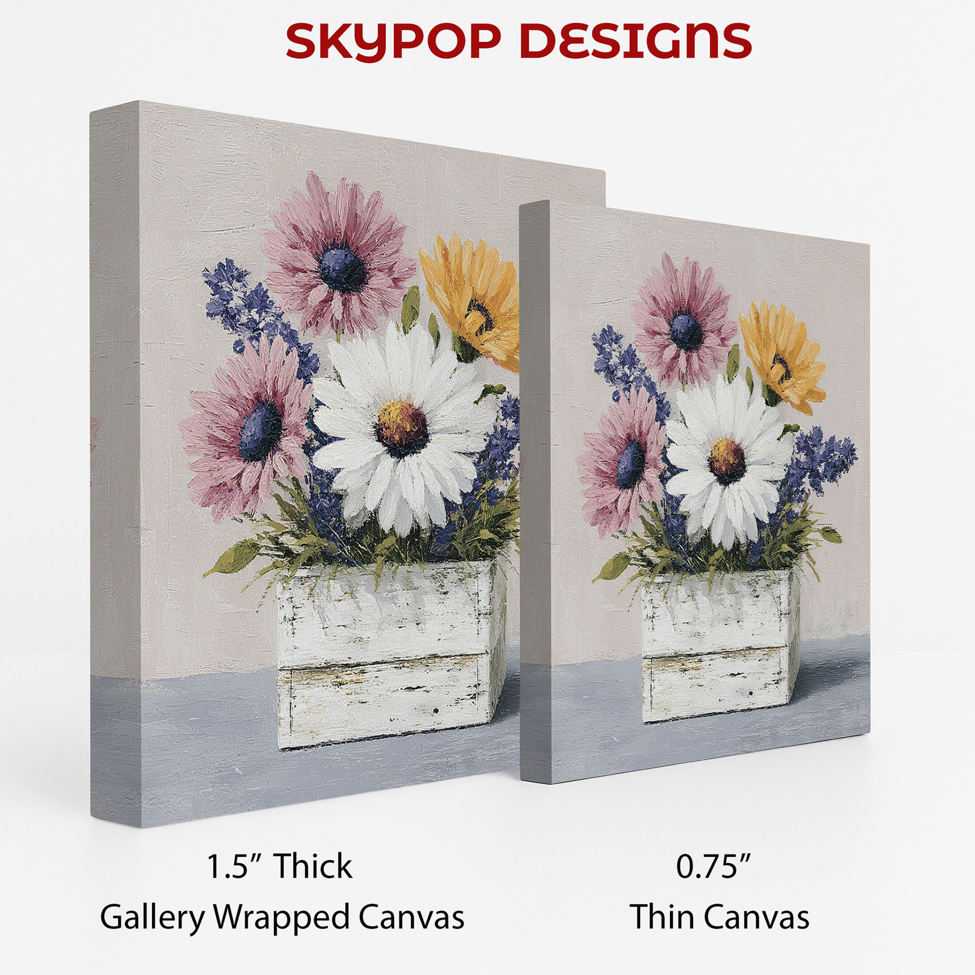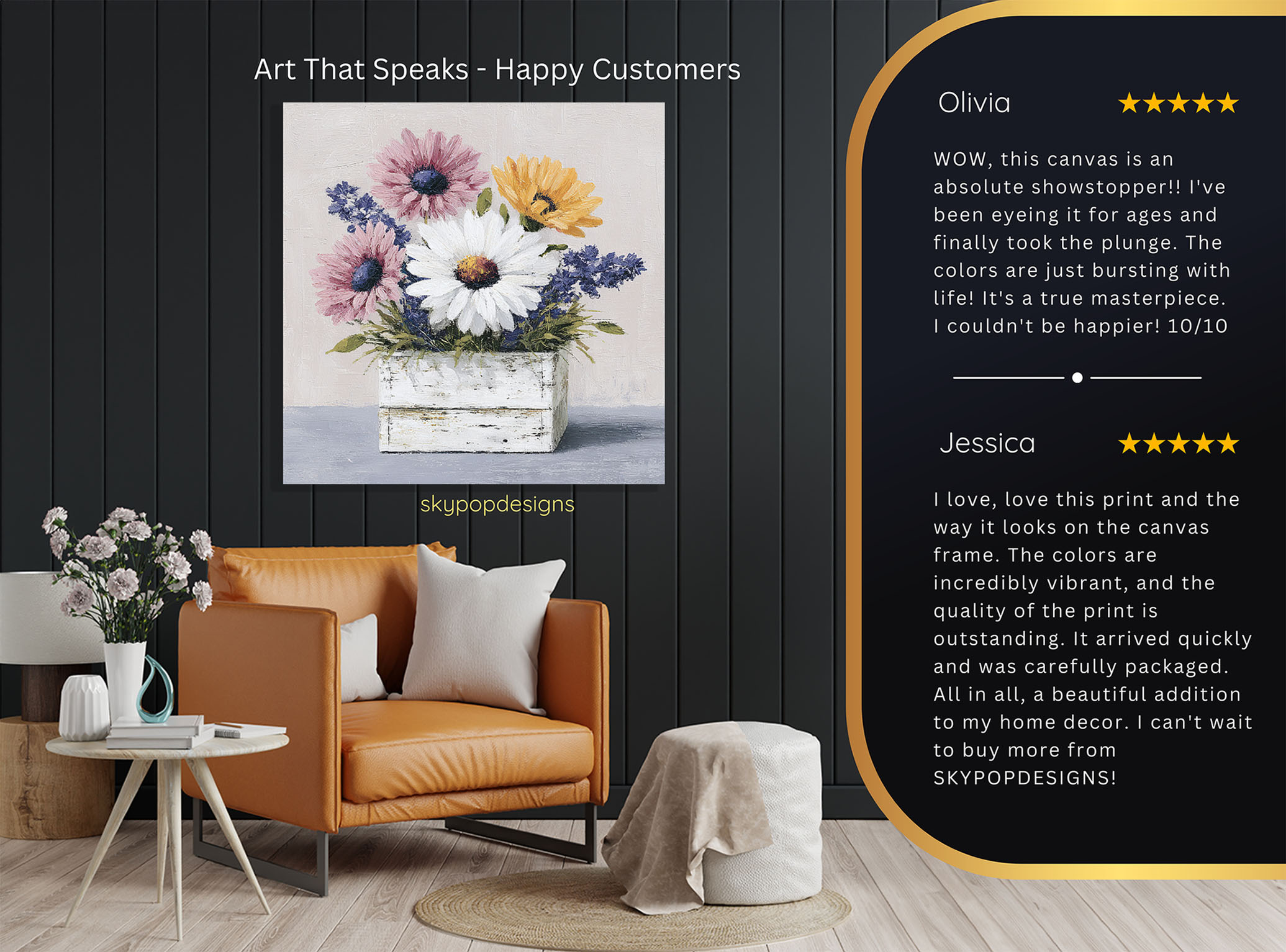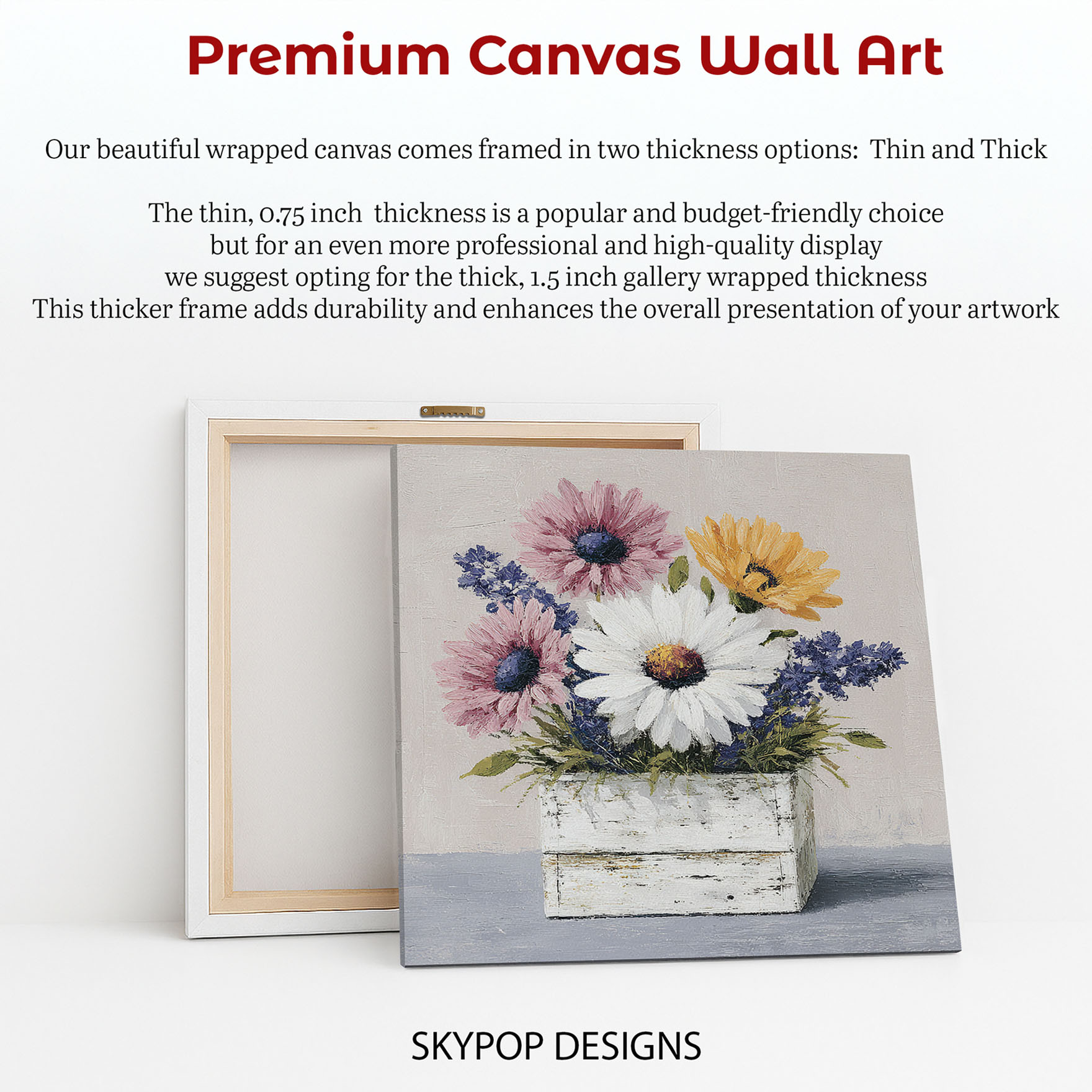 Brighten your home with this charming daisy canvas wall art, showcasing a vibrant bouquet of flowers in a rustic wooden crate. This stunning poster or canvas wall art is perfect for enhancing farmhouse decor or adding a touch of shabby chic charm to your living room walls. The multicolor palette, featuring soft pinks, sunny yellows, and crisp whites, creates a joyful and inviting atmosphere, while the purple lavender accents add depth and contrast. Ideal for creating a serene bedroom sanctuary or a welcoming entryway, this floral artwork brings the beauty of nature indoors. The impressionistic style captures the texture and movement of the petals, making each bloom feel alive, a perfect piece for adding natural beauty to your wall decor. This versatile canvas wall art is excellent for adding a fresh, organic feel to any space, transforming it into a cozy haven. High-quality printing ensures the rich textures and vivid colors of this floral poster are beautifully preserved for lasting enjoyment. It makes a thoughtful housewarming gift or a lovely addition to any home decor collection, celebrating the simple elegance of a countryside garden. Elevate your home’s aesthetic with this captivating daisy canvas art that inspires serenity and brings a touch of timeless beauty. Add this unique floral wall art to your collection today and experience the uplifting power of nature’s artistry. This impressive canvas print is designed to capture the heart and soul of farmhouse living.