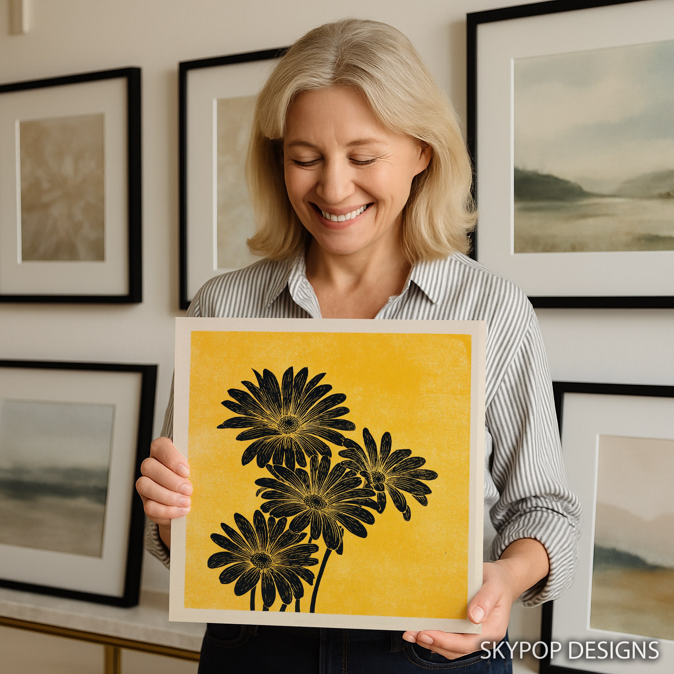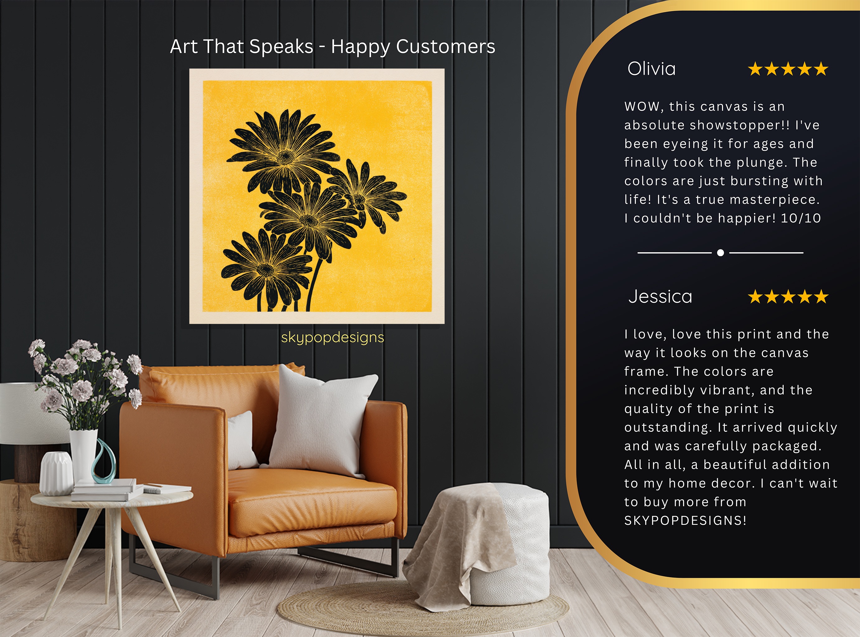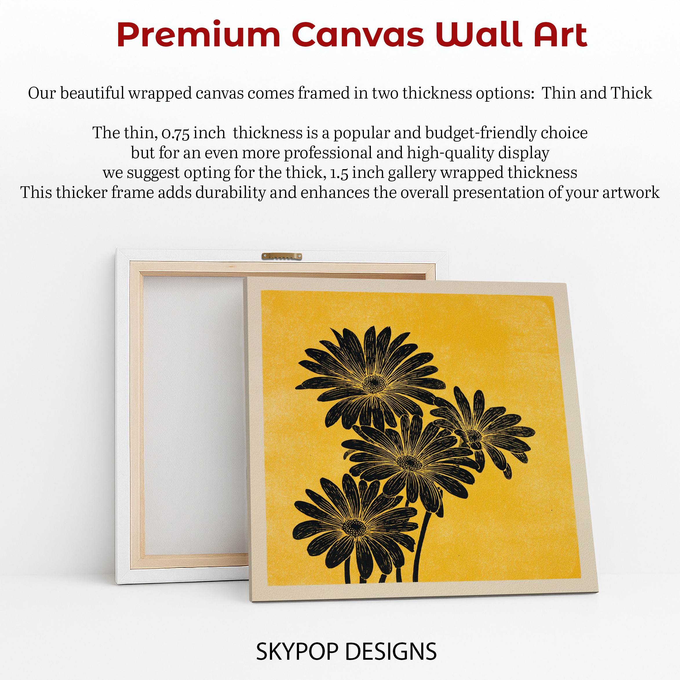 Elevate your space with this striking daisy silhouette canvas wall art, featuring bold black flowers against a vibrant yellow background. This eye-catching poster transforms any room with its contemporary take on classic floral themes. Perfect for modern living rooms or minimalist bedroom decor, the high-contrast design creates a powerful visual impact that instantly draws the eye. The stylized daisies evoke a sense of natural beauty and simplicity, while the golden yellow backdrop radiates warmth and positivity throughout your space. Ideal for those seeking to add a touch of nature-inspired elegance to their home or office, this versatile canvas art complements a wide range of interior styles. The clean lines and graphic quality of the image make it a standout piece in contemporary dining rooms or as a focal point in professional settings. Available in various sizes, this daisy wall art adapts seamlessly to different wall spaces, allowing you to create a personalized gallery wall or make a bold statement with a single large print. The timeless appeal of black and yellow ensures this artwork remains stylish for years to come. Whether you’re refreshing your decor or searching for the perfect housewarming gift, this daisy silhouette poster offers a modern twist on floral art that’s sure to impress. Enhance your living space today with this captivating blend of nature and design.