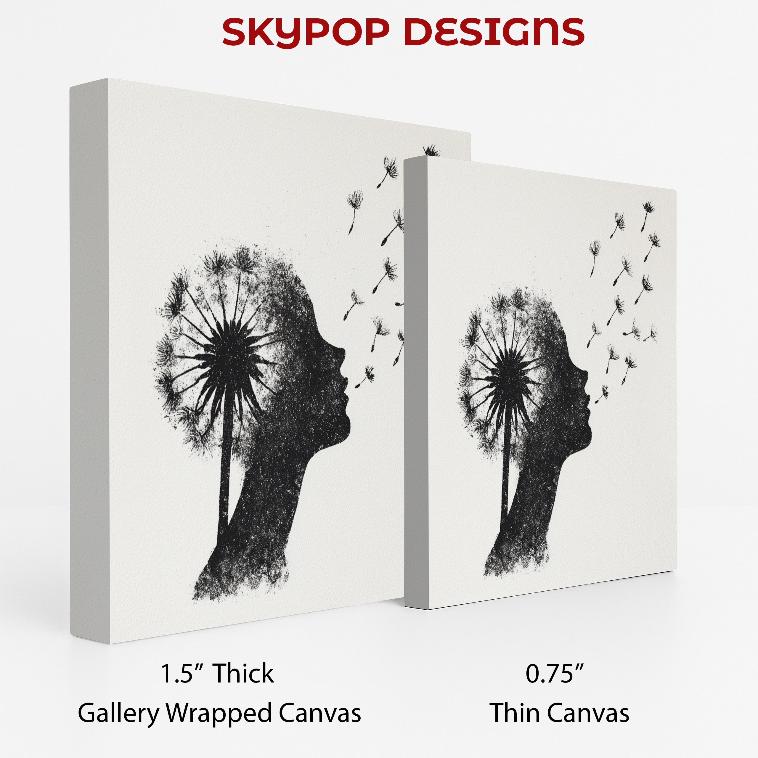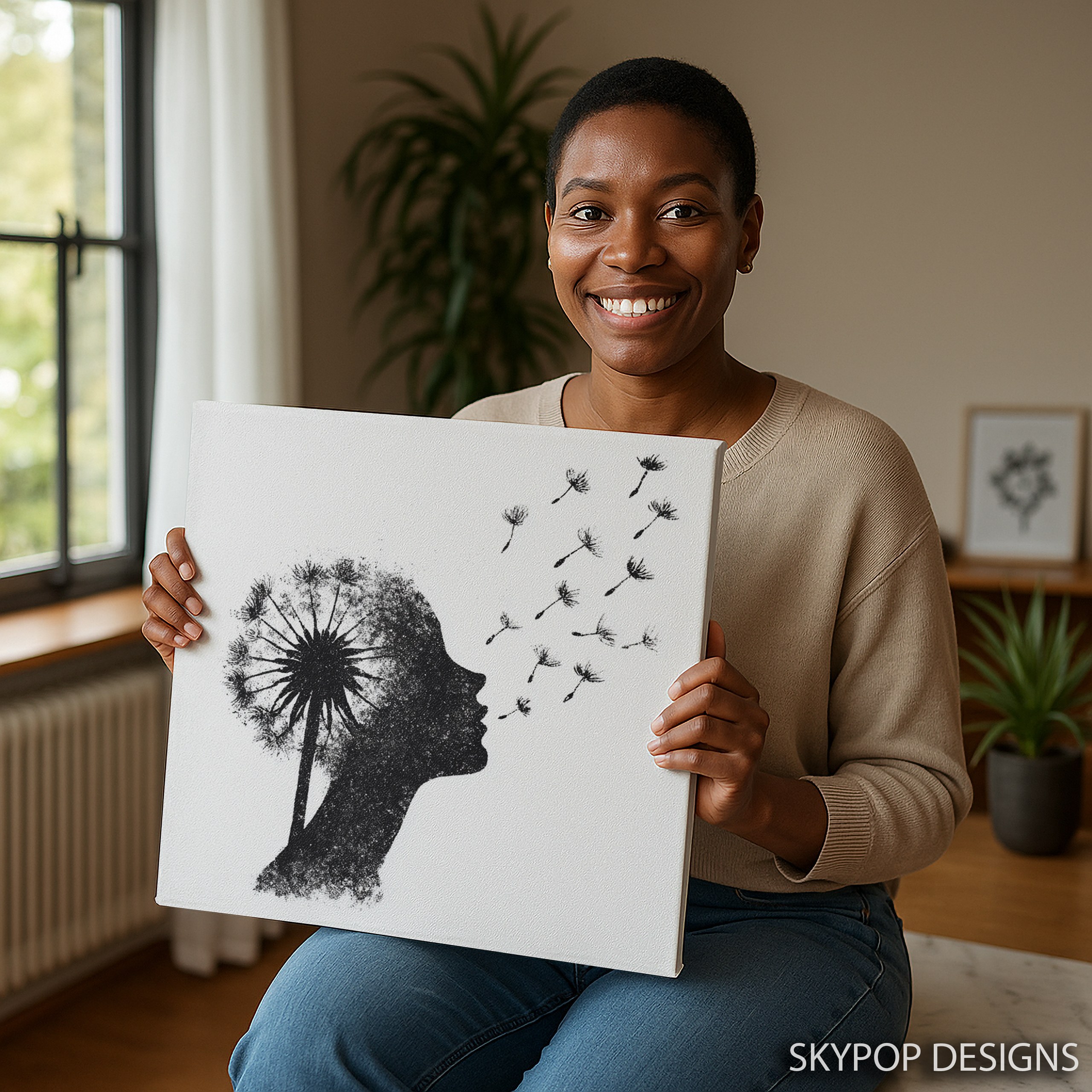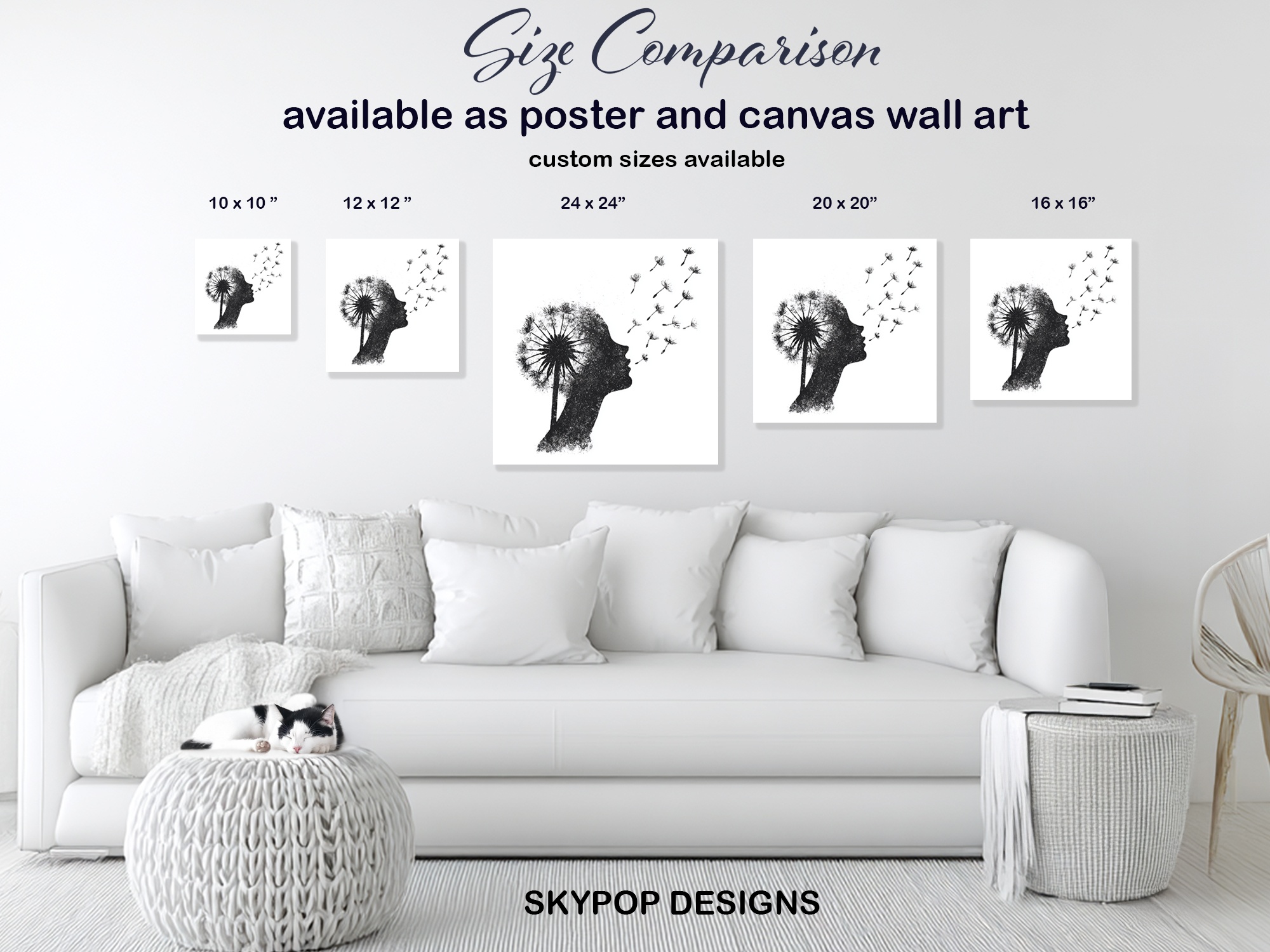 Transform your space with this striking dandelion silhouette canvas wall art, blending nature’s beauty with human form. This captivating poster features a profile silhouette seamlessly merging with a dandelion, its seeds scattering into the wind. Perfect for modern living rooms or minimalist bedrooms, this contemporary wall art adds depth and intrigue to any decor. The stark black and white contrast creates a bold visual impact, ideal for Scandinavian-inspired interiors or sleek office spaces. This versatile canvas art symbolizes freedom, growth, and transformation, making it a powerful addition to meditation rooms or personal spaces. The delicate dandelion seeds floating away evoke a sense of letting go and embracing new beginnings, inspiring viewers daily. Suitable for various room sizes, this poster adapts beautifully to different wall spaces, from cozy bathrooms to expansive living areas. The clean lines and minimalist design make this piece a standout in contemporary homes, while its natural elements add warmth to modern decor. Whether as a focal point or part of a gallery wall, this dandelion silhouette art sparks conversation and contemplation. Elevate your interior design with this thought-provoking blend of human and nature imagery, perfect for those seeking unique and meaningful wall decor. Add this stunning canvas wall art to your collection and transform your living space today.
