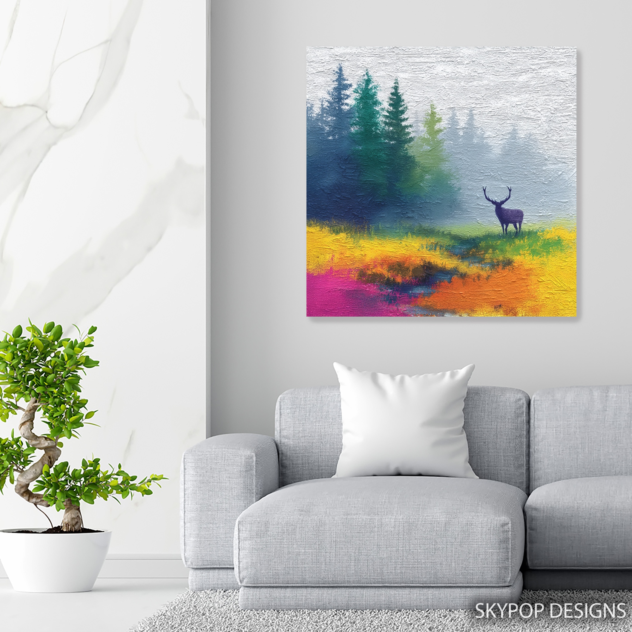 Deer Art, Canvas or Poster, Nature Modern Rustic Decor, Living Room Bedroom Office Wall Art, Blue Green Yellow Purple, Colorful Forest Decor