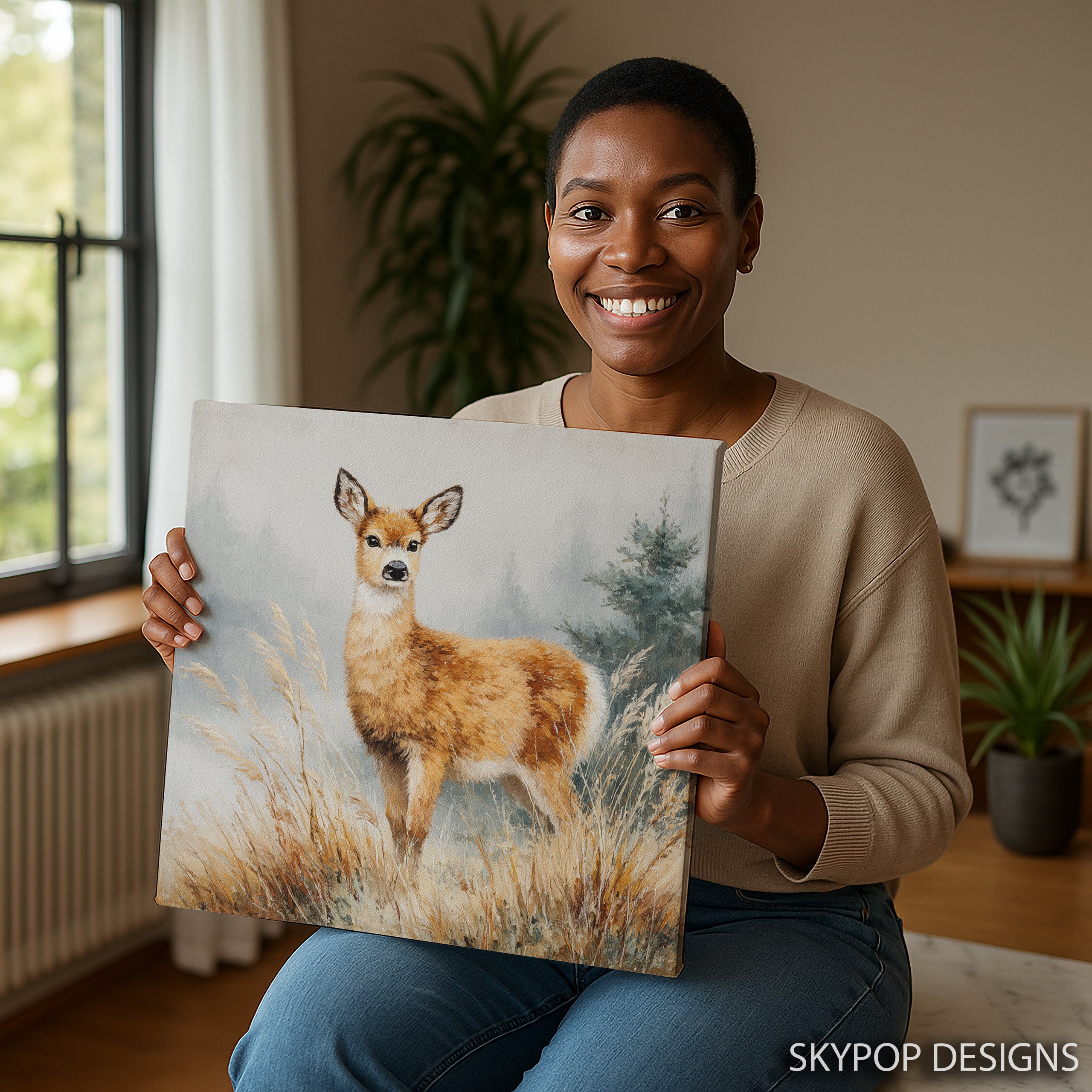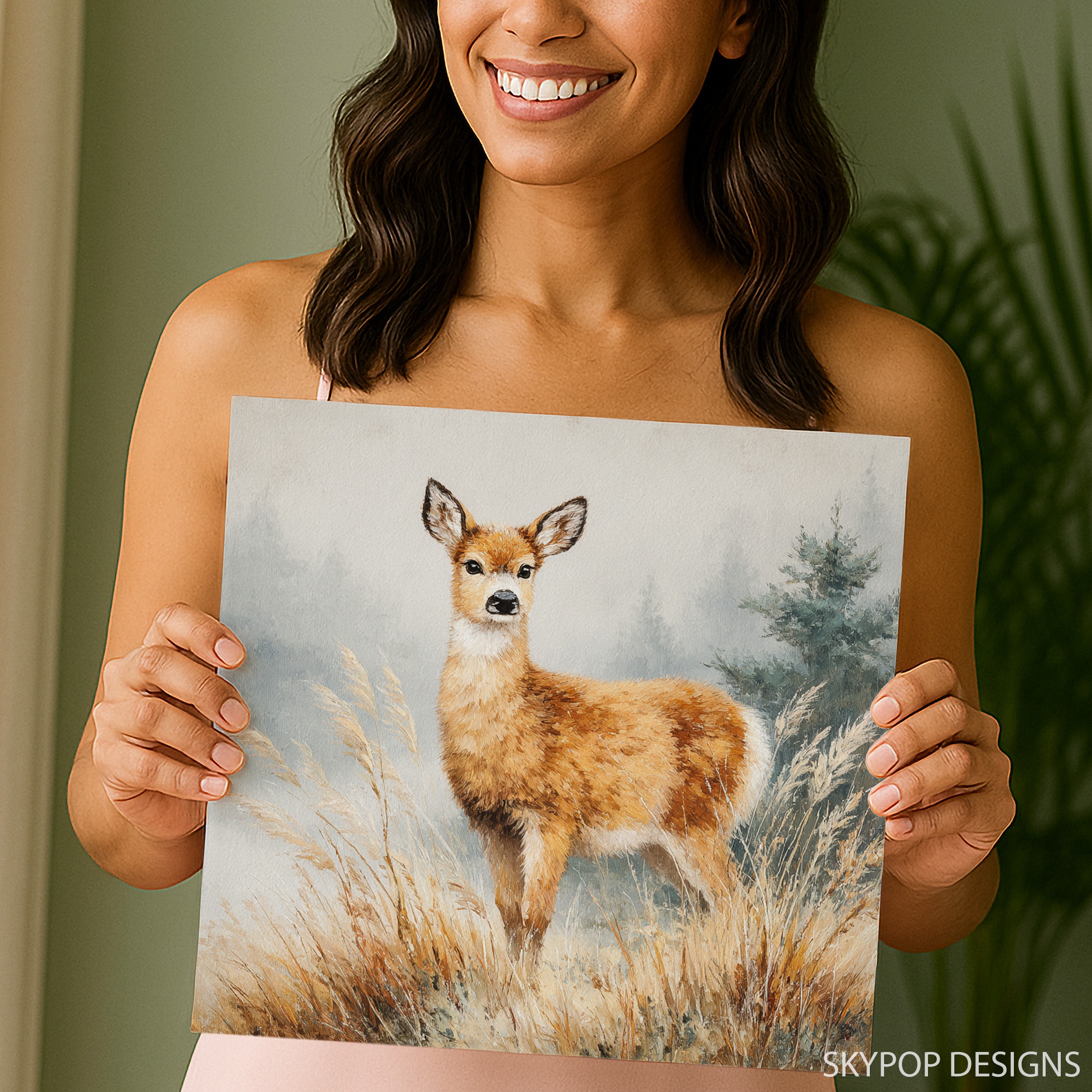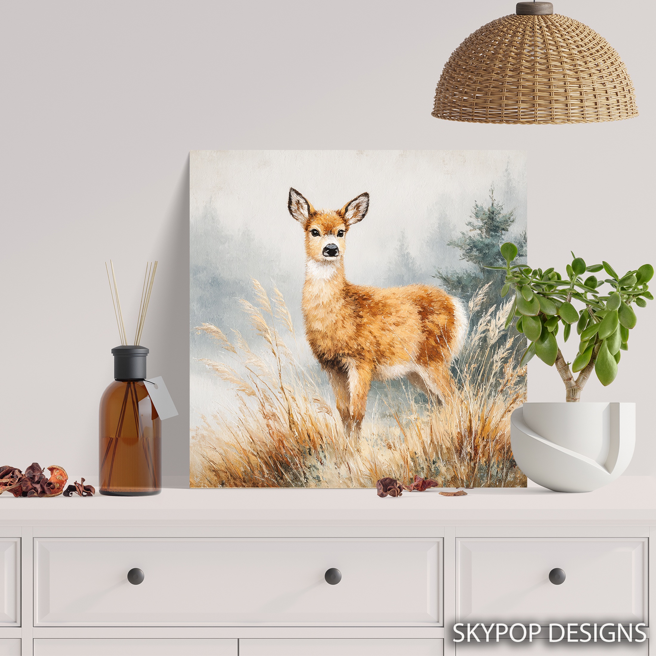 Bring the serene beauty of nature into your home with this stunning deer canvas wall art. This captivating piece showcases a young deer standing alert in a misty forest, perfectly capturing the essence of wildlife in its natural habitat. The soft, muted color palette of browns, whites, and greens creates a calming atmosphere that effortlessly complements both rustic and modern decor styles. Ideal for nature lovers and those seeking to add a touch of the outdoors to their living spaces, this poster or canvas print is versatile enough to enhance any room. The deer’s alert posture and gentle expression draw the viewer in, making it a perfect focal point for your living room, bedroom, or office. The detailed brushwork brings the forest scene to life, from the delicate grasses in the foreground to the misty evergreens in the background. This wall art is not just a decoration, but a window into the tranquil world of woodland creatures. Whether you’re looking to create a cozy farmhouse feel or add a contemporary nature-inspired element to your space, this deer artwork delivers. It’s an excellent choice for a housewarming gift or to refresh your own decor. The high-quality printing ensures every detail is crisp and vibrant, allowing you to enjoy the artwork’s beauty for years to come. Transform your space today with this enchanting deer forest canvas and bring a piece of the wild into your daily life.