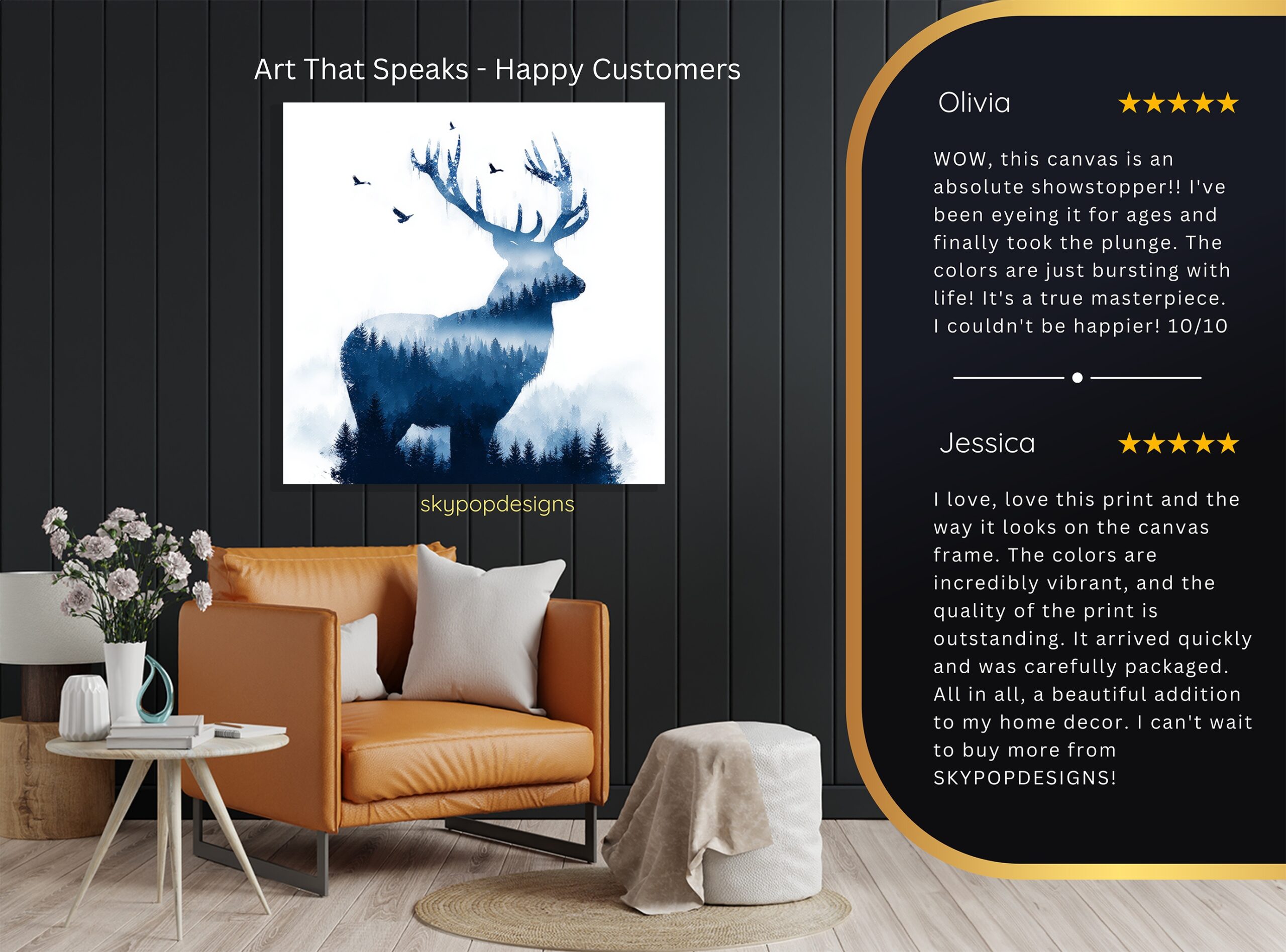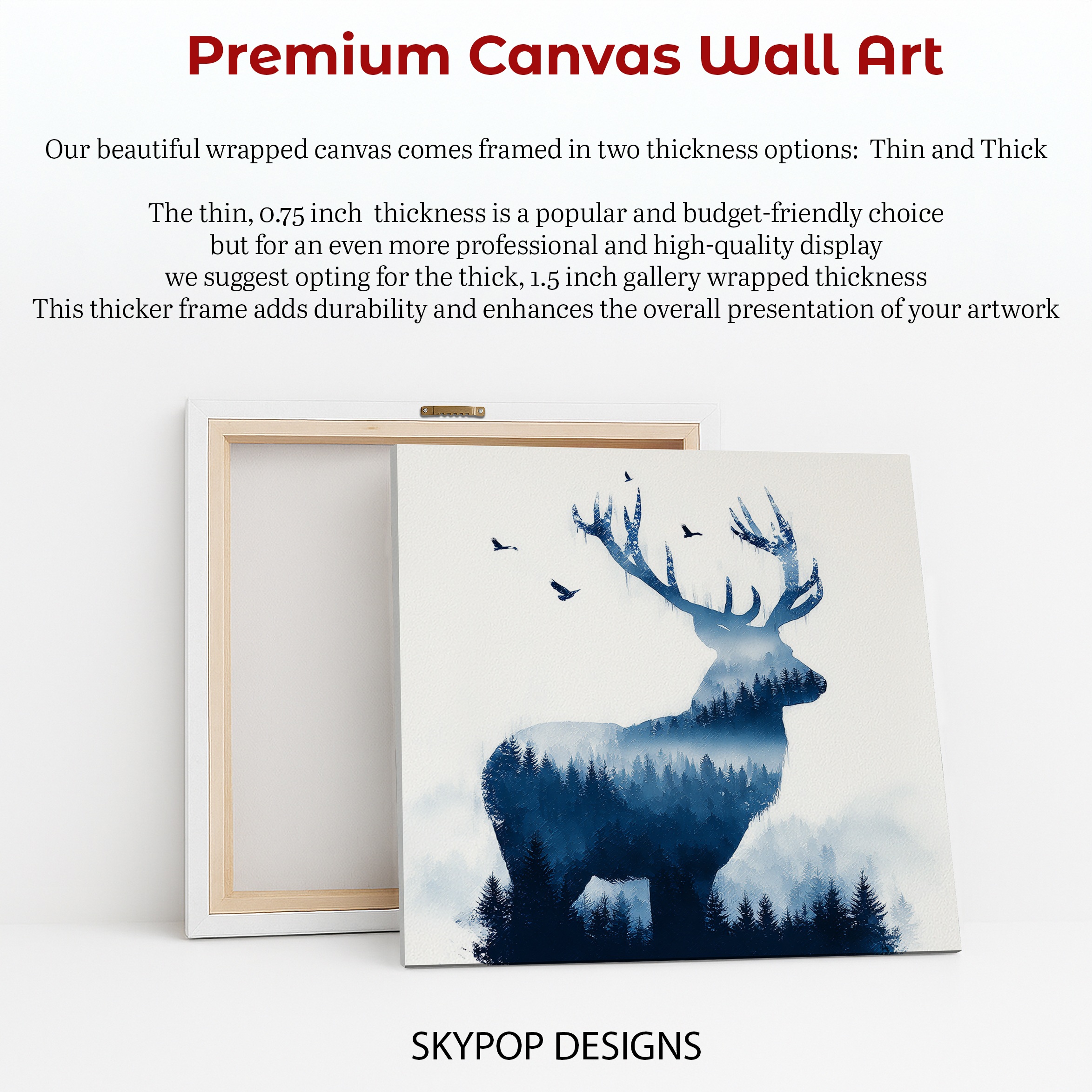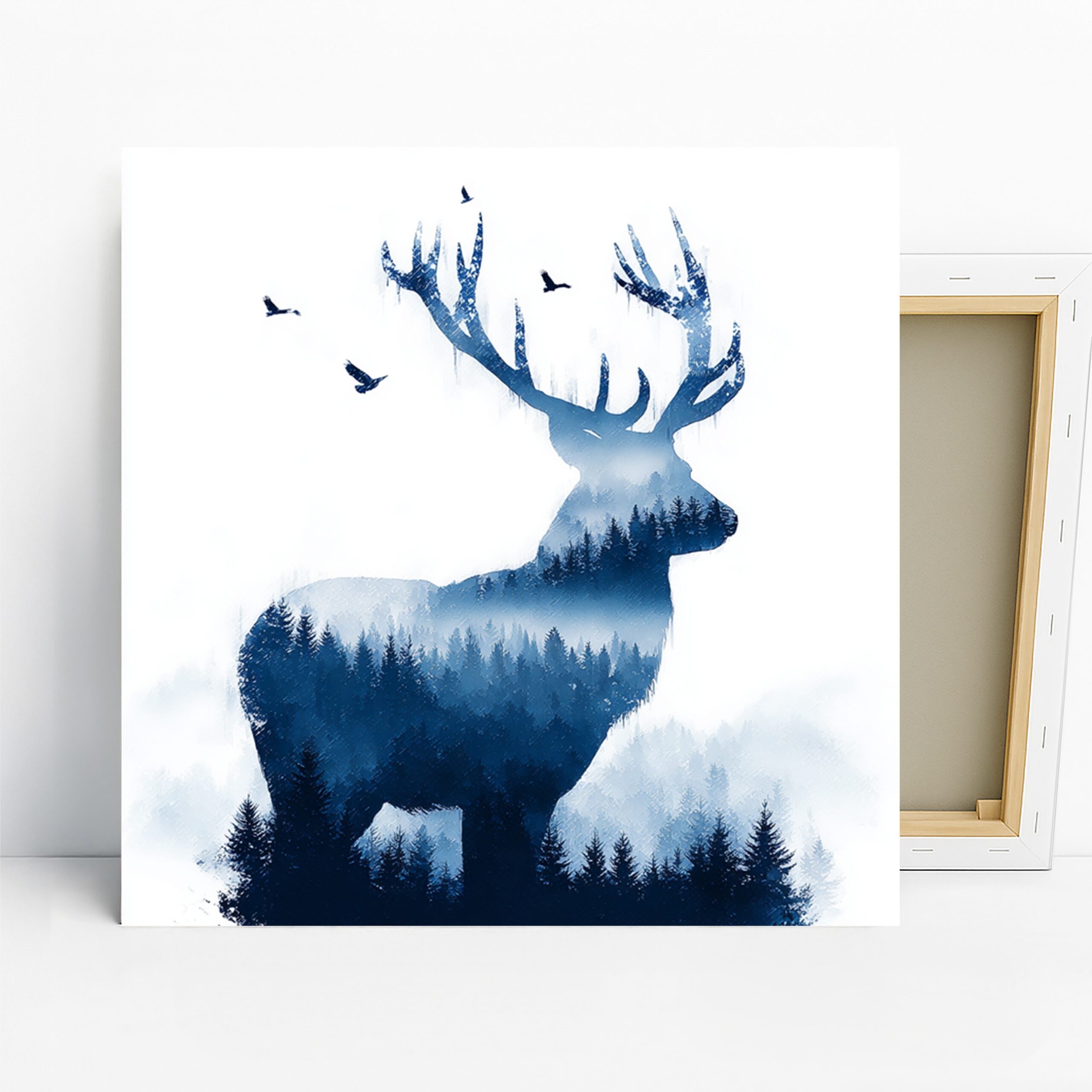 Bring the serene beauty of nature into your home with this striking deer forest silhouette canvas wall art. This captivating piece transforms any space with its ethereal blue tones and intricate forest scene cleverly blended within the majestic outline of a deer. Perfect for nature lovers and contemporary decor enthusiasts alike, this poster or canvas print adds a touch of wilderness to your living room, bedroom, or office. The misty forest backdrop creates a sense of depth and mystery, while flying birds add movement and life to the composition. Ideal for rustic cabins or modern apartments, this versatile wall art complements a wide range of interior styles. The cool blue color palette evokes a calm, tranquil atmosphere, making it an excellent choice for spaces where you want to unwind and relax. This eye-catching piece works beautifully as a focal point in minimalist decor or as part of a nature-inspired gallery wall. High-quality printing ensures every detail of the foggy forest and delicate antlers is captured with stunning clarity. Whether you’re looking for a statement piece for your dining room or a thoughtful housewarming gift, this deer silhouette art delivers both style and serenity. Elevate your home’s ambiance with this unique blend of wildlife and landscape art that celebrates the magic of the great outdoors. Transform your space today with this enchanting deer forest canvas wall art.