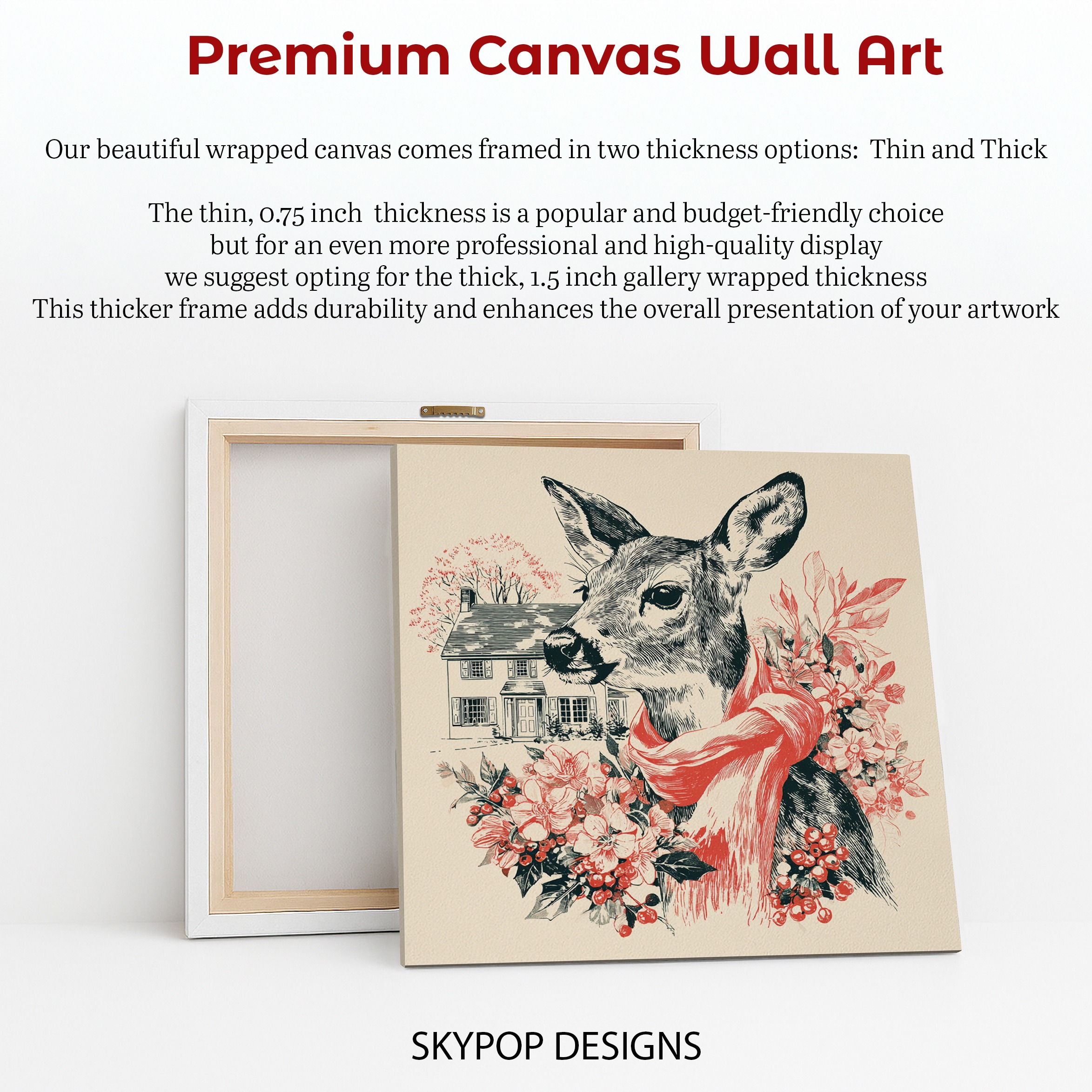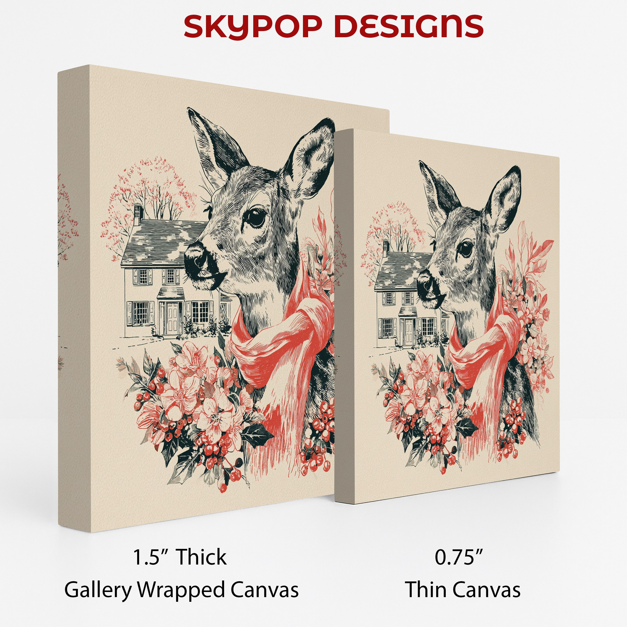 Elevate your home decor with this charming deer canvas wall art, featuring a detailed illustration of a doe wearing a vibrant red scarf. This stunning poster combines vintage-inspired linework with pops of festive color, creating a captivating focal point for any room. Perfect for rustic farmhouse interiors or contemporary spaces seeking a touch of nature, this versatile piece works beautifully in living rooms, bedrooms, entryways, or dining areas. The intricate black and white deer illustration showcases the animal’s gentle features and alert expression, while the bold red scarf adds a warm, inviting accent. Surrounding the deer are delicate floral elements and a quaint house in the background, evoking a cozy, nostalgic atmosphere. This canvas wall art is ideal for those who love to bring the outdoors inside, celebrating the beauty of wildlife in a stylish, artistic manner. The carefully chosen color palette of black, red, white, and green ensures this piece complements a wide range of decor styles and color schemes. Whether you’re looking to refresh your seasonal decor or searching for a unique housewarming gift, this deer artwork offers timeless appeal and conversation-starting charm. Transform your space today with this enchanting blend of nature-inspired art and vintage aesthetics, and create a warm, inviting atmosphere that welcomes both family and guests alike.