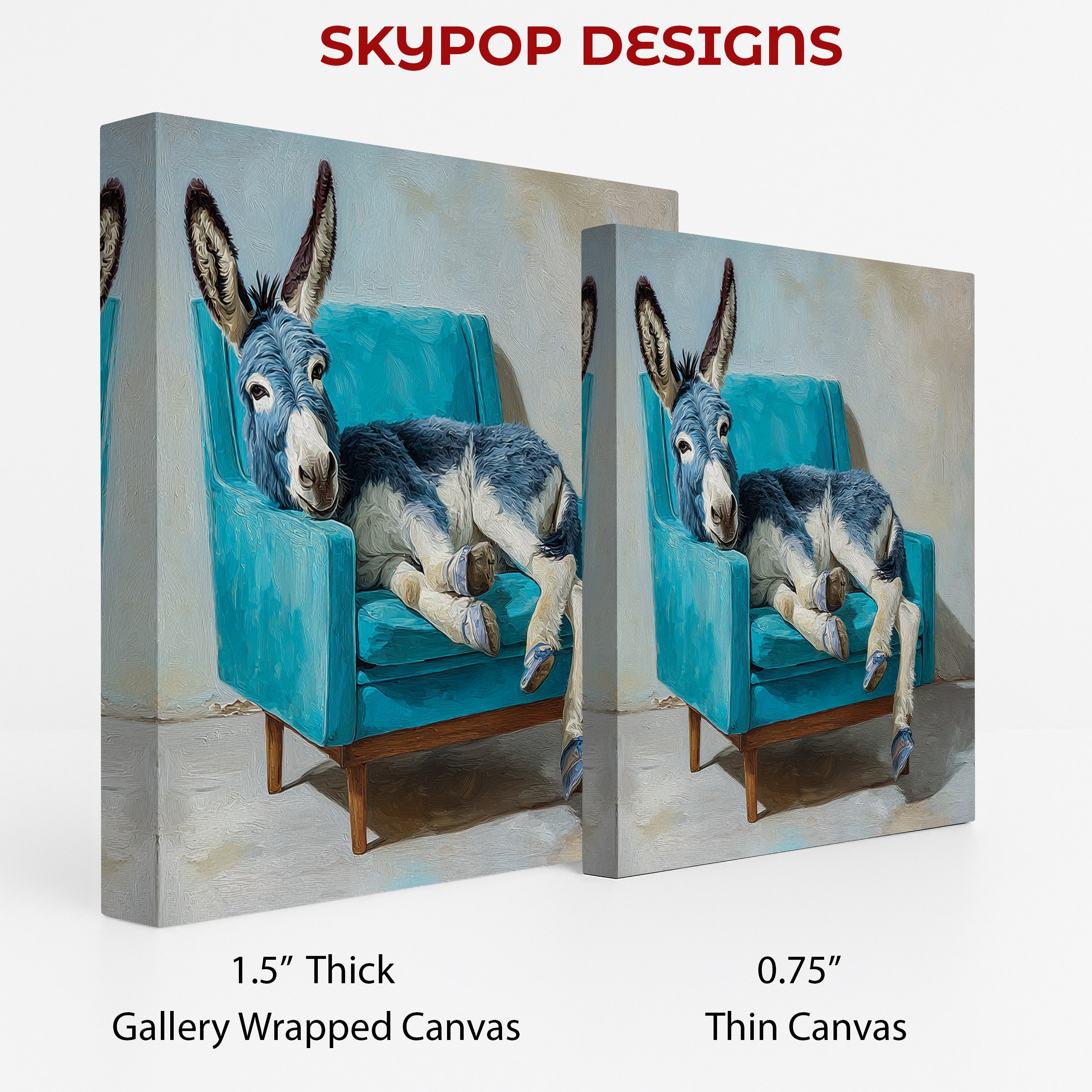 Add a touch of whimsy to your space with this charming donkey canvas wall art. This unique poster features a blue-gray donkey lounging comfortably in a vibrant turquoise armchair, creating an unexpected and delightful scene. Perfect for modern living rooms or farmhouse-style bedrooms, this eye-catching piece brings a smile to any viewer. The striking contrast between the rustic animal and the sleek, mid-century modern chair creates visual interest and sparks conversation. Ideal for animal lovers or those seeking to add a touch of humor to their decor, this canvas art effortlessly blends contemporary style with a countryside feel. The soft, muted colors of the donkey’s fur complement the bold turquoise of the chair, making it versatile enough to fit various color schemes. Whether displayed in a cozy office nook or as a statement piece in a children’s room, this artwork adds character and warmth to any space. The high-quality printing captures every brushstroke, giving the piece a painted feel that adds depth and texture. Great as a housewarming gift or to refresh your own space, this donkey wall art is sure to become a beloved focal point. Transform your room with this playful blend of animal art and modern design that celebrates the unexpected in everyday life.