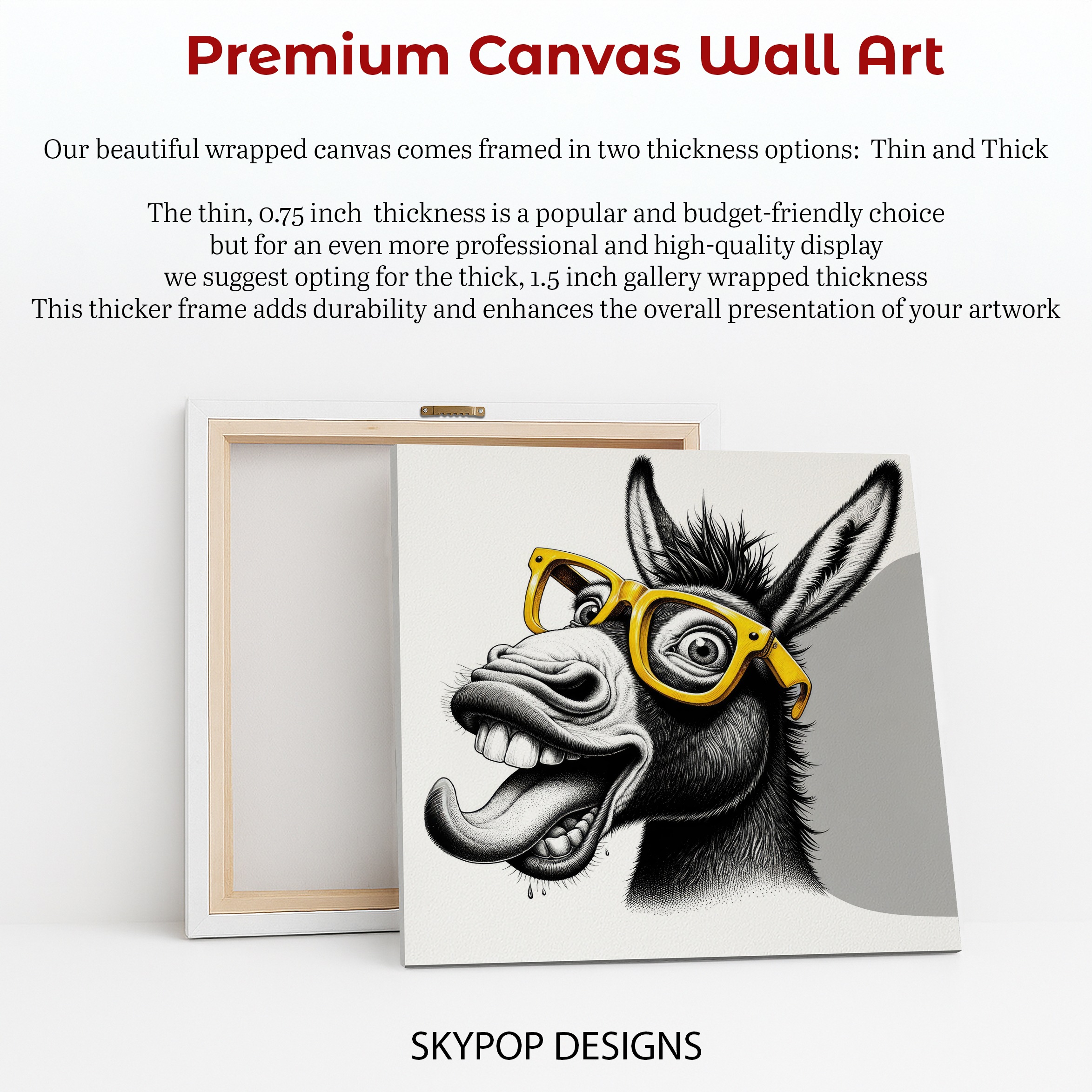 Add a splash of personality to your walls with this hilarious donkey canvas wall art. Featuring a donkey rocking bright yellow glasses and sticking its tongue out, this piece is a guaranteed conversation starter. The striking black and white illustration, combined with vibrant yellow accents, makes this poster or canvas wall art a standout addition to any modern or bohemian-inspired space. Its playful nature is perfect for transforming a living room, game room, or office into a fun and engaging environment. This eye-catching artwork also makes an ideal gift for anyone who loves a good laugh or appreciates unique animal art. The bold graphic style elevates this piece beyond just a poster, making it a striking canvas wall art that adds character and humor. Its versatility makes it suitable for a child’s room or a playful accent in a more contemporary setting. Embrace the joyous energy this artwork brings, turning any blank wall into a focal point. Discover how this donkey poster can inspire smiles and brighten your day with its captivating design. Transform your space with this uniquely humorous take on animal art, perfect for those who dare to be different. Celebrate individuality and fun with this exceptional wall art.