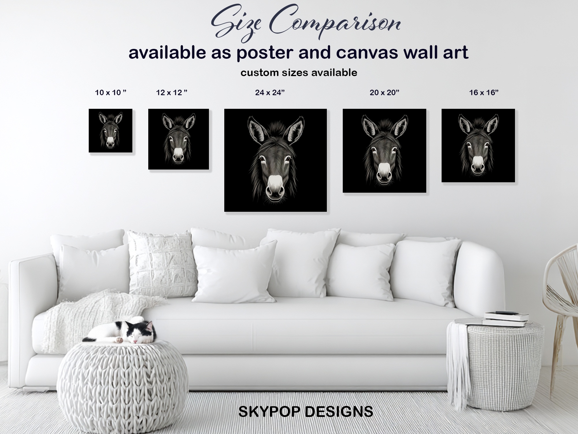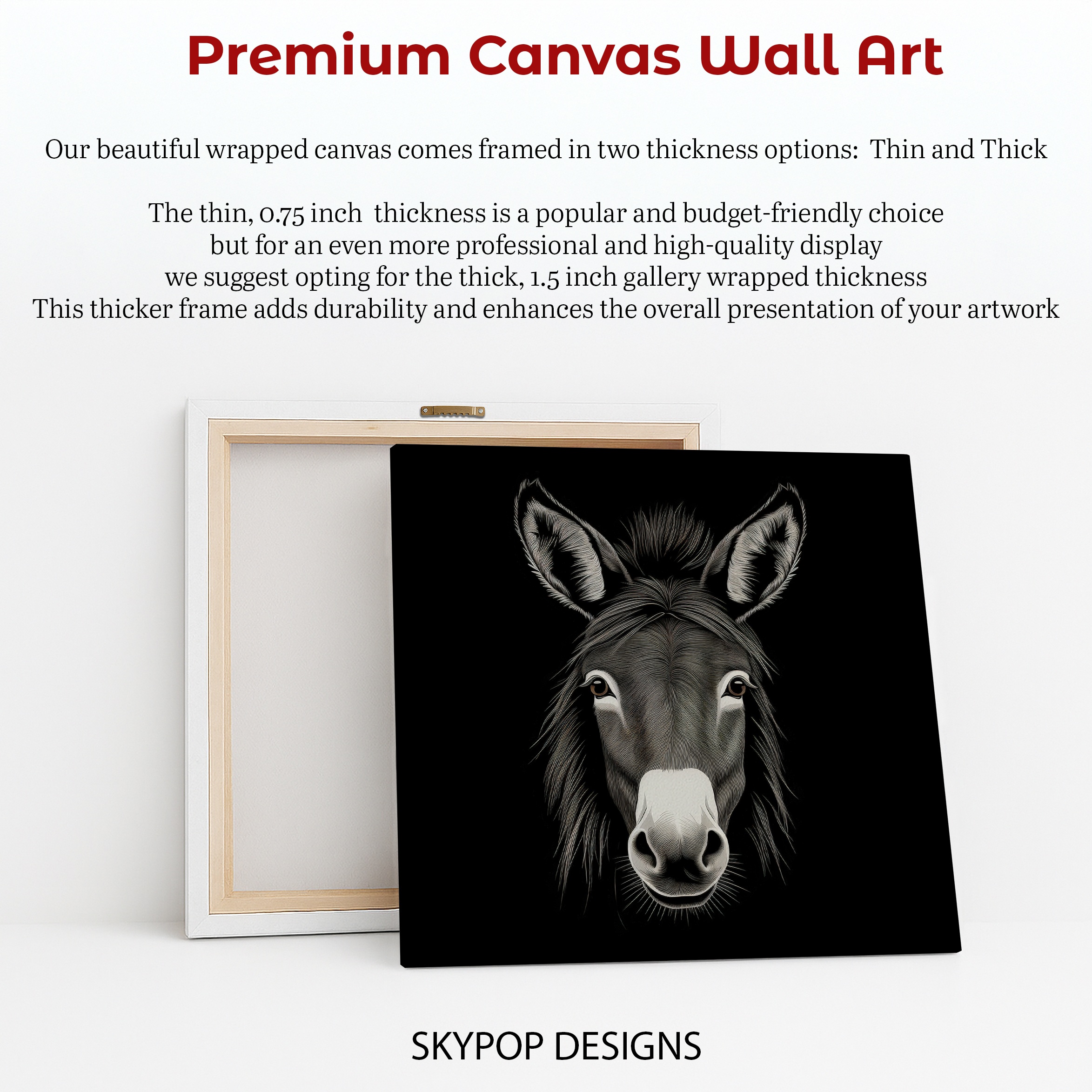 Keywords: Donkey wall art, Animal canvas print, Rustic home decor, Farmhouse art, Vintage donkey portrait, Black and white art, Monochromatic wall decor, Living room art, Entryway art, Bedroom wall art, Kitchen decor, Nature inspired art, Farm animal print, Traditional decor, Countryside wall art, Donkey poster, Animal lover gift, Housewarming gift, Birthday gift, Unique wall art, High quality art print, Timeless art, Elegant decor, Peaceful wall art, Simple decor, Conversation starter art, Donkey portrait, Animal artwork, Wall art for home, Interior design element