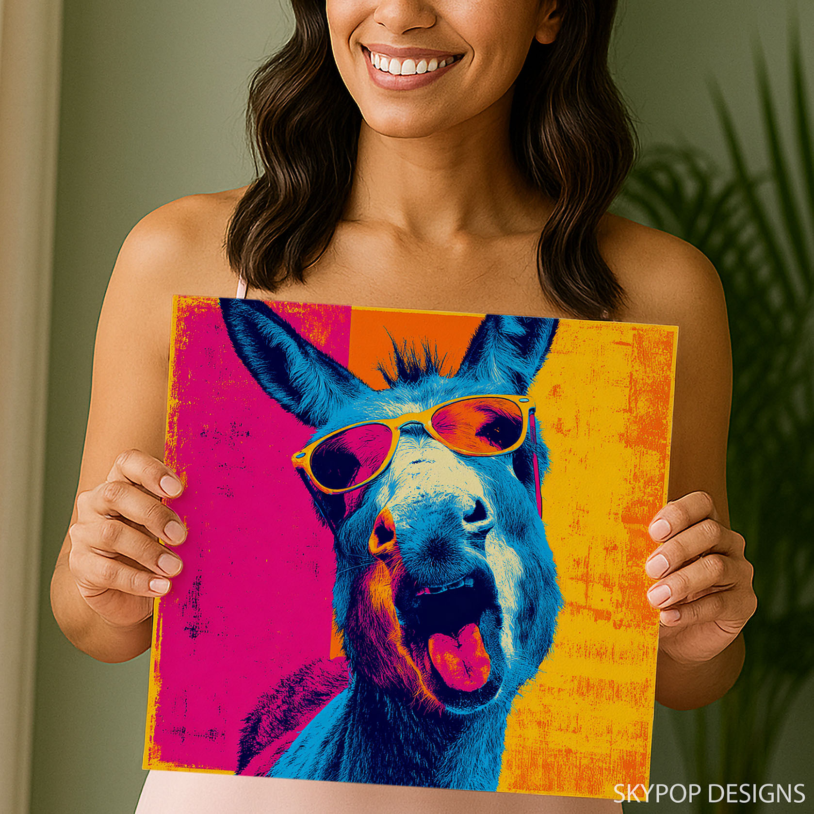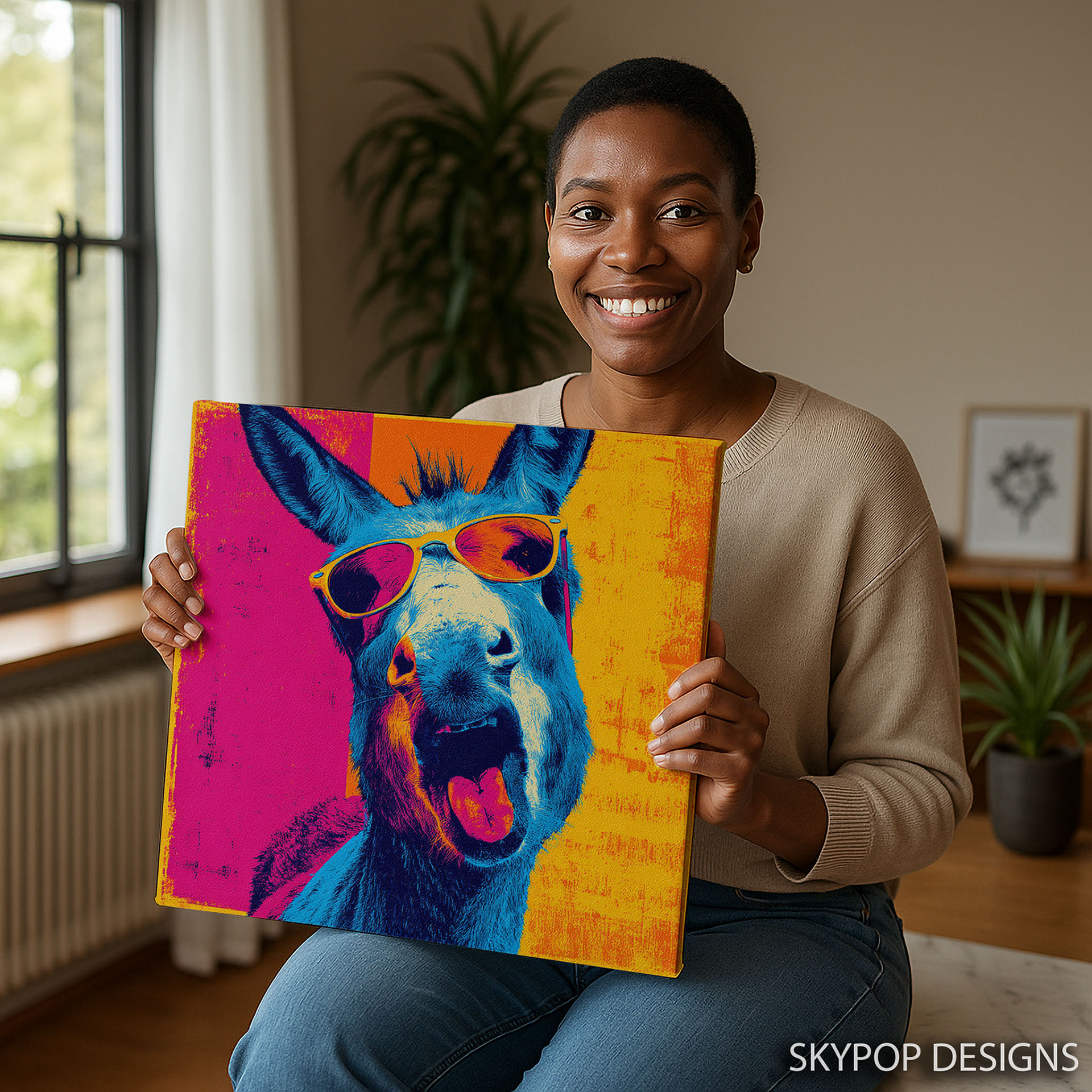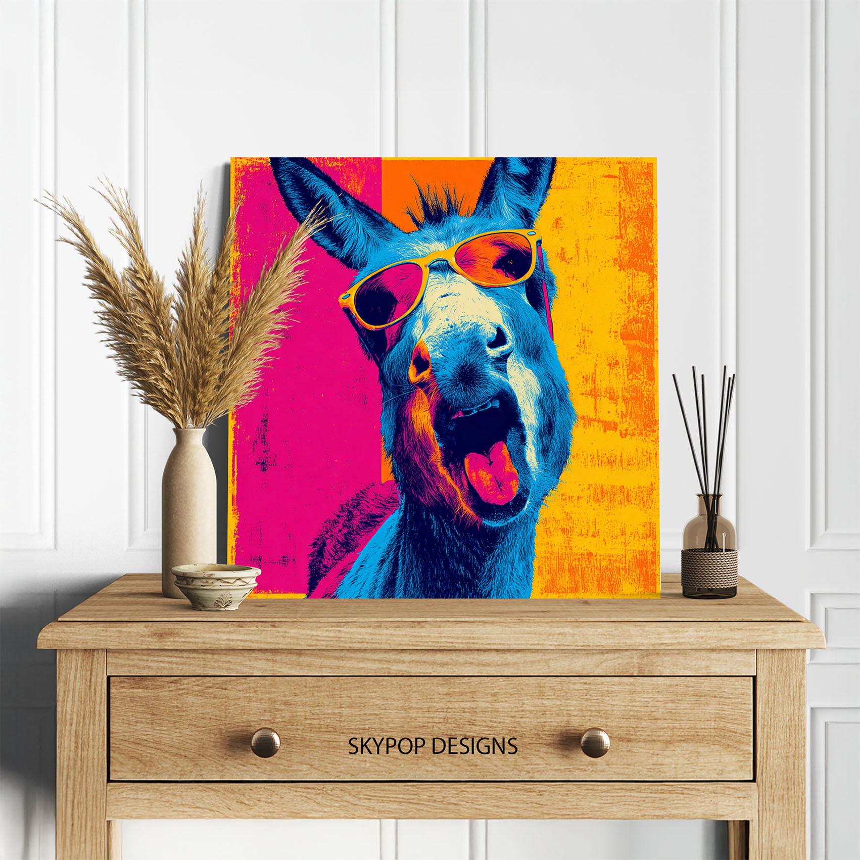 Bring home the party with this vibrant donkey canvas wall art, bursting with playful Pop Art energy. This unique poster or canvas wall art is perfect for transforming any space into a fun and lively environment. The striking multicolor palette featuring vibrant yellow, electric pink, and bold blue highlights the donkey’s cool swagger, making it an instant conversation starter. Ideal for modern living rooms or eclectic game room decor, this artwork adds a splash of personality and humor. The donkey, sporting stylish orange sunglasses, embodies a carefree spirit, making this piece a mood booster for any room. This eye-catching poster or canvas wall art is a fantastic addition to an office or entryway, welcoming guests with its bold character. High-quality printing ensures the saturated colors and textured effect pop, creating a captivating visual experience. Whether you’re looking for unique wall decor or a memorable gift for a birthday or housewarming, this donkey art delivers. Elevate your home with this high-energy piece that celebrates individuality and fun. This versatile canvas wall art is perfect inspiration for embracing your inner free spirit. Transform your space and add a touch of quirky charm to your decor today with this fun Donkey canvas art. This vibrant artwork is sure to bring smiles and laughter to all who see it.