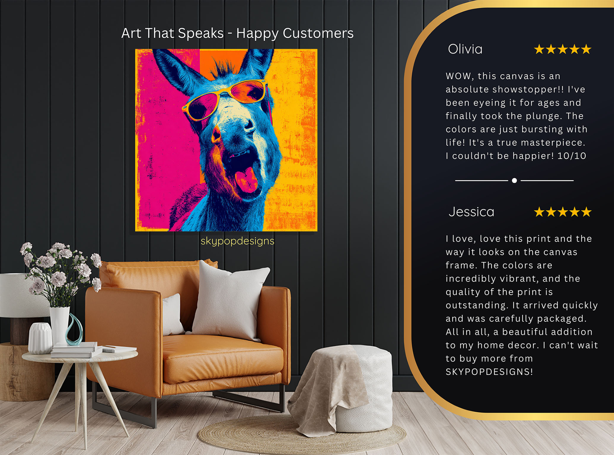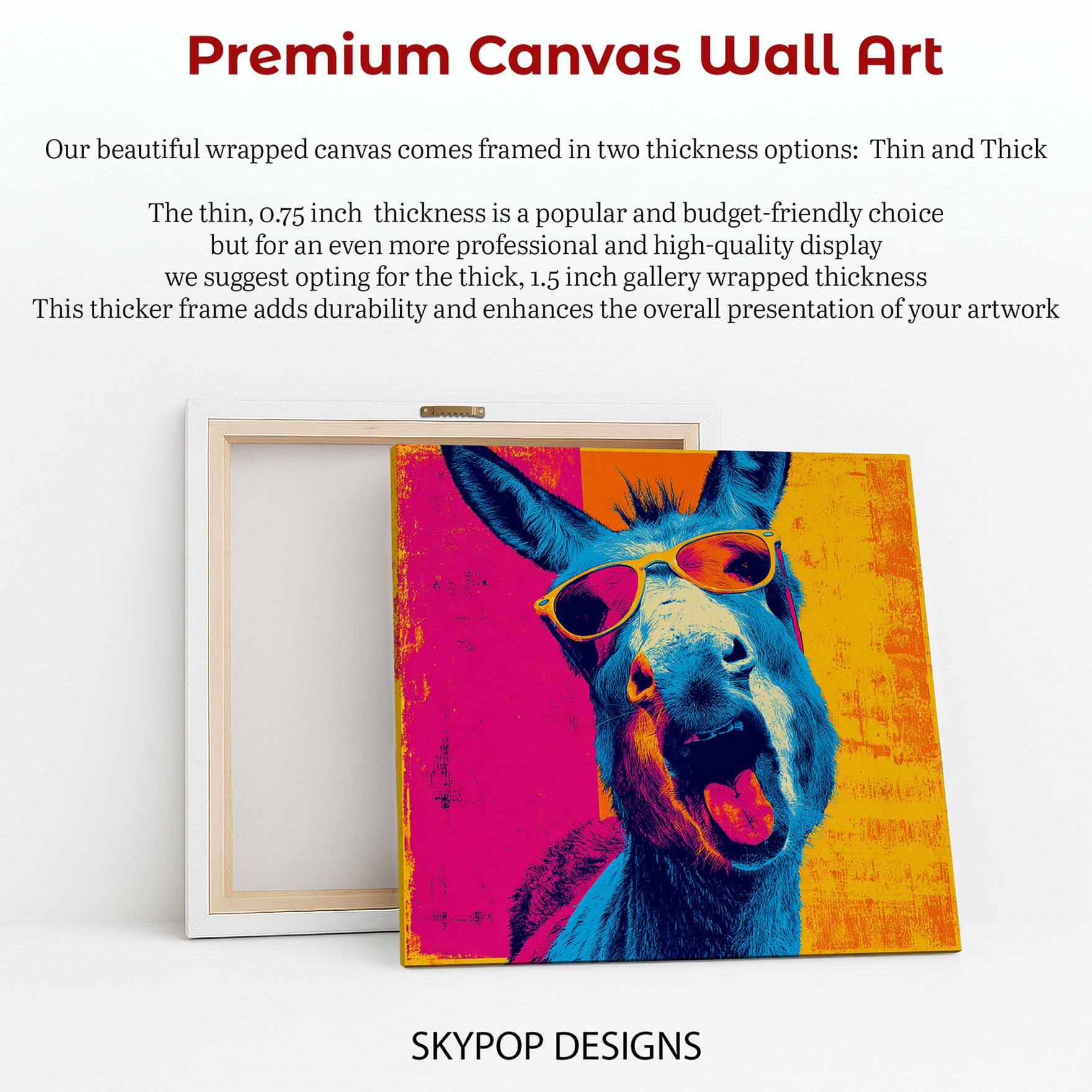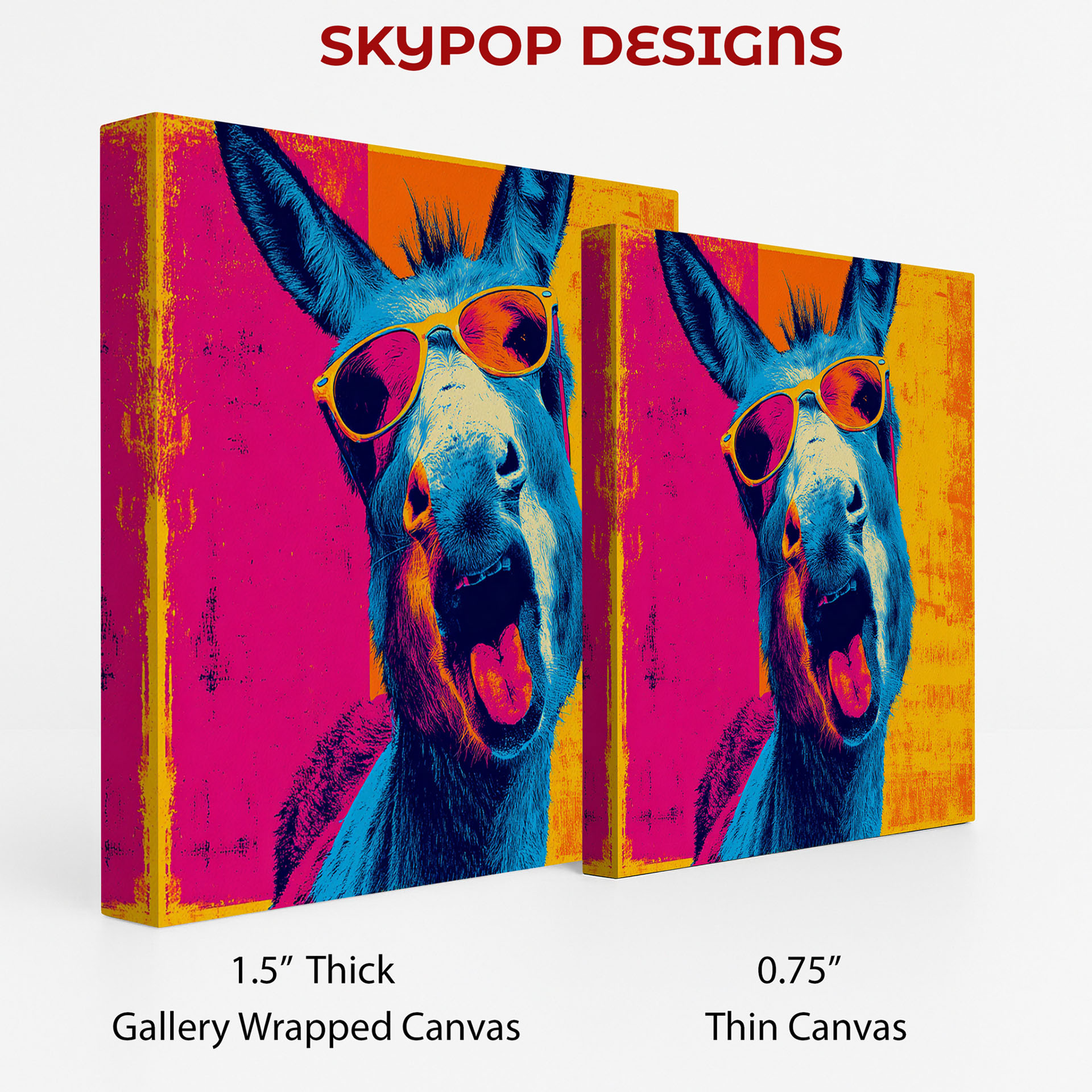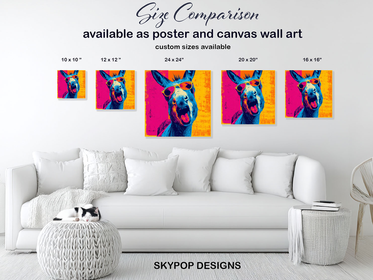 Bring home the party with this vibrant donkey canvas wall art, bursting with playful Pop Art energy. This unique poster or canvas wall art is perfect for transforming any space into a fun and lively environment. The striking multicolor palette featuring vibrant yellow, electric pink, and bold blue highlights the donkey’s cool swagger, making it an instant conversation starter. Ideal for modern living rooms or eclectic game room decor, this artwork adds a splash of personality and humor. The donkey, sporting stylish orange sunglasses, embodies a carefree spirit, making this piece a mood booster for any room. This eye-catching poster or canvas wall art is a fantastic addition to an office or entryway, welcoming guests with its bold character. High-quality printing ensures the saturated colors and textured effect pop, creating a captivating visual experience. Whether you’re looking for unique wall decor or a memorable gift for a birthday or housewarming, this donkey art delivers. Elevate your home with this high-energy piece that celebrates individuality and fun. This versatile canvas wall art is perfect inspiration for embracing your inner free spirit. Transform your space and add a touch of quirky charm to your decor today with this fun Donkey canvas art. This vibrant artwork is sure to bring smiles and laughter to all who see it.