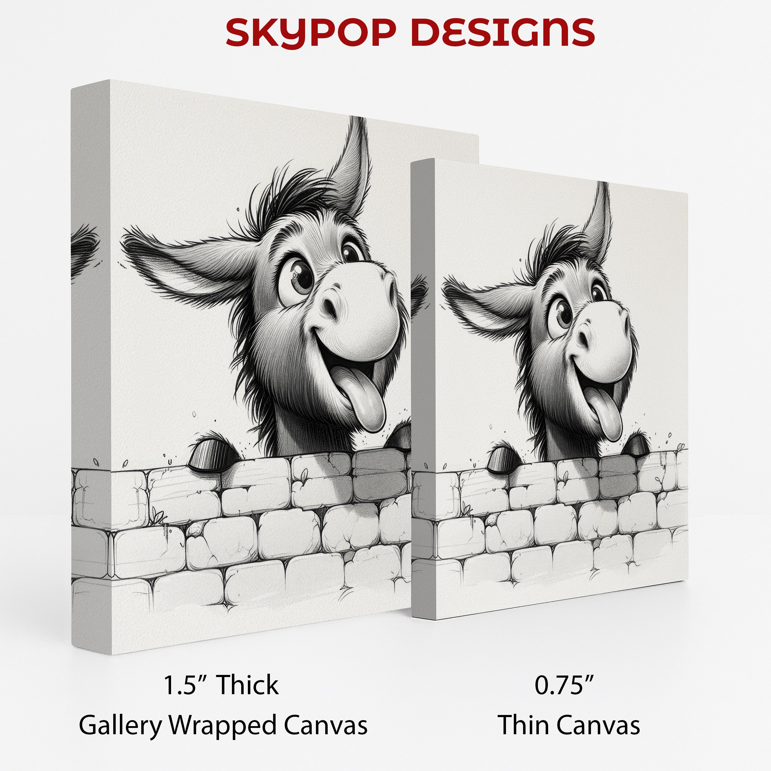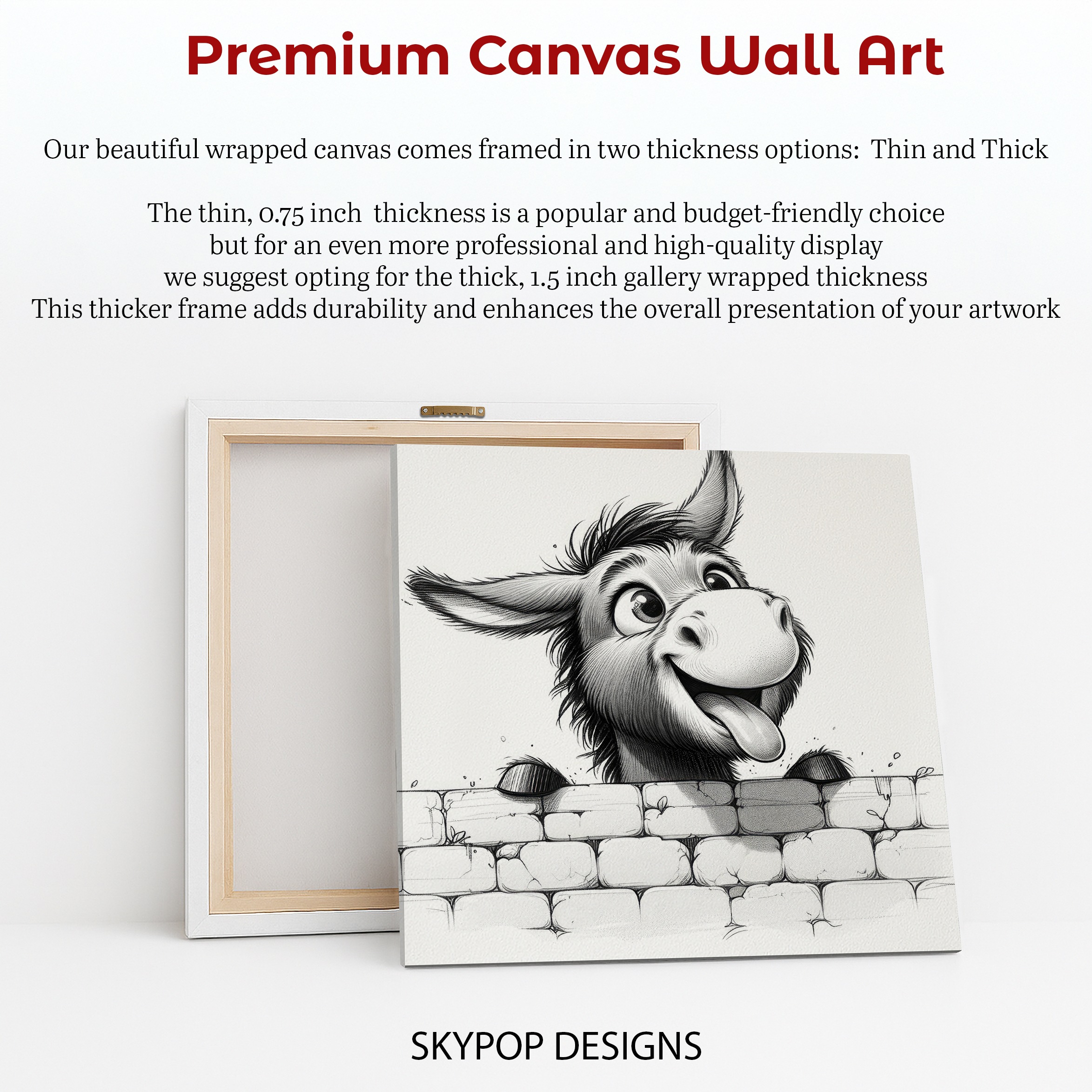 Bring a smile to your face with this playful donkey canvas wall art, featuring a charming donkey peeking over a brick wall. This delightful piece showcases whimsical animal art with a sketch-like feel, perfect for adding personality to any space. Transform your children’s room or living room with this eye-catching poster that adds a touch of rustic charm. The bold black and white sketch style creates a striking visual statement, making this canvas wall art a fantastic conversation starter. It’s ideal for bohemian or farmhouse decor, bringing warmth and character to your home’s aesthetic. This versatile piece can also brighten up a kitchen or entryway, welcoming guests with its cheerful expression. Whether you’re looking for unique wall decor or a fun housewarming gift, this donkey artwork delivers joy. The intricate linework and expressive eyes of the donkey capture a moment of pure delight, making it a captivating addition to your poster collection. Celebrate your love for animals or simply enjoy the lighthearted vibe this canvas art provides. Elevate your home’s character with this endearing donkey poster that radiates fun and simplicity. Make this adorable donkey wall art the focal point of your decor today.