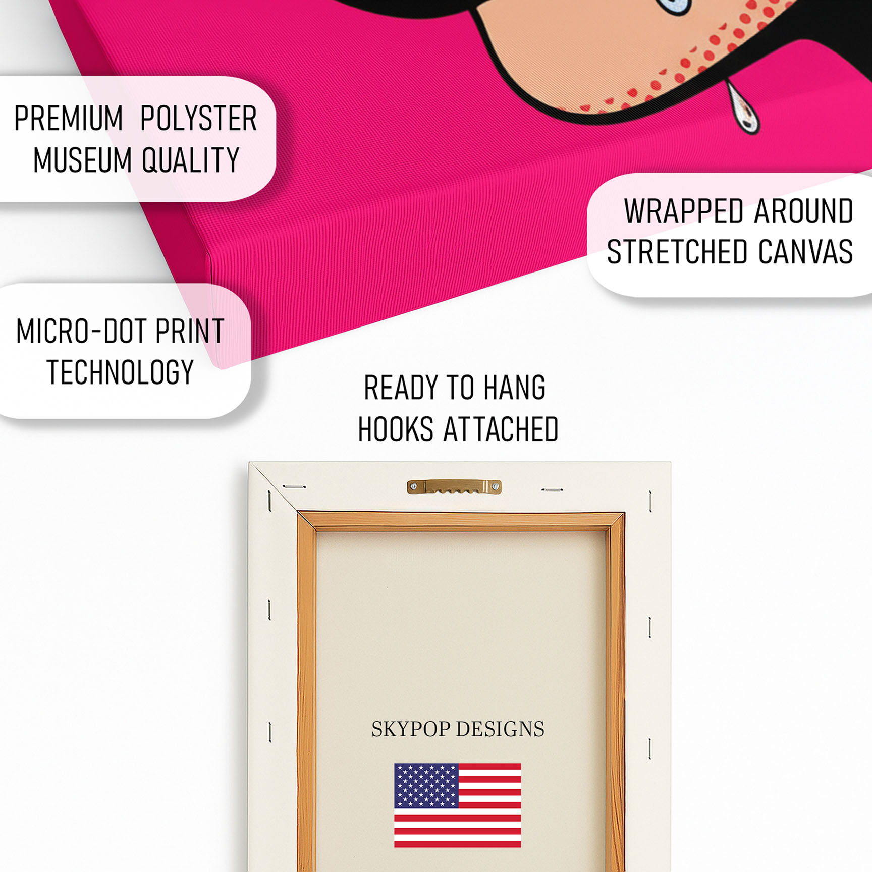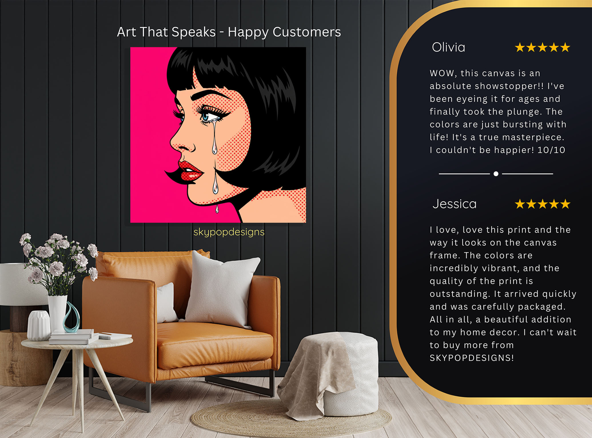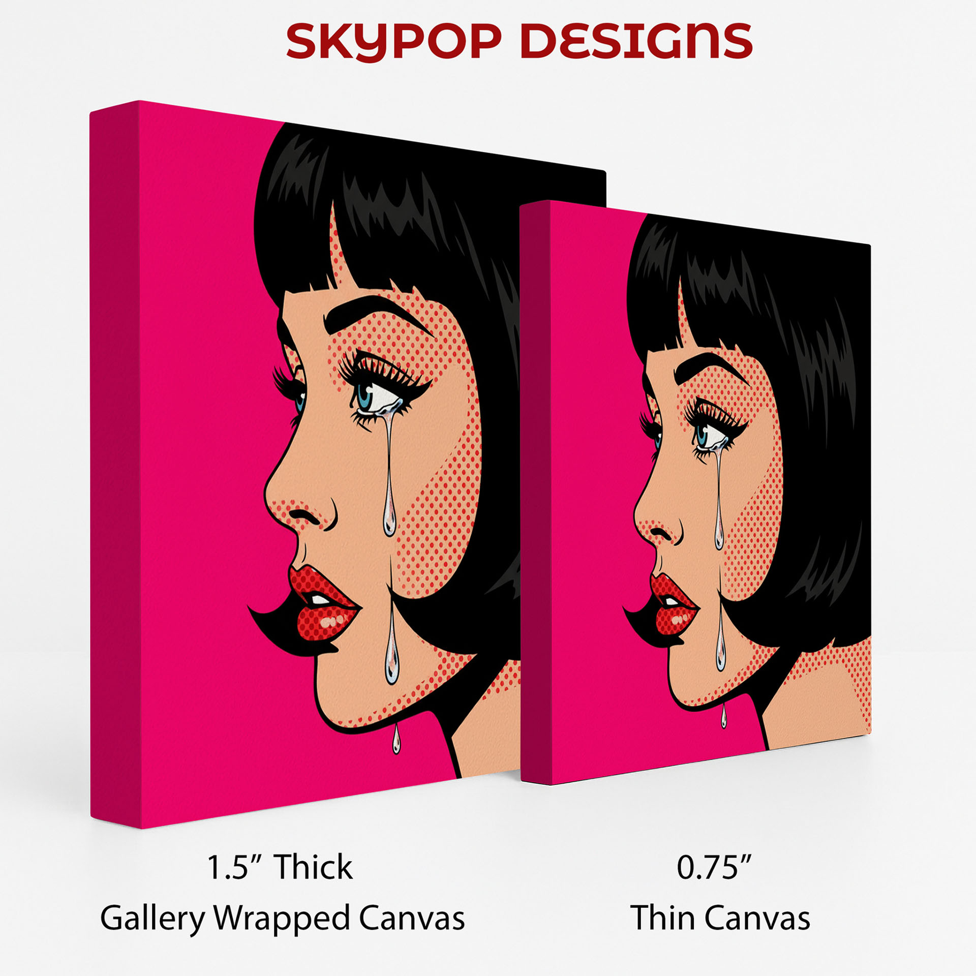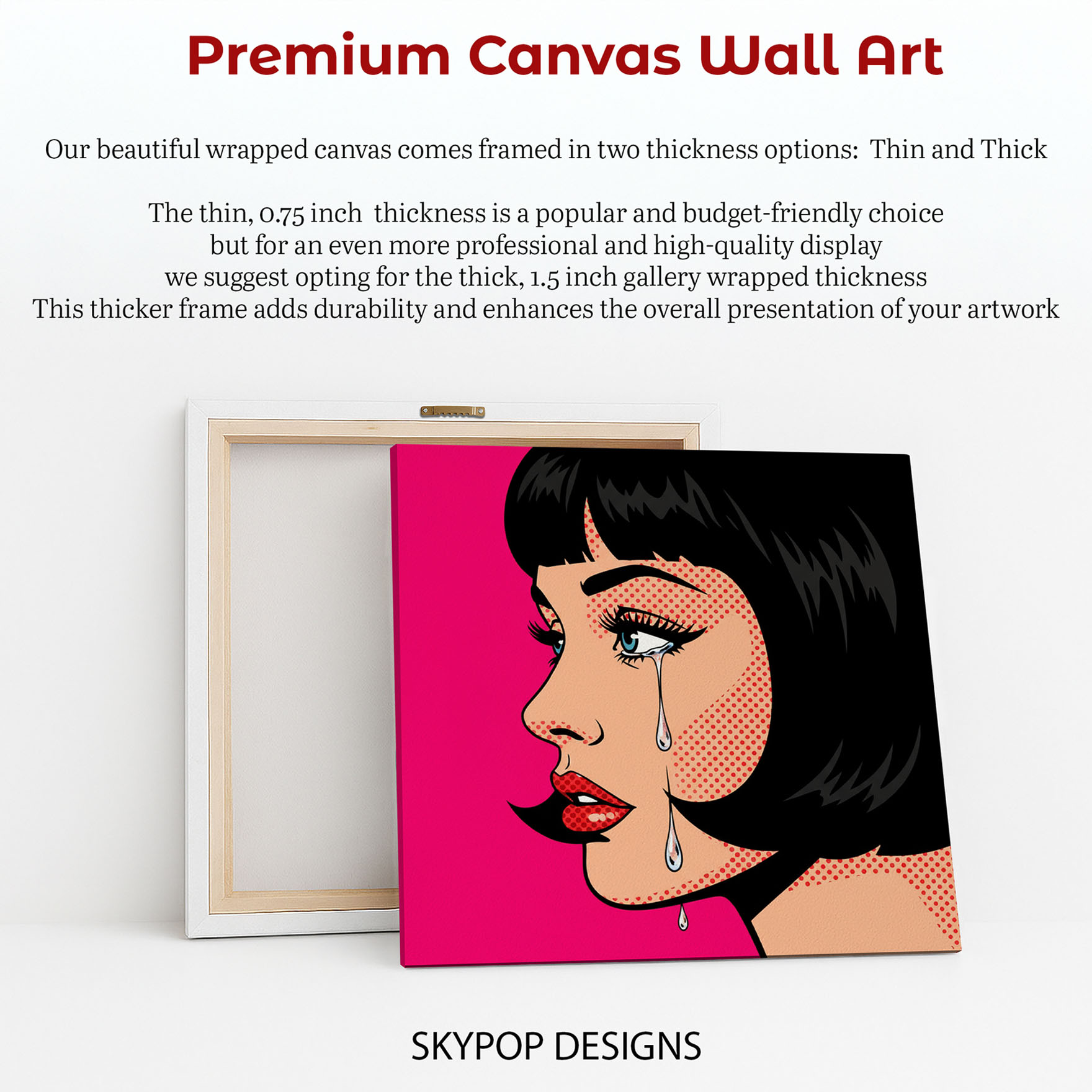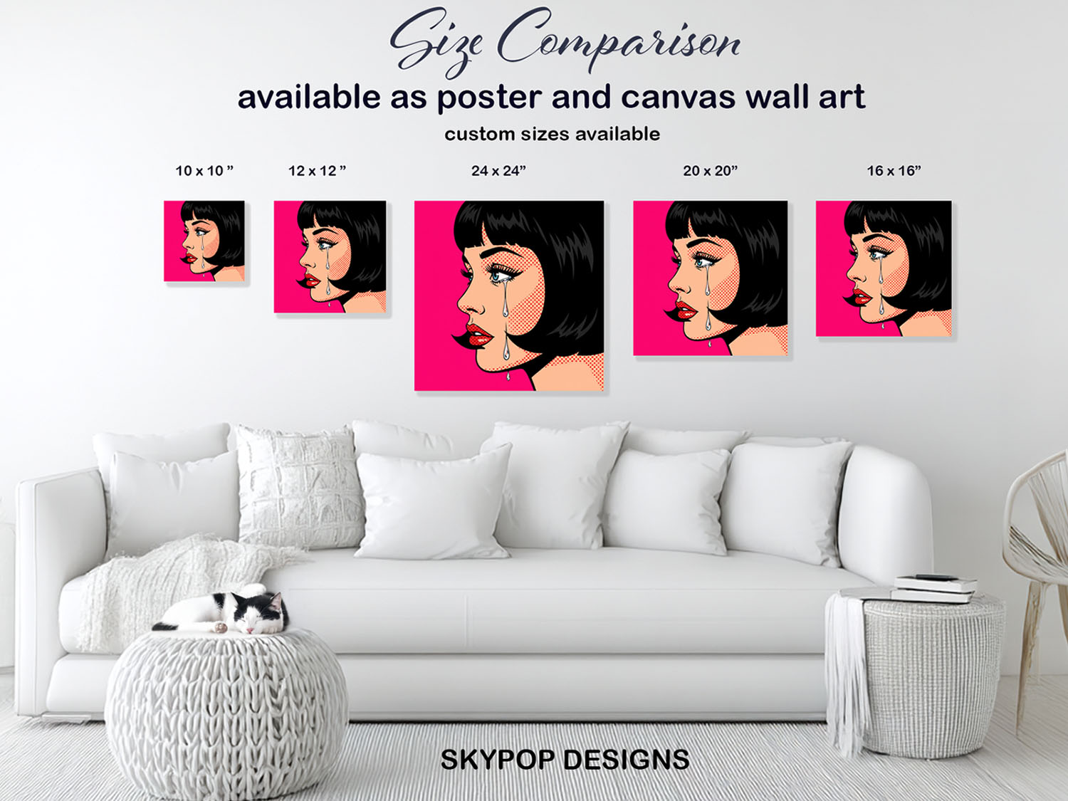 Elevate your home with this striking pop art canvas wall art featuring a woman in profile shedding dramatic tears. The bold colors and graphic comic-book style of this poster instantly capture attention, making it a perfect focal point for modern living room wall decor. This vibrant artwork adds a touch of glam to any bedroom or entryway, celebrating the power of figurative art. The intense contrast between the bright pink background, the woman’s red lips, and the black hair creates a captivating visual experience. This canvas wall art is ideal for those seeking contemporary decor with an edge, or as a statement piece in a game room. Its expressive portrayal can inspire a range of emotions, adding depth and character to your interior design. High-quality printing ensures the vibrant inks and distinct halftone dots are reproduced with stunning clarity. This versatile poster is perfect for adding personality to minimalist spaces or complementing existing eclectic decor. Whether you’re looking for a unique housewarming gift or a way to refresh your wall art collection, this piece offers bold impact. Transform your space with this dramatic figurative canvas art that sparks conversation and embodies a strong, modern aesthetic. Add this eye-catching pop art to your collection and let your walls tell a story today.