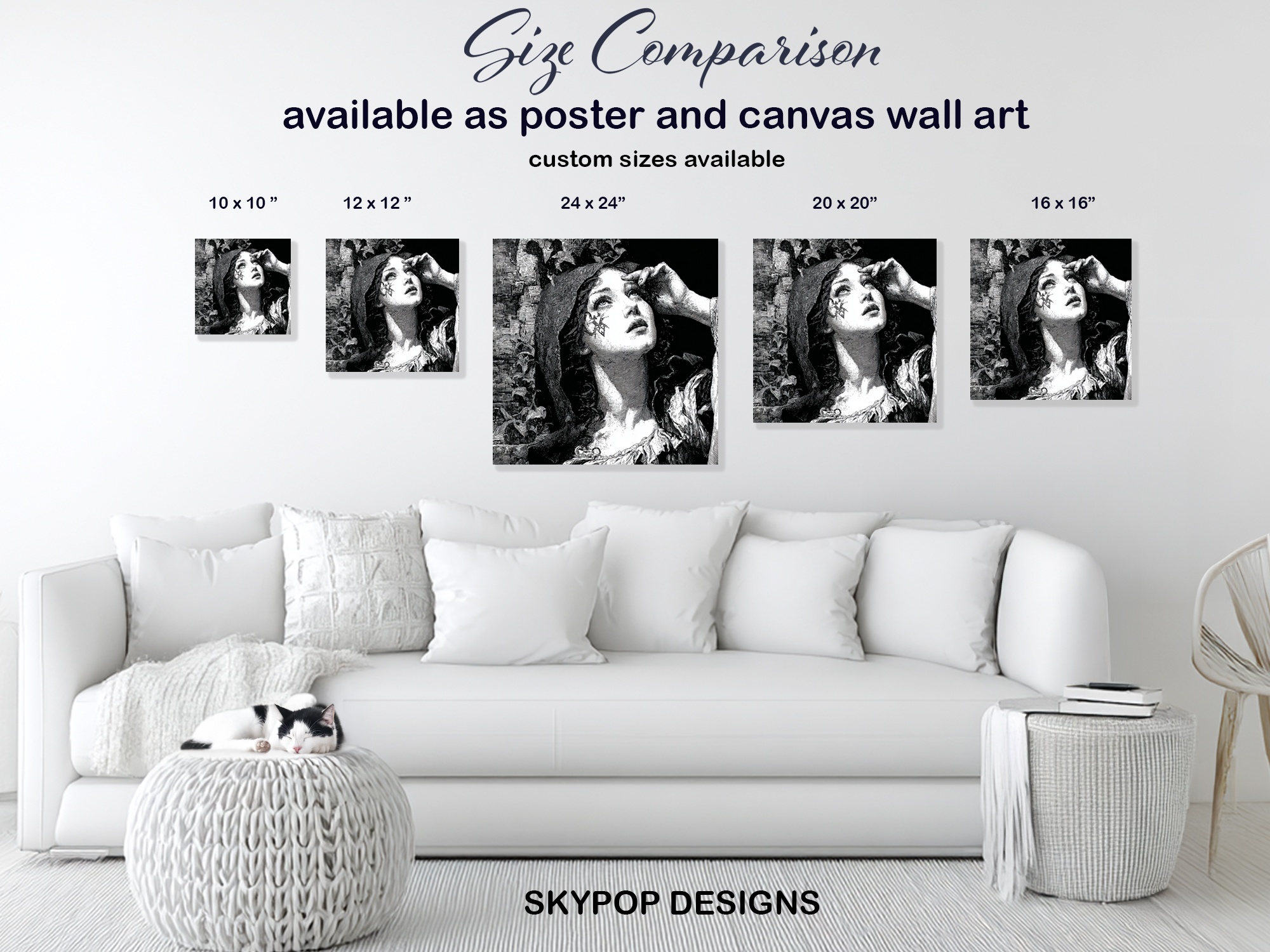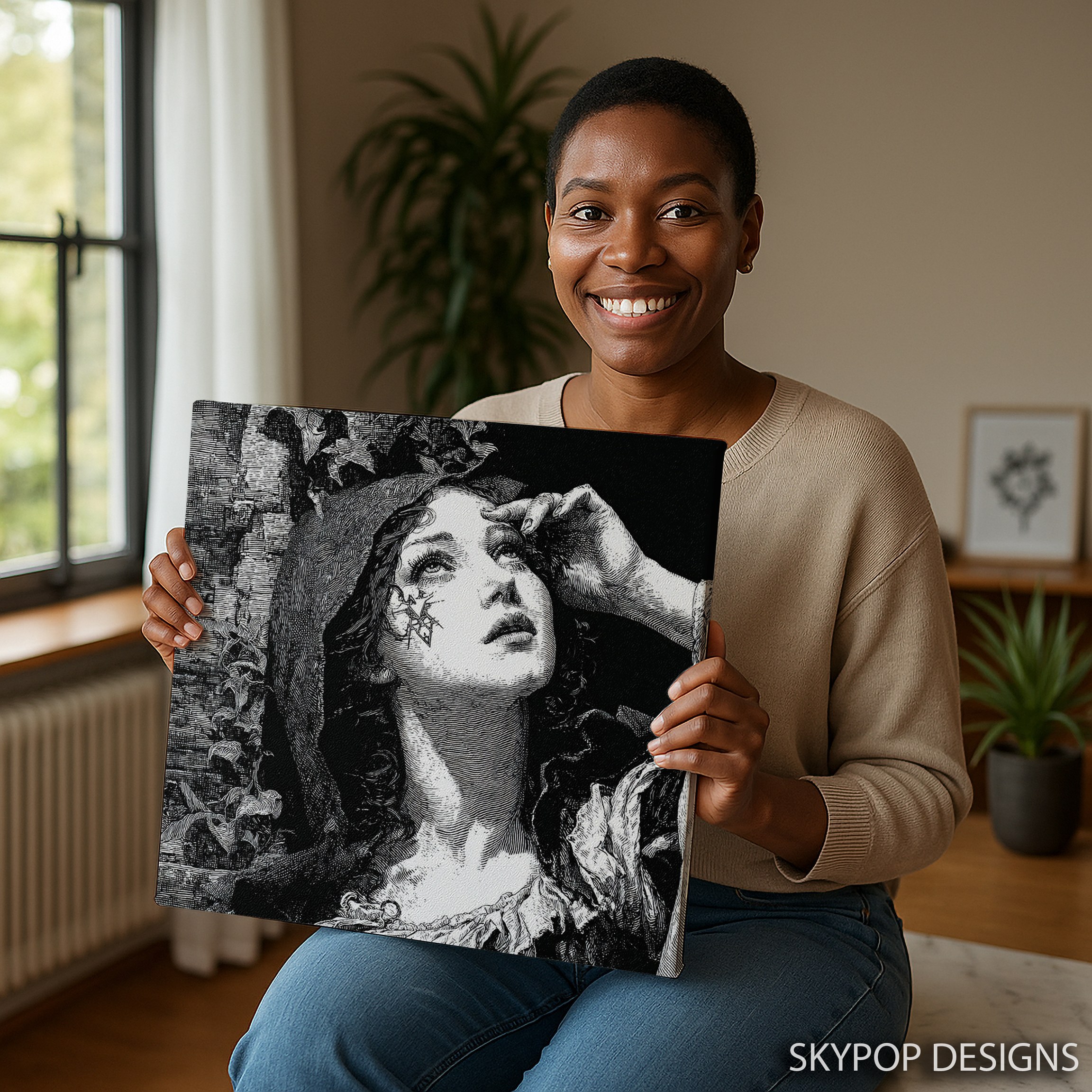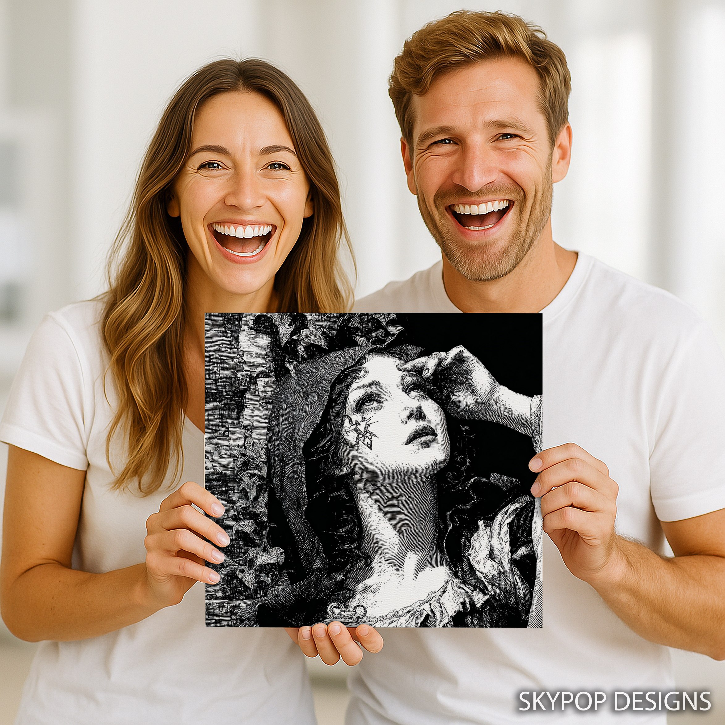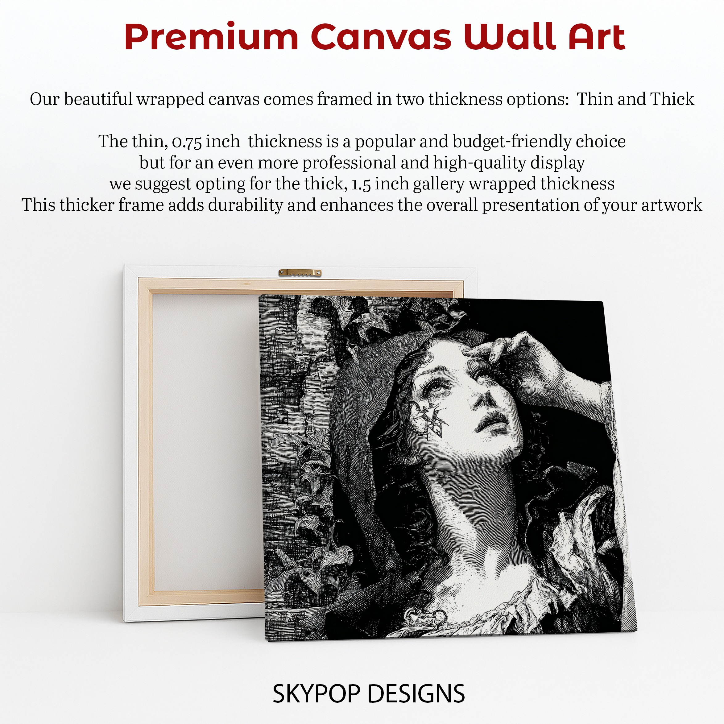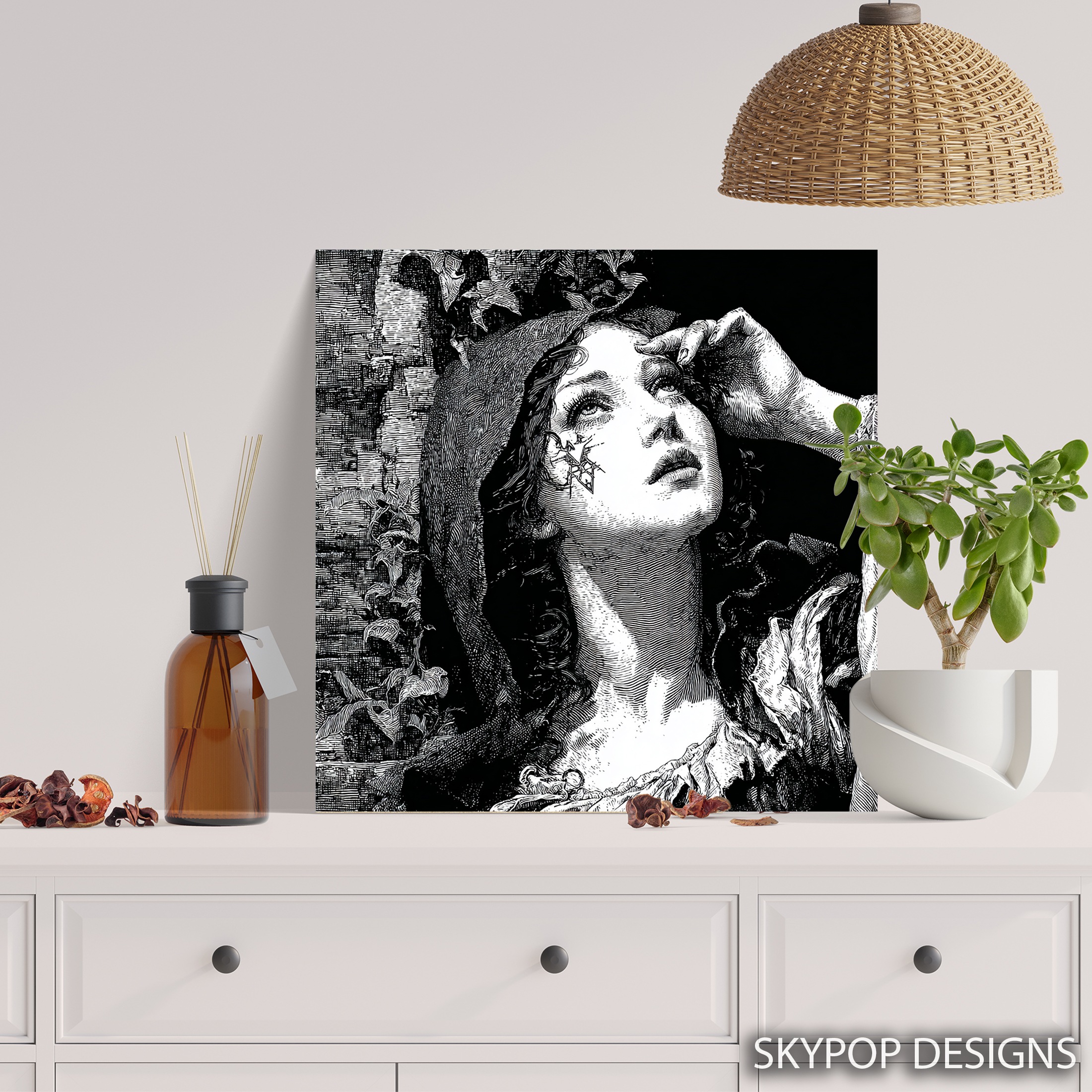 Elevate your space with this captivating black and white canvas wall art featuring a dreamy, upward-gazing portrait. This stunning piece transforms any room with its classic vintage charm and intricate engraving-style details. Perfect for creating a romantic atmosphere in bedrooms or adding a touch of sophistication to living rooms and offices. The striking contrast and delicate linework make this poster a focal point that draws the eye and sparks conversation. Ideal for those who love bohemian or Victorian decor styles, this artwork celebrates timeless beauty and artistic expression. The subject’s serene expression and flowing hair evoke a sense of nostalgia and contemplation, making it a powerful addition to your wall art collection. Whether displayed in a cozy reading nook or as a statement piece in your home office, this canvas art enhances the mood and adds depth to your interior design. The versatile black and white palette complements any color scheme, allowing for easy integration into existing decor. Gift this piece to art lovers or history enthusiasts for a thoughtful and lasting impression. With its high-quality reproduction capturing every nuanced detail, this classic portrait brings a touch of elegance and vintage allure to your living space. Transform your walls and create a captivating ambiance with this timeless piece of art today.